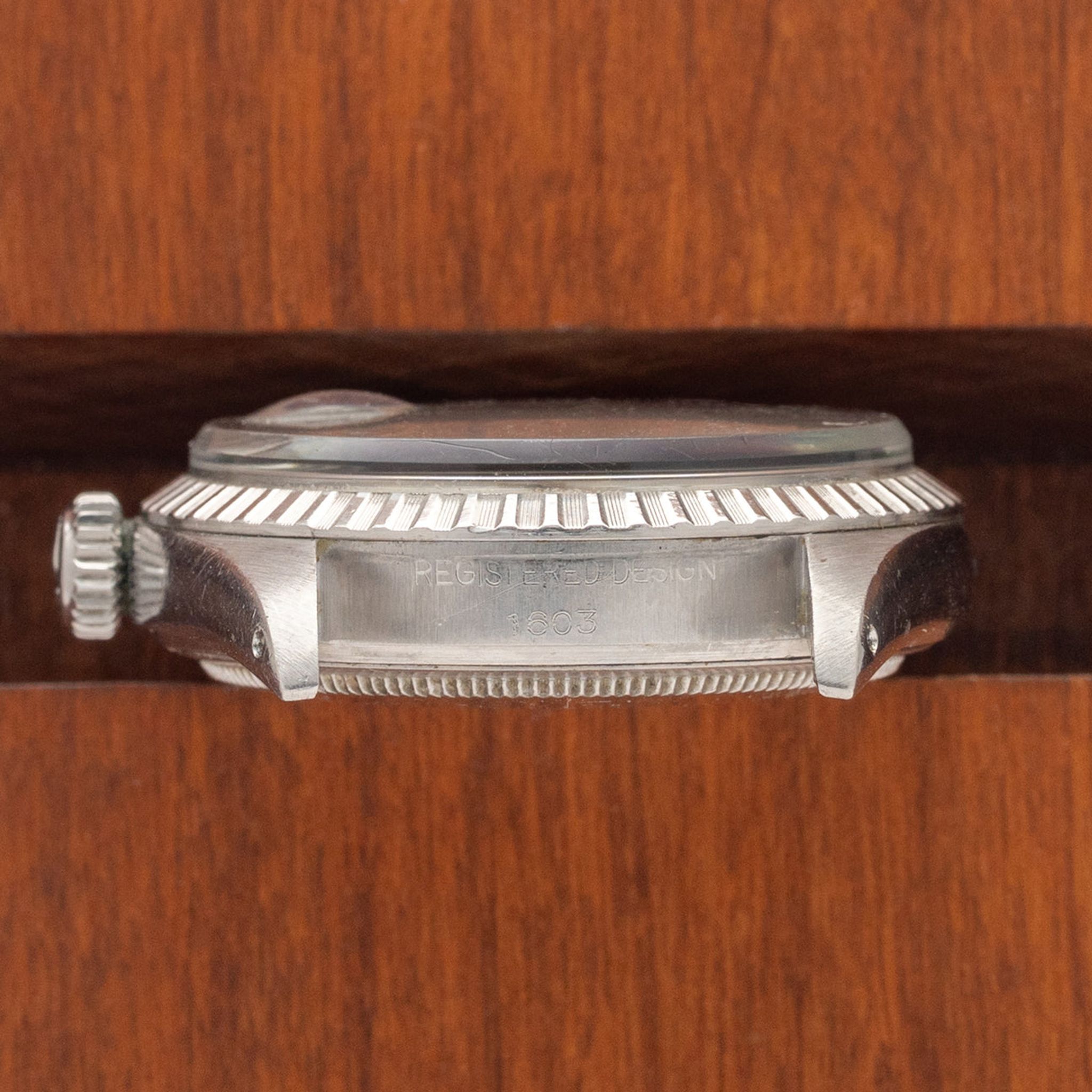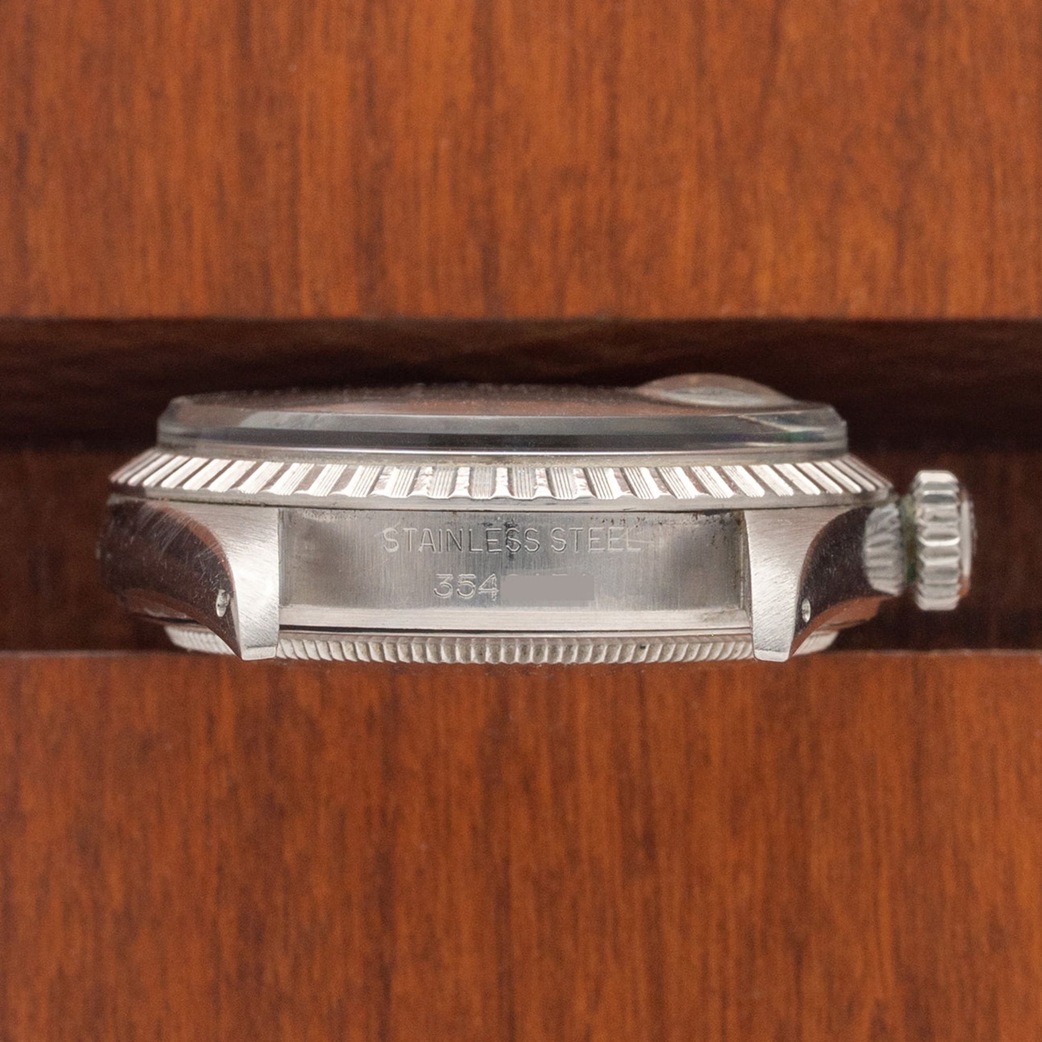 This four-digit ref. 1603 houses a white "Buckley" dial which is a collector term used to refer to this distinctive variation of Roman numeral style design. This particular example has remained in excellent vintage condition with a mint dial, boasting pumpkin patina and all tritium plots present. The case is strong with thick and even lugs. The bracelet displays minimal stretch that will fit and approximate 7.75-inch wrist. For anyone looking for a fantastic value in vintage Rolex, this is a collectible piece fit for just about any occasion.
