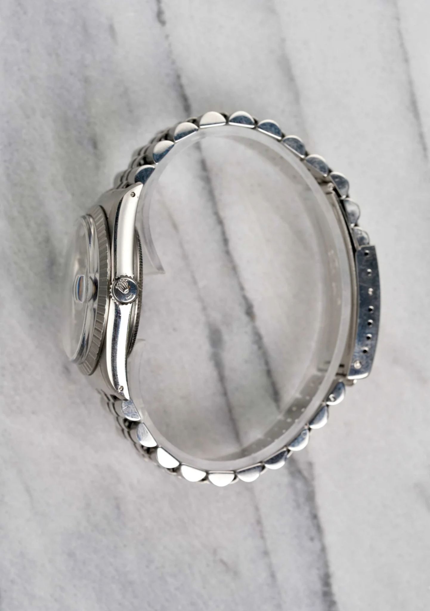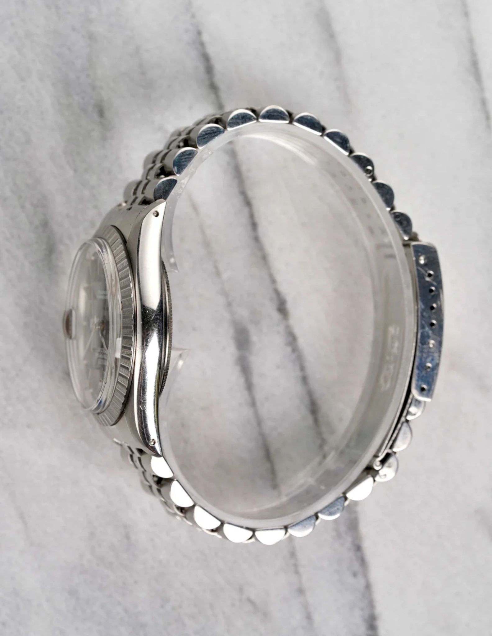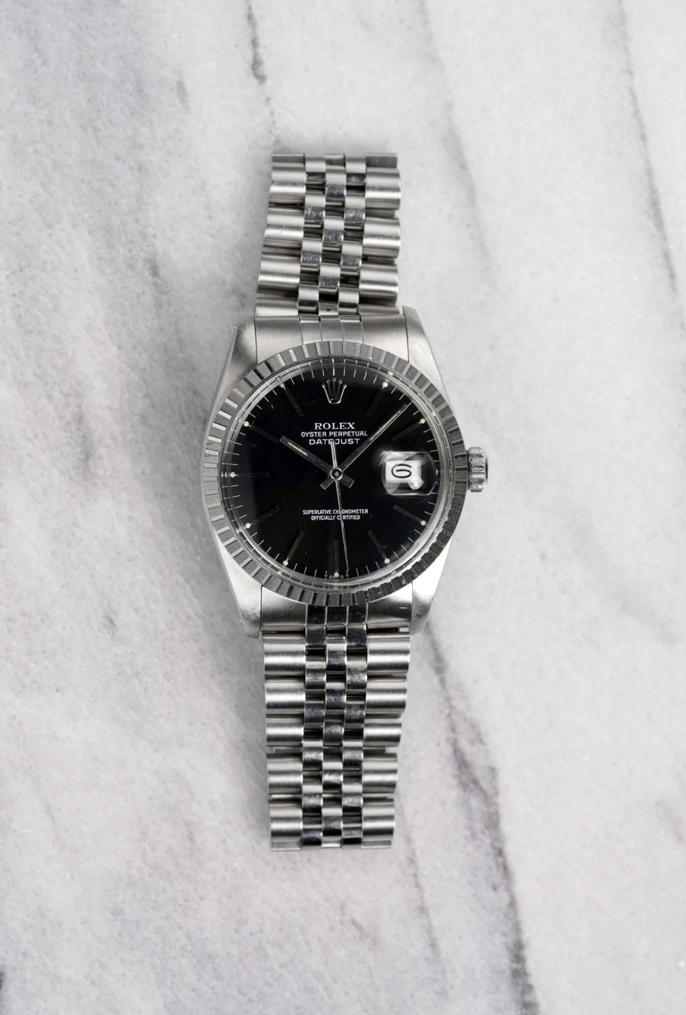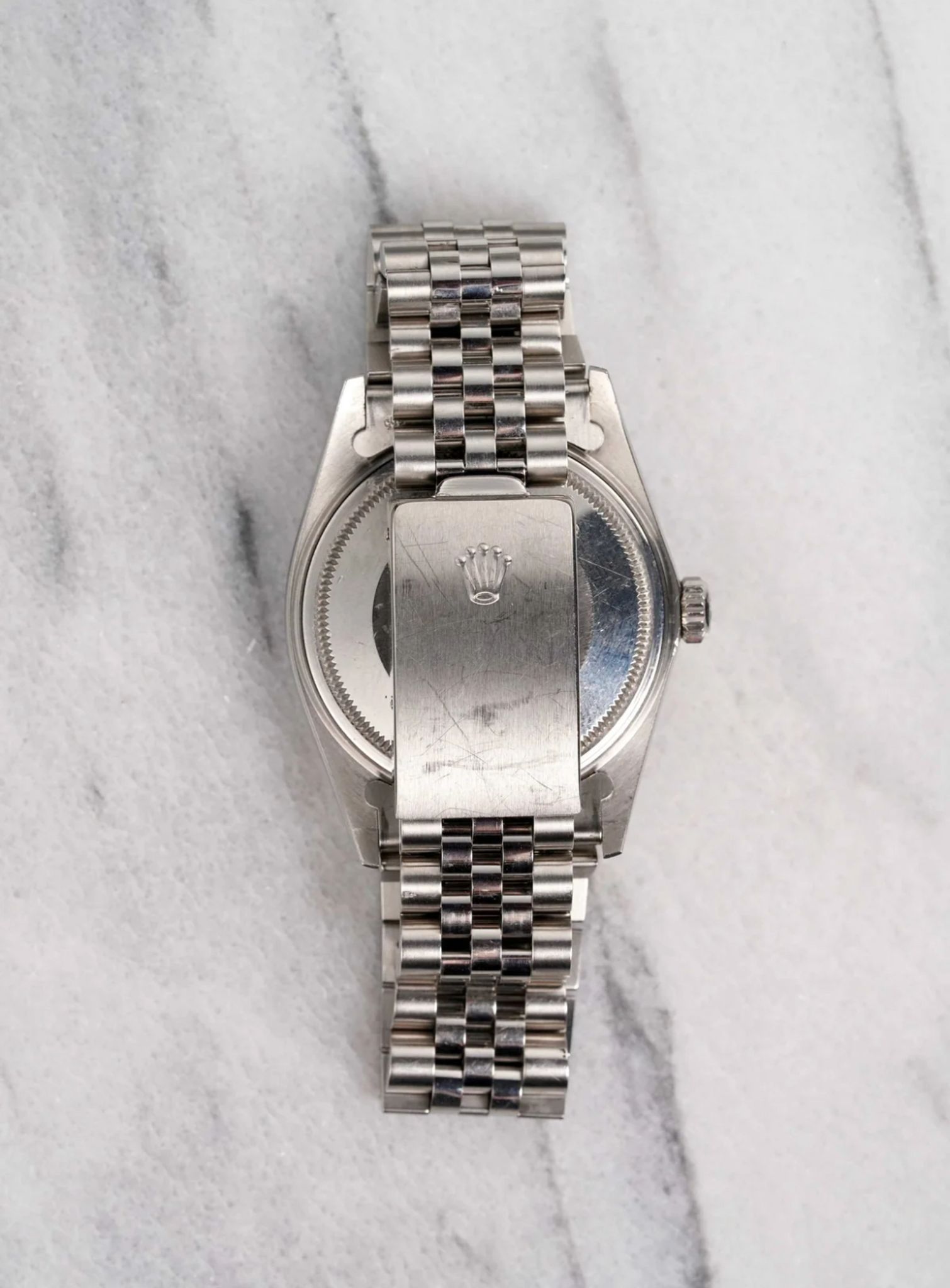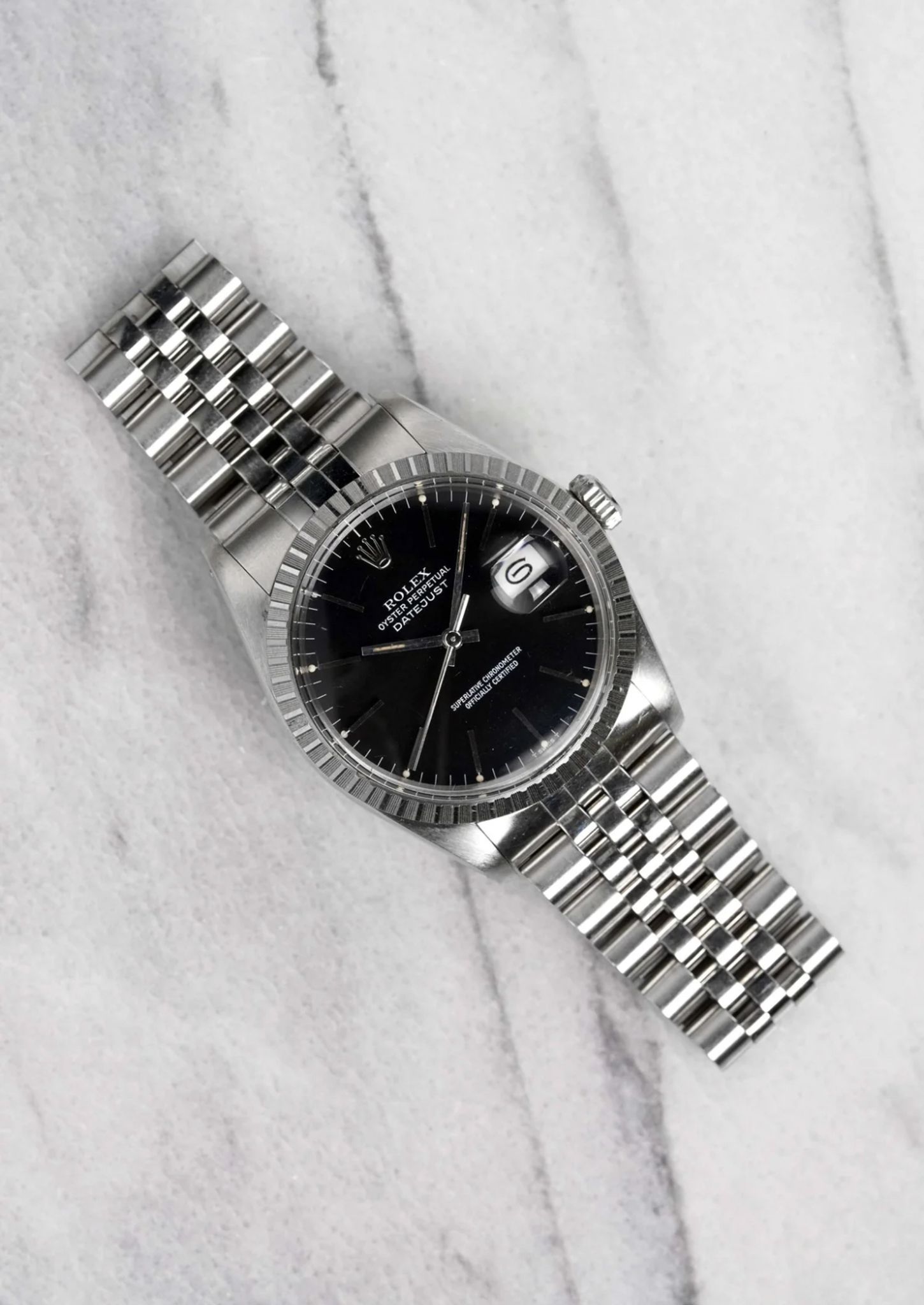 Here's a vintage Rolex Datejust reference 16030 automatic with a glossyblack dial on a jubilee bracelet from the 80s. Keeps great time and is fully functional. Measurements include a 36mm oyster case and 20mm lug width. It's on a Rolex jubilee bracelet that fits up to a 7.25 inch wrist (555 endlinks) Time and quickset date function at 3 a clock. Bracelet has little stretch for its age. Clean black dial and steel engined turned bezel. Steel case and caseback. Lume in both the hands and hour markers developed a nice matching patina. Matching silver hands and hour markers. Black dial varies in color, depending on the angle. Both the dial and crystal are free from any scratches or marks. All parts are original including the signed Rolex crown, dial, movement, and caseback. Both the dial and case are in great cosmetic, untouched condition. Box not included, just for photography.