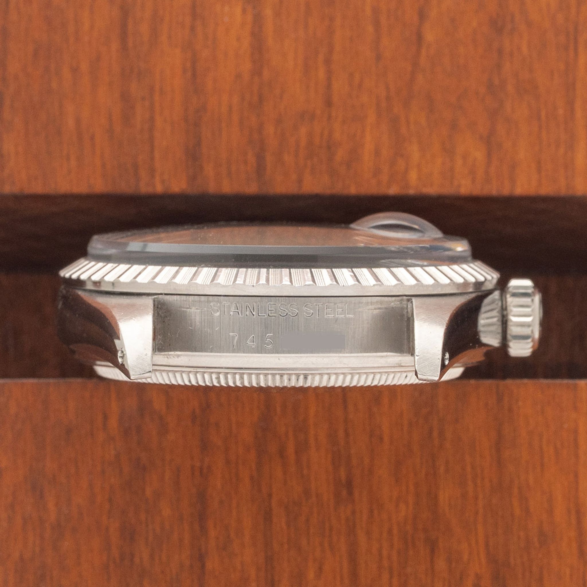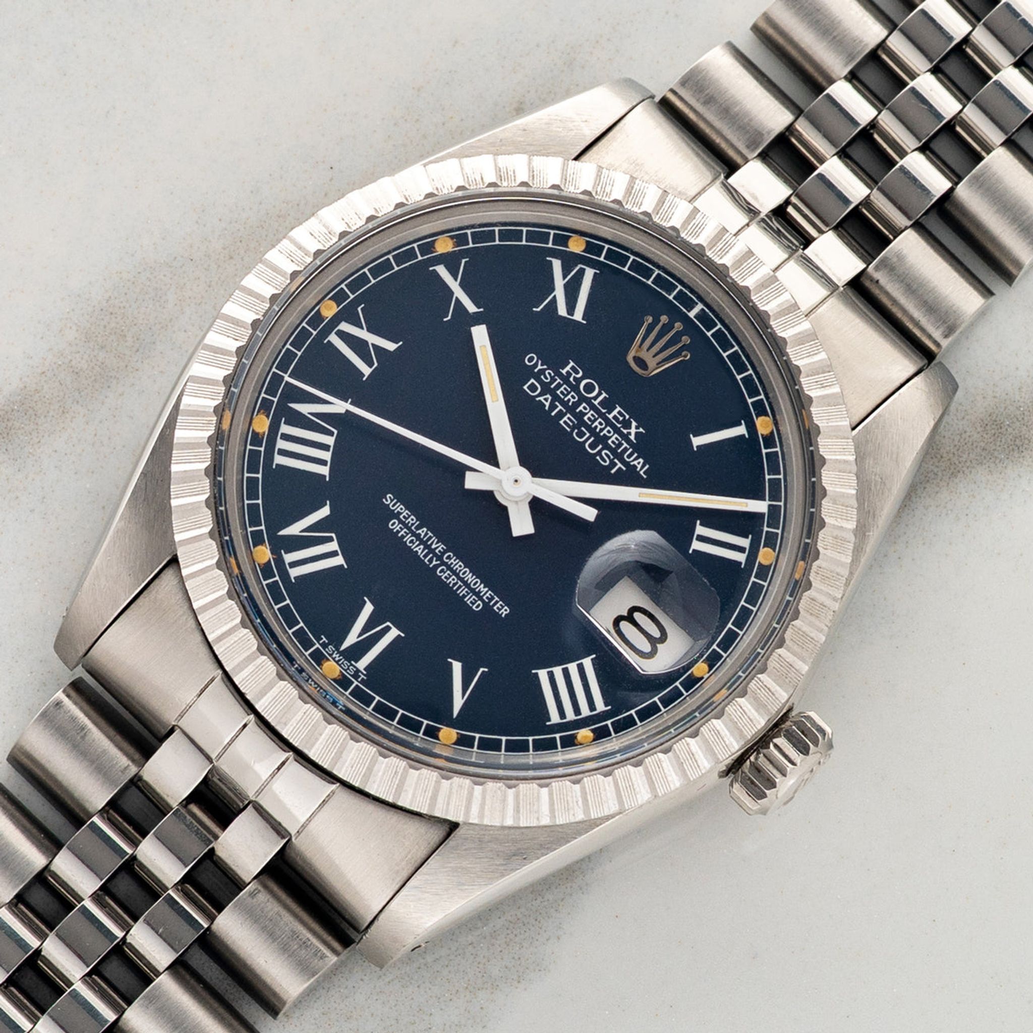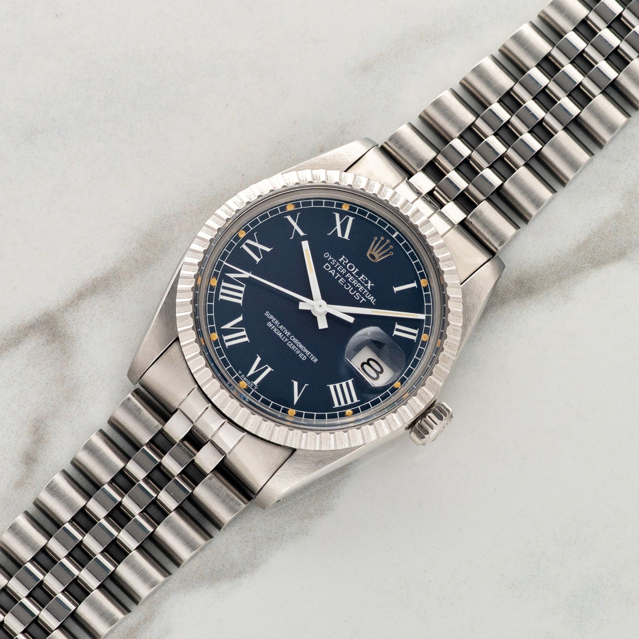 This five-digit reference example is a 745X serial, circa 1984 and benefits from the addition of a quickset date function. This piece houses a rare blue "Buckley" dial which is a collector term used to refer to this distinctive variation of Roman numeral style design. Notably, the hands are also correct and painted white, which pop beautifully off the dial and match the white numerals. This particular example has remained in excellent vintage condition with a fantastic dial, boasting pumpkin patina, with all tritium plots present present. The case is strong with thick and even lugs. The bracelet displays light stretch that will fit and approximate 7.5-inch wrist. The icing on the cake here is the addition of its box and papers, making it a true collector's gem.