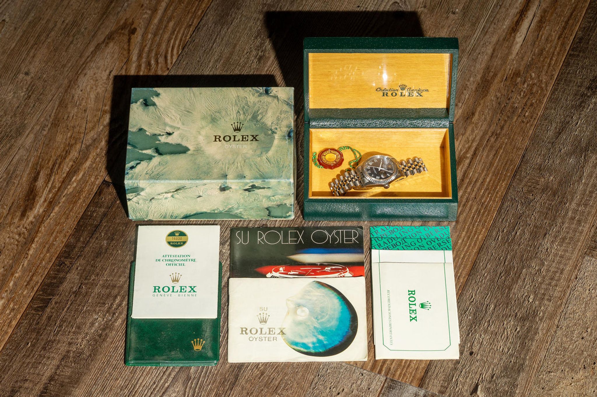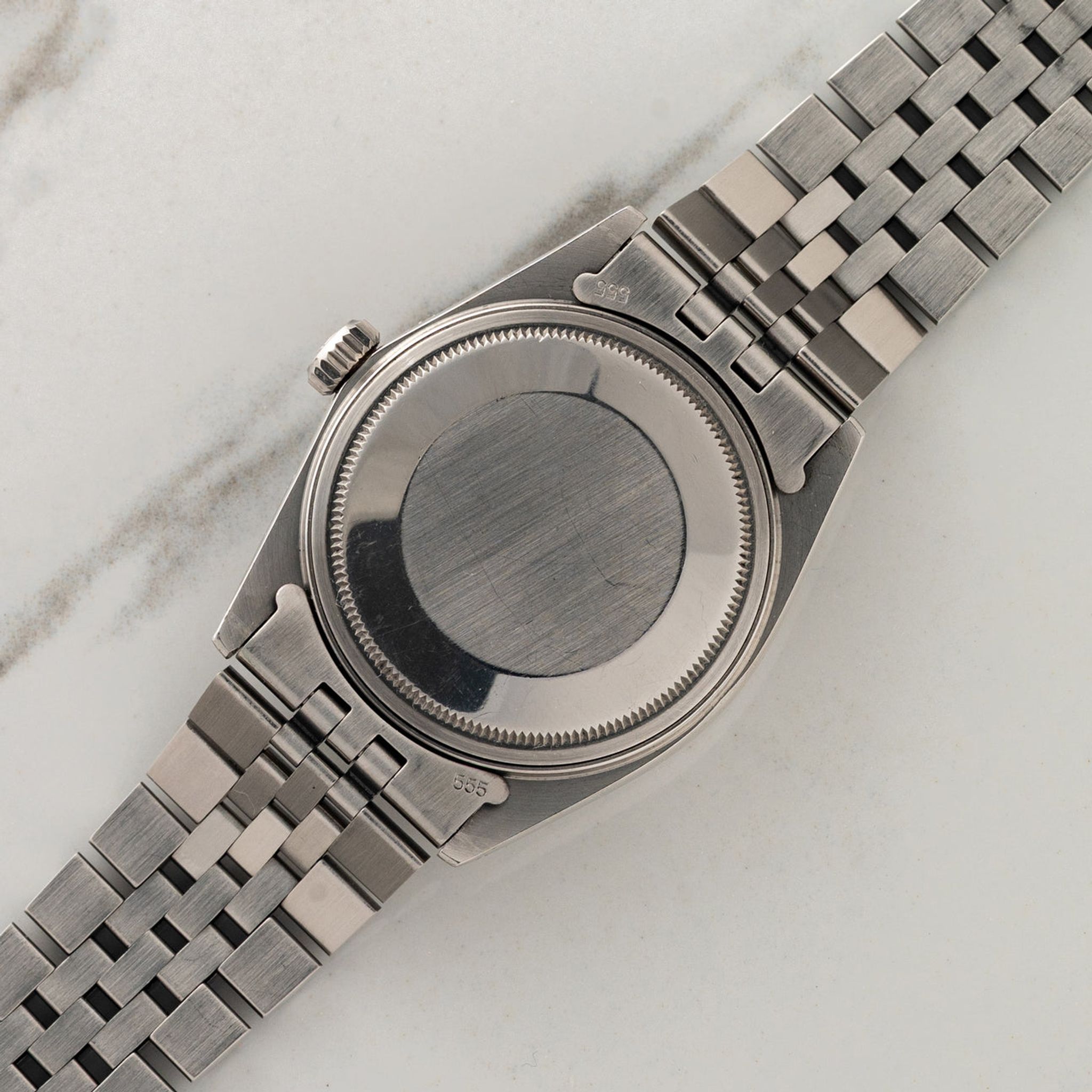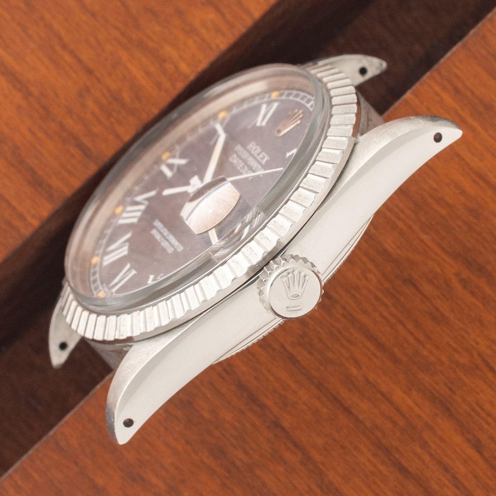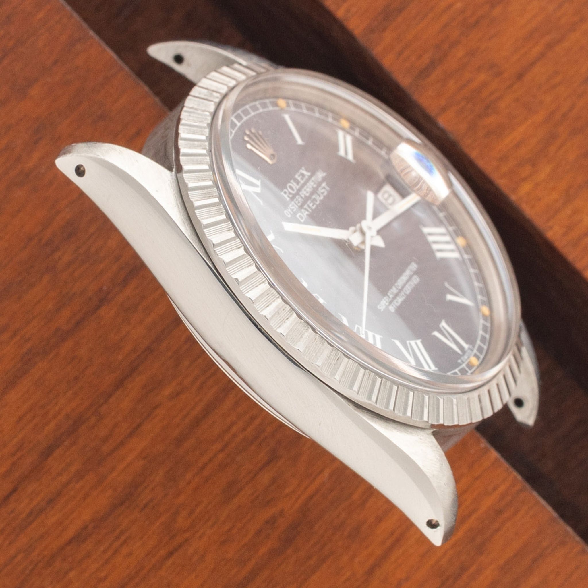 This five-digit reference example is a 745X serial, circa 1984 and benefits from the addition of a quickset date function. This piece houses a rare blue "Buckley" dial which is a collector term used to refer to this distinctive variation of Roman numeral style design. Notably, the hands are also correct and painted white, which pop beautifully off the dial and match the white numerals. This particular example has remained in excellent vintage condition with a fantastic dial, boasting pumpkin patina, with all tritium plots present present. The case is strong with thick and even lugs. The bracelet displays light stretch that will fit and approximate 7.5-inch wrist. The icing on the cake here is the addition of its box and papers, making it a true collector's gem.