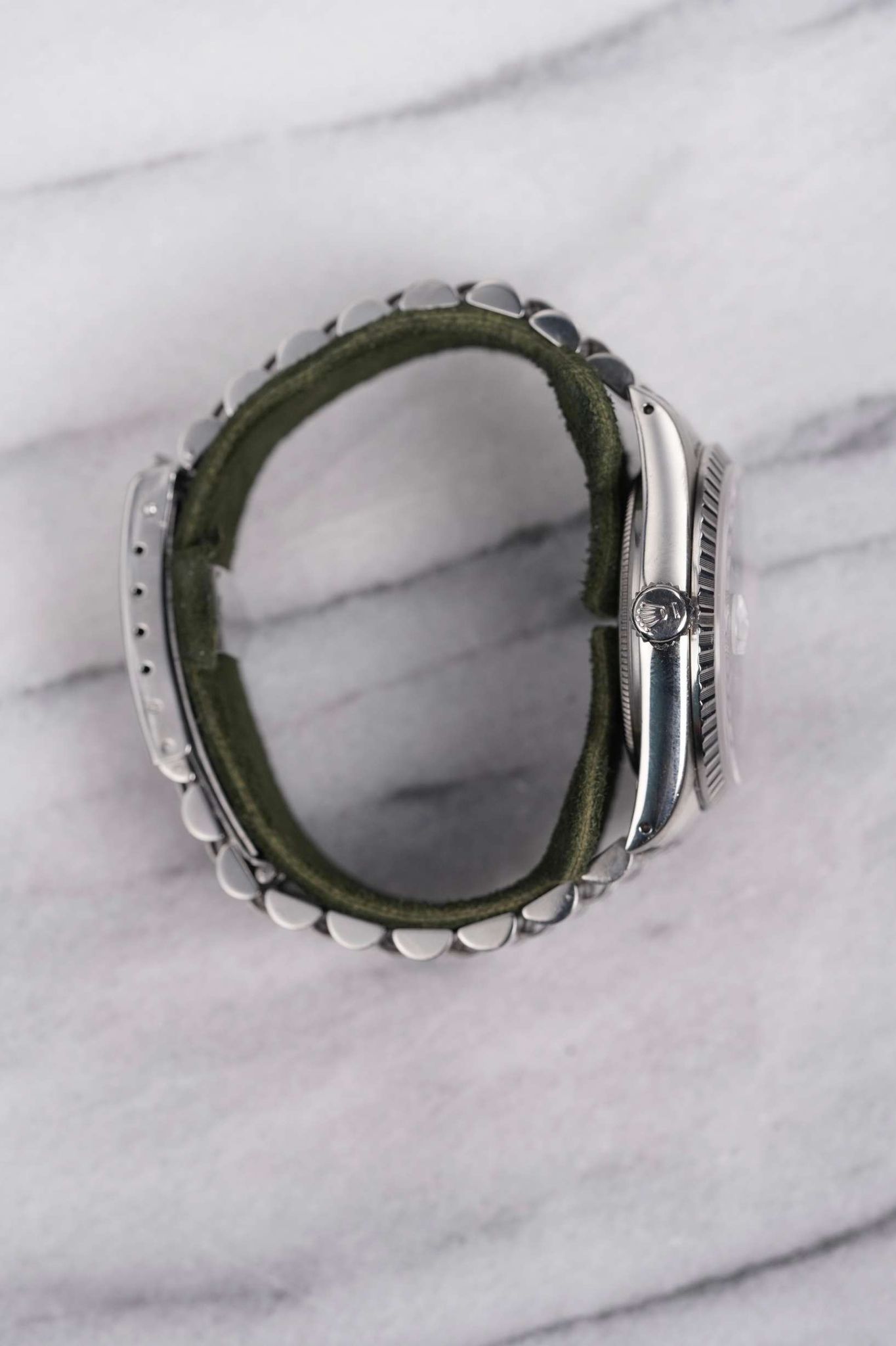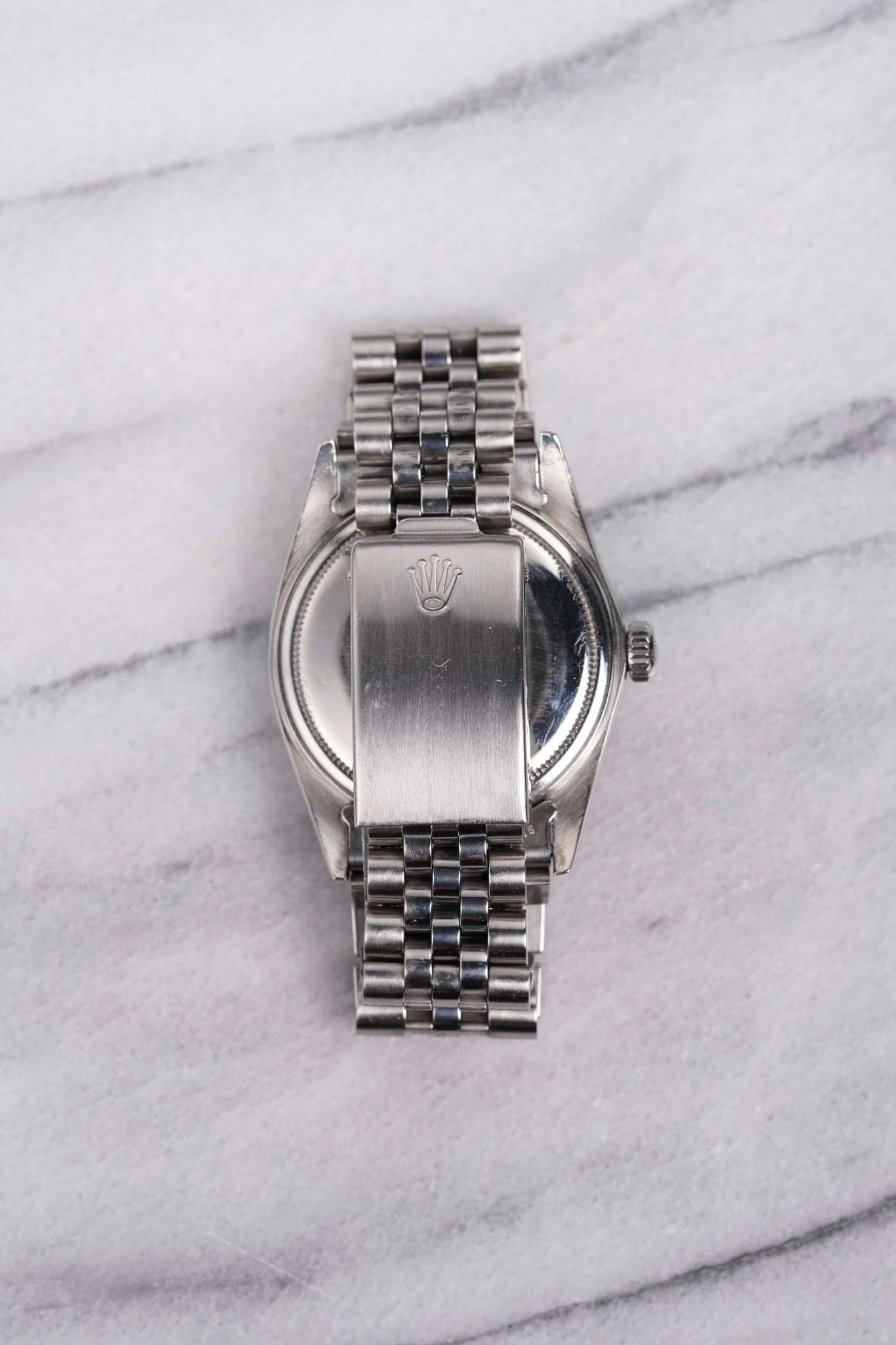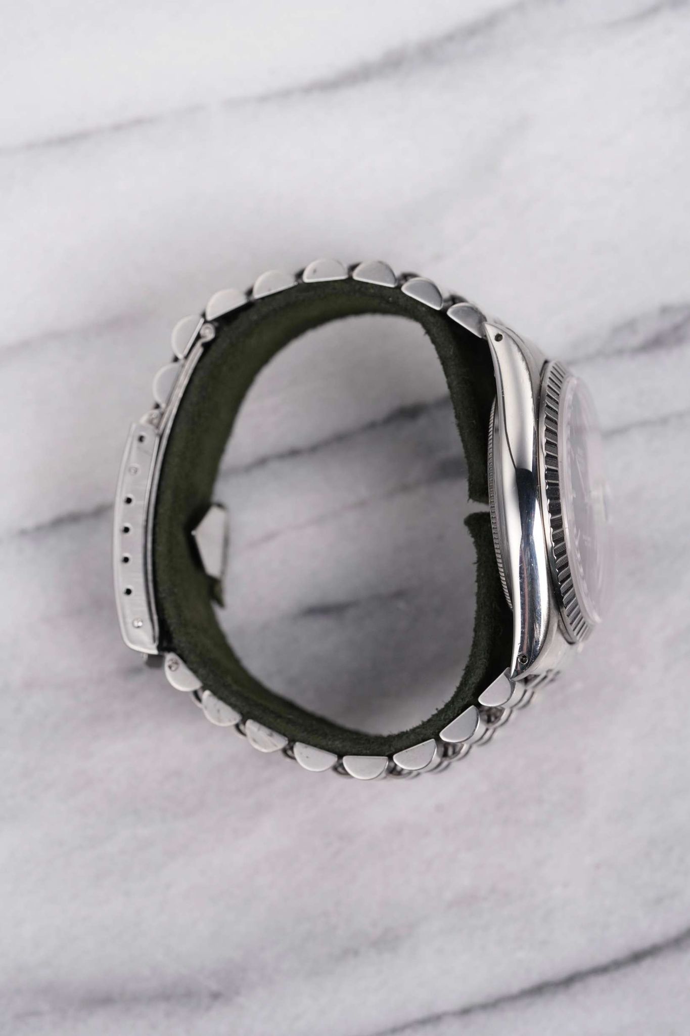 Here's a vintage Rolex Datejust reference 16030 (steel bezel) automatic with a grey tapestry dial on a jubilee bracelet from the 80s. Keeps great time and is fully functional. Measurements include a 36mm oyster case and 20mm lug width. It's on a Rolex jubilee bracelet that fits up to a 7.25 inch wrist (555 endlinks). The bracelet is in decent shape, little stretch. Time and quick date function at 3 a clock. Clean grey tapestry dial and steel bezel. Steel case and caseback. The lume in both the hands and have matching patina. Drilled lug holes. Both the dial and crystal are free from any scratches or marks. All parts are original including the signed Rolex crown, dial, movement, and caseback. Both the dial and case are in great cosmetic, untouched condition.