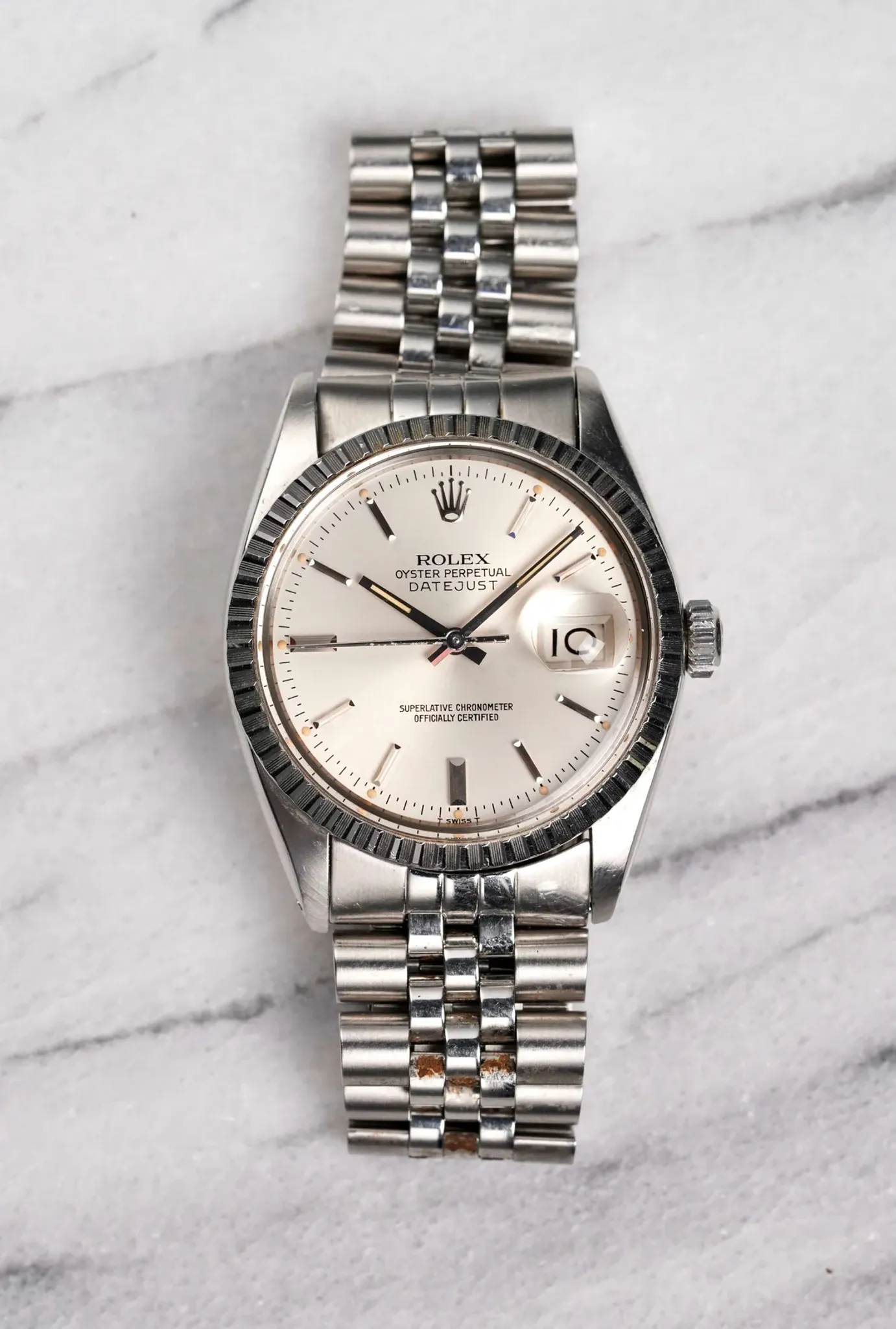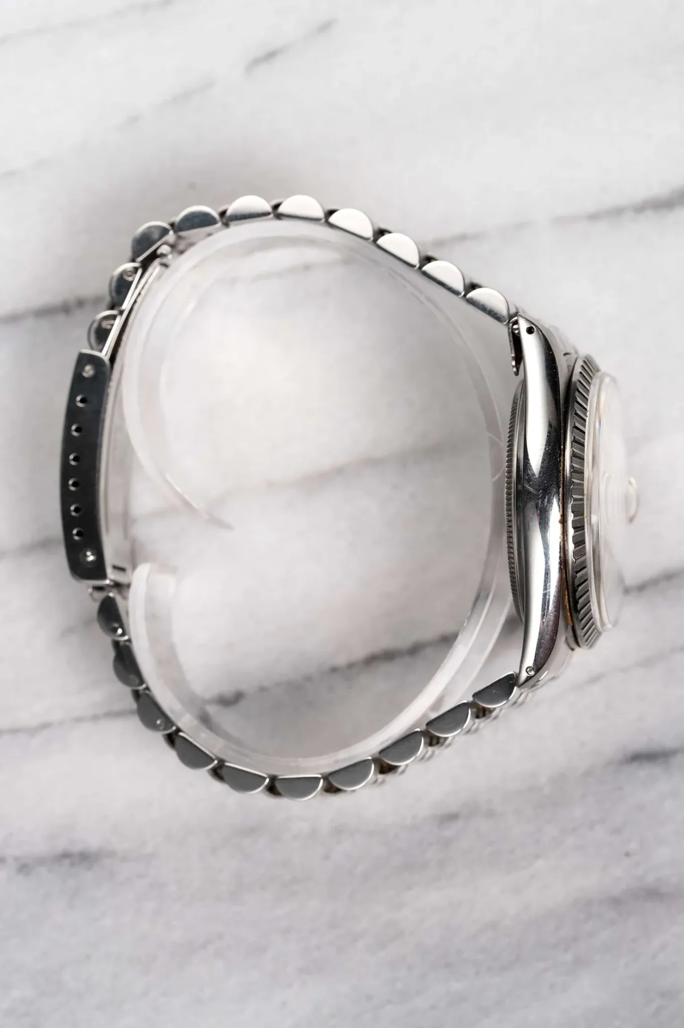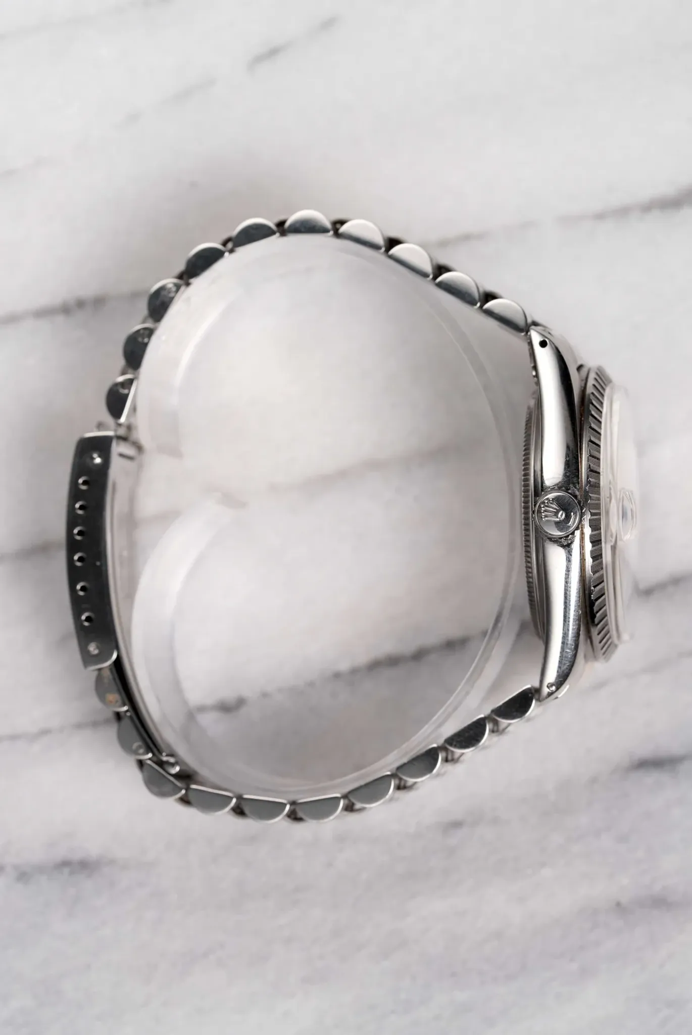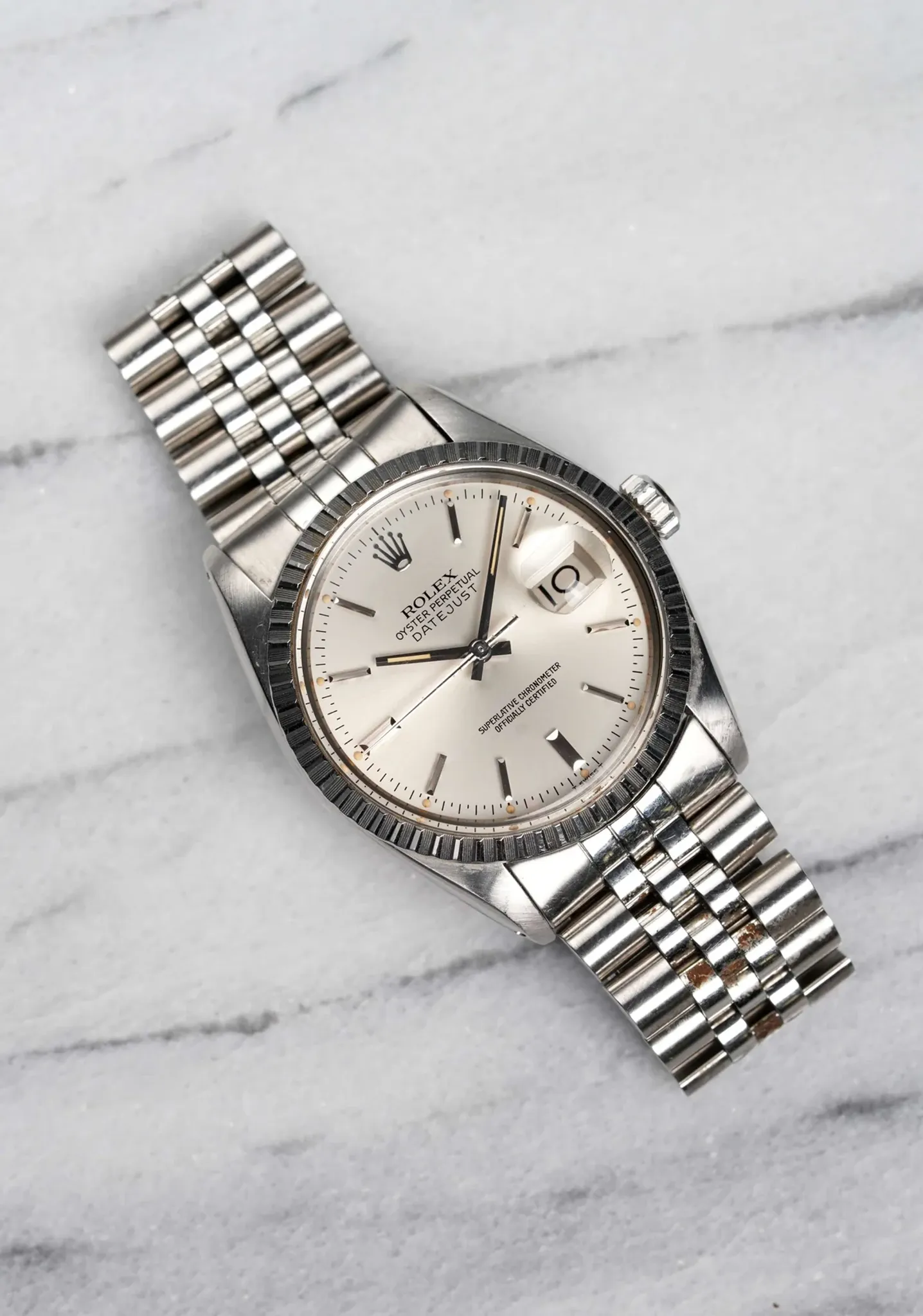 Here's a vintage Rolex Datejust reference 16030 (steel bezel) automatic with a silver sunburst dial on a jubilee bracelet from the 80s. Keeps great time and is fully functional. Measurements include a 36mm oyster case and 20mm lug width. It's on a Rolex oyster bracelet that fits up to a 7.25 inch wrist (555 endlinks). There is some stretch to the bracelet due to wear. The dial has a Roman numeral minute track. Time and quickset date function at 3 a clock. Clean silver sunburst dial and steel engined turned bezel. Steel case and caseback. Lume in both the hands and hour markers developed a nice yellow patina. Drilled lug holes. Matching silver hands and hour markers. Both the dial and crystal are free from any scratches or marks. All parts are original including the signed Rolex crown, dial, movement, and caseback. Both the dial and case are in great cosmetic, untouched condition.