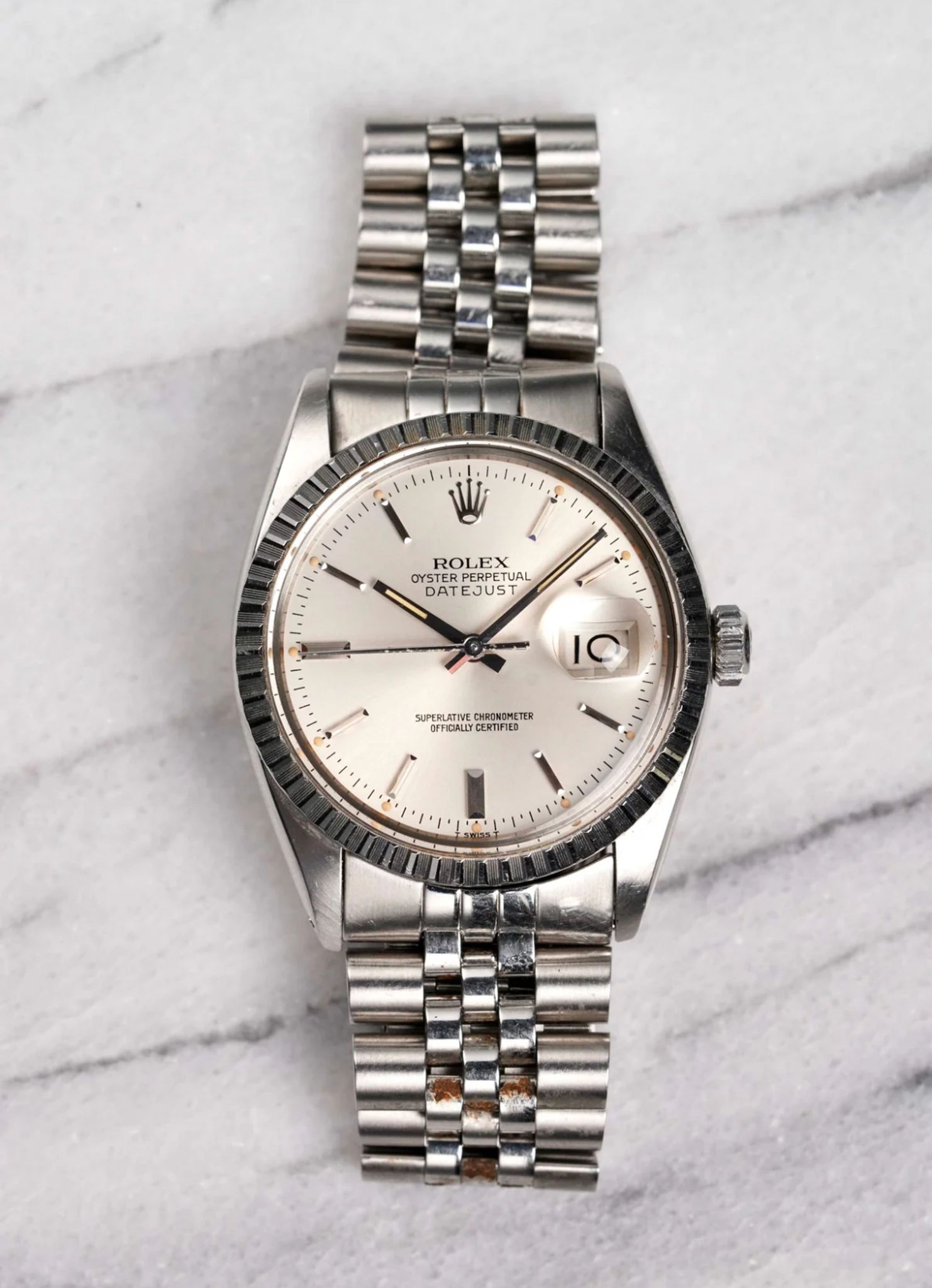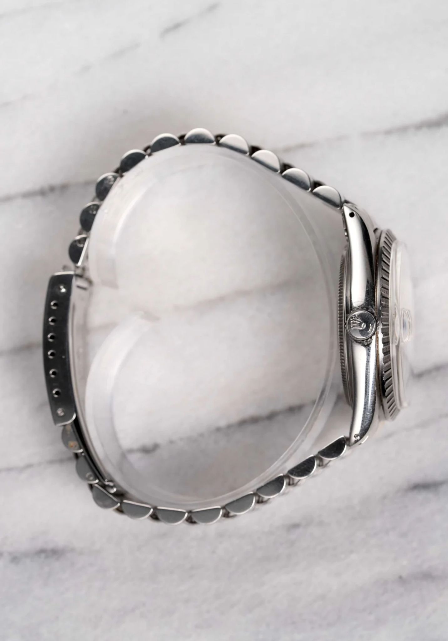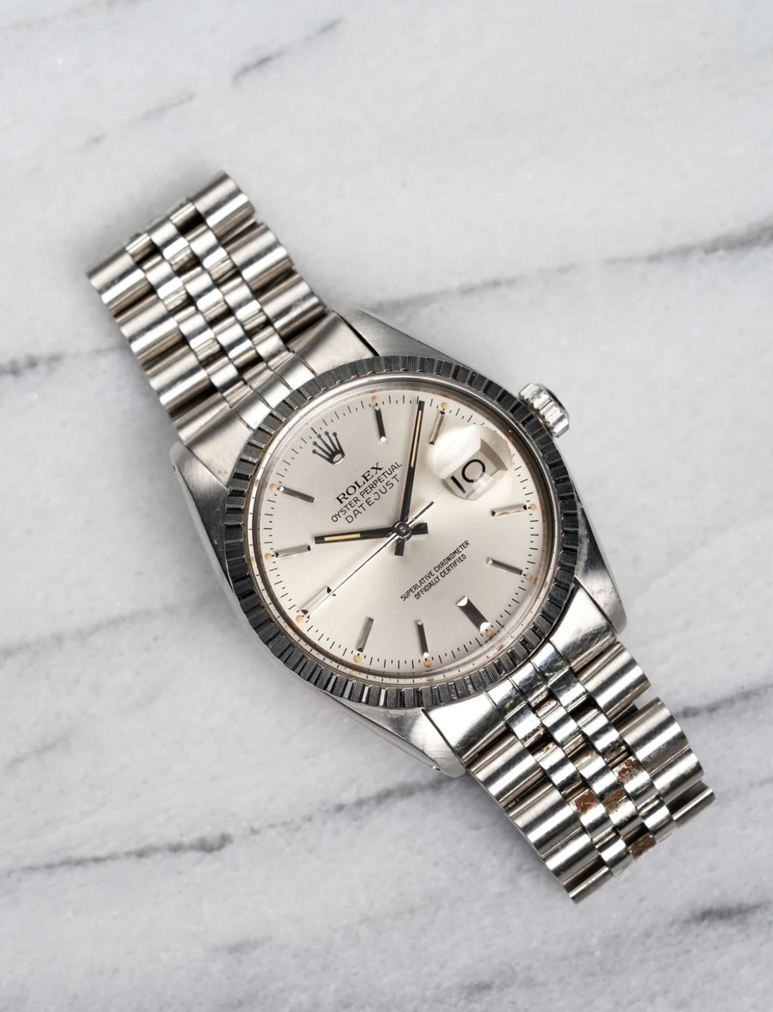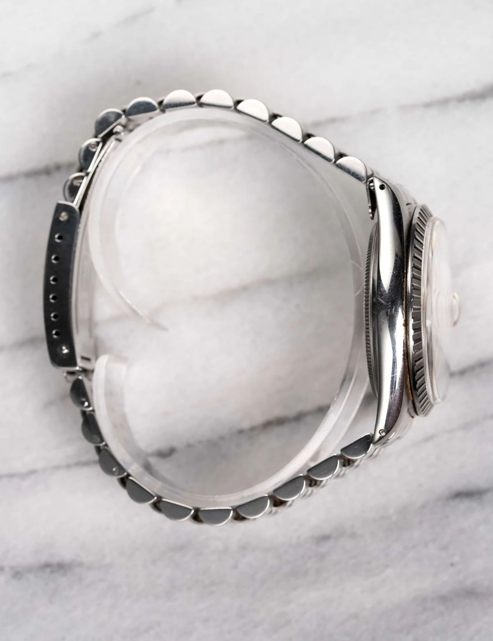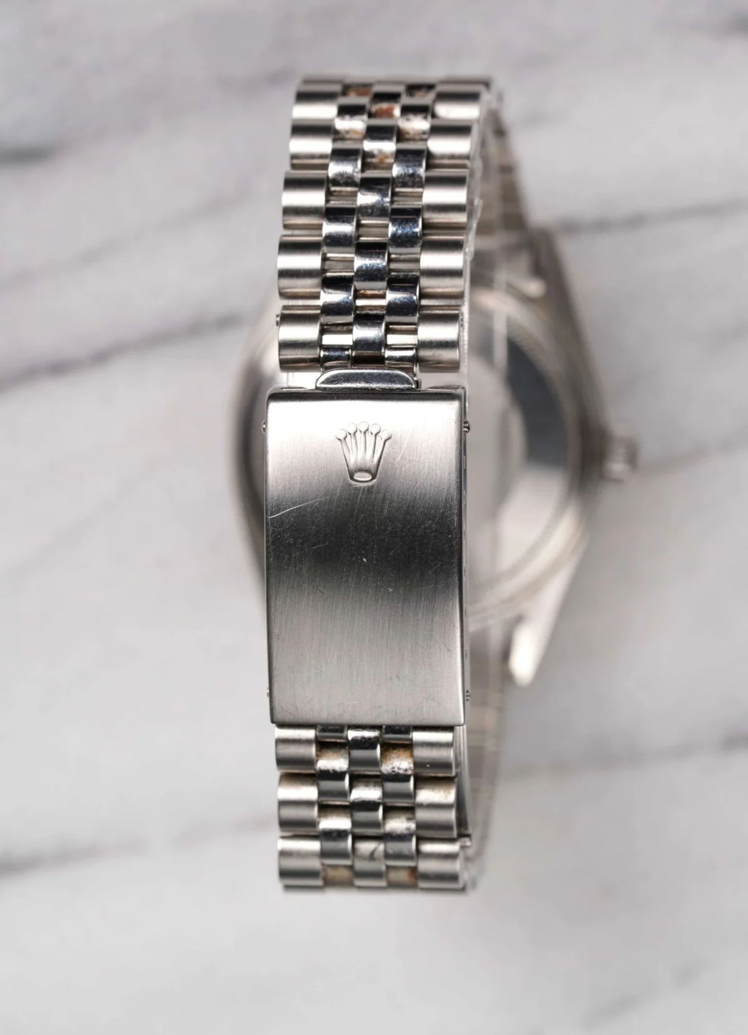 Here's a vintage Rolex Datejust reference 16030 (steel bezel) automatic with a silver sunburst dial on a jubilee bracelet from the 80s. Keeps great time and is fully functional. Measurements include a 36mm oyster case and 20mm lug width. It's on a Rolex oyster bracelet that fits up to a 7.25 inch wrist (555 endlinks). There is some stretch to the bracelet due to wear. The dial has a Roman numeral minute track. Time and quickset date function at 3 a clock. Clean silver sunburst dial and steel engined turned bezel. Steel case and caseback. Lume in both the hands and hour markers developed a nice yellow patina. Drilled lug holes. Matching silver hands and hour markers. Both the dial and crystal are free from any scratches or marks. All parts are original including the signed Rolex crown, dial, movement, and caseback. Both the dial and case are in great cosmetic, untouched condition.