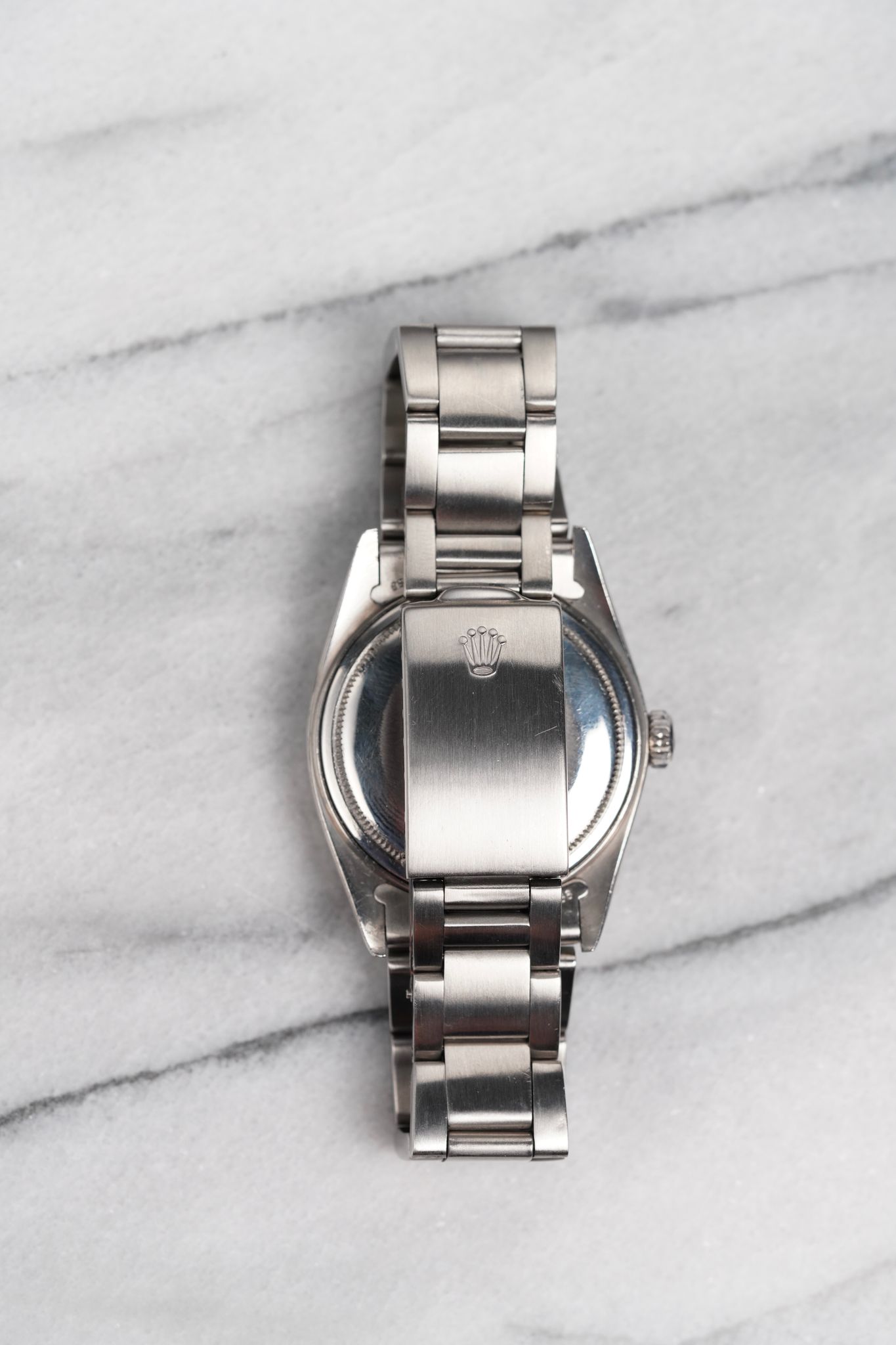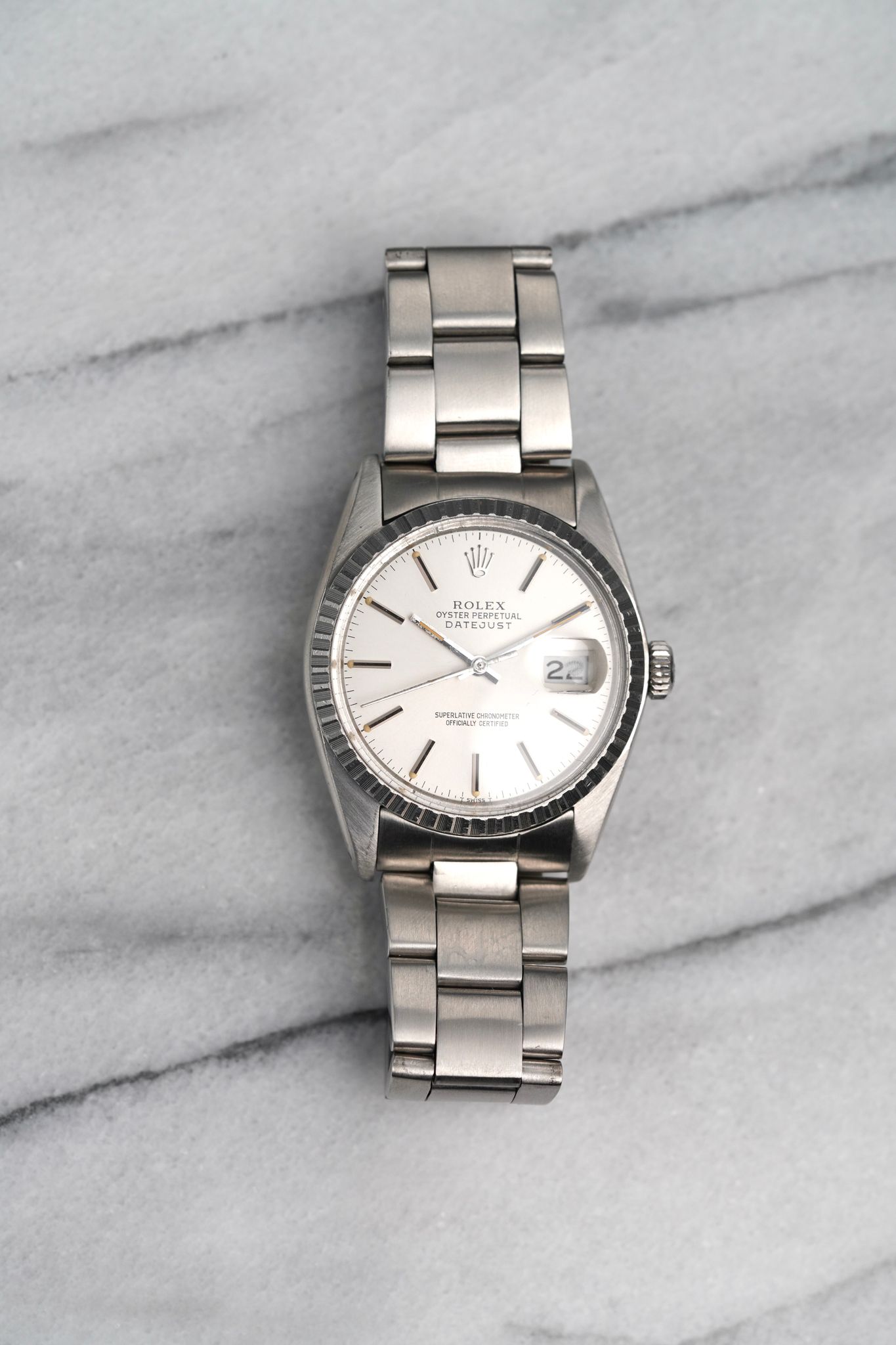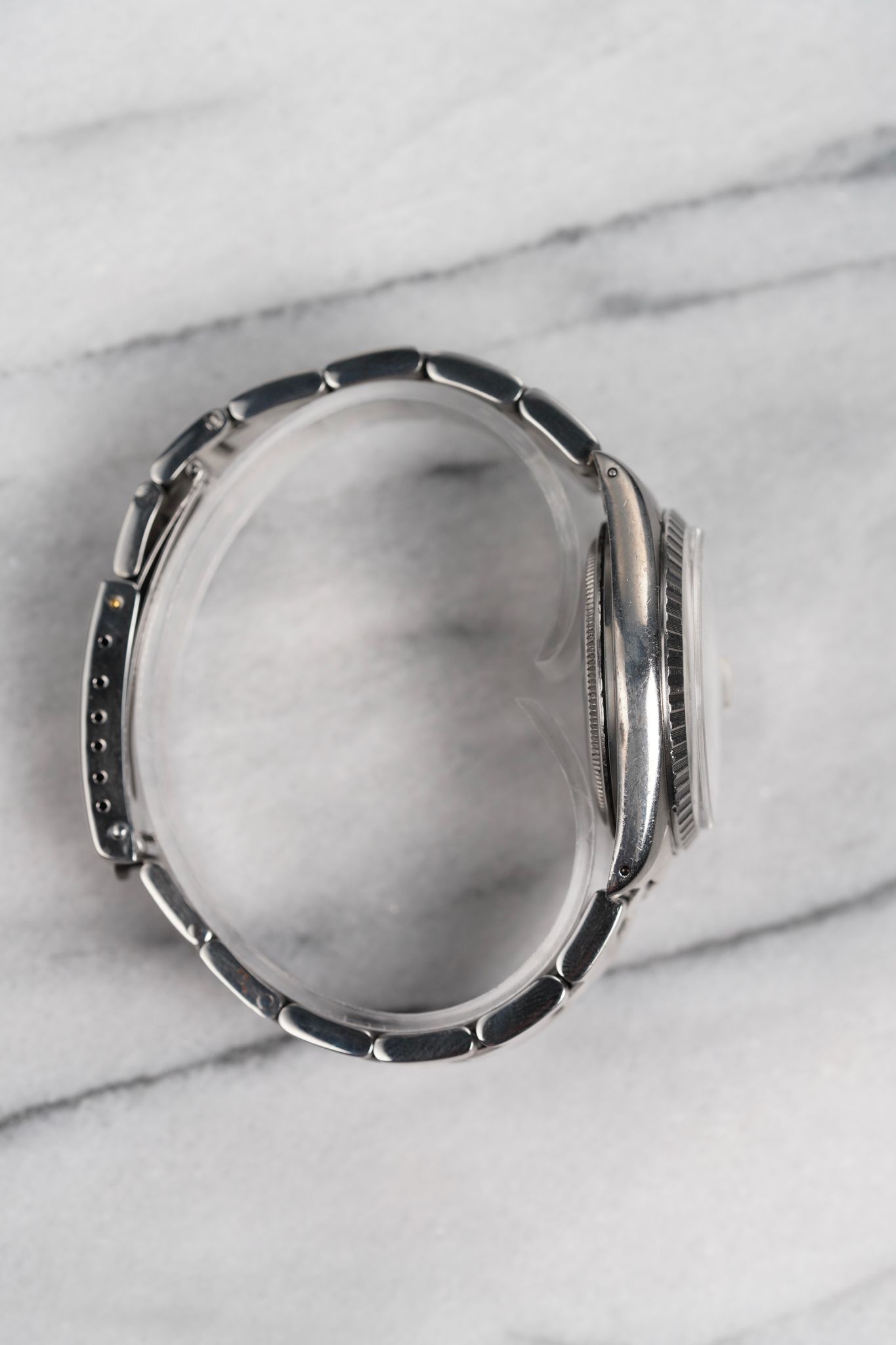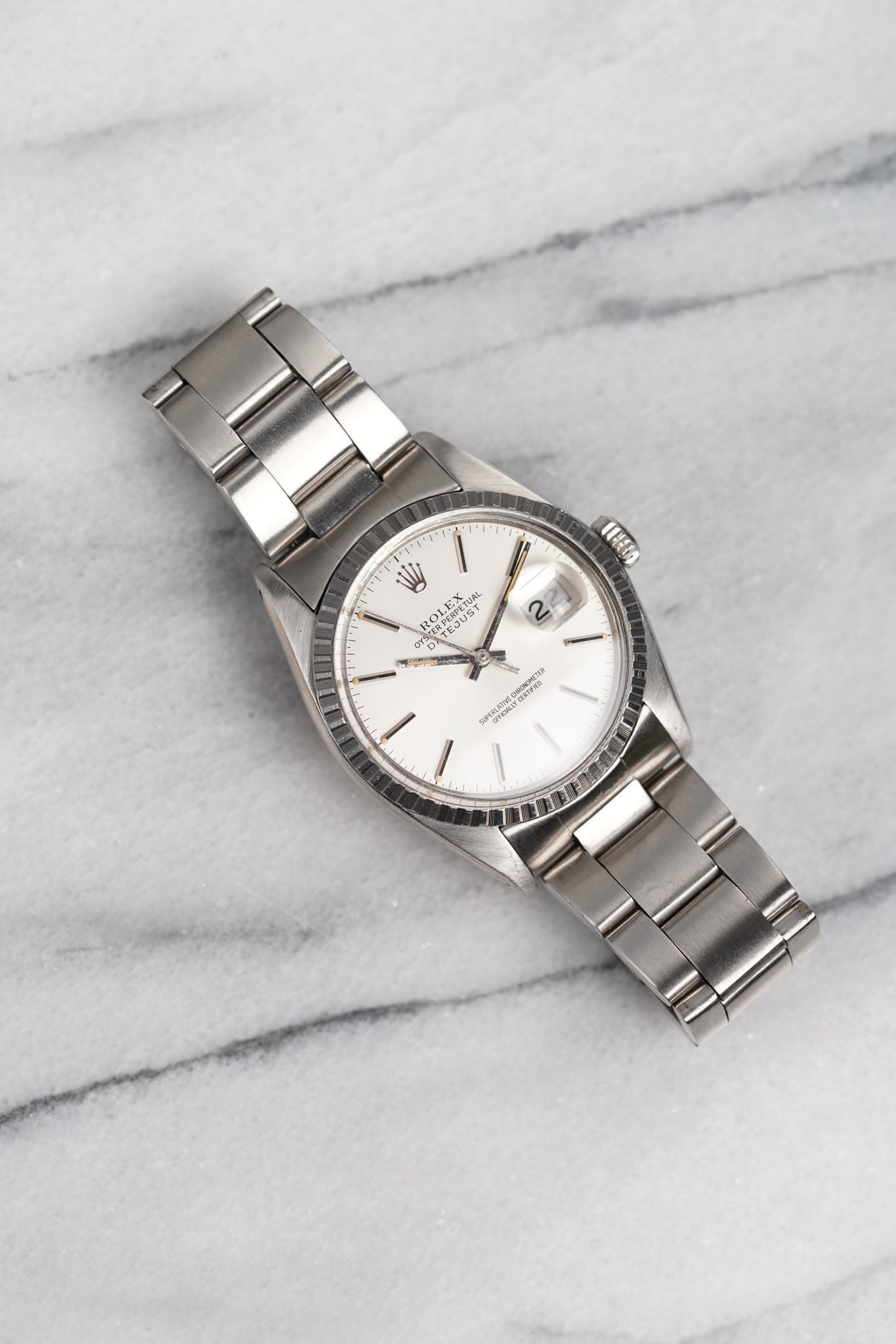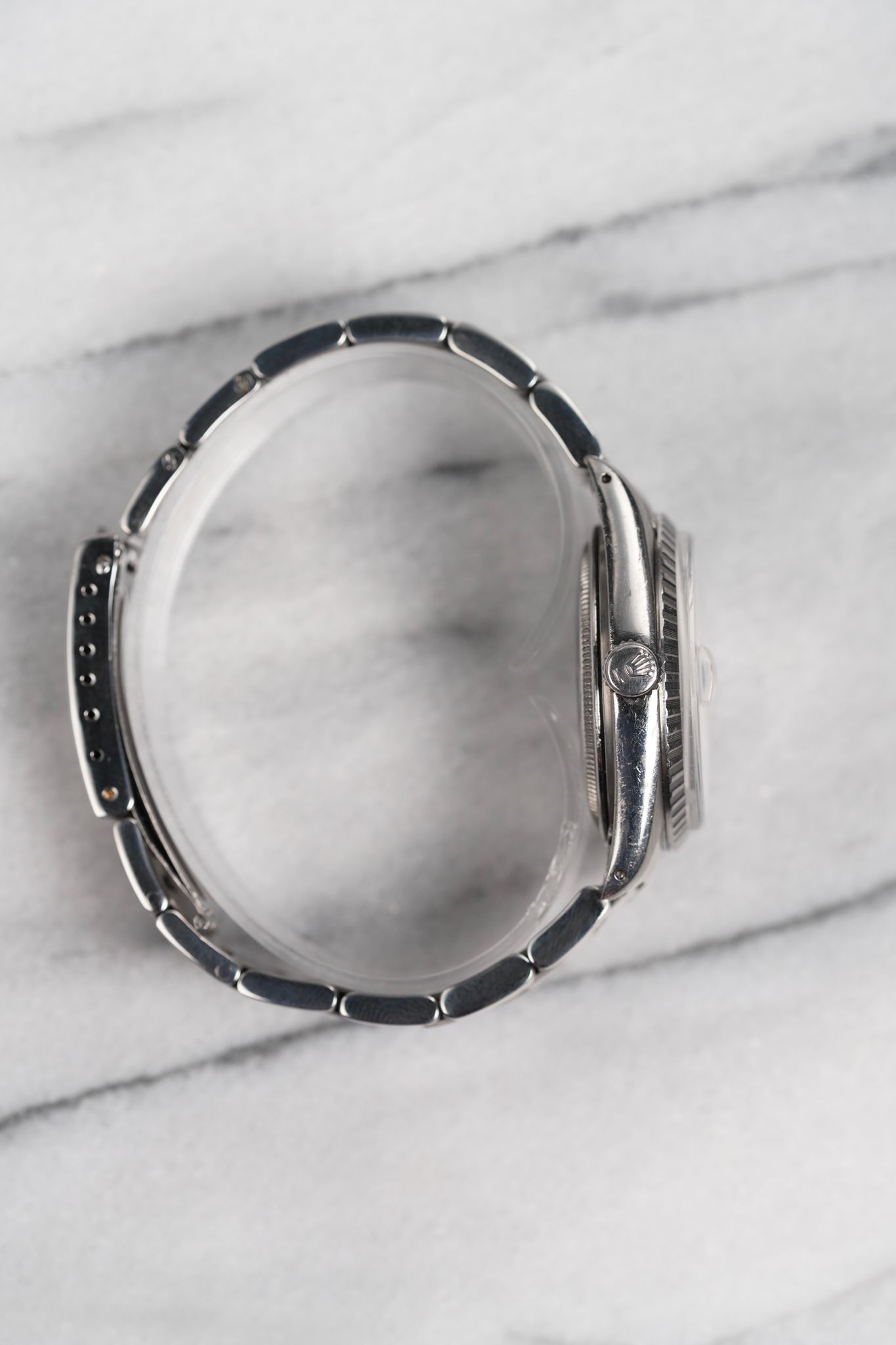 Here’s a Rolex Datejust reference 16030 from the 1980s with a clean silver dial and classic 36mm steel case from the 1980s. Measurements include a 36mm case and 20mm lug width, On a heavy oyster bracelet that fits up to a 7.25 inch wrist. Matching stick hands and hour markers. Lume developed a nice matching patina. Original case, dial, and movement. Fully functional and keeping time.