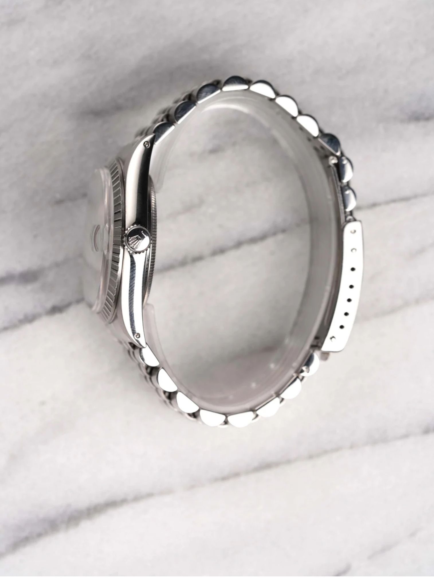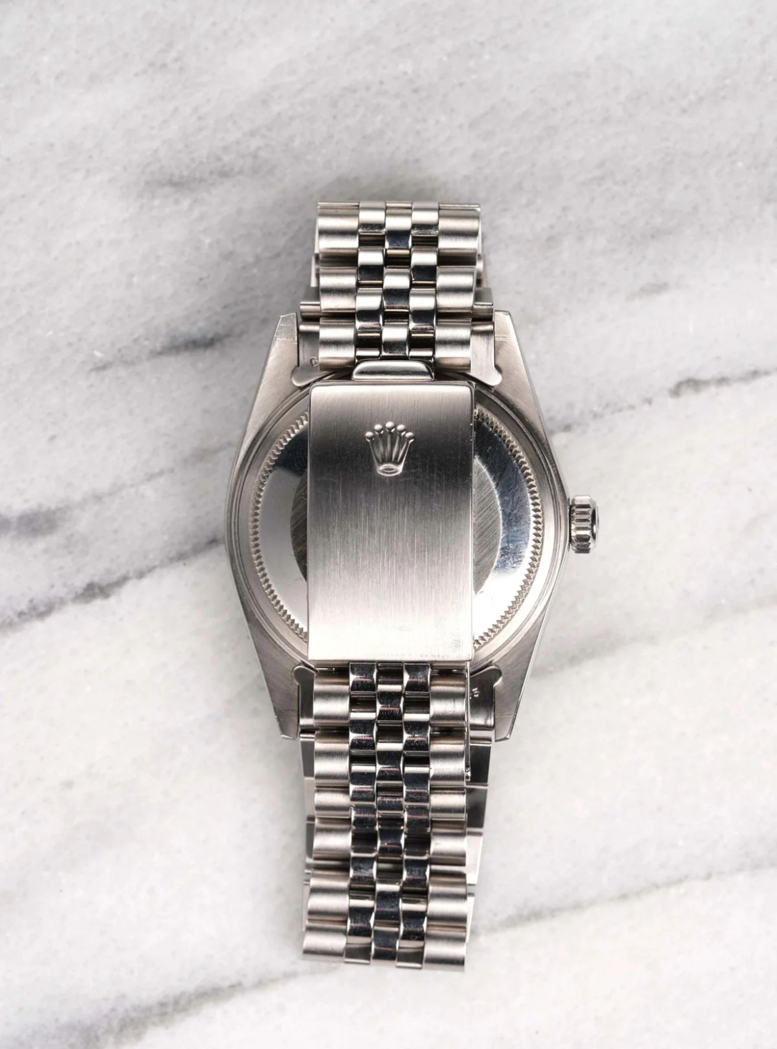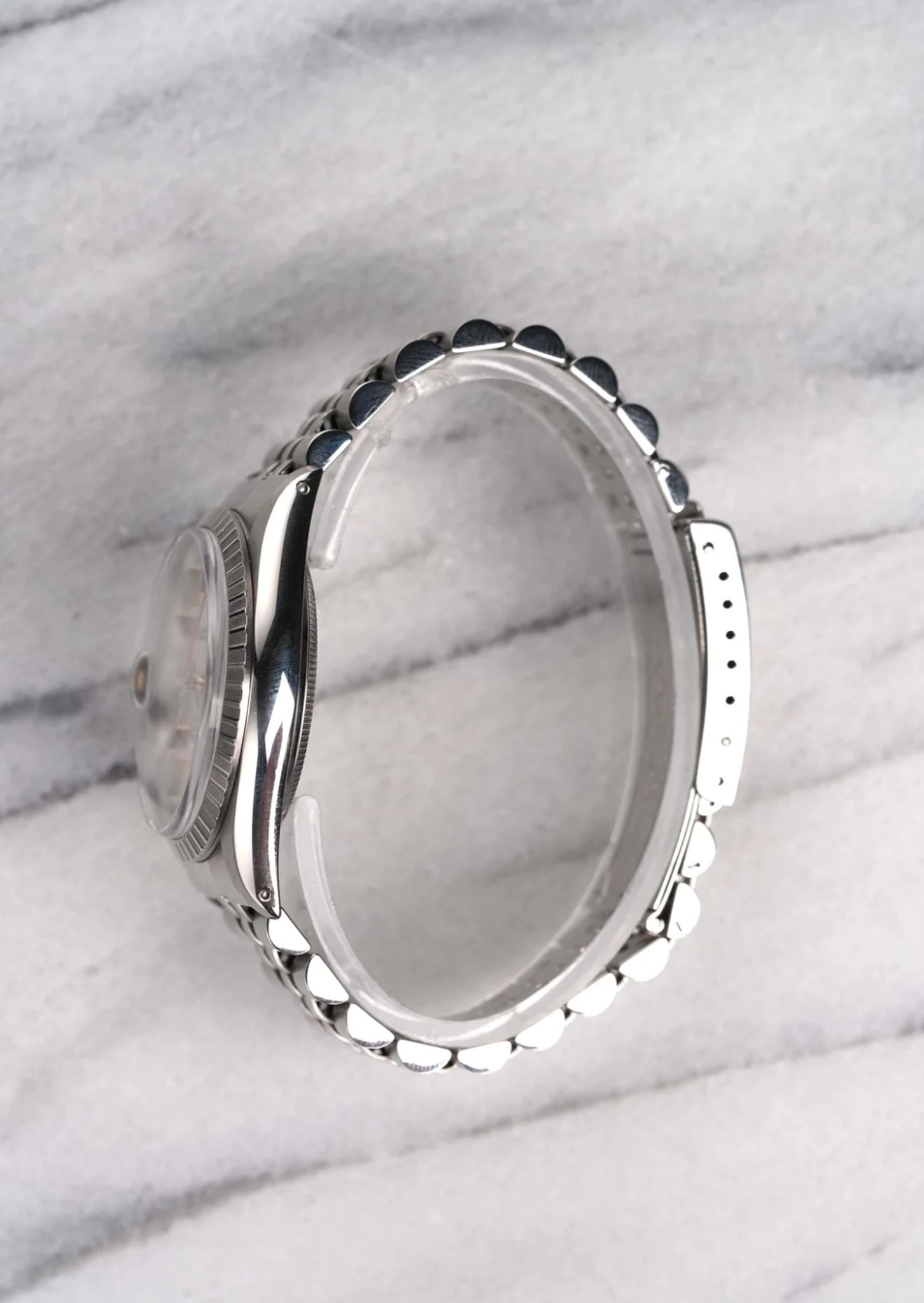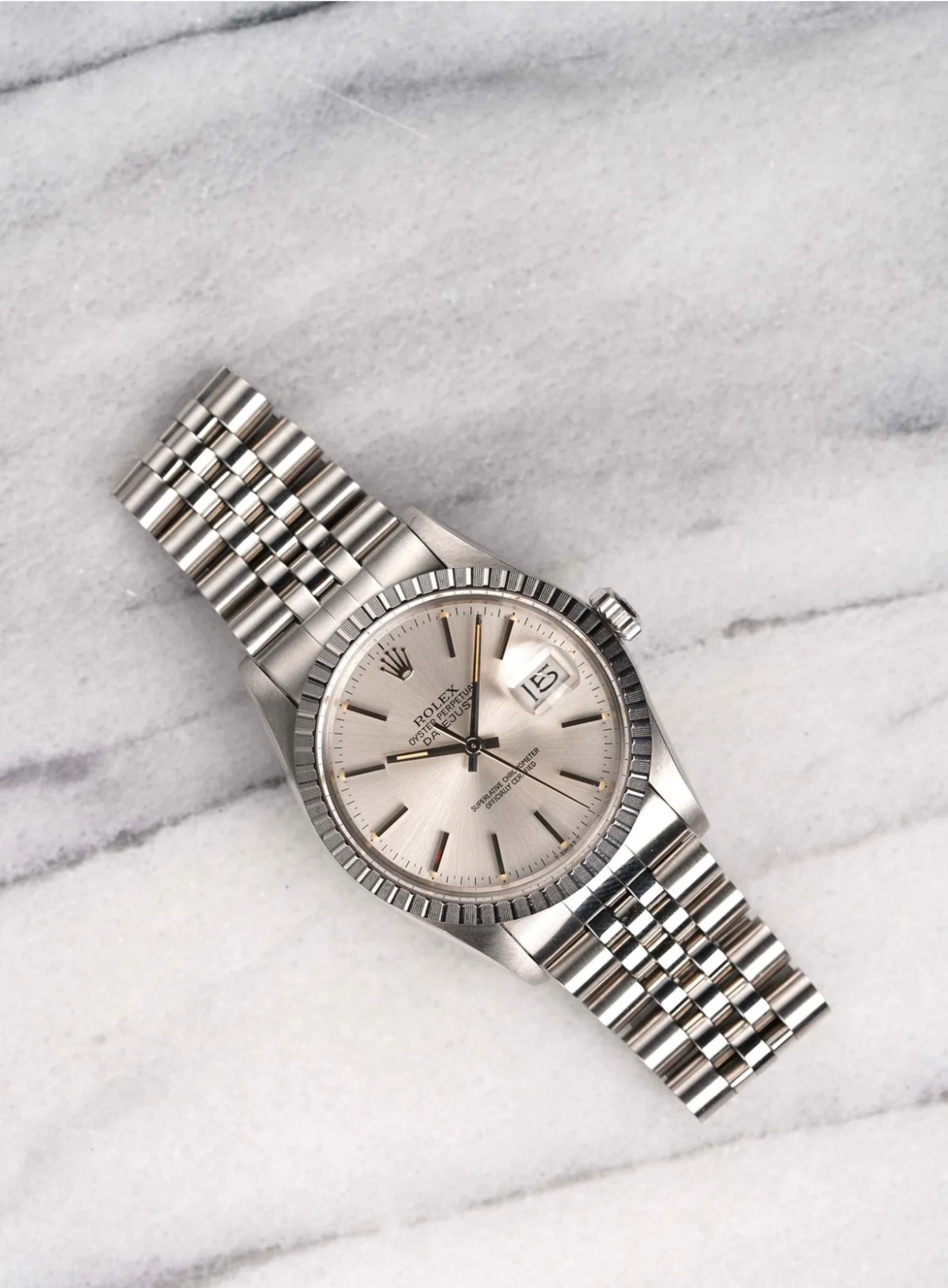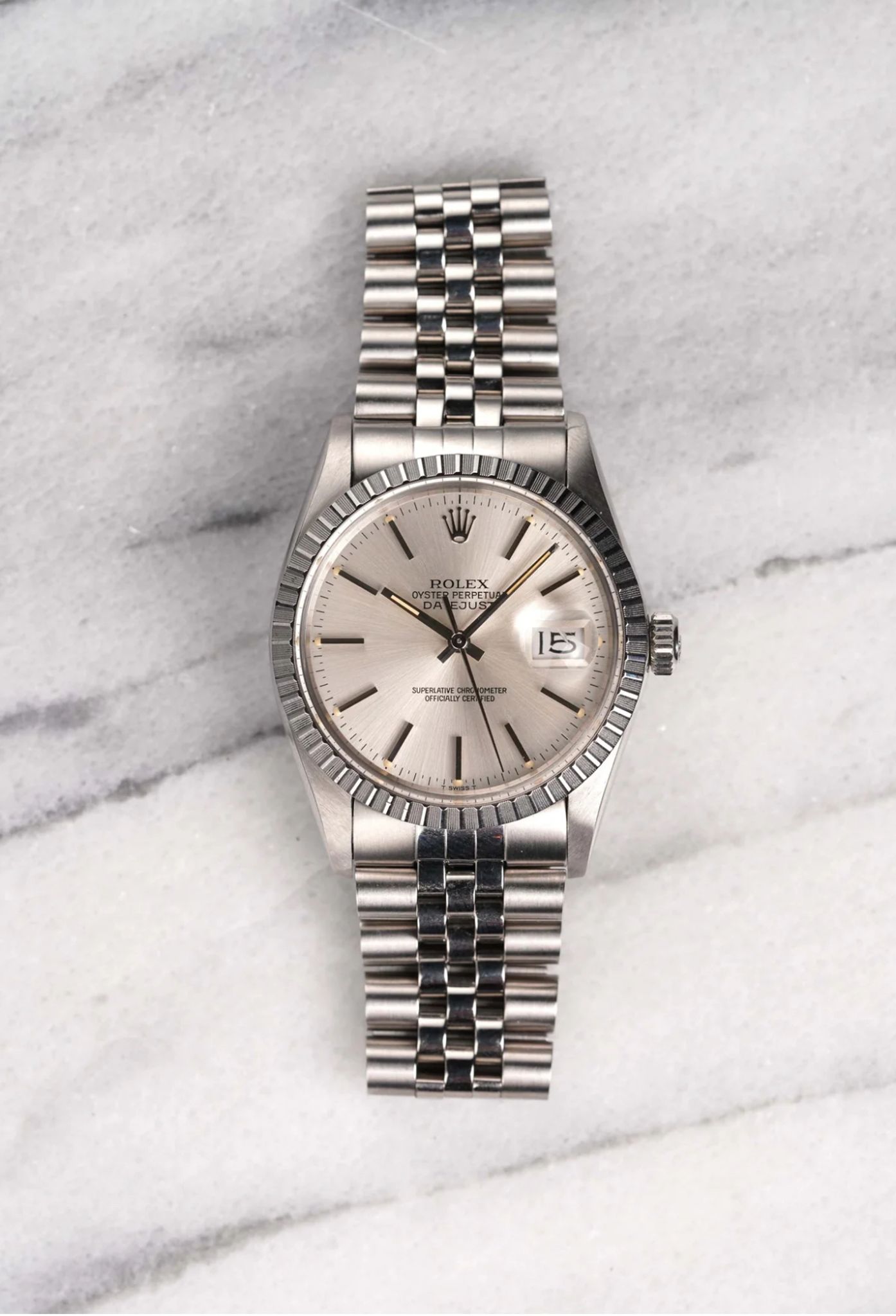 Here's a vintage Rolex Datejust reference 16030 (steel bezel) automatic with a silver sunburst dial on a jubilee bracelet from the 80s. Keeps great time and is fully functional. Measurements include a 36mm oyster case and 20mm lug width. It's on a Rolex oyster bracelet that fits up to a 7.25 inch wrist (555 endlinks). There is some stretch to the bracelet due to wear. The dial has a Roman numeral minute track. Time and quickset date function at 3 a clock. Clean silver sunburst dial and steel engined turned bezel. Steel case and caseback. Lume in both the hands and hour markers developed a nice yellow patina. Drilled lug holes. Matching silver hands and hour markers. Both the dial and crystal are free from any scratches or marks. All parts are original including the signed Rolex crown, dial, movement, and caseback. Both the dial and case are in great cosmetic, untouched condition.