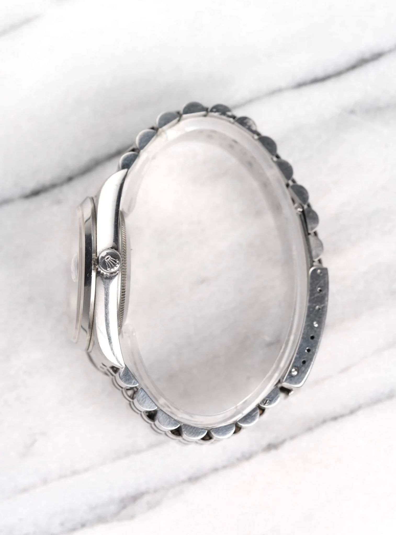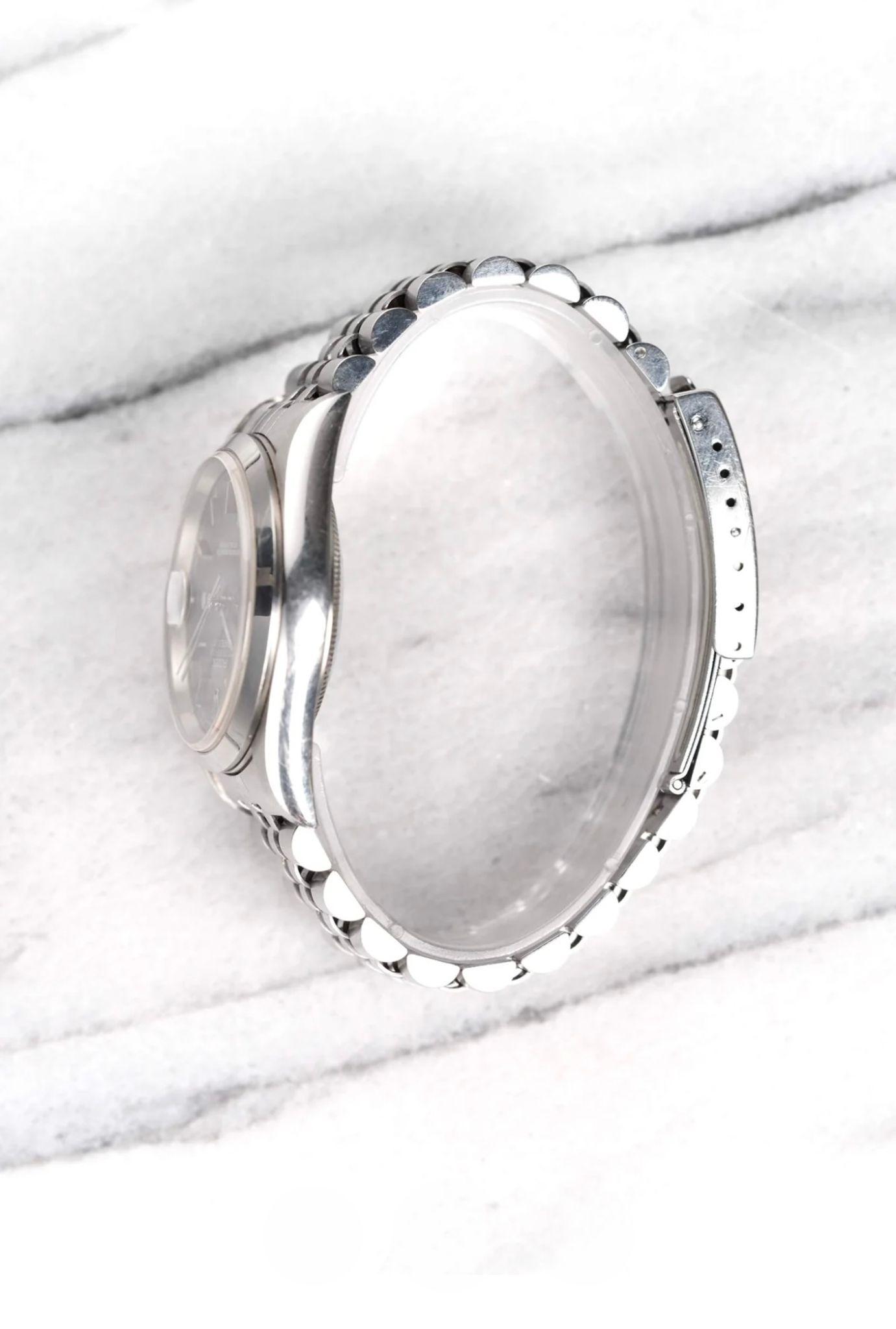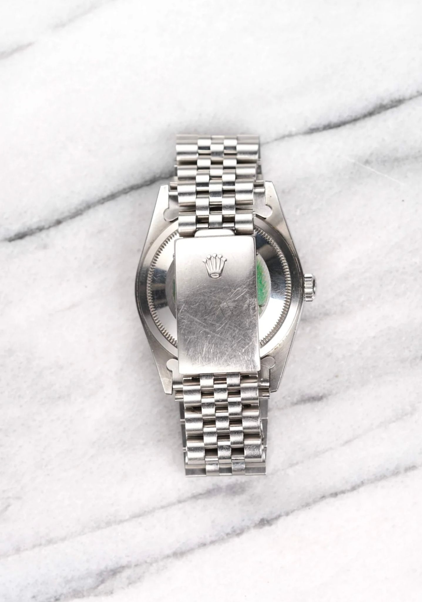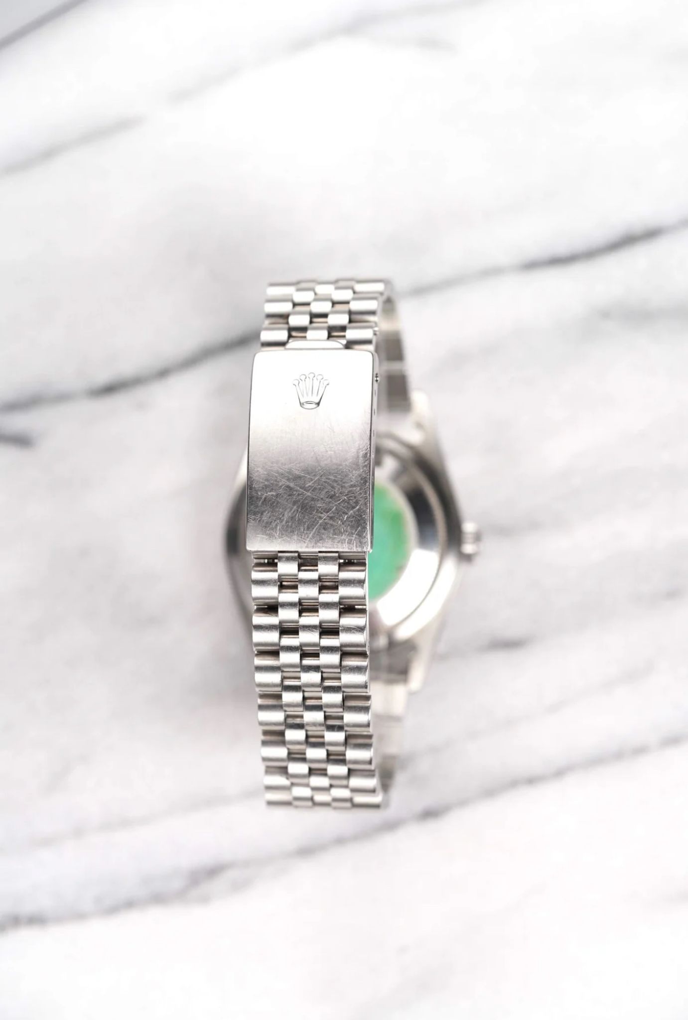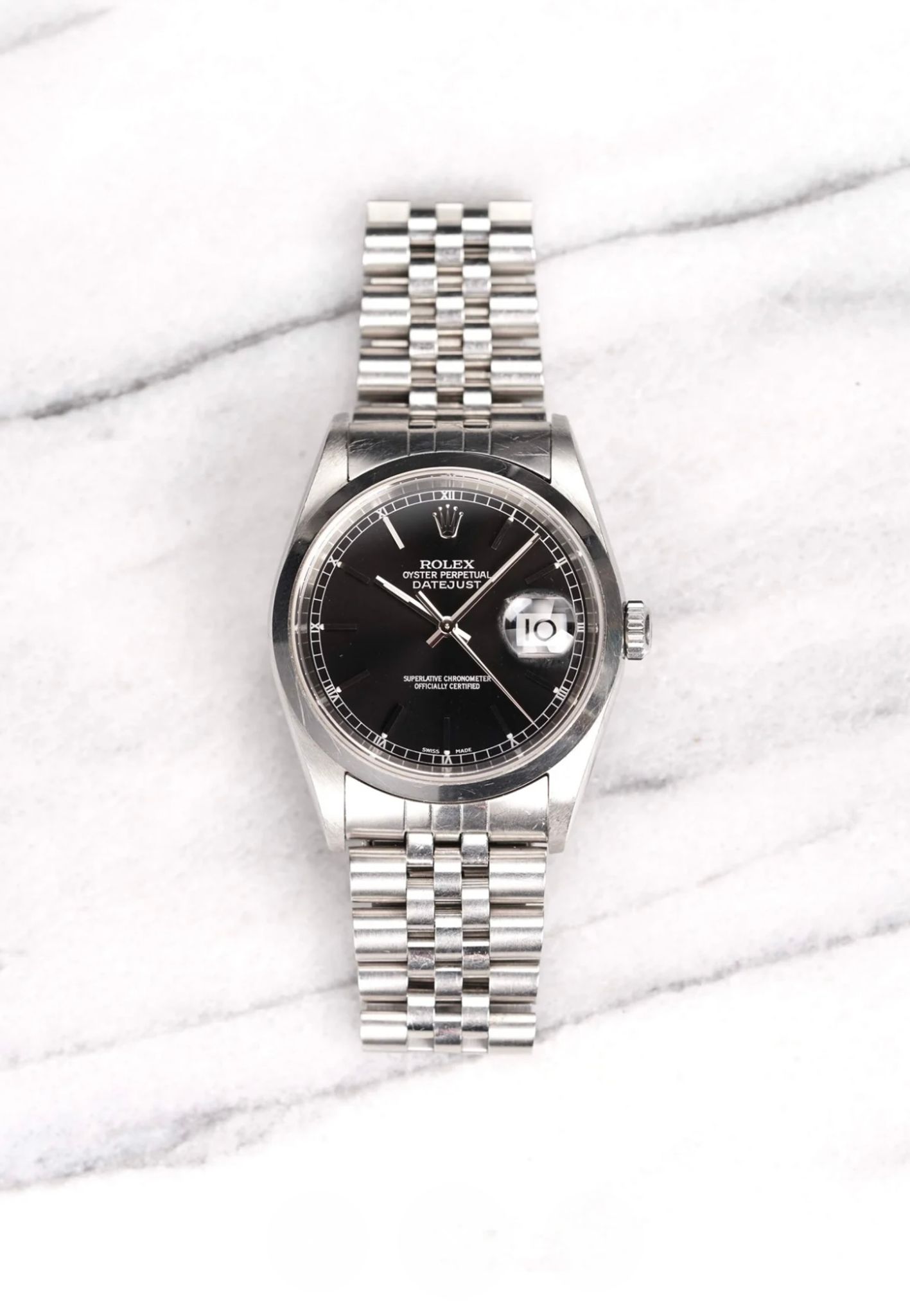 Here's a vintage Rolex Datejust reference 16200 (steel smooth bezel) automatic with a black dial (roman outer track) on a jubilee bracelet from the 80s. Keeps great time and is fully functional. Measurements include a 36mm oyster case and 20mm lug width. Has its original It's on a jubilee bracelet that fits up to a 7.25 inch wrist. Time and quick date function at 3 a clock. Clean black dial and steel bezel. Steel case and caseback. The lume in both the hands and have matching white tritium. No holes case. Both the dial and crystal are free from any scratches or marks. All parts are original including the signed Rolex crown, dial, movement, and caseback. Both the dial and case are in great cosmetic, untouched condition.
