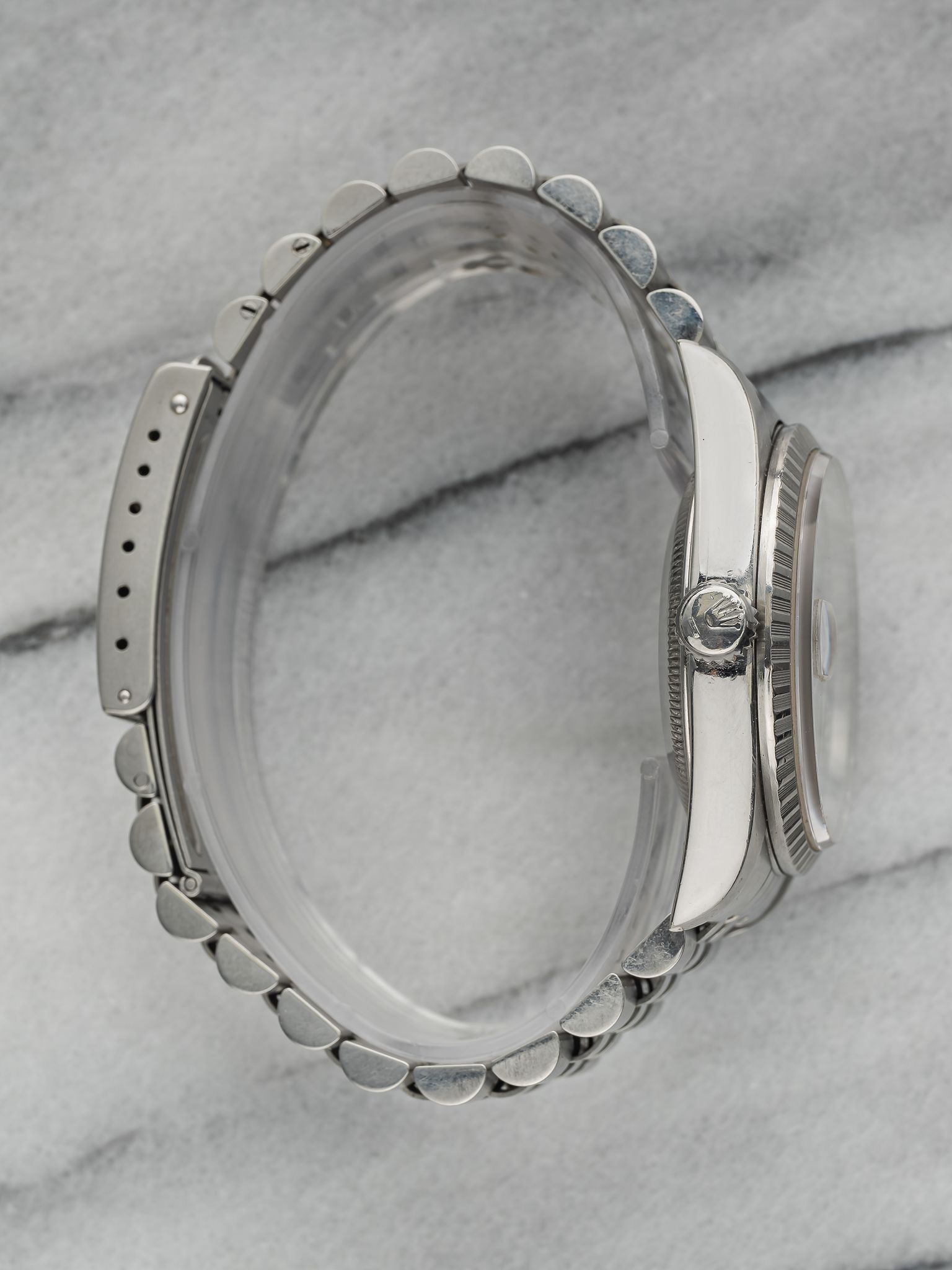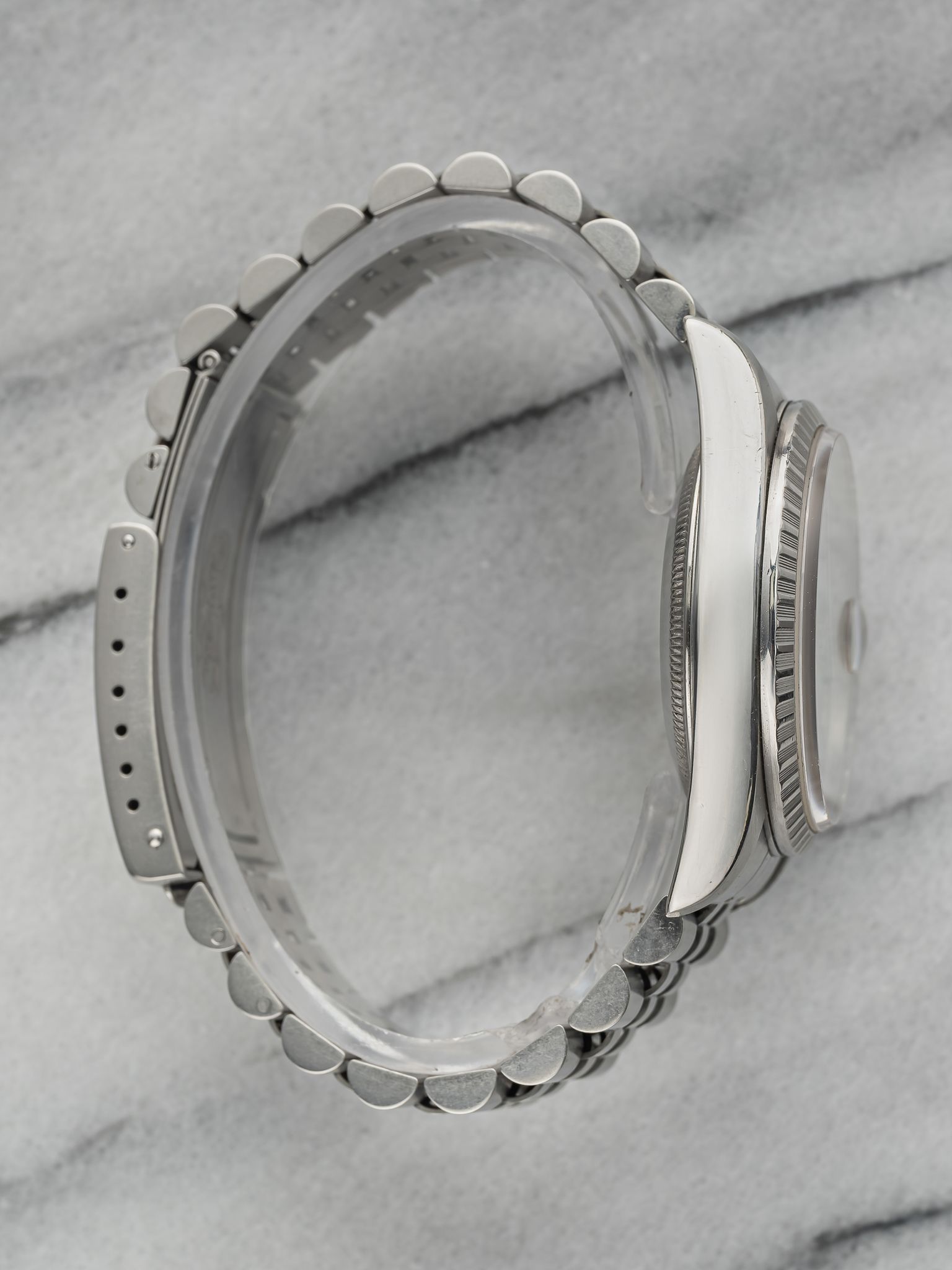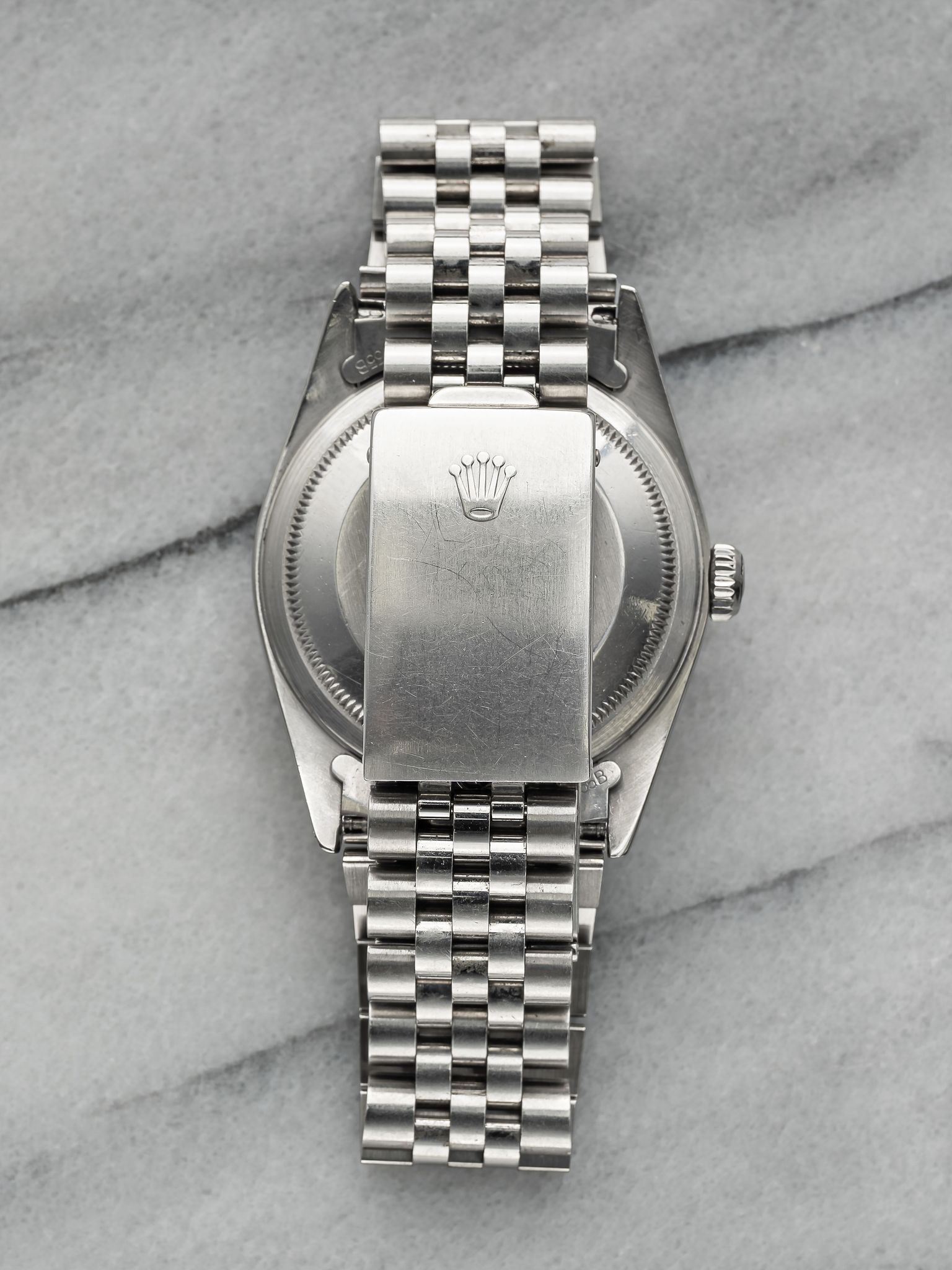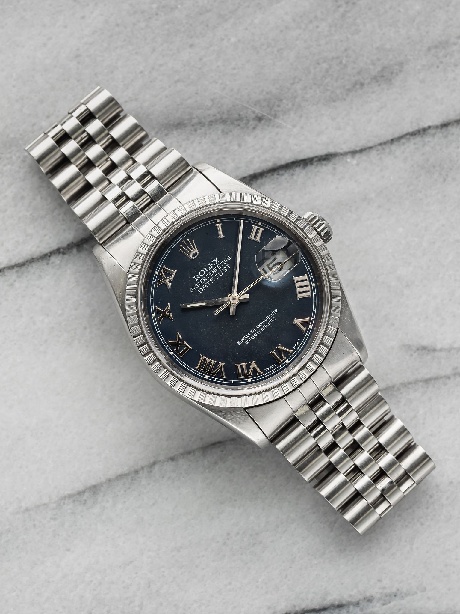Here's a vintage Rolex Datejust reference 16220 (steel bezel) automatic with a blue roman dial on a jubilee bracelet from the 1990s. Measurements include a 36mm oyster case and 20mm lug width. It's on a Rolex jubilee bracelet that fits up to a 7 inch wrist (555 endlinks). Steel case and caseback. The lume in both the hands are crisp white. No holes case. All parts are original including the signed Rolex crown, dial, movement, and caseback. Both the dial and case are in great cosmetic, untouched condition.