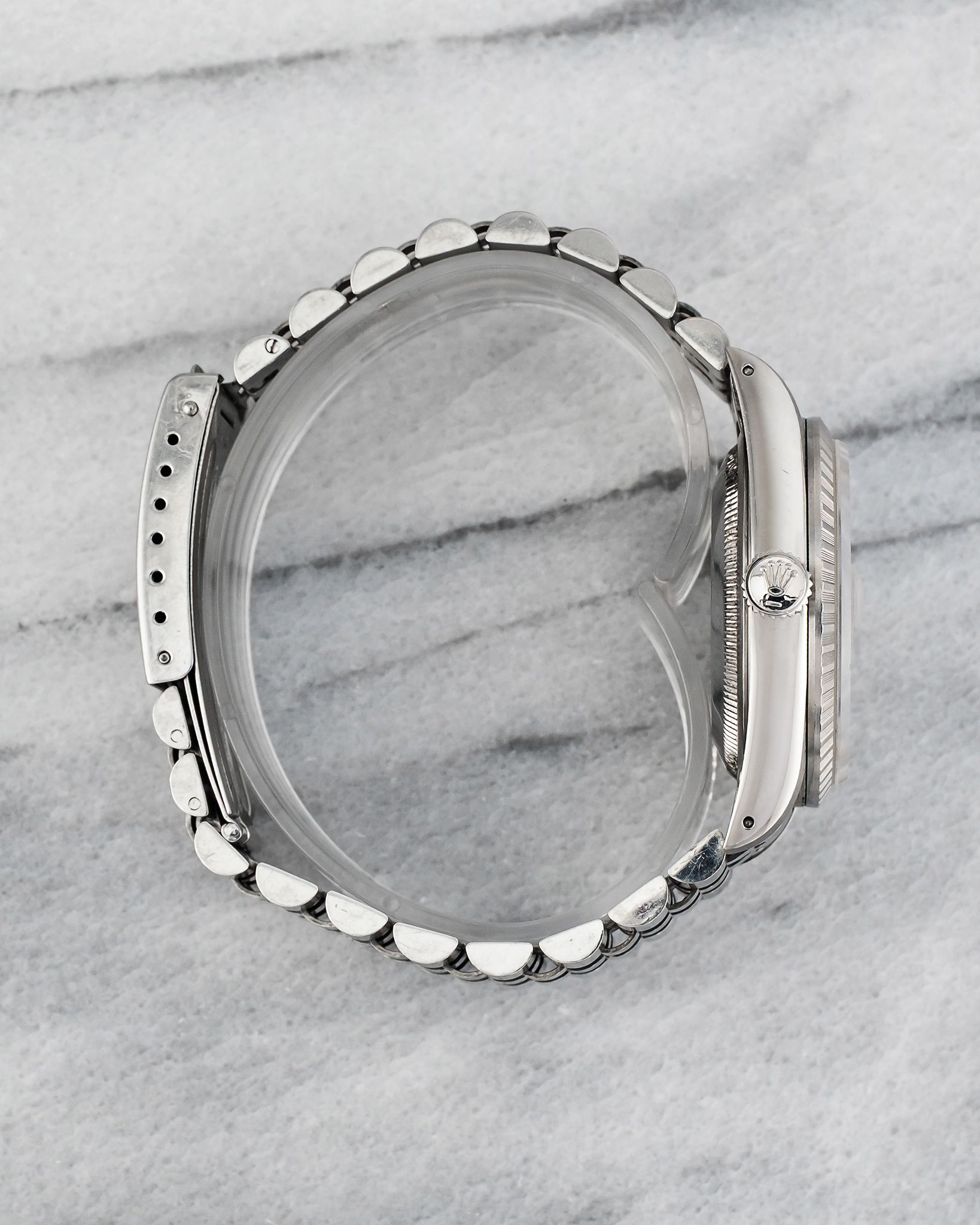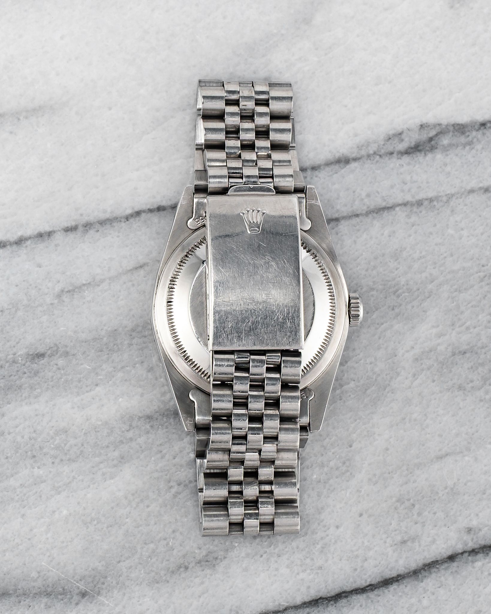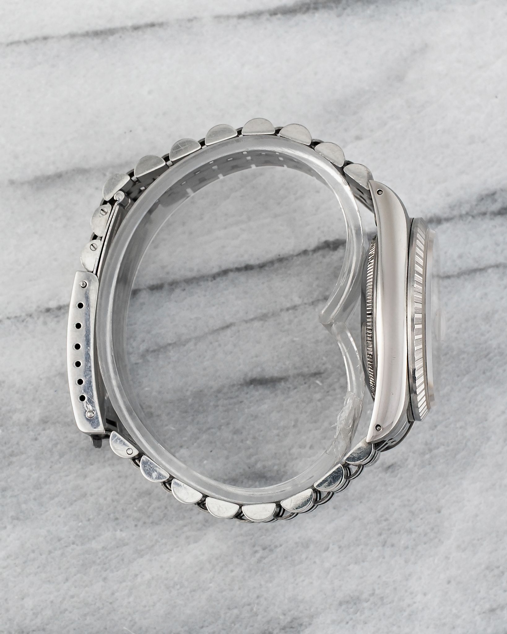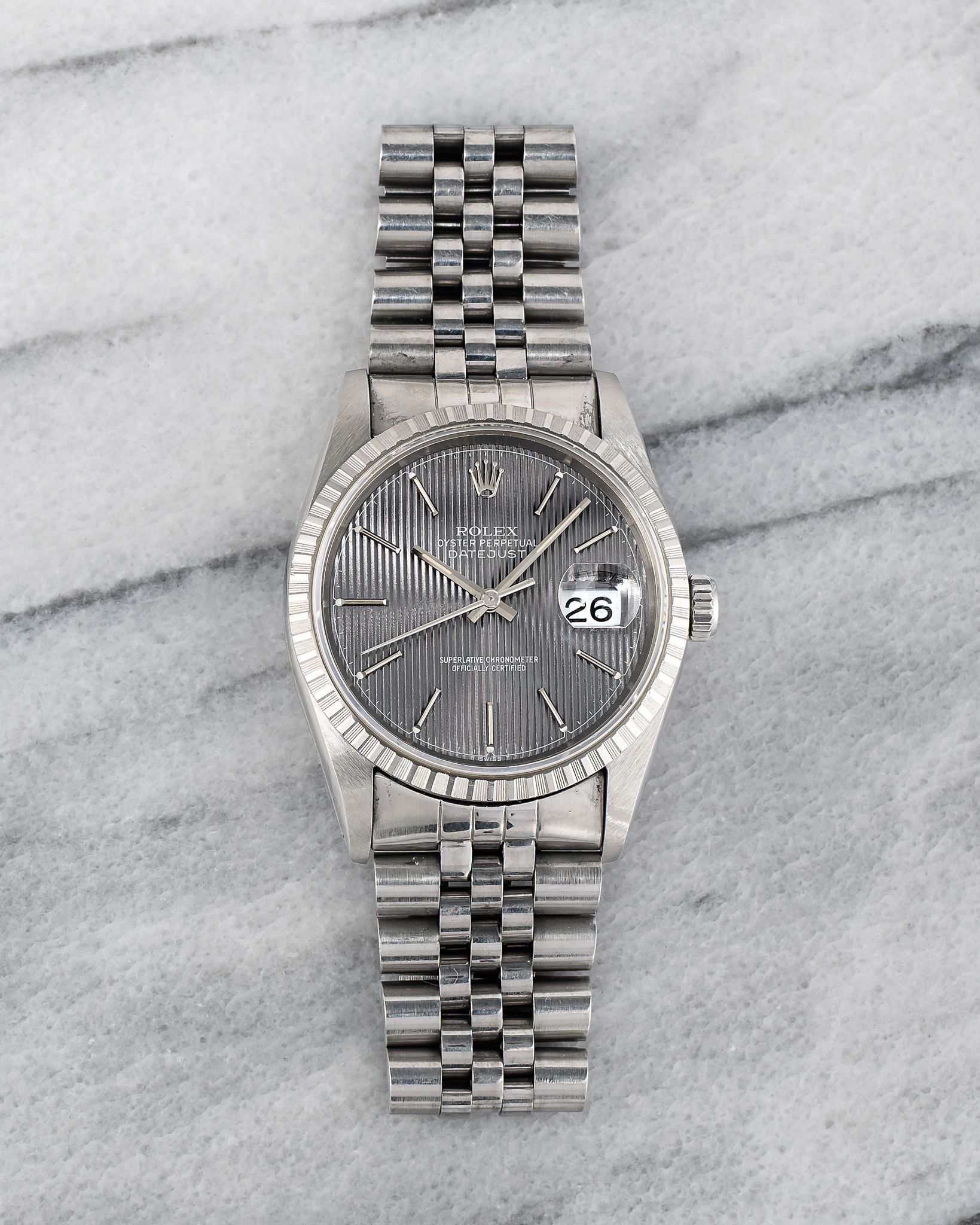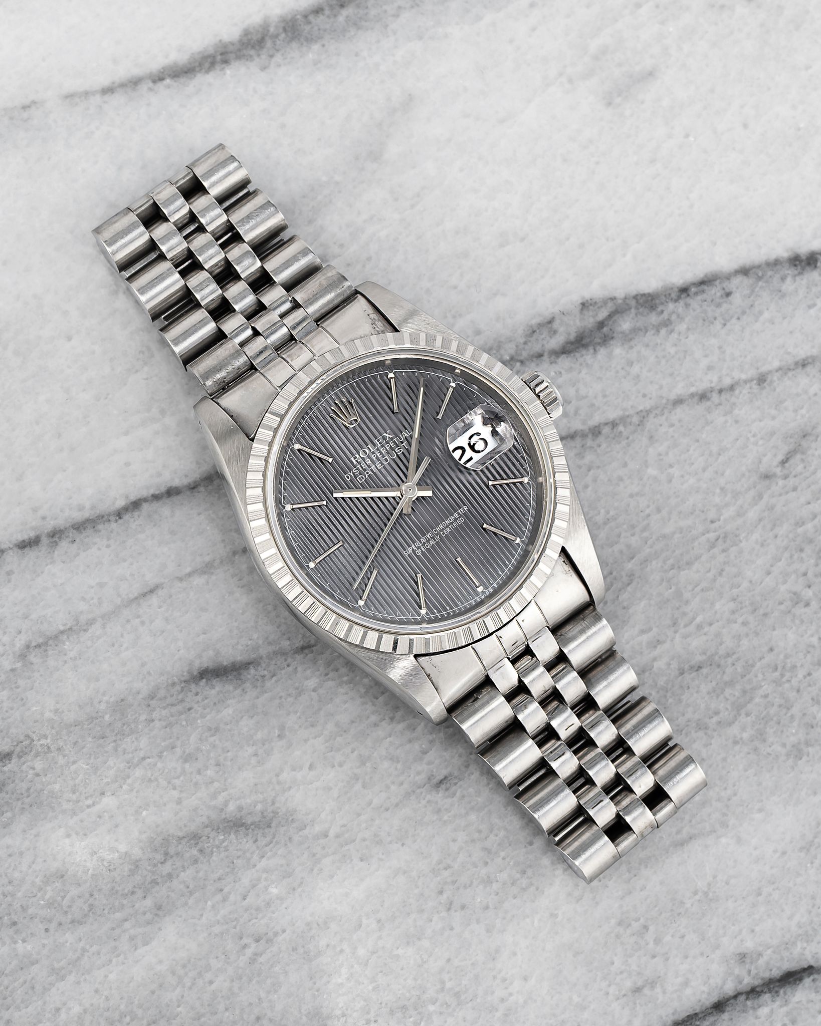 Here's a vintage Rolex Datejust reference 16220 (steel bezel) automatic with a grey tapestry dial on a jubilee bracelet from the 1990s. Recently serviced. Keeps great time and is fully functional. Measurements include a 36mm oyster case and 20mm lug width. It's on a Rolex jubilee bracelet that fits up to a 7 inch wrist (555 endlinks).The bracelet is in great shape. Time and quick date function at 3 a clock. Clean grey tapestry dial and steel bezel. Steel case and caseback. The lume in both the hands and have matching patina. Drilled lug holes (Holes case) Both the dial and crystal are free from any scratches or marks. All parts are original including the signed Rolex crown, dial, movement, and caseback. Both the dial and case are in great cosmetic, untouched condition.