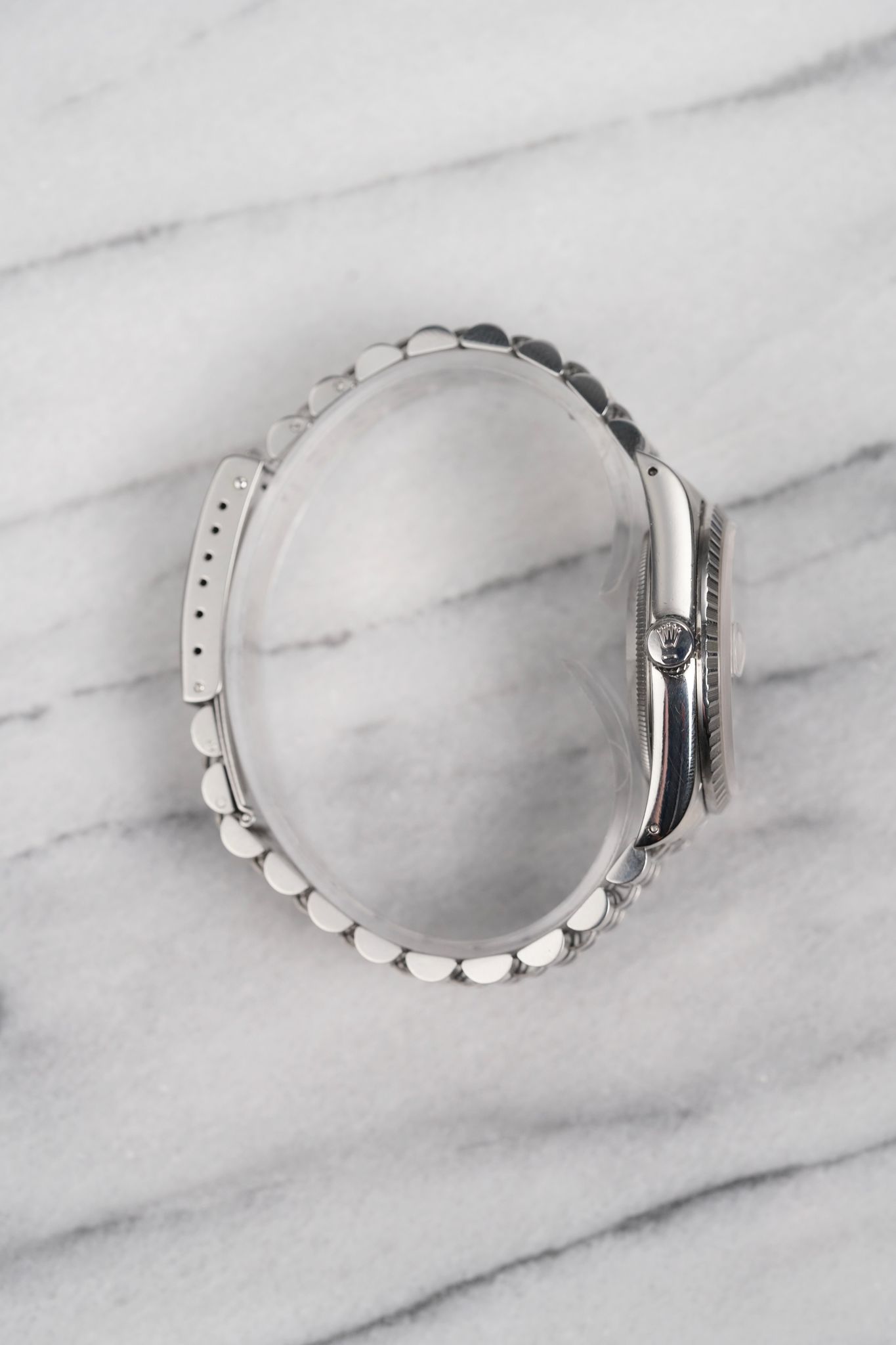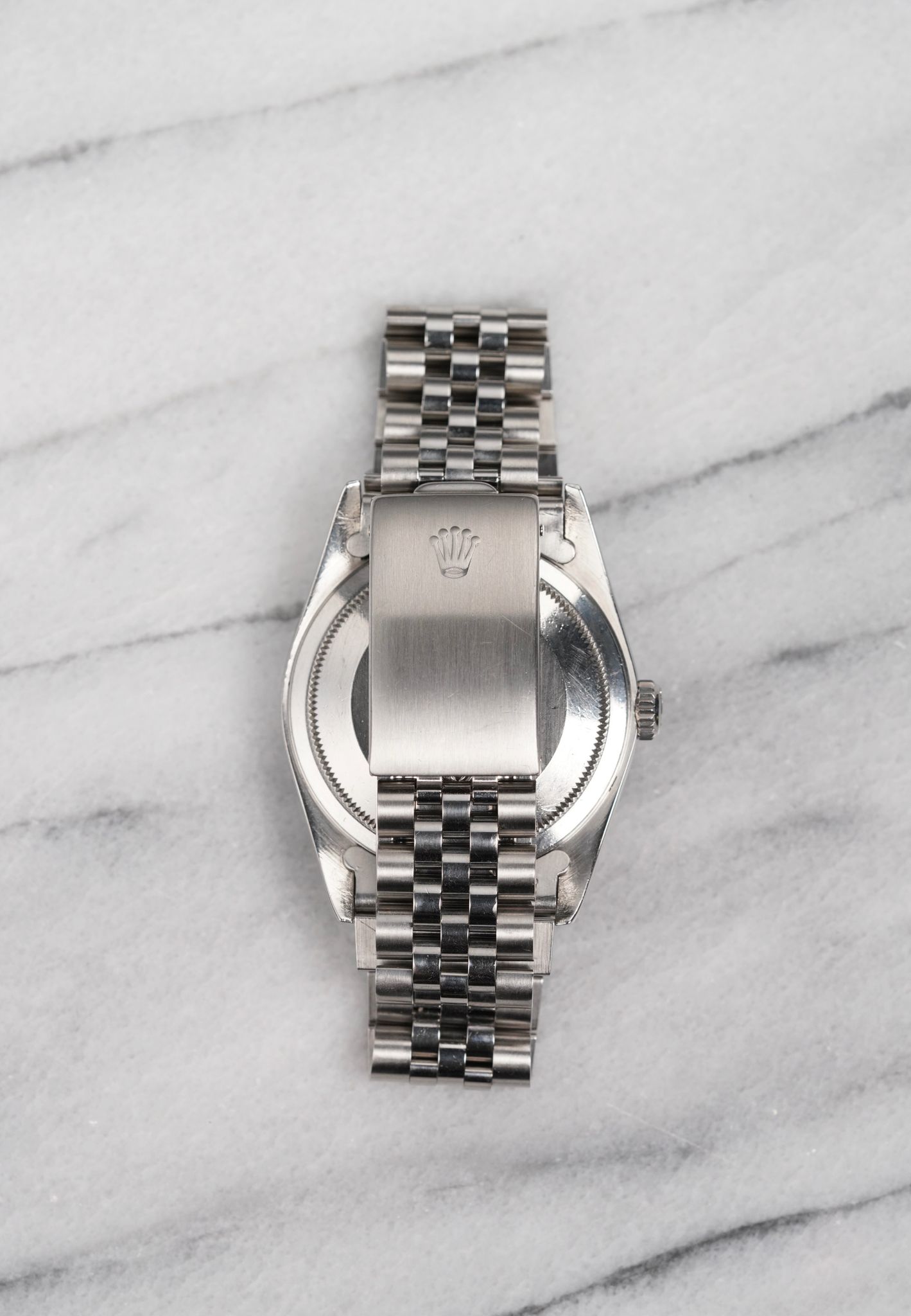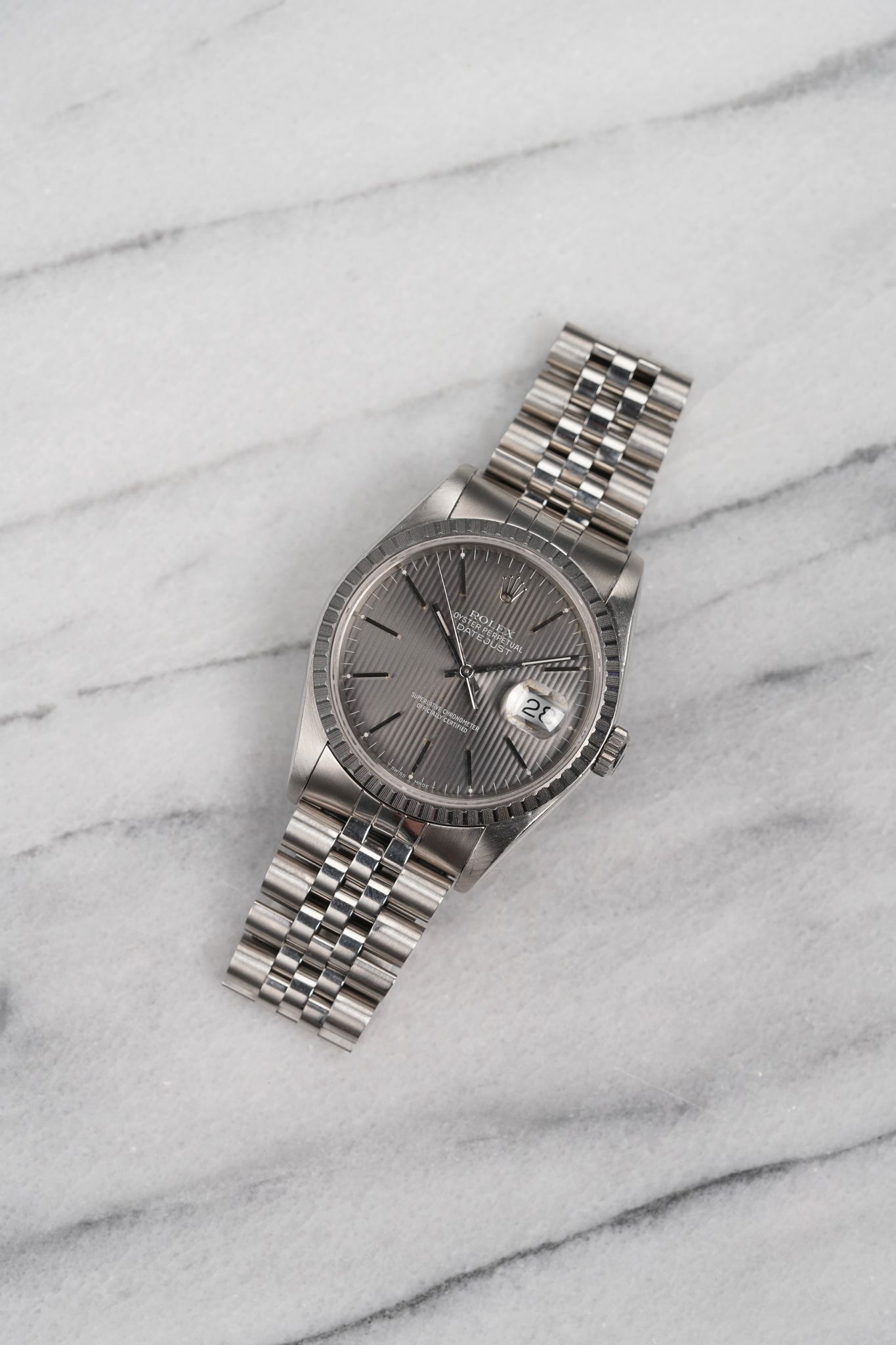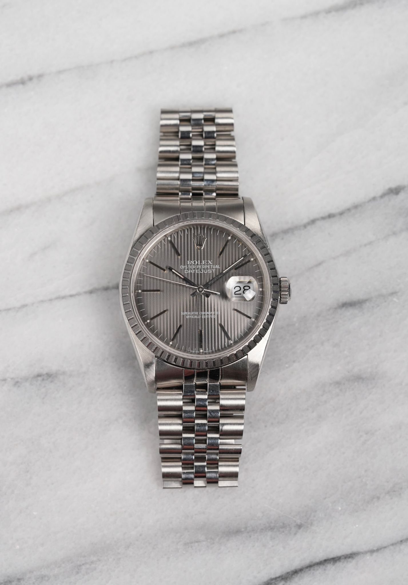 Here's a vintage Rolex Datejust reference 16220 (steel bezel) automatic with a grey tapestry dial on a jubilee bracelet from the 1990s. Keeps great time and is fully functional. Measurements include a 36mm oyster case and 20mm lug width. It's on a Rolex jubilee bracelet that fits up to a 7 inch wrist (555 endlinks).The bracelet is in great shape. Time and quick date function at 3 a clock. Clean grey tapestry dial and steel bezel. Steel case and caseback. The lume in both the hands and have matching patina. Drilled lug holes (Holes case) Both the dial and crystal are free from any scratches or marks. All parts are original including the signed Rolex crown, dial, movement, and caseback. Both the dial and case are in great cosmetic, untouched condition.