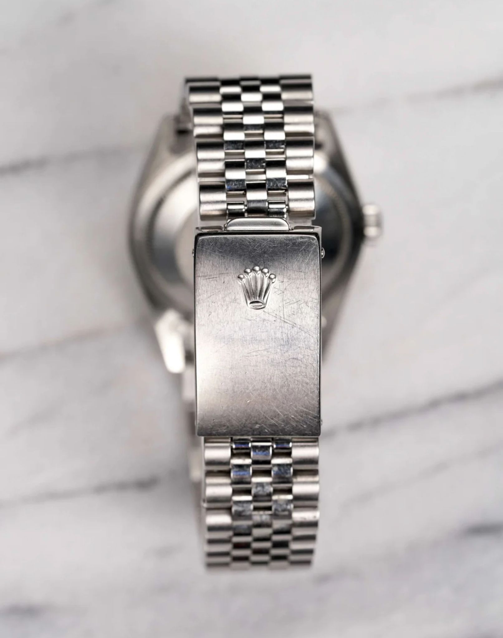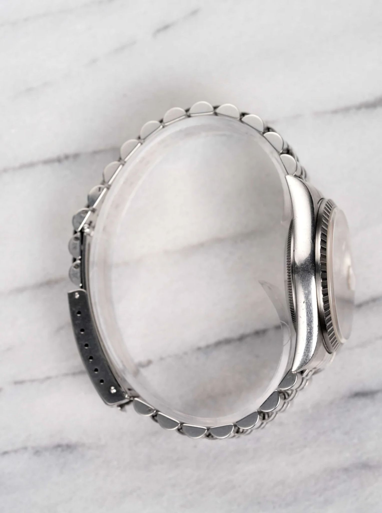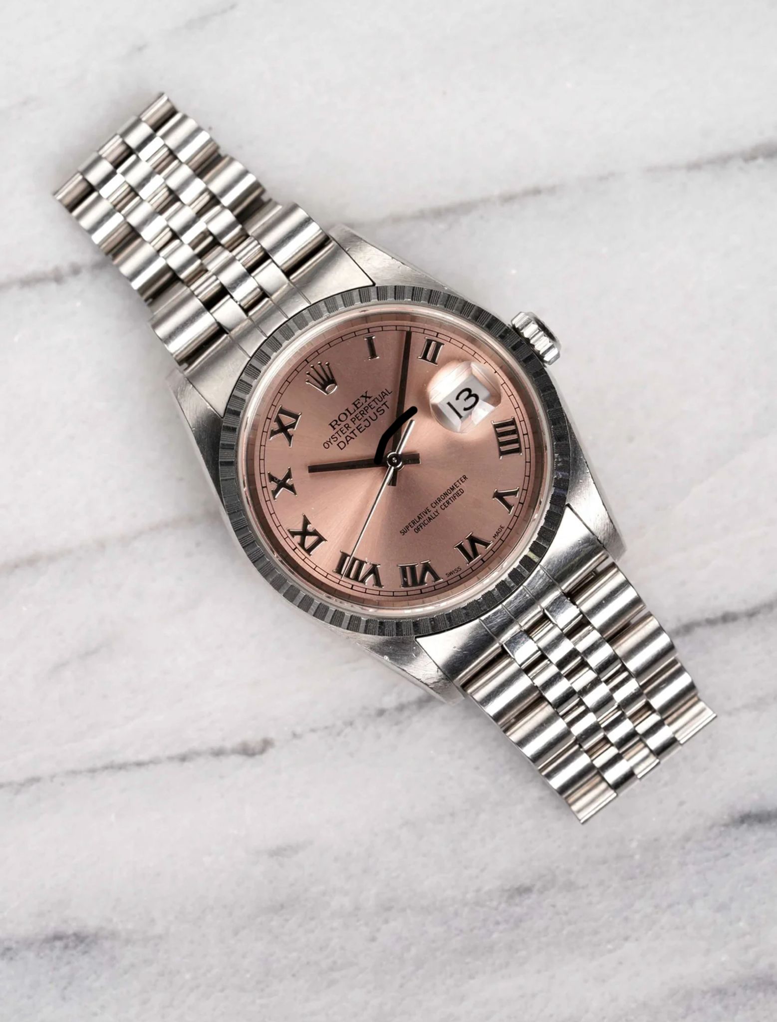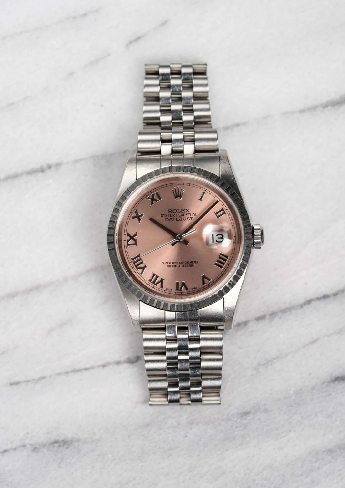Here's a Rolex Datejust reference 16220 automatic with a salmon Roman numeral dial from the late 90s. Keeps great time and is fully functional. Measurements include a 36mm oyster case and 20mm lug width. It's on a Rolex jubilee bracelet that fits up to an 7.25 inch wrist (555 B endlinks). The bracelet has a little stretch to it, due to wear. Time and quick date function at 3 a clock. Steel engined turned bezel and sapphire crystal. Steel case and caseback. No lume dial. No holes case. Matching silver hands and Roman numerals. Bracelet still in great shape with little stretch. Both the dial and crystal are free from any scratches or marks. All parts are original including the signed Rolex crown, dial, movement, and caseback. Both the dial and case are in great cosmetic, untouched condition.
