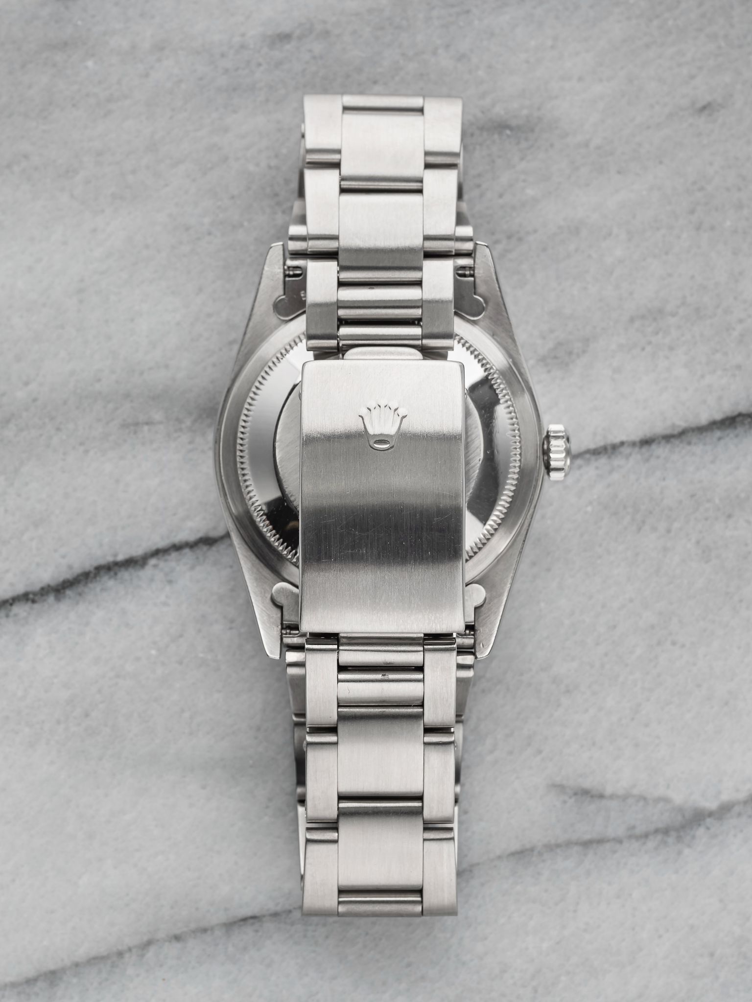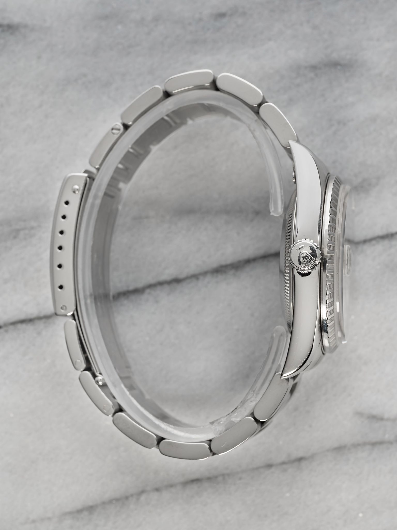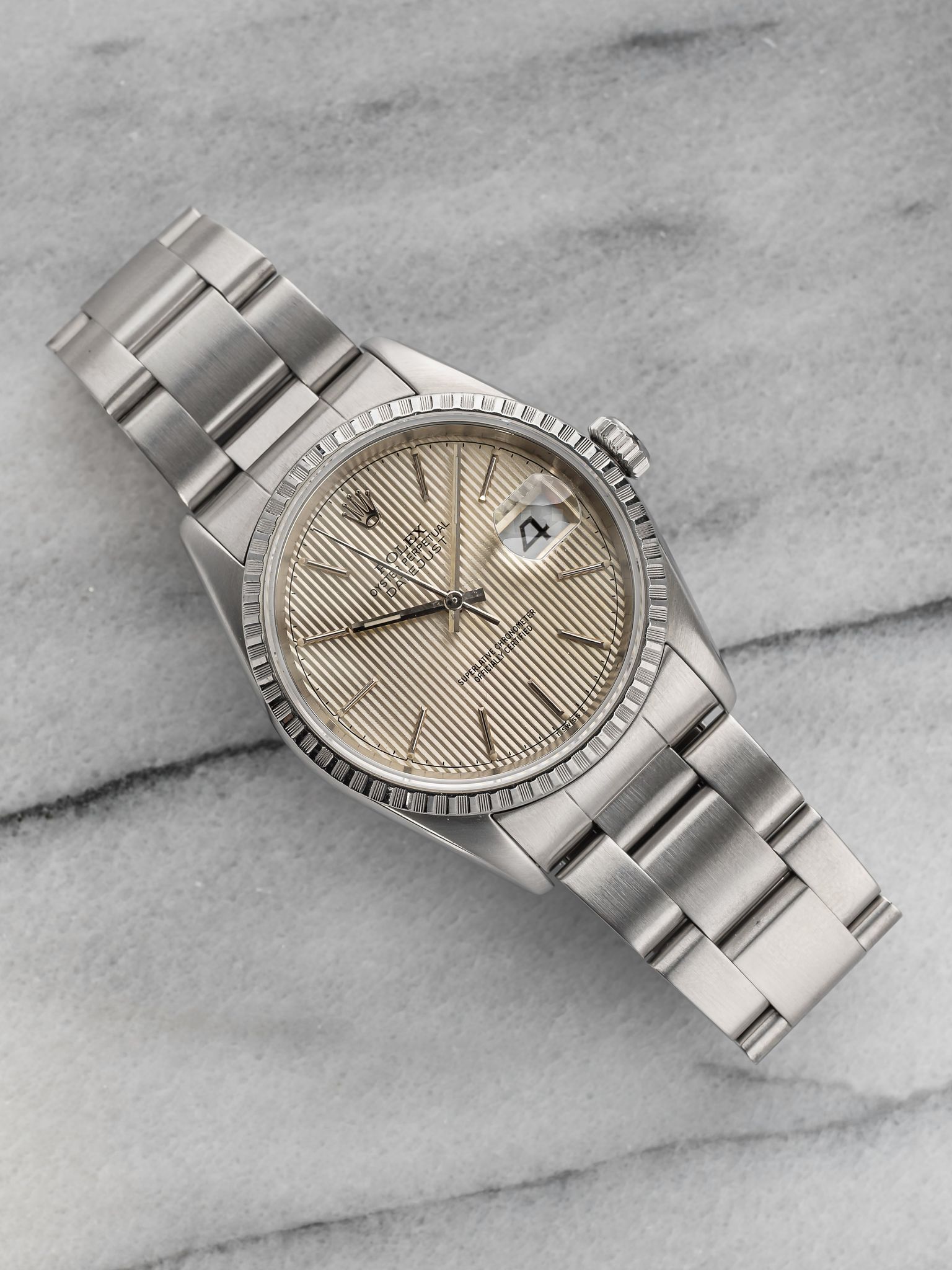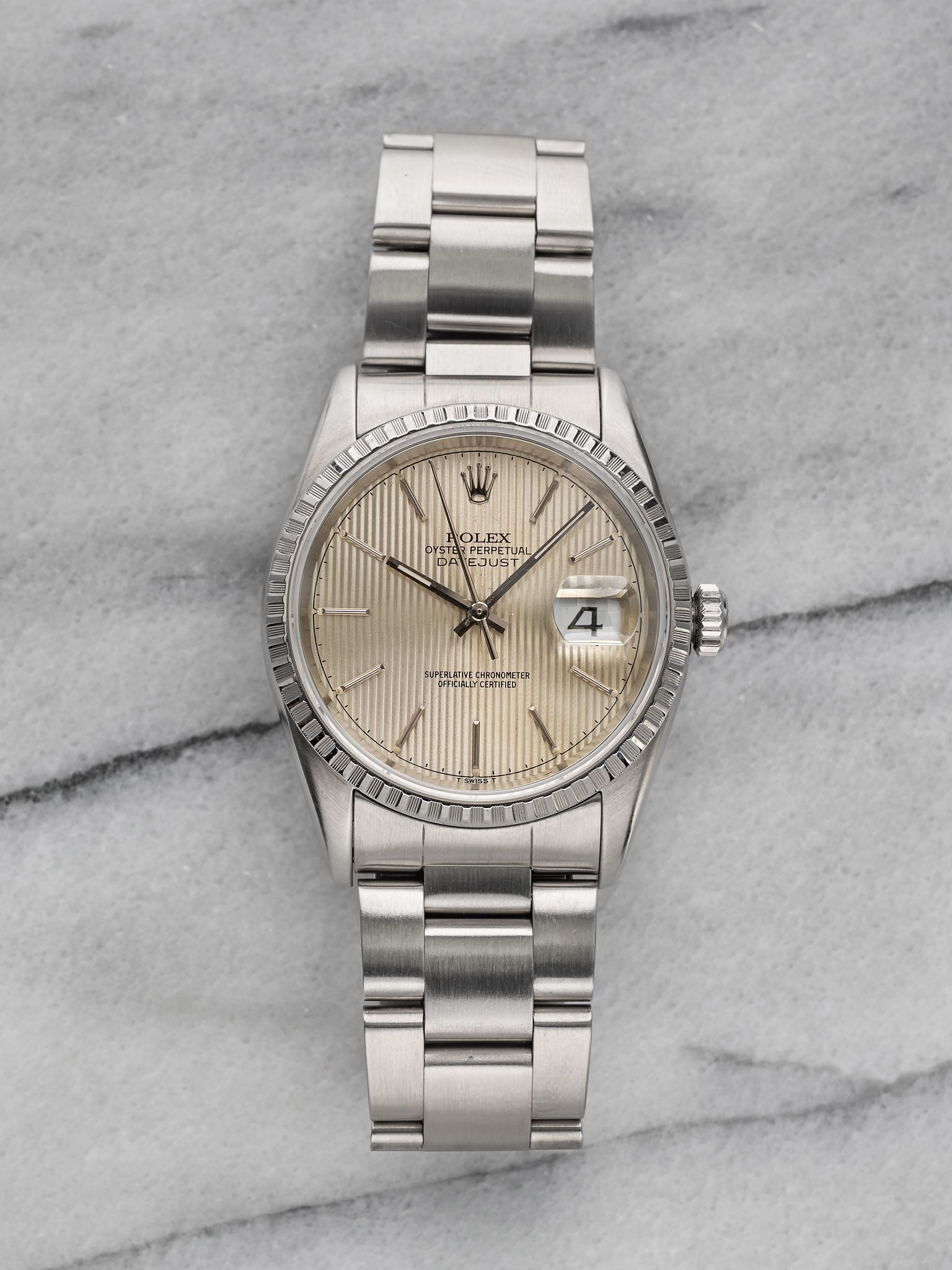 Here's a Rolex Datejust reference 16220 automatic with a silver tapestry dial from the 1990s. Keeps great time and is fully functional. Comes with its box, papers, and pamphlets. Quickset date function a t 3 o’clock. Measurements include a 36mm oyster case and 20mm lug width. It's on a Rolex heavy oyster bracelet that fits up to a 7 inch wrist (78690 bracelet) Time only. Clean silver dial. Steel case and caseback. Holes case. Swiss made dial at 6 a clock. Both the dial and crystal are free from any scratches or marks. All parts are original, including the signed Rolex crown, dial, movement, and caseback. Both the dial and case are in great cosmetic, untouched condition.