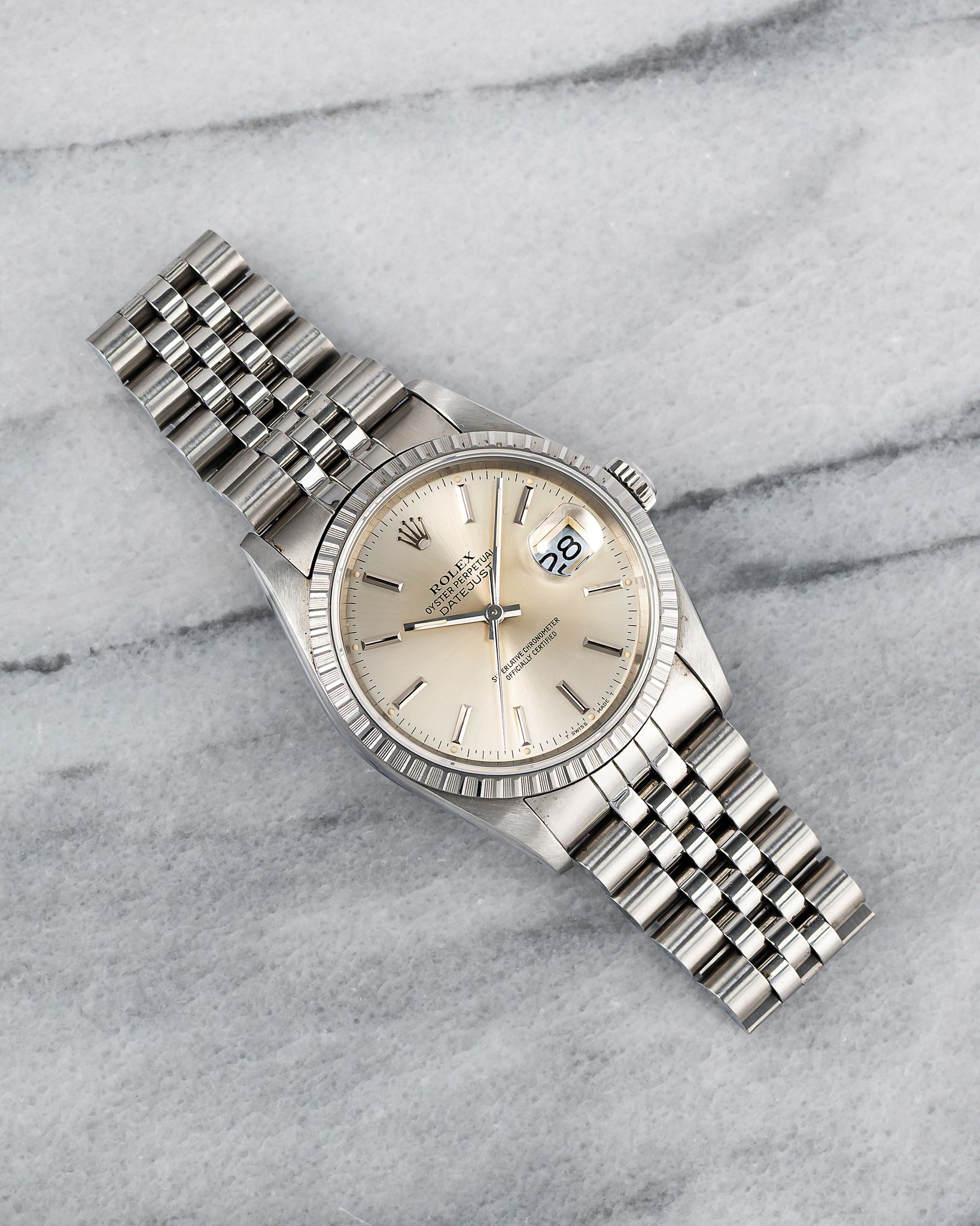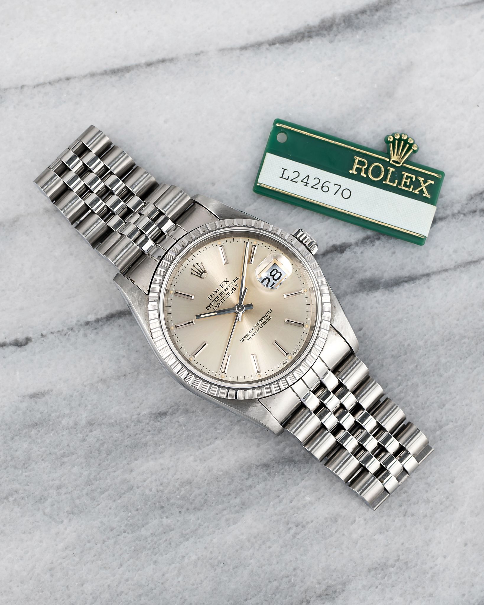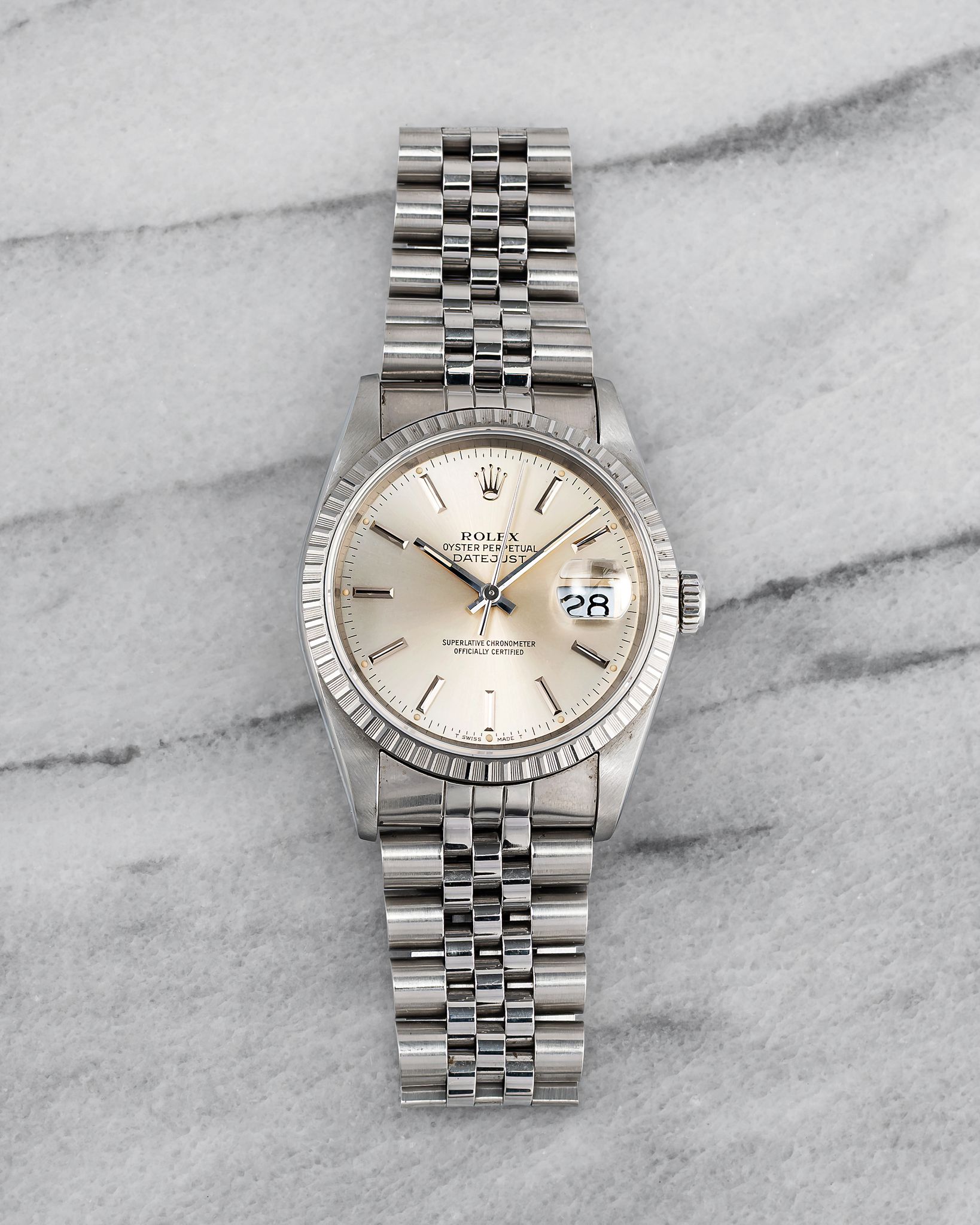 Here's a vintage Rolex Datejust reference 16220 (steel bezel) automatic with a silver dial (slight cream hue) on a jubilee bracelet from 1989 (L serial). Keeps great time and is fully functional. Measurements include a 36mm oyster case and 20mm lug width. It's on a Rolex jubilee bracelet that fits up to a 7 inch wrist (555 endlinks).The bracelet is in great shape. Time and quick date function at 3 a clock. Unpolished case, lugs, and bracelet. The bracelet is really tight for its age. Steel case and caseback. The lume in both the hands and have matching patina. Drilled lug holes (Holes case) Both the dial and crystal are free from any scratches or marks. All parts are original including the signed Rolex crown, dial, movement, and caseback. Both the dial and case are in great cosmetic, untouched condition.
