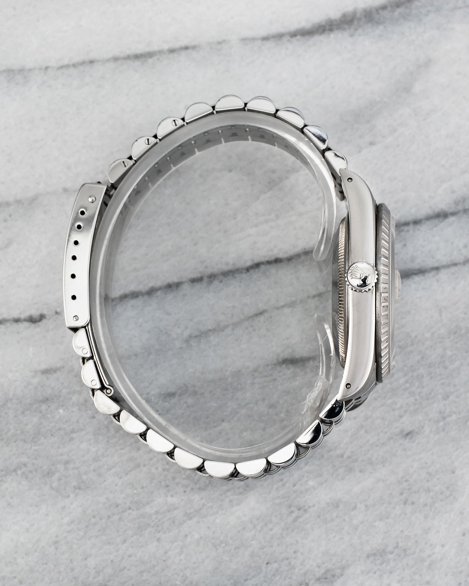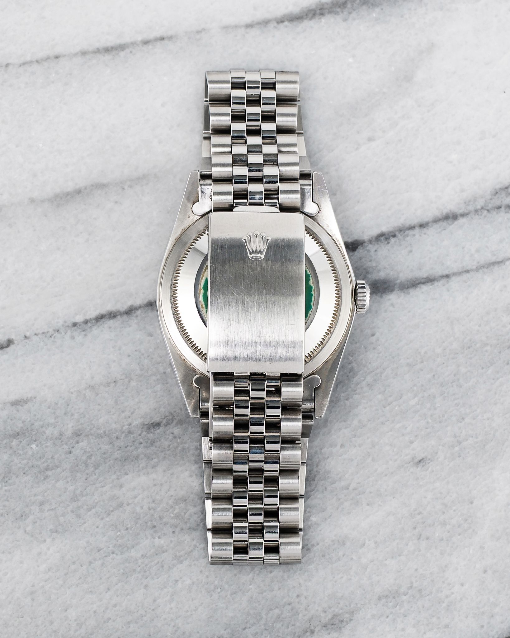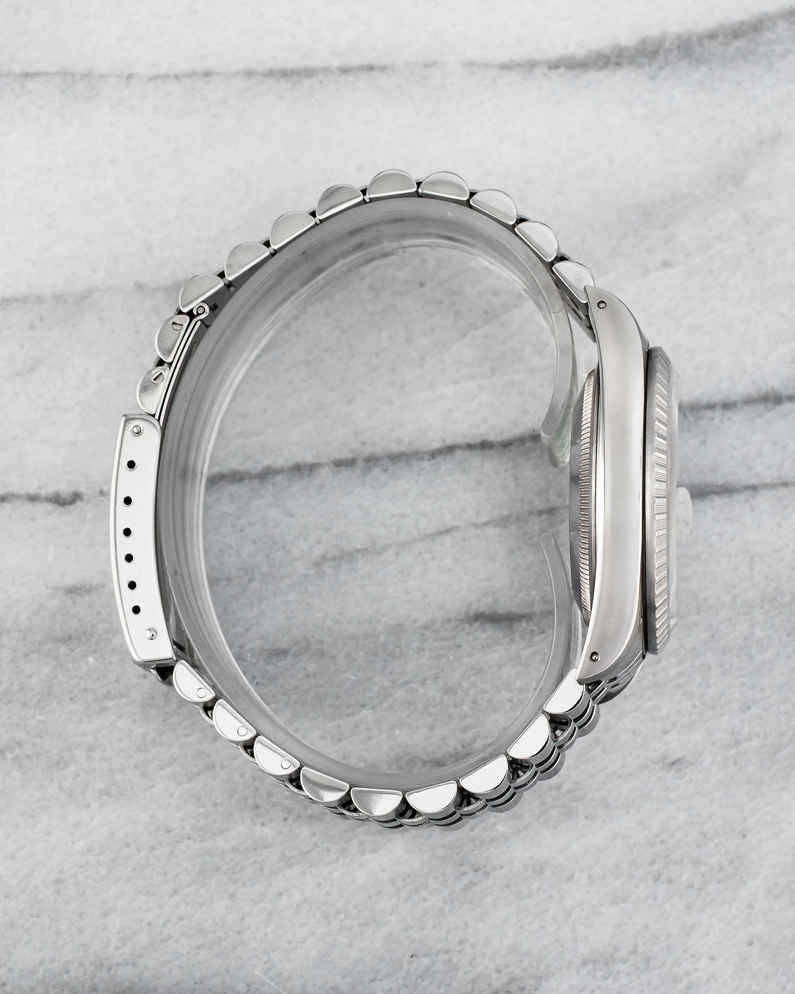 Here's a vintage Rolex Datejust reference 16220 (steel bezel) automatic with a silver dial (slight cream hue) on a jubilee bracelet from 1989 (L serial). Keeps great time and is fully functional. Measurements include a 36mm oyster case and 20mm lug width. It's on a Rolex jubilee bracelet that fits up to a 7 inch wrist (555 endlinks).The bracelet is in great shape. Time and quick date function at 3 a clock. Unpolished case, lugs, and bracelet. The bracelet is really tight for its age. Steel case and caseback. The lume in both the hands and have matching patina. Drilled lug holes (Holes case) Both the dial and crystal are free from any scratches or marks. All parts are original including the signed Rolex crown, dial, movement, and caseback. Both the dial and case are in great cosmetic, untouched condition.