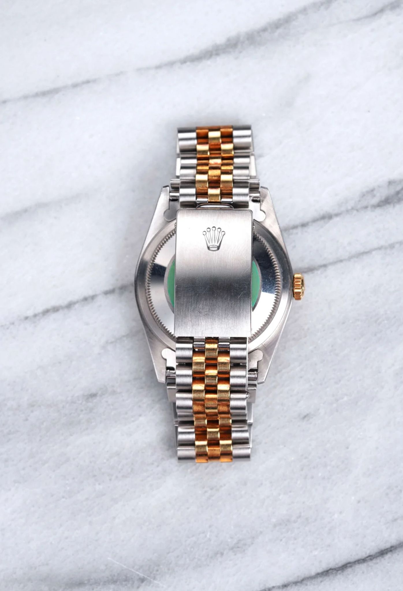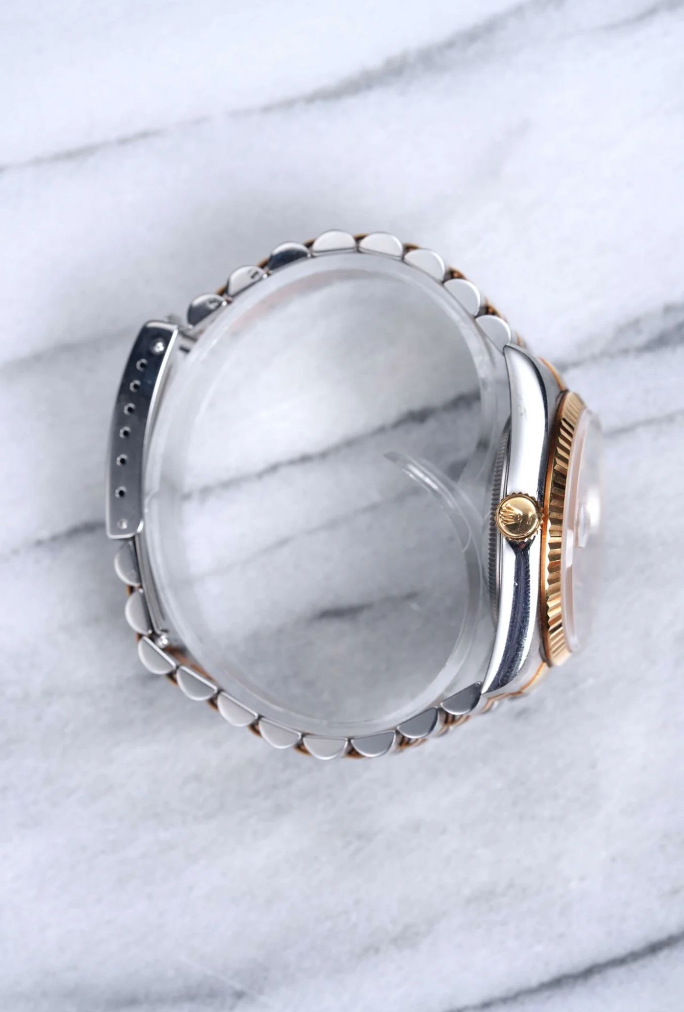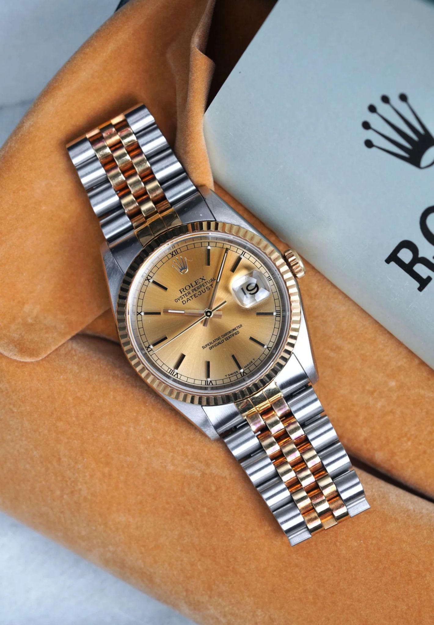 Here's a vintage Rolex Datejust reference 16233 with a champagne dial from the early 90s. Keeps great time and is fully functional. Measurements include a 36mm oyster case and 20mm lug width. It's on a Rolex jubilee bracelet that fits up to a 7.25 inch wrist. Time and quick date function at 3 a clock. Clean champagne dial and 18K yellow gold bezel. Steel case and caseback. Comes with its original green sticker on the caseback, box, and pamphlet. The lume in the lume plots and hands are still a crisp white. Matching gold hands and roman numerals. No Holes case (drilled lug holes). The bezel and center links still maintained its rich yellow color. The dial developed a darker color due to age. Both the dial and crystal are free from any scratches or marks. All parts are original including the signed Rolex crown, dial, movement, and caseback. Both the dial and case are in great cosmetic, untouched condition.