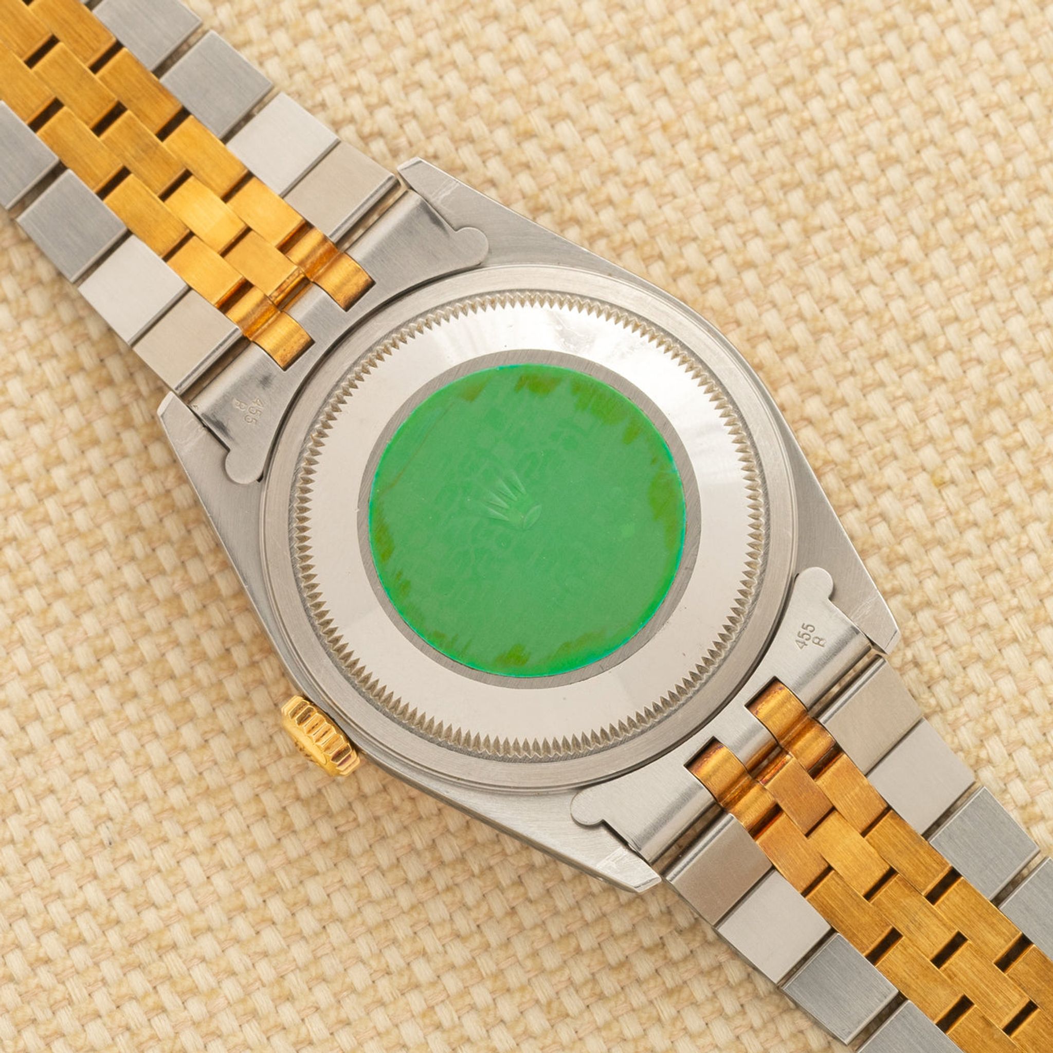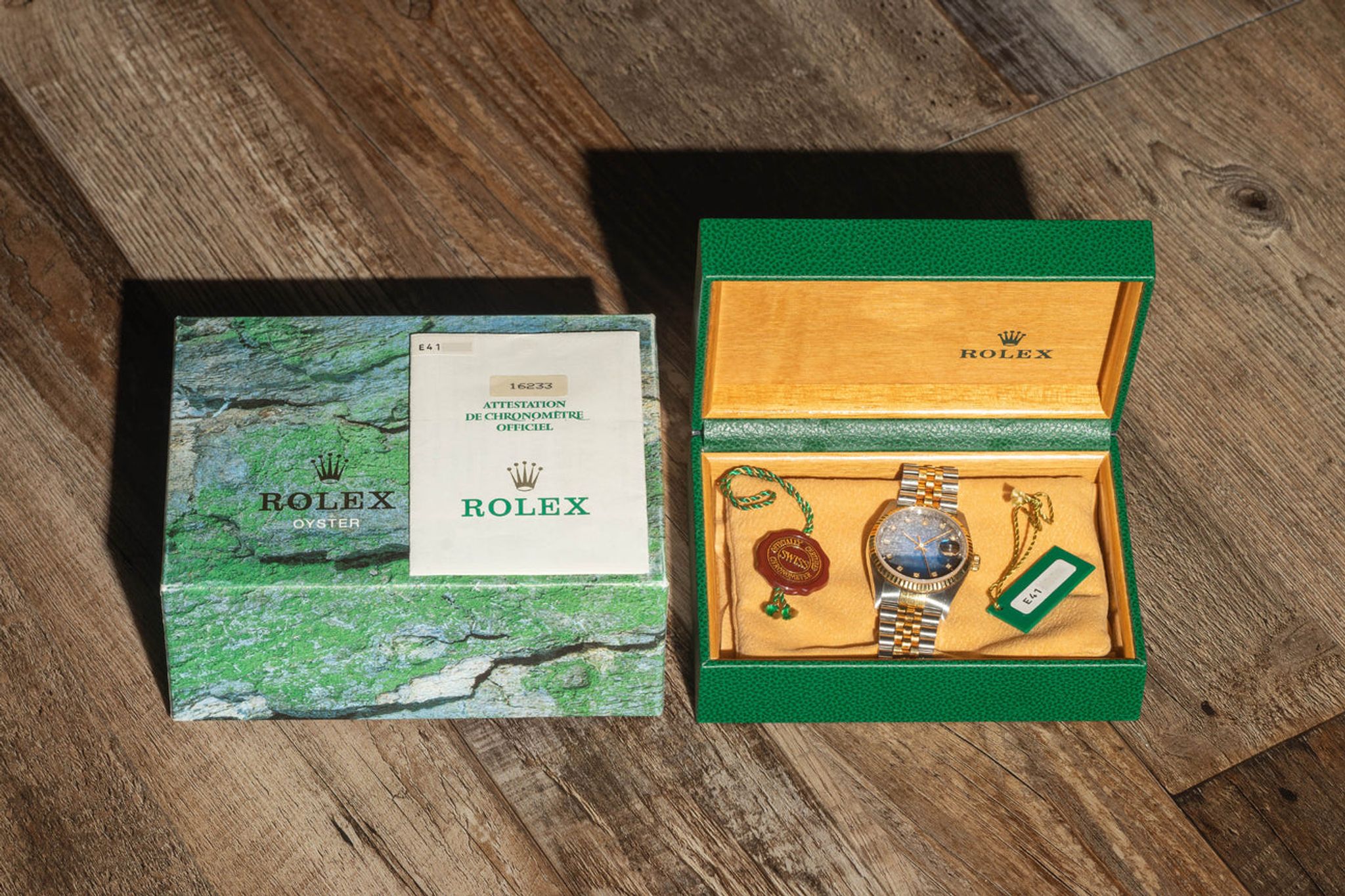 This particular E serial example, circa 1990 falls in the 5 digit reference era which benefits from the addition of a quickset date function. It boasts a blue and black vignette diamond dial which is uncommon to see. This piece was clearly stashed away for decades and remains in "safe queen" condition. The dial/hands are mint and stunning with perfectly aged tritium lume. The case is extremely sharp and unpolished, as is the bracelet which has no stretch from where it stood out of factory. If you've been looking for a Datejust that's a cut above, this is a truly special set for the discerning collector.