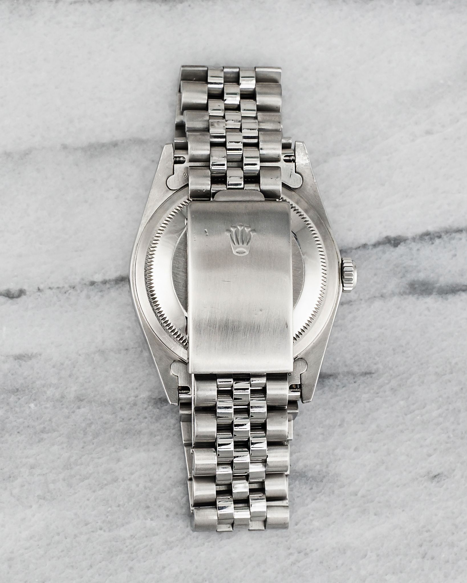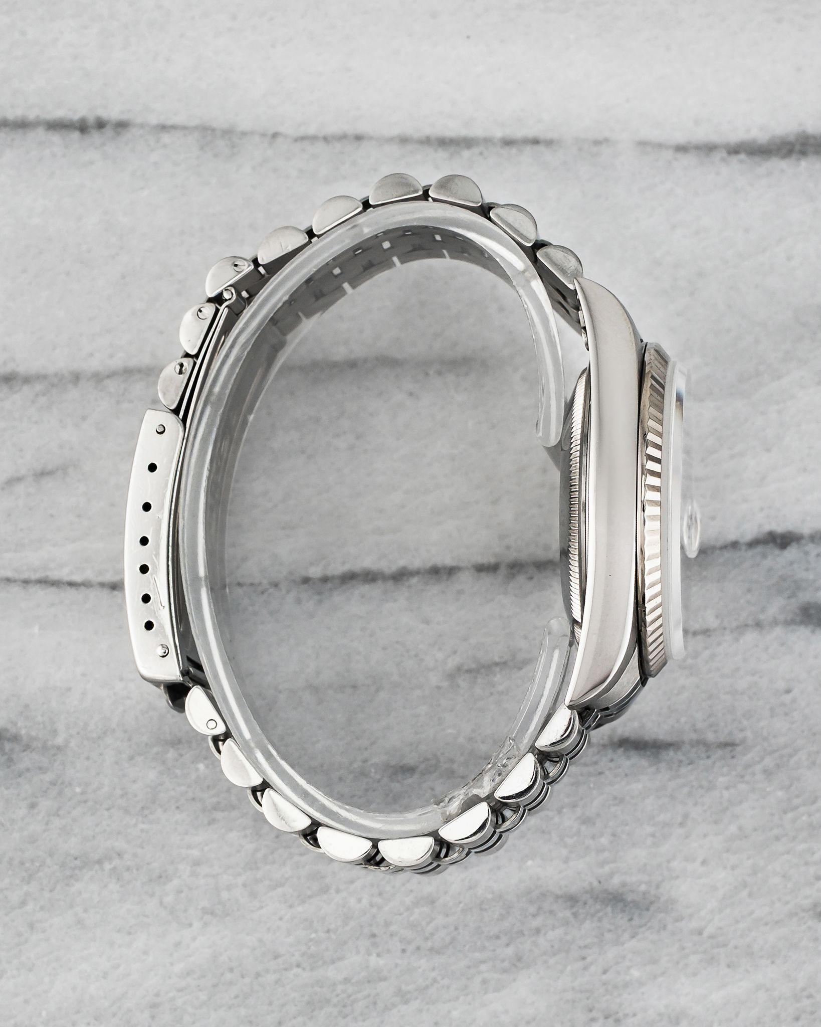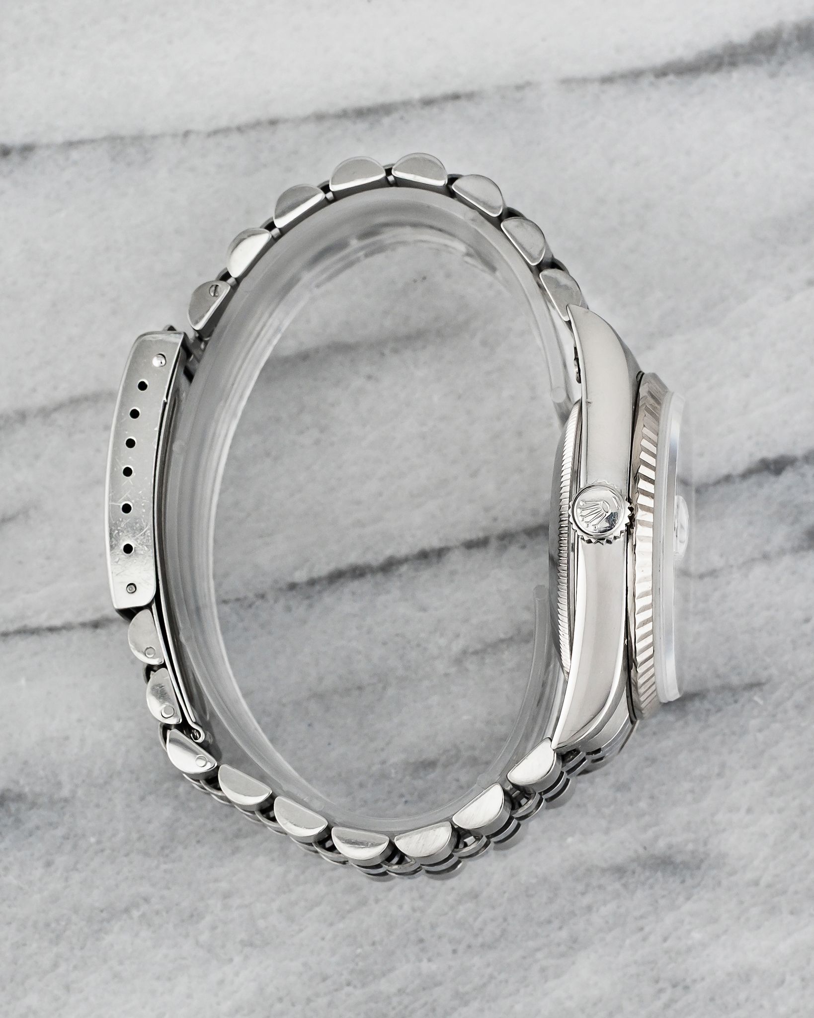 Here’s a vintage Rolex Datejust reference 16234 with a beautiful beige mother of pearl arabic numeral dial from the 1990s. Fluted white gold bezel. Keeps great time and is fully functional. Measurements of the case are 36mm and 20mm lug width. It's on its original Rolex heavy jubilee link bracelet with the matching fold clasp. matching no lume hands and arabic numerals. The bracelet length is up to a 7 inch wrist. Stainless steel case back. Both the dial and crystal are free from any scratches. The dial does vary in color due to the light. Unusual to find stone dials like these! All parts are original including the dial, crown, movement, and caseback. Both the dial and case are in great cosmetic, untouched condition.