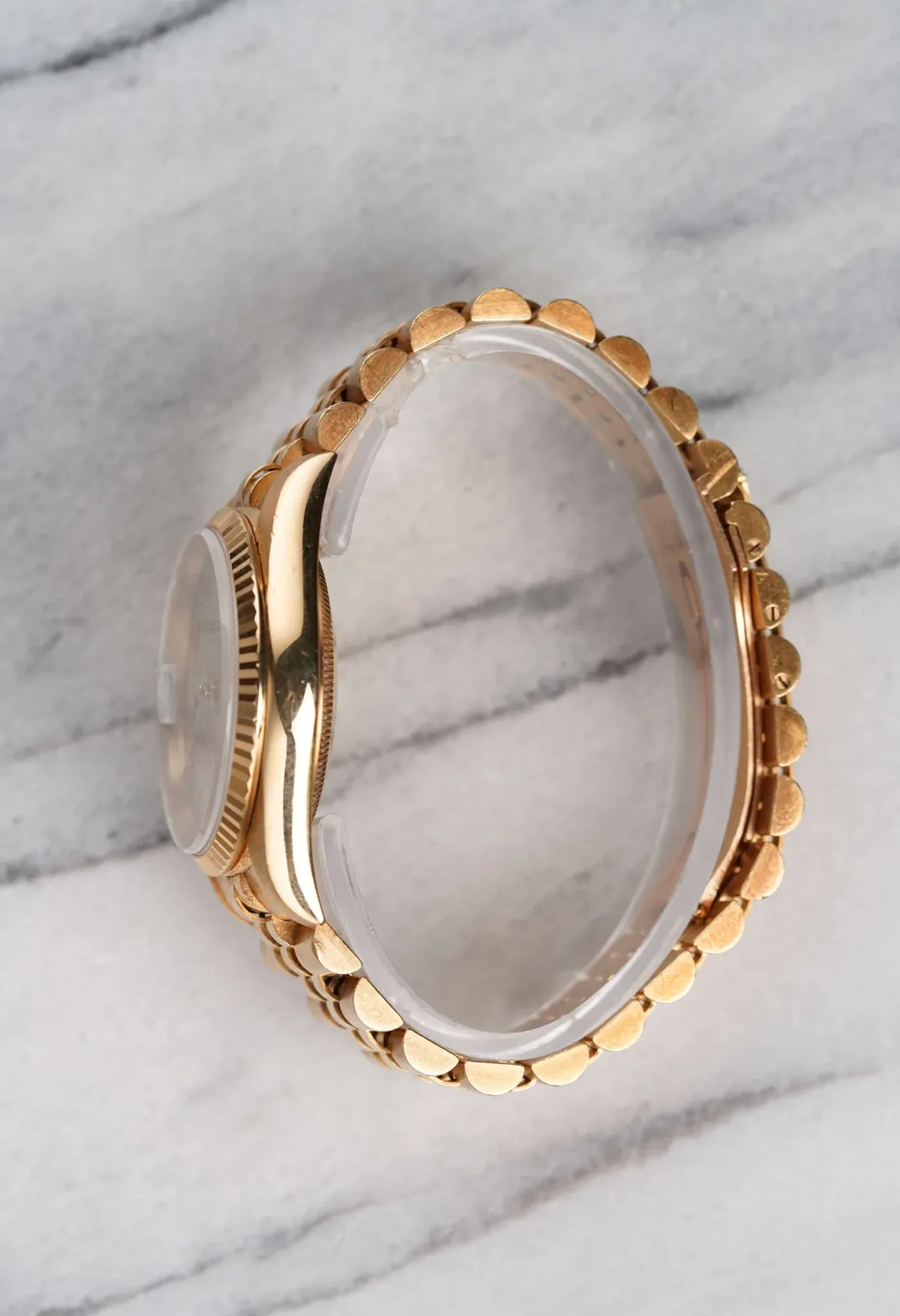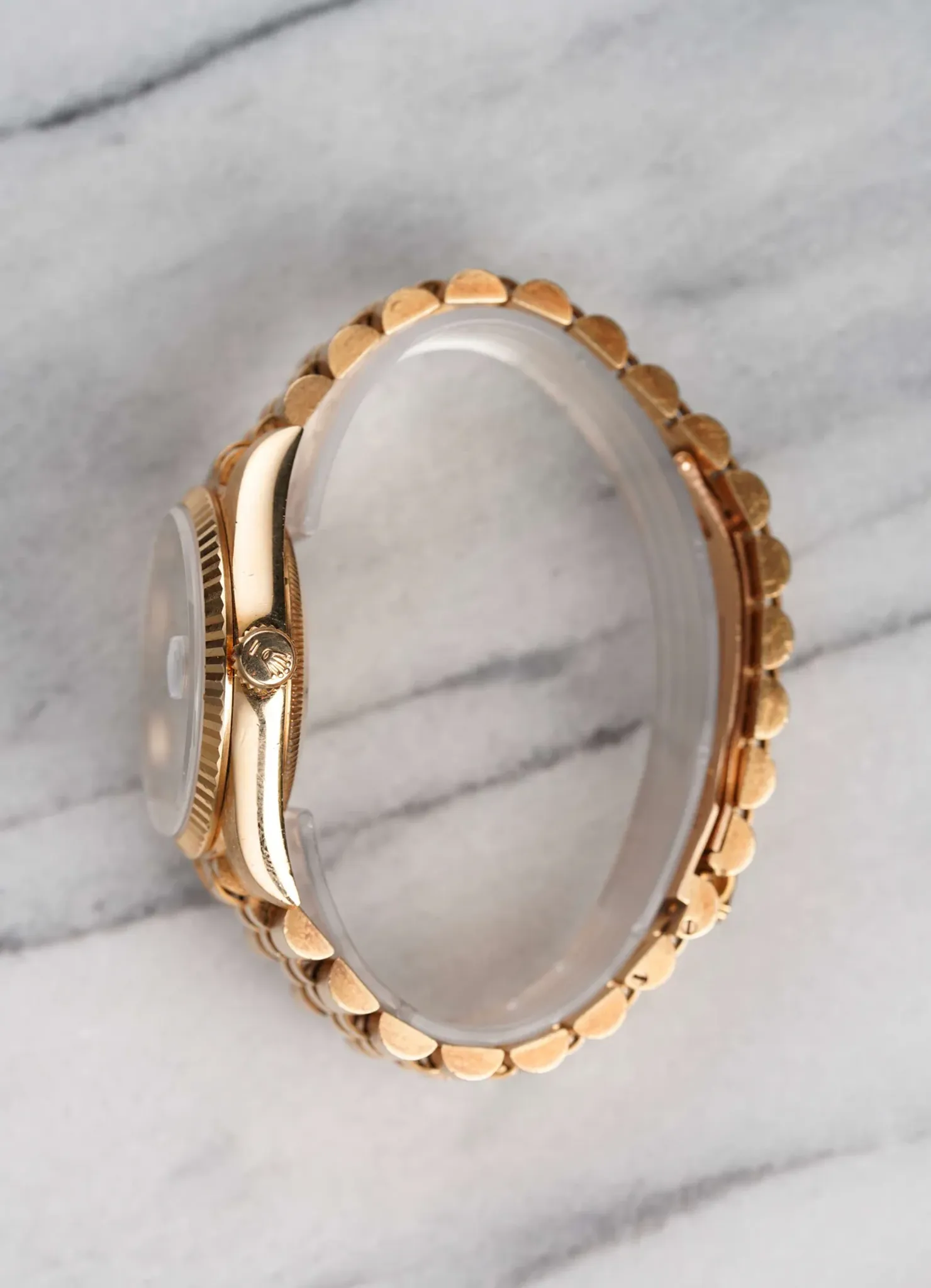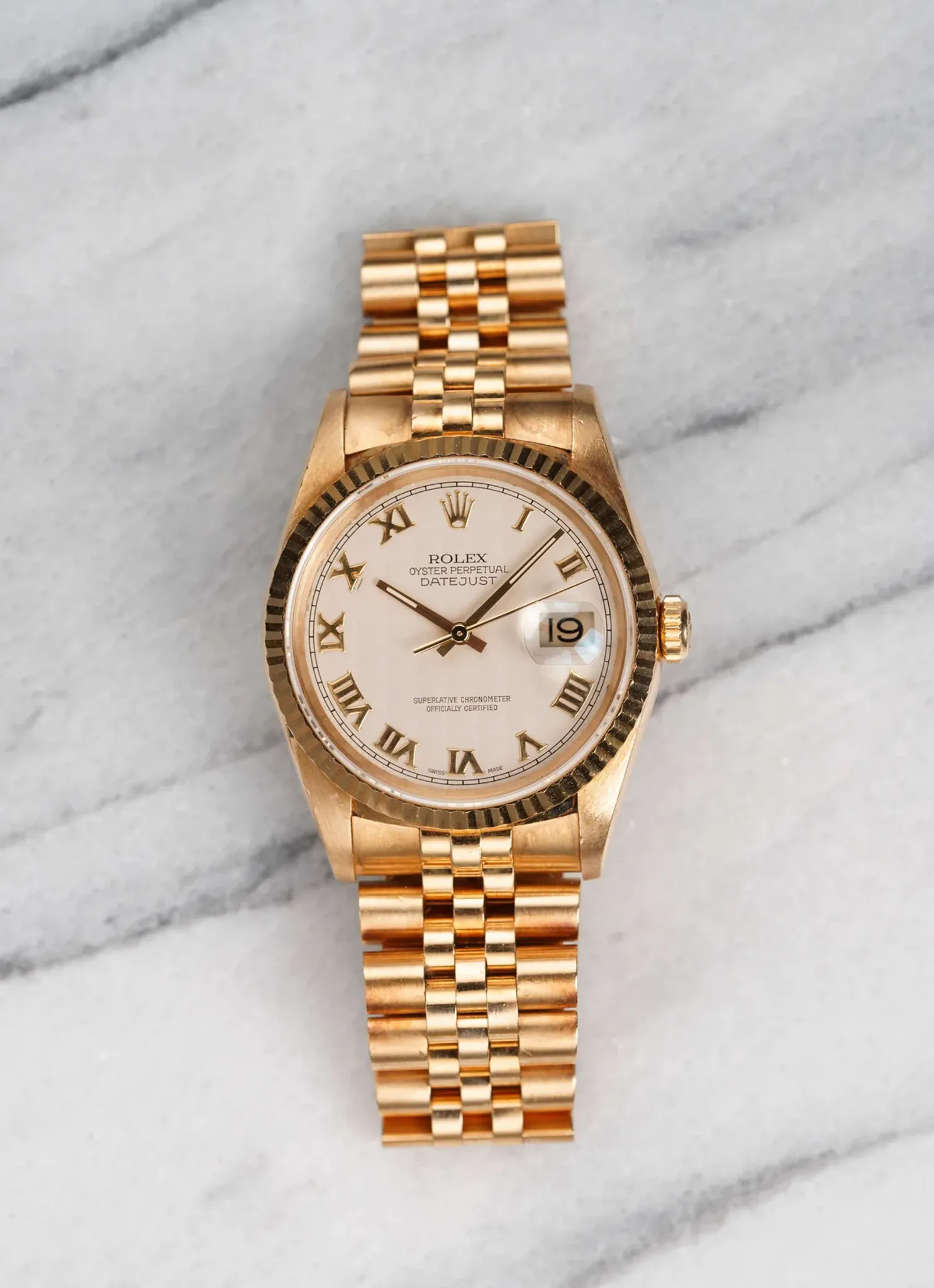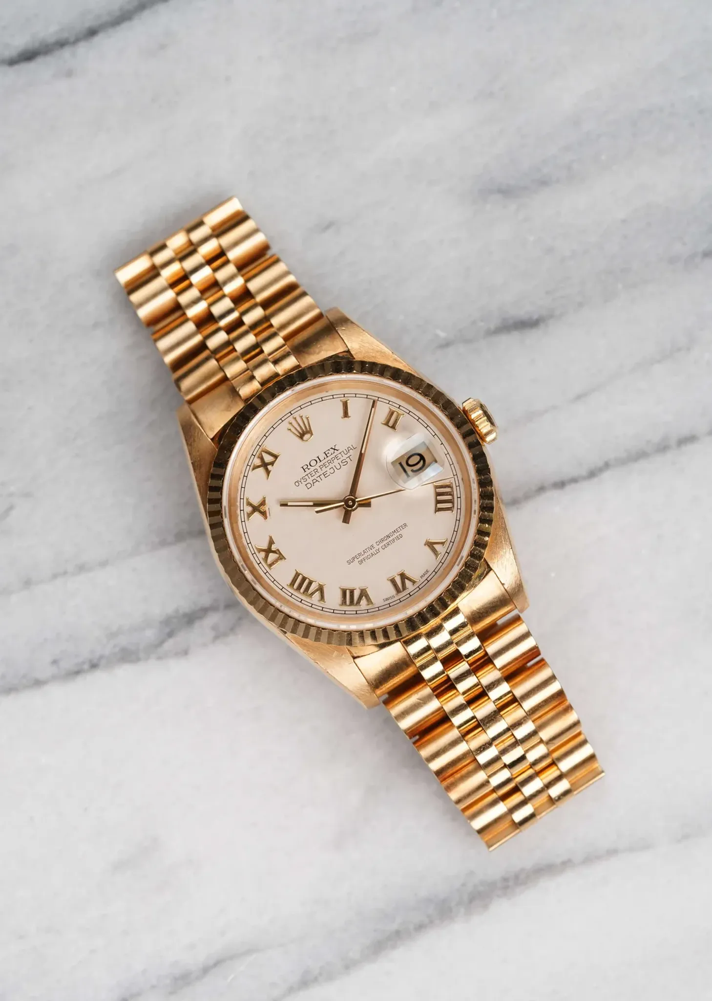 Here's a vintage Datejust reference 16238 with an original cream Roman numeral pyramid dial from 1993/4 (S serial). Keeps great time and is fully functional. Measurements include a 36mm oyster case and 20mm lug width. It's on its original 18k yellow gold Jubilee bracelet with the iconic hidden clasp that fits up to a 7 inch wrist. It features a quickset date function at 3 O' clock. Swiss Made dial. The case, lugs, and bracelet are in great overall shape. Both the dial and crystal are free from any scratches or marks. Quite a unique dial for an already odd reference! 18K yellow gold case and case back. All parts are original including the signed Rolex crown, case back, dial, and movement. The dial and case are in great cosmetic, untouched condition.