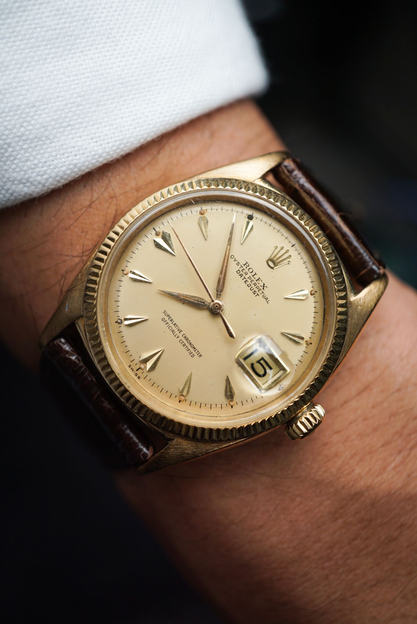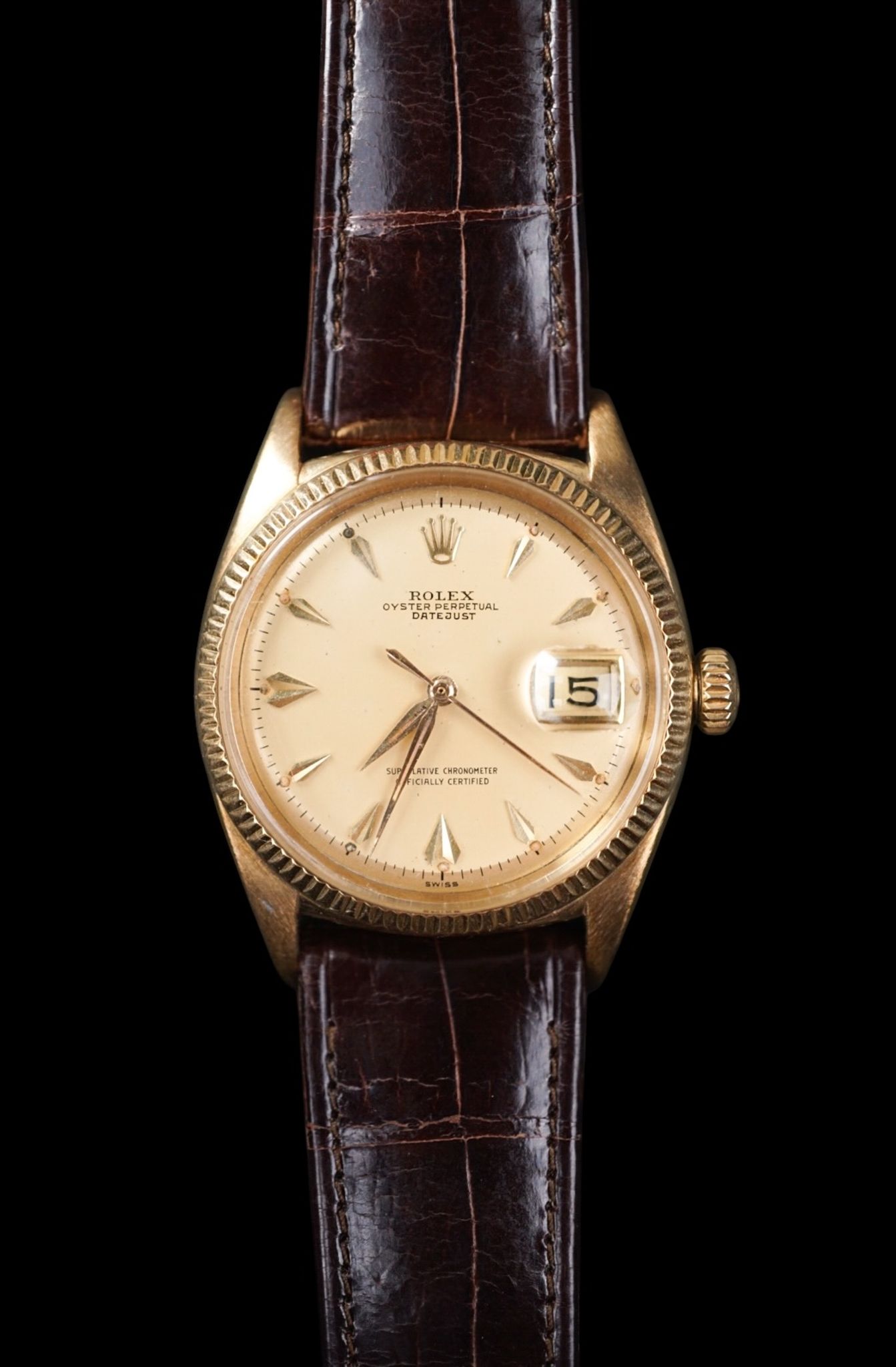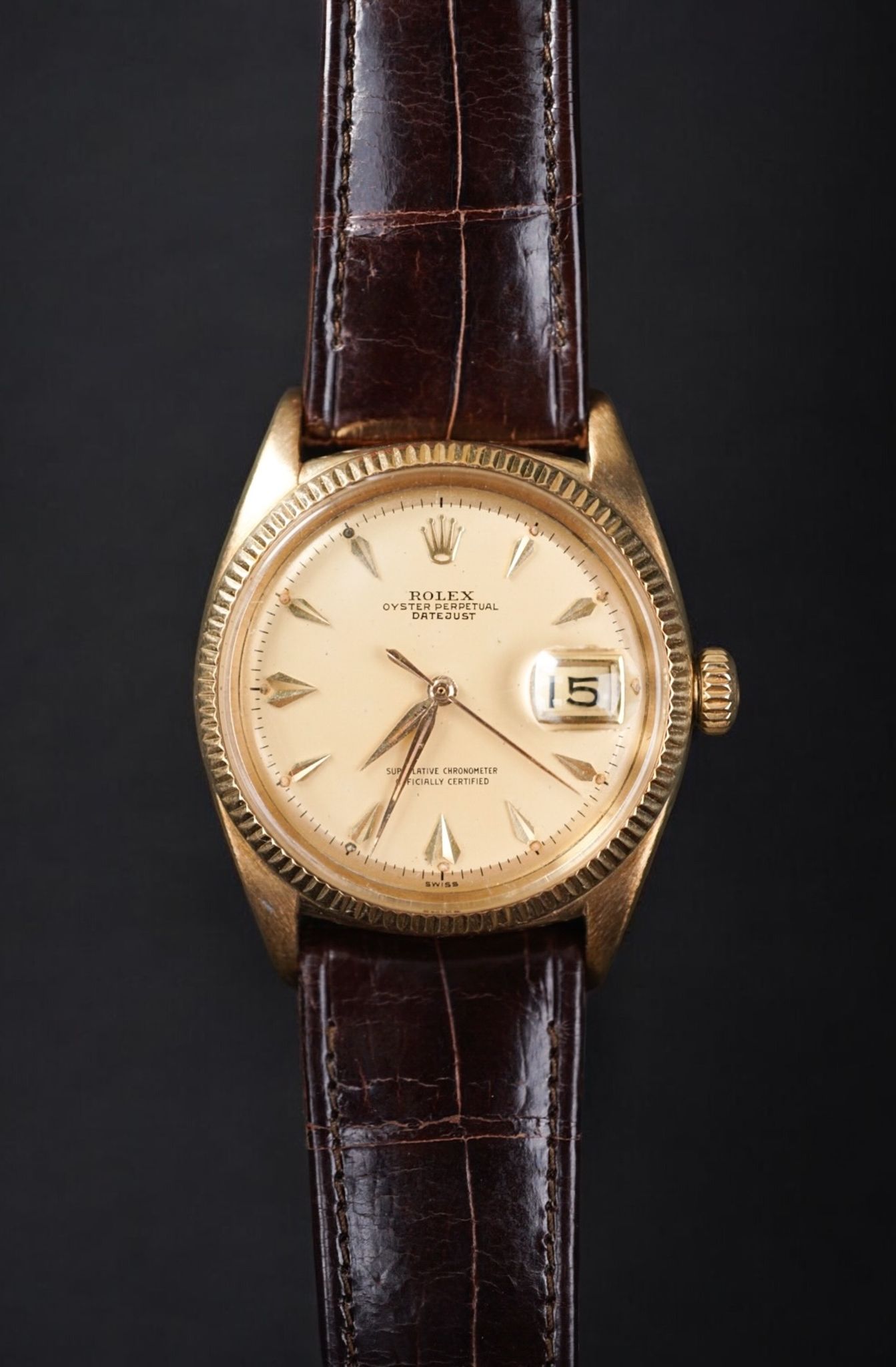 Super nice early Datejust in spectacular condition. Crafted from 9-carat yellow gold, it wears beautifully. The arrowhead hour markers, paired with a fluted bezel, make this a truly special piece. Powered by the Rolex Cal. 1065, an early automatic movement featuring a beautifully shaped rotor. Now available!