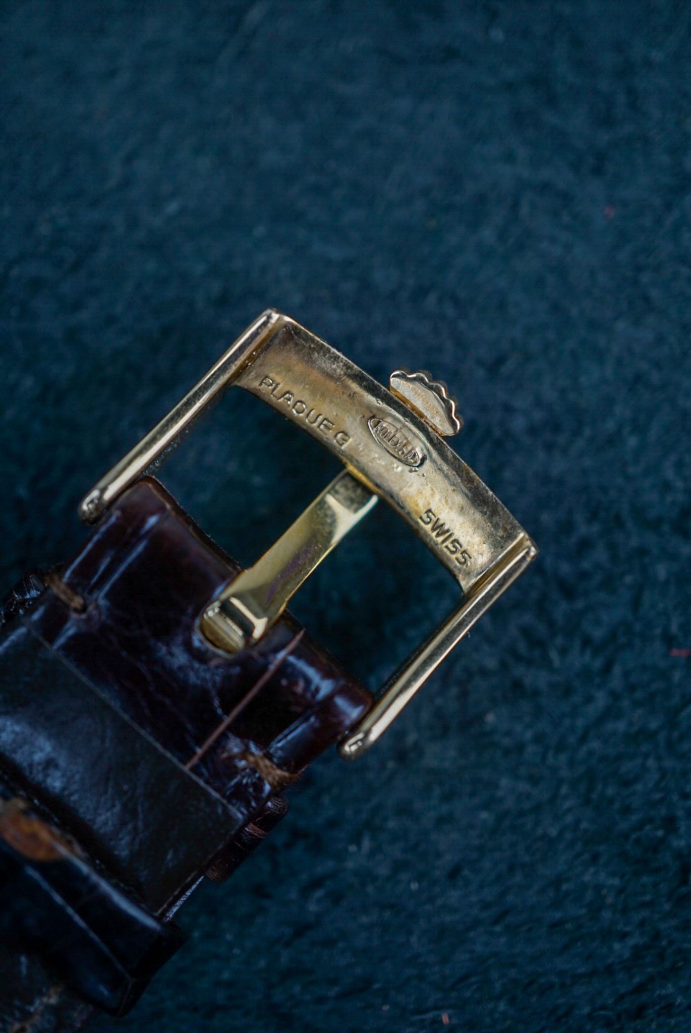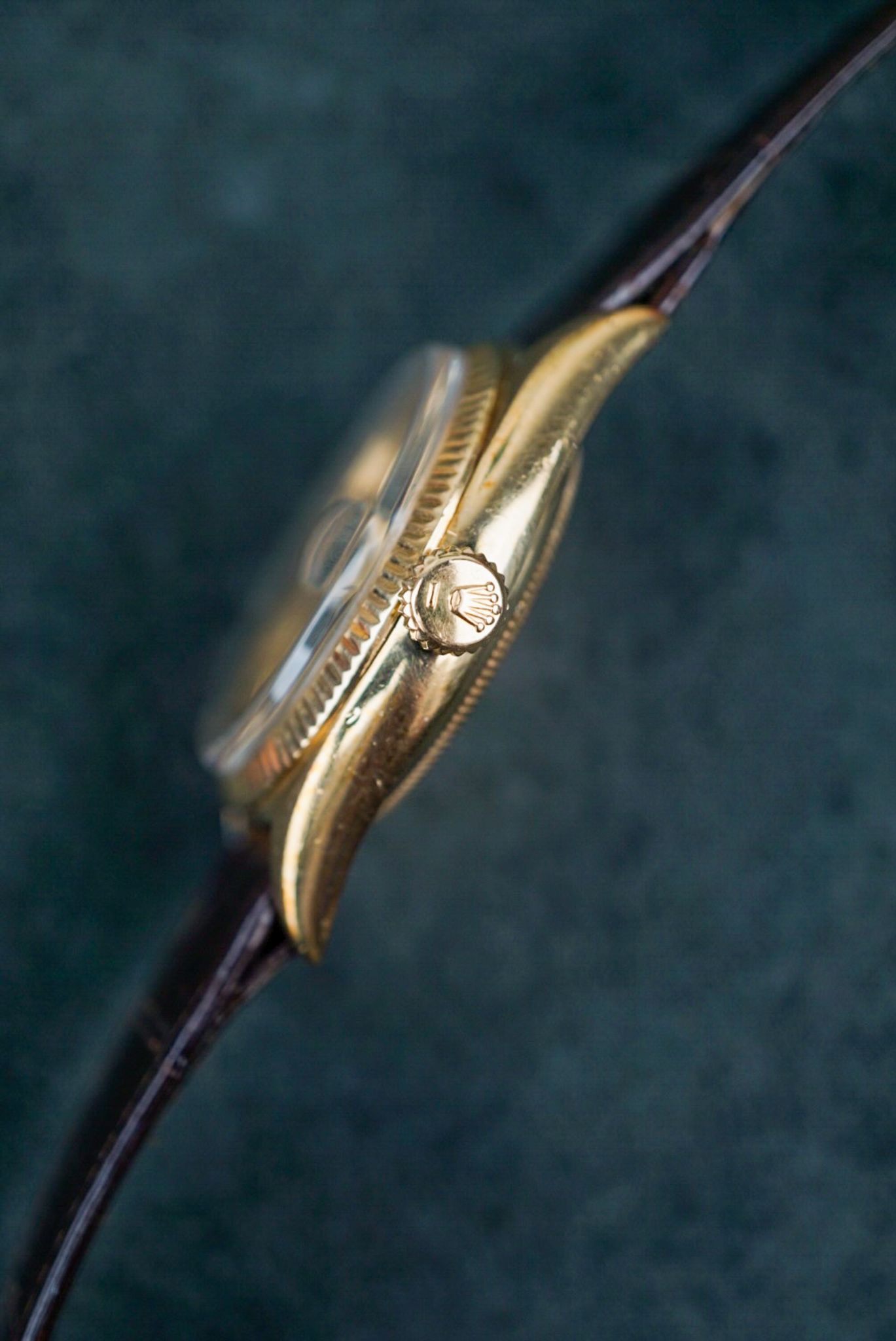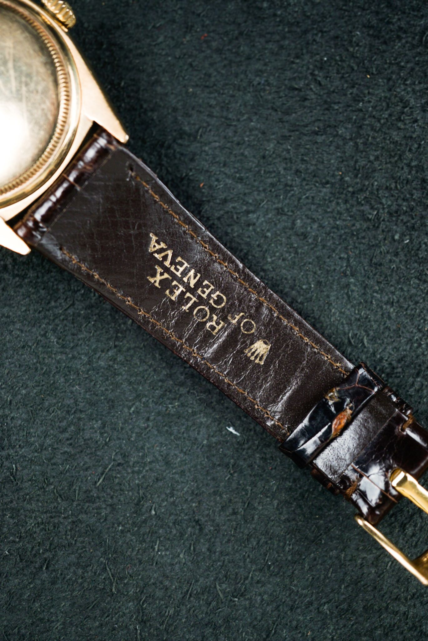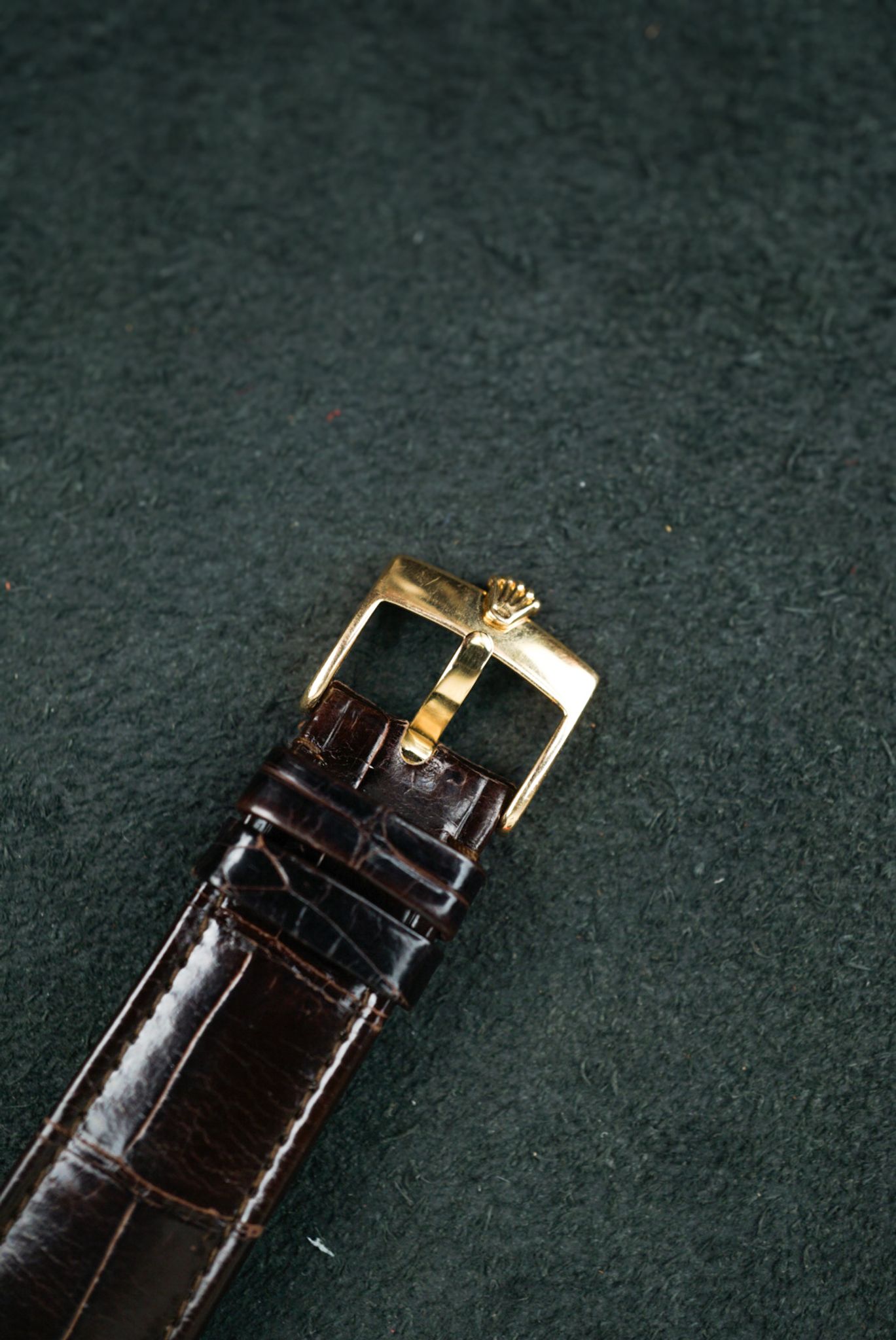 The solid gold case is in excellent condition, showing light signs of previous polishing while retaining its thick lugs and well-defined bevels. It is fitted with a Rolex crocodile strap and a Rolex gold-plated buckle.