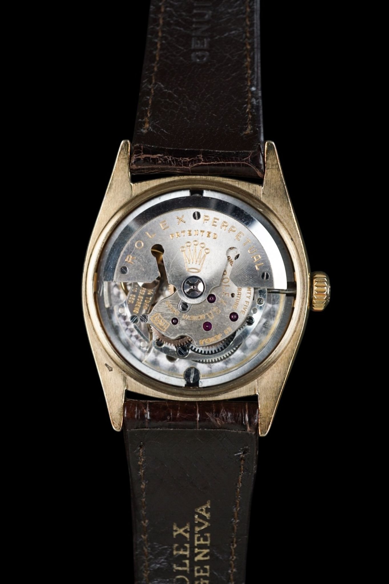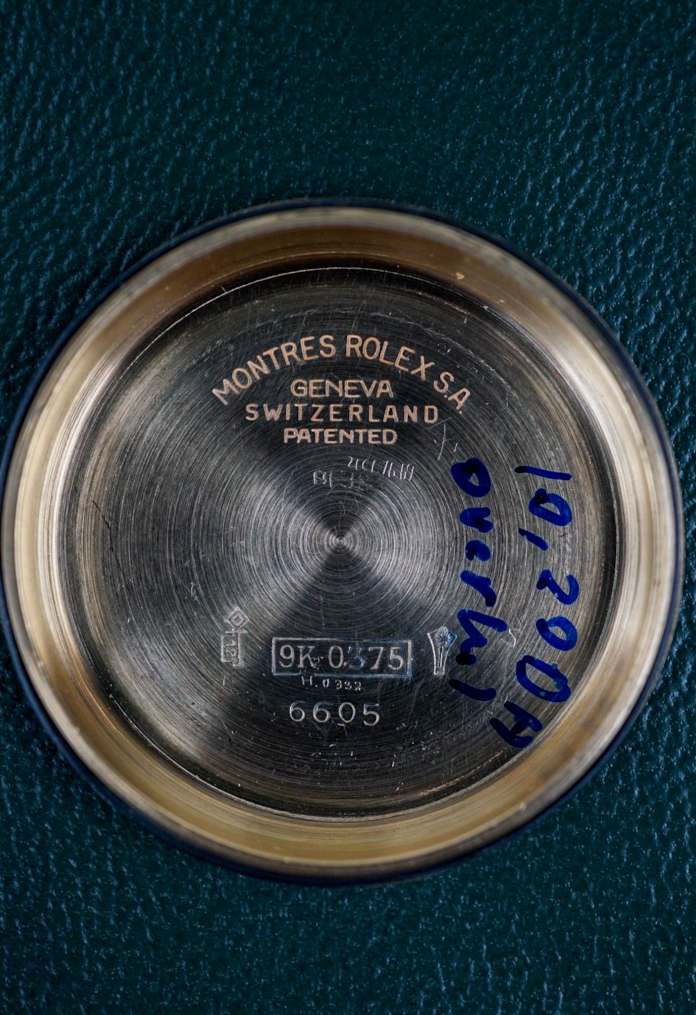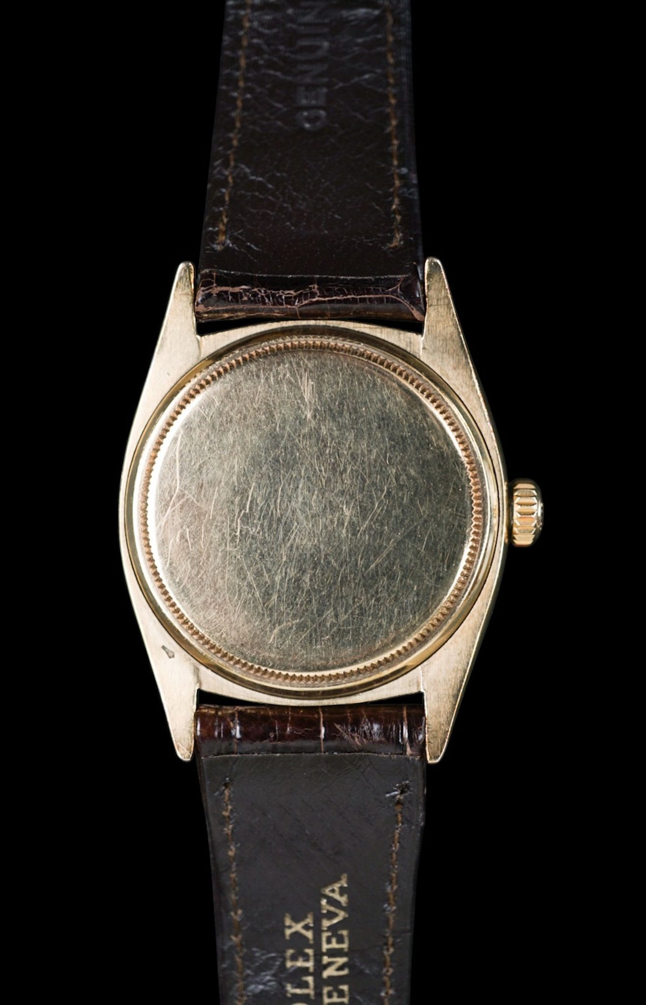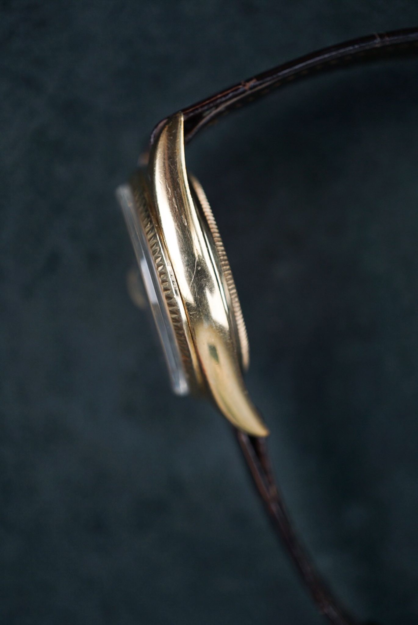 The solid gold case is in excellent condition, showing light signs of previous polishing while retaining its thick lugs and well-defined bevels. It is fitted with a Rolex crocodile strap and a Rolex gold-plated buckle.