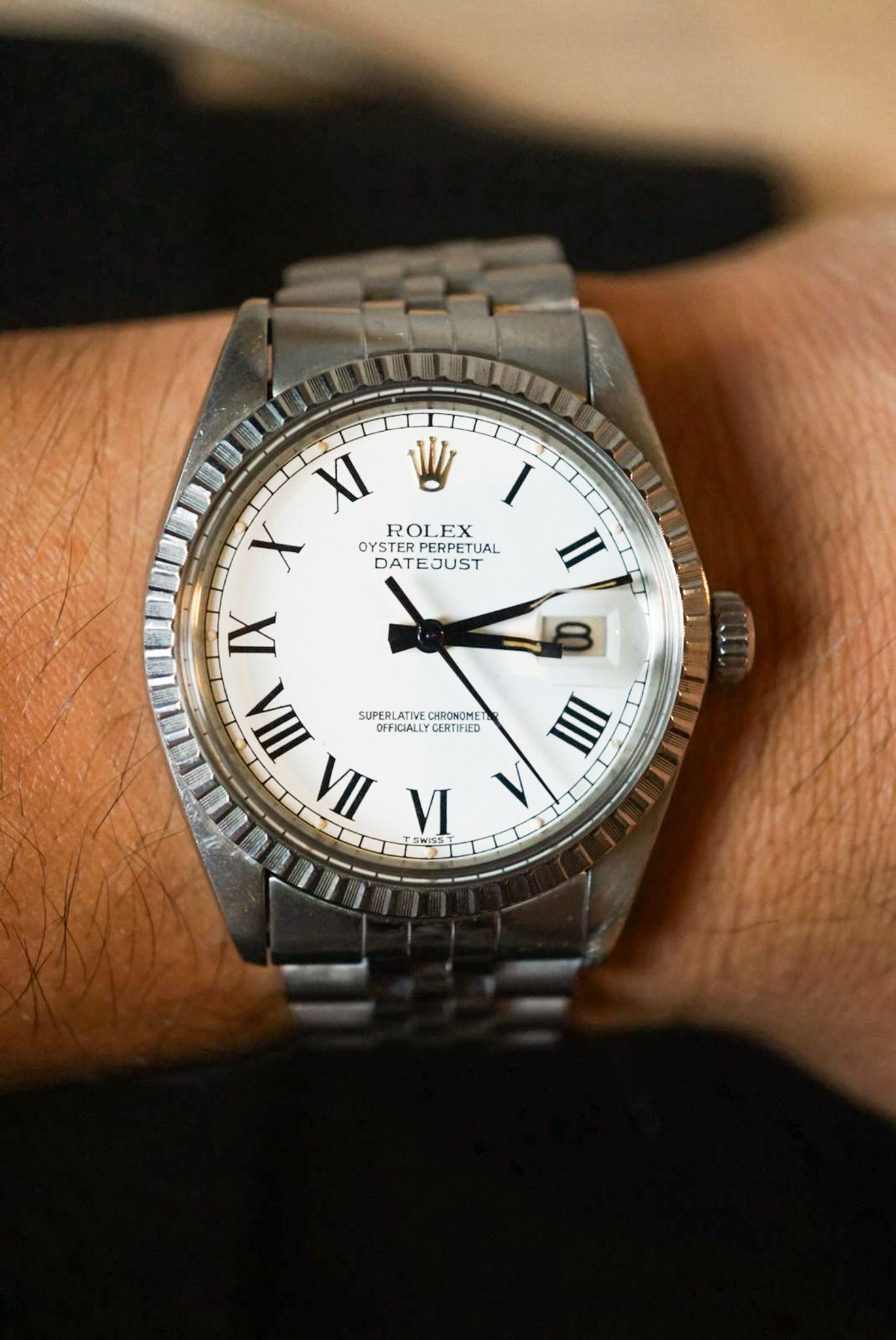 Rolex Datejust ref. 16030 from 1980, featuring the iconic Buckley dial. The painted Roman numerals over the crisp white surface give this piece a distinctive character. The dial remains near-perfect, paired with sharp case lines and a Jubilee bracelet — a fantastic example of a personal favorite.