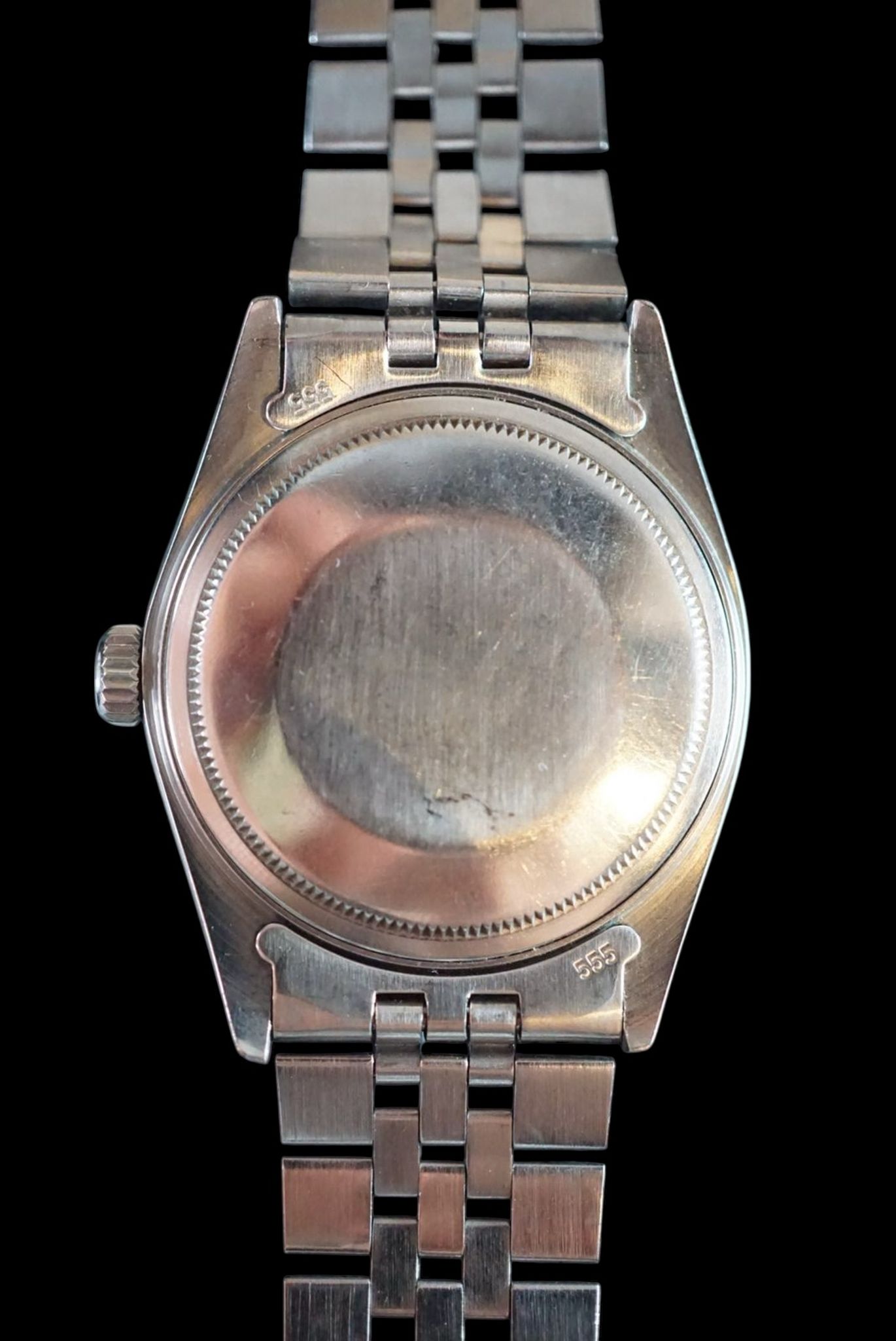The stainless steel case shows light evidence of previous polishing but retains thick lugs and visible chamfers. The bracelet has a matching 1980 clasp code and displays normal stretch for its age.