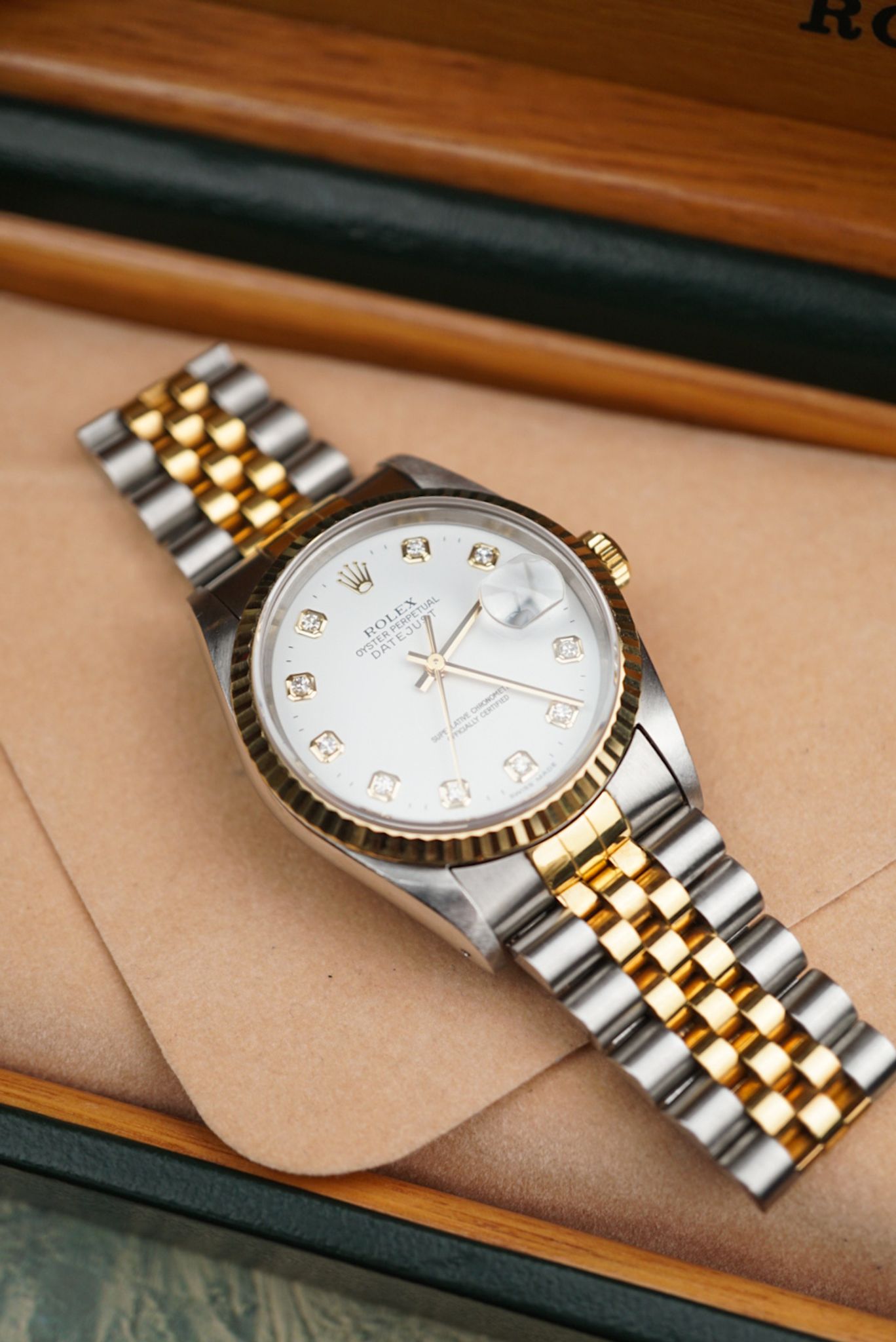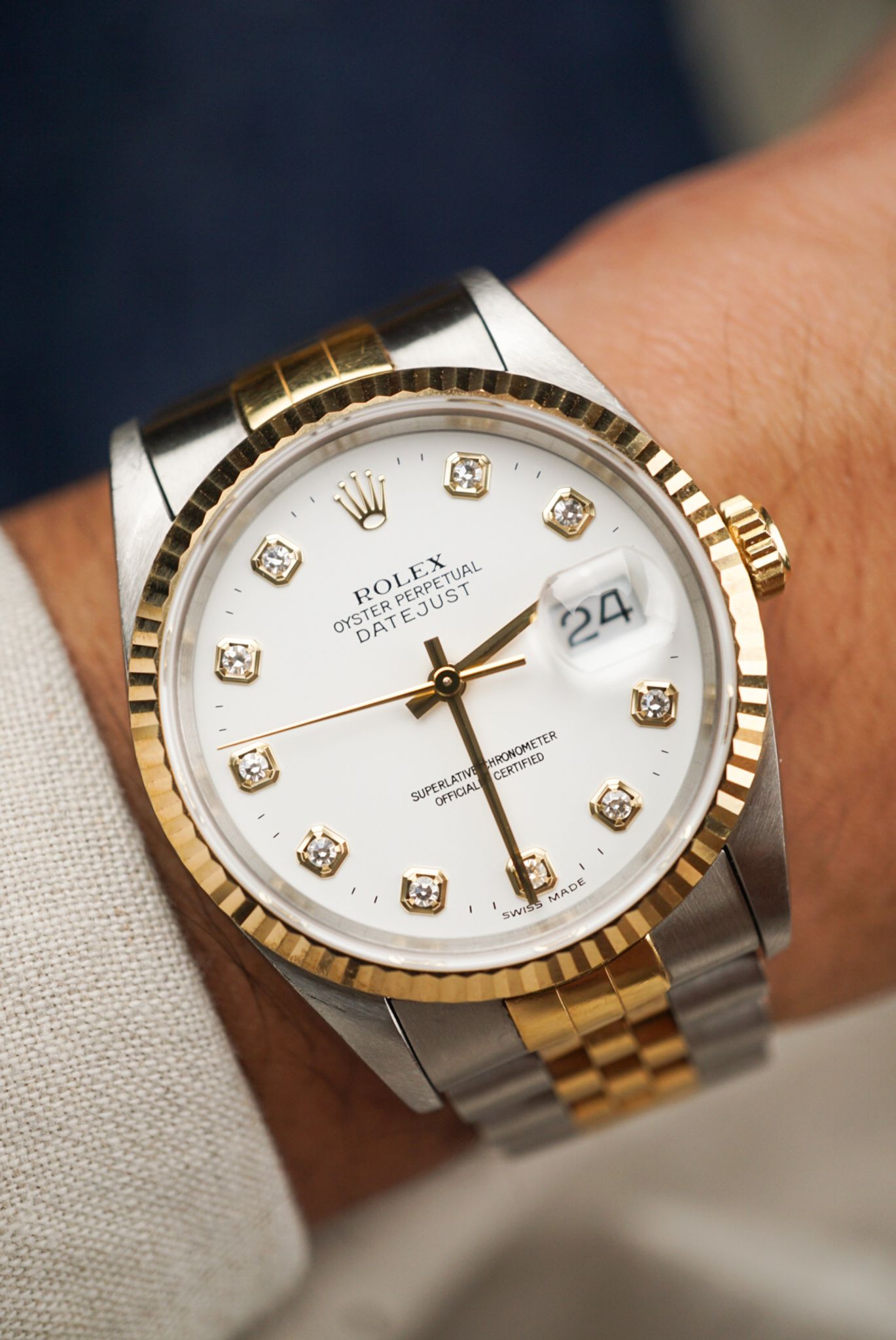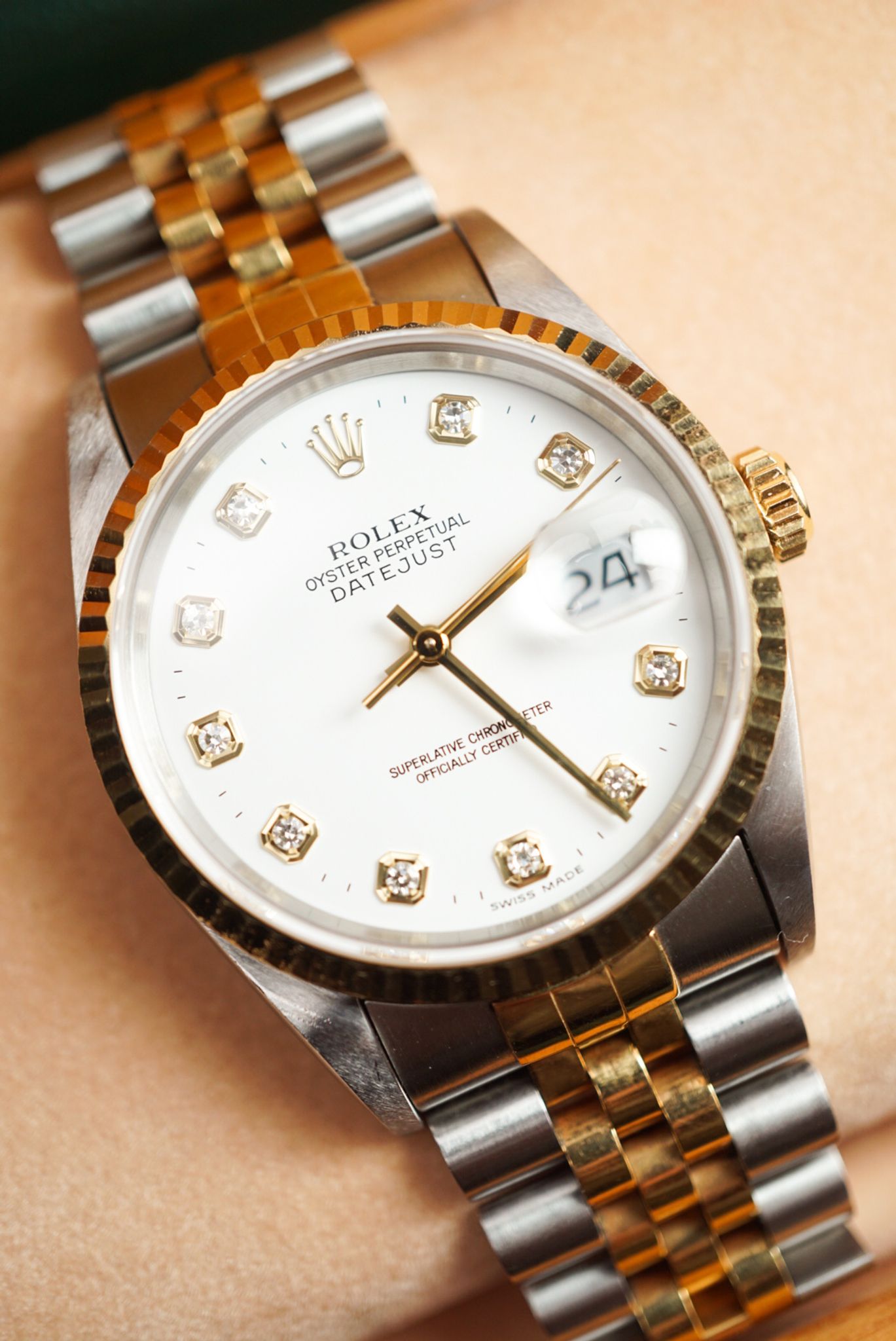 This piece is in outstanding condition, featuring a stunning white diamond dial and a warm rose gold tone on the bezel and bracelet. Now available!