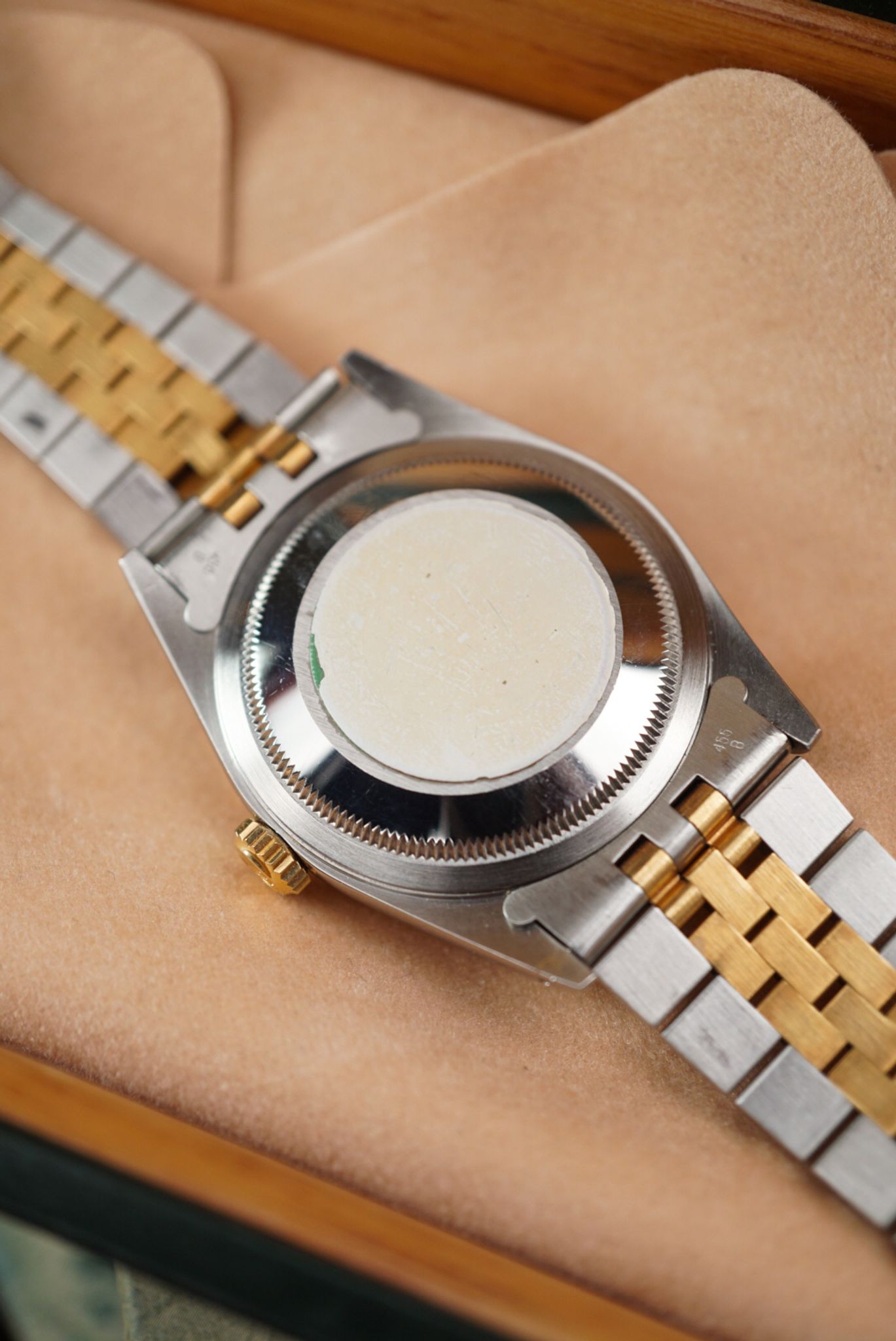 The two-tone case is in excellent condition, with thick, even lugs. Normal wear is visible on the clasp, the solid gold center links remain in perfect shape, showing a beautiful, rich tone. The bracelet fits up to an 8-inch wrist and exhibits no stretch.