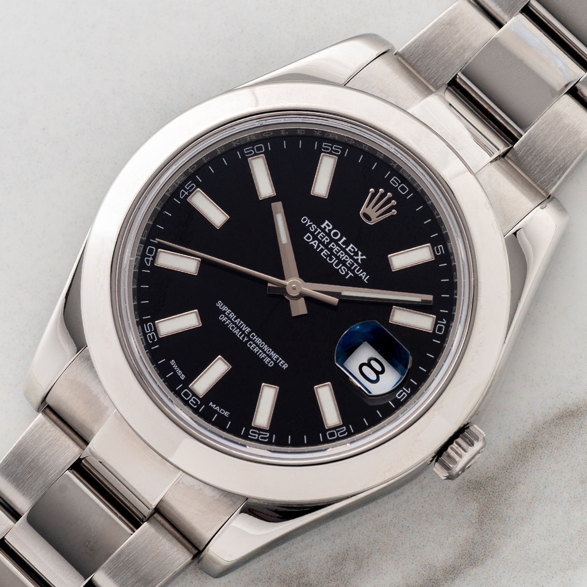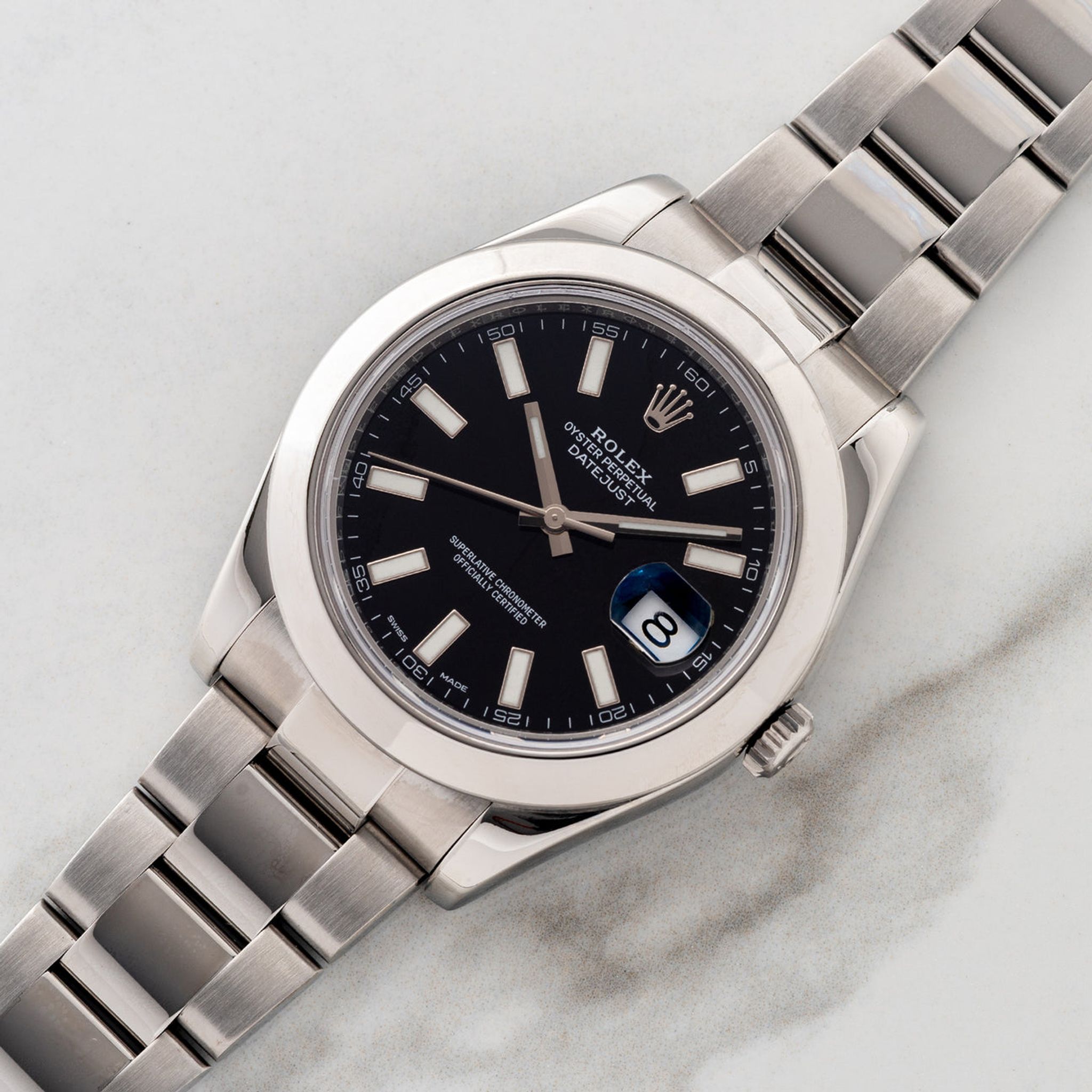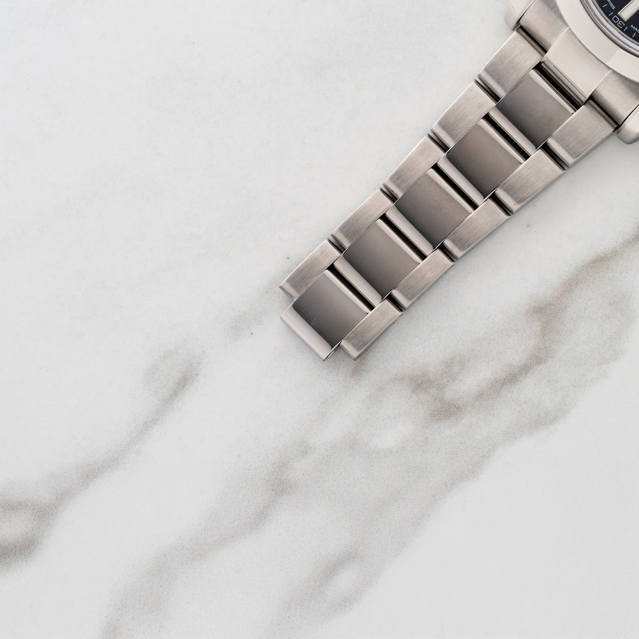 At 41mm, the Datejust II is a great option for anyone with a medium to larger wrist who wants the classic model with boosted proportions. This example on offer houses a black dial which makes it feel stealthy compared to other options that pop like white or silver. It comes as a very nice full set that includes both boxes, its warranty card, booklets and both serialized and wax tags. We just had this piece lightly polished so it looks clean and ready to enjoy for the years to come.