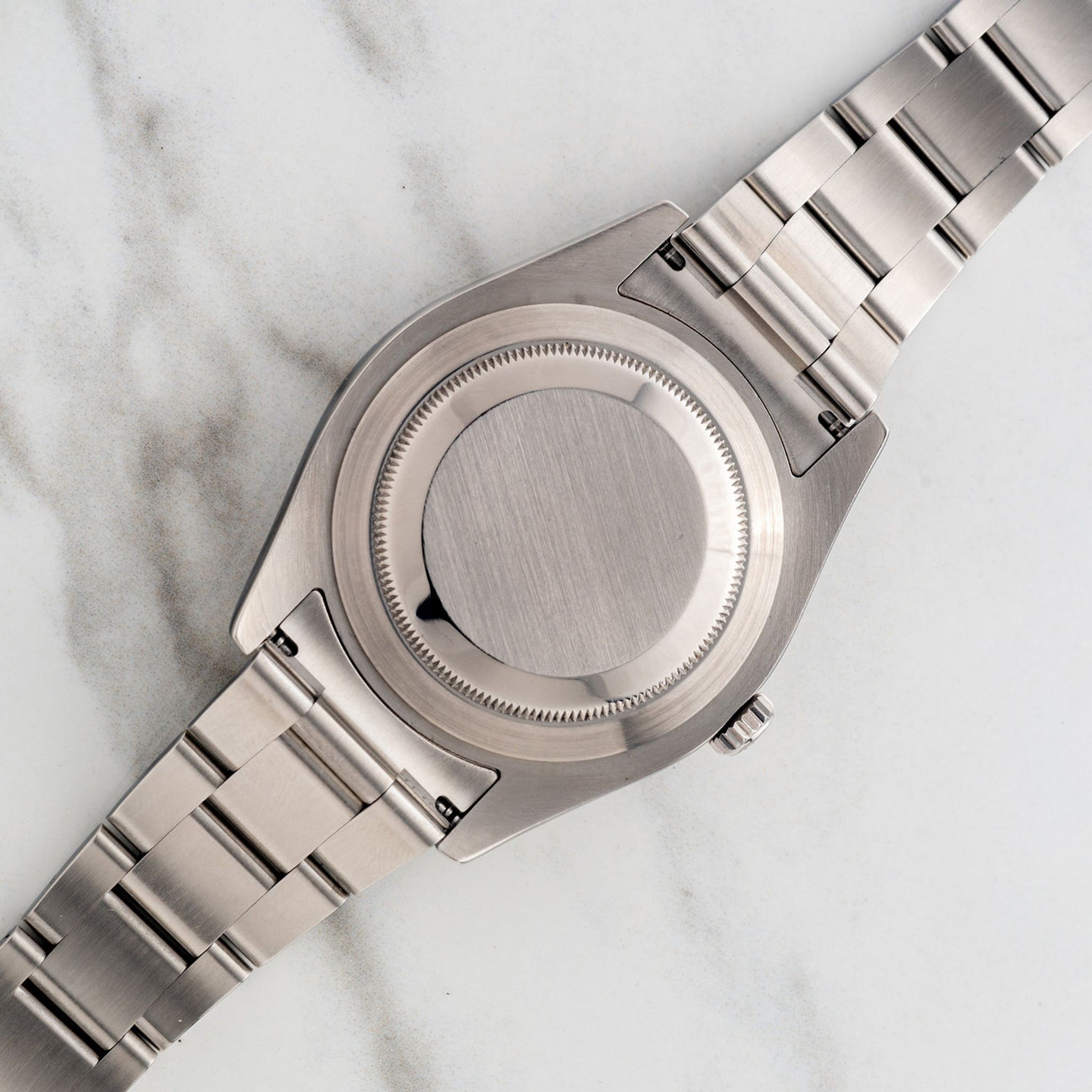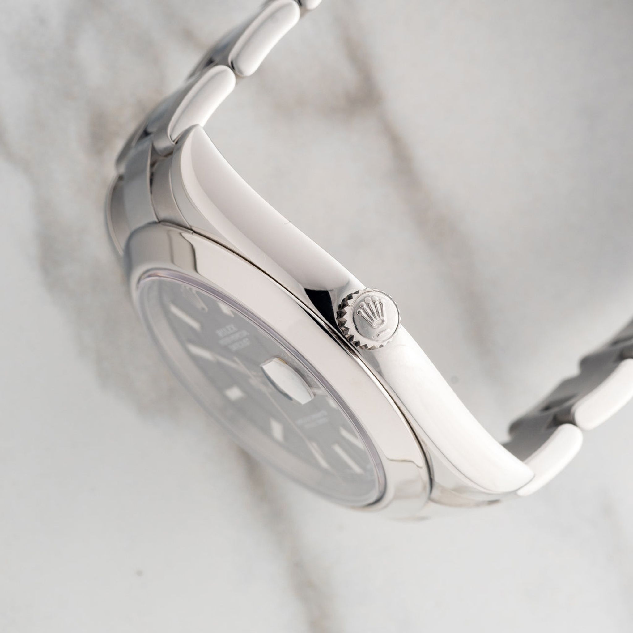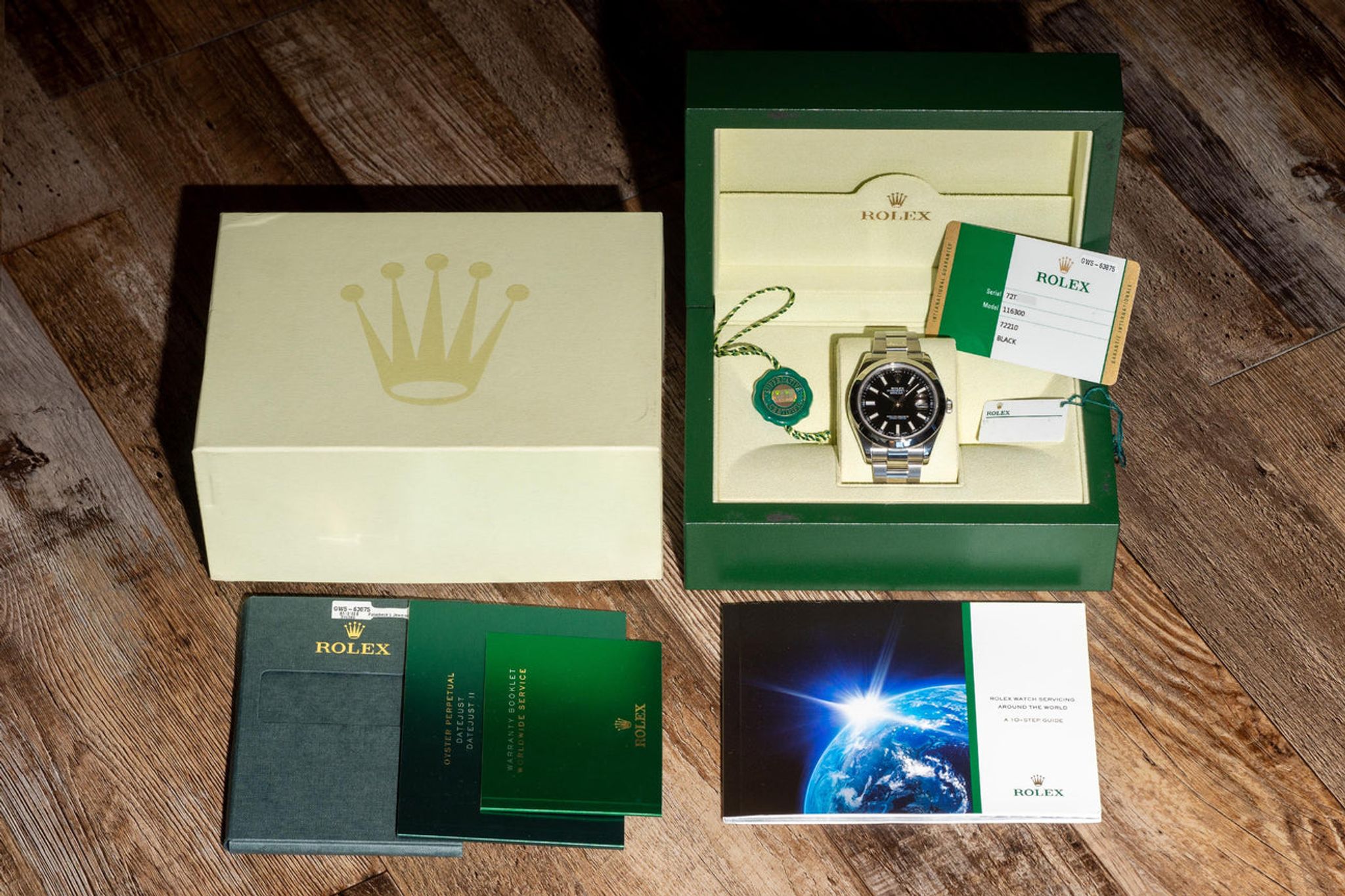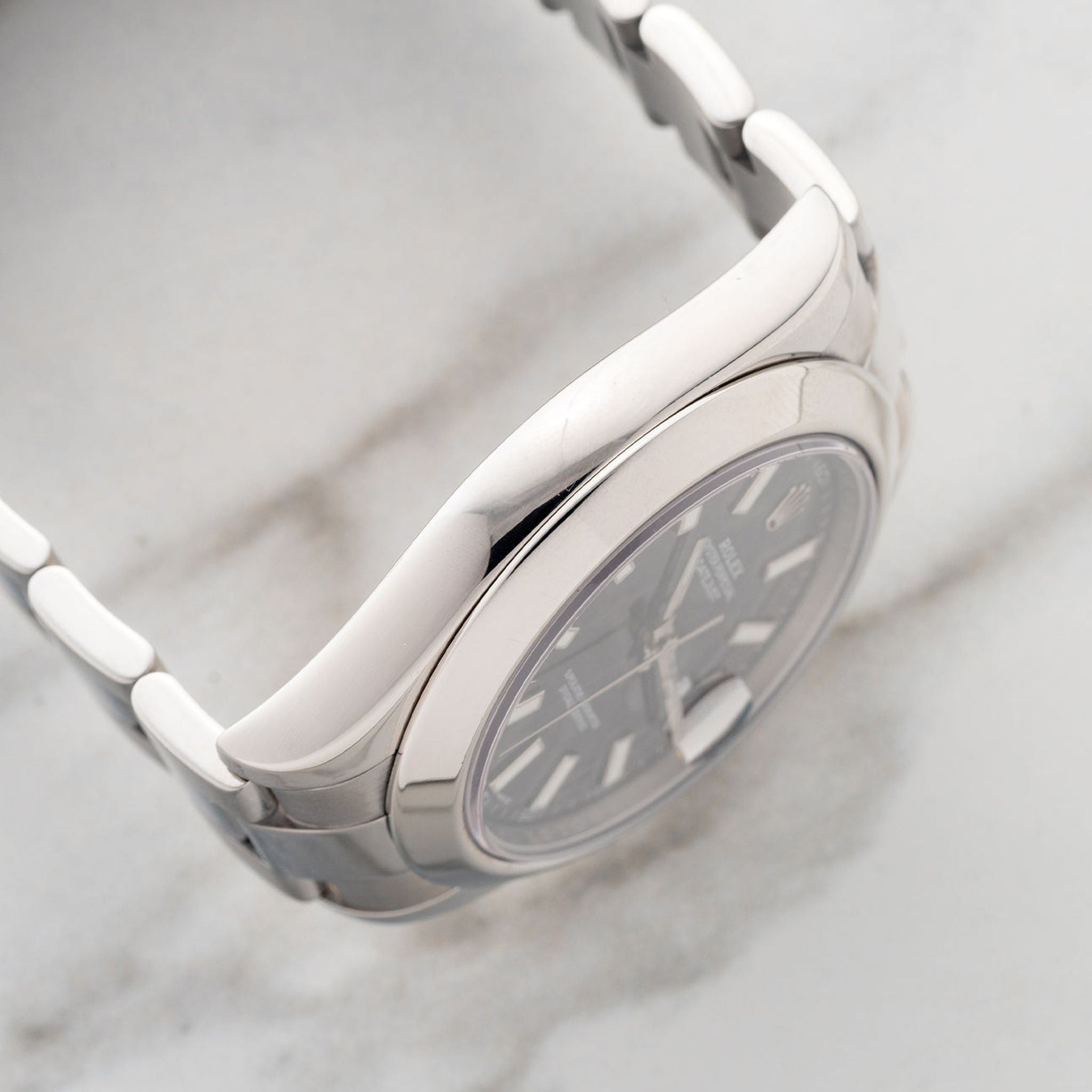 At 41mm, the Datejust II is a great option for anyone with a medium to larger wrist who wants the classic model with boosted proportions. This example on offer houses a black dial which makes it feel stealthy compared to other options that pop like white or silver. It comes as a very nice full set that includes both boxes, its warranty card, booklets and both serialized and wax tags. We just had this piece lightly polished so it looks clean and ready to enjoy for the years to come.