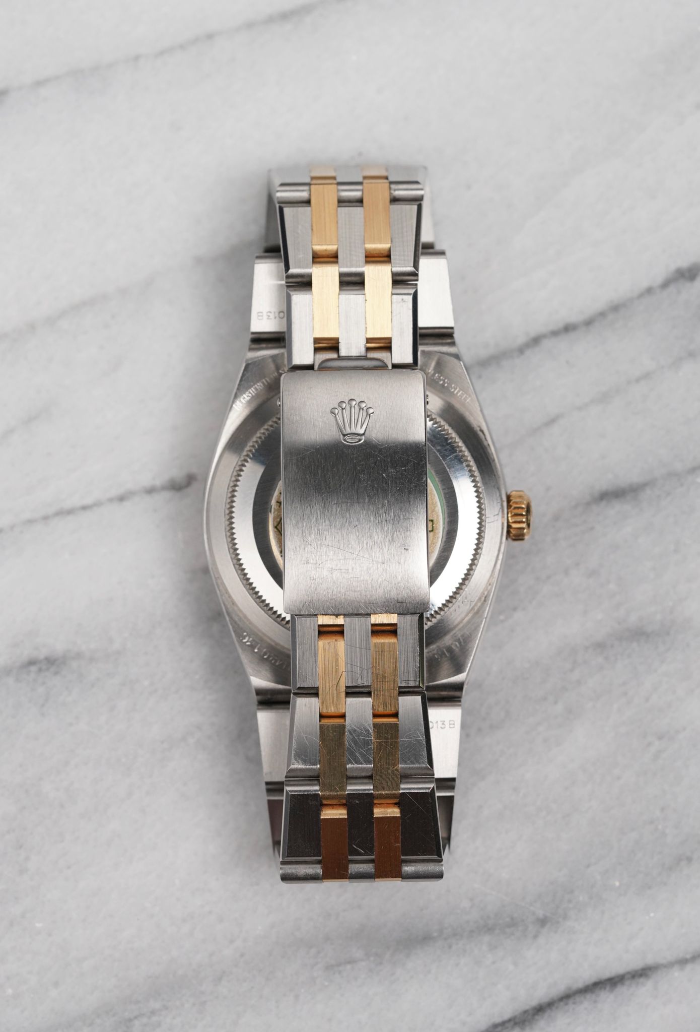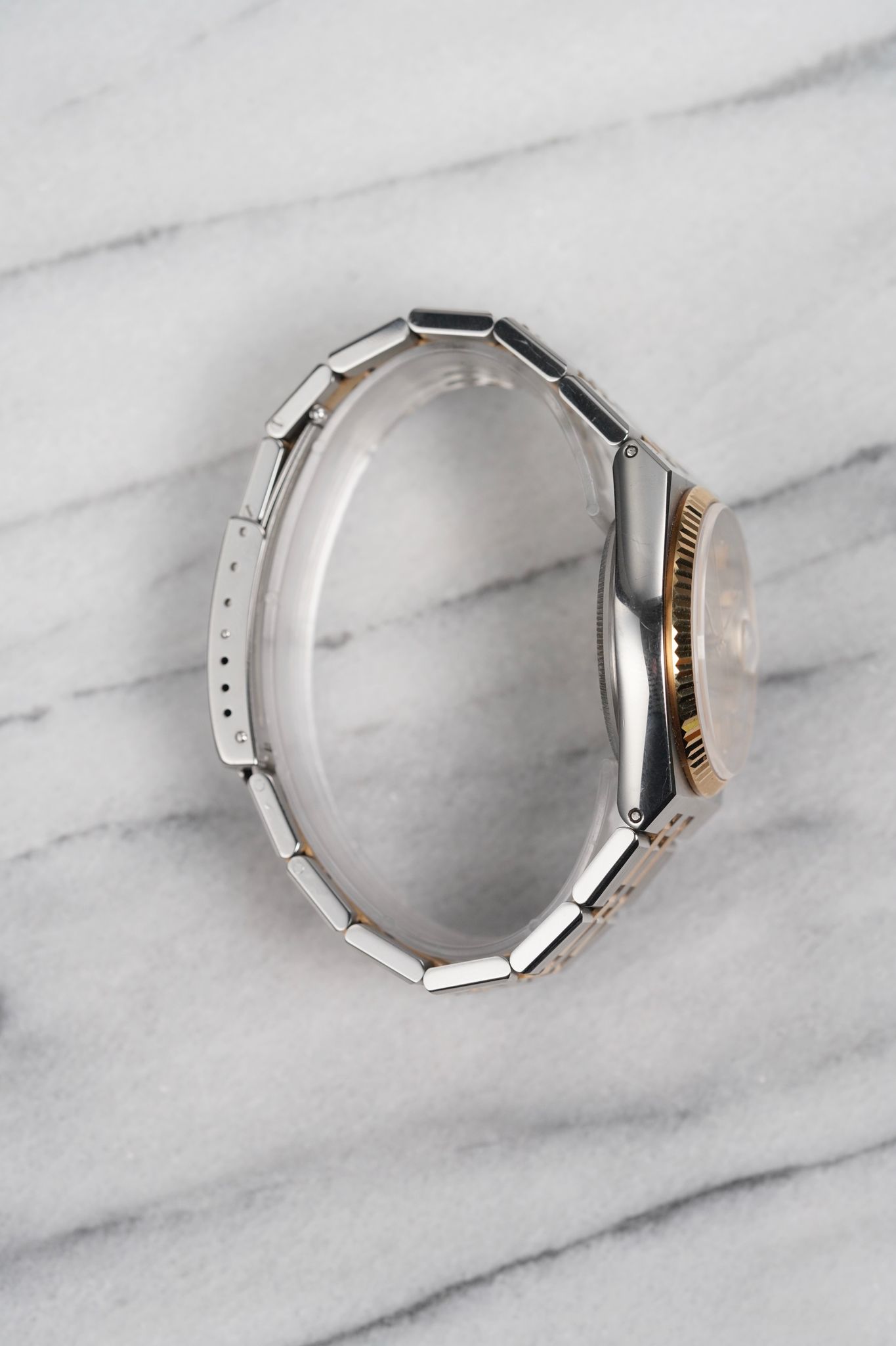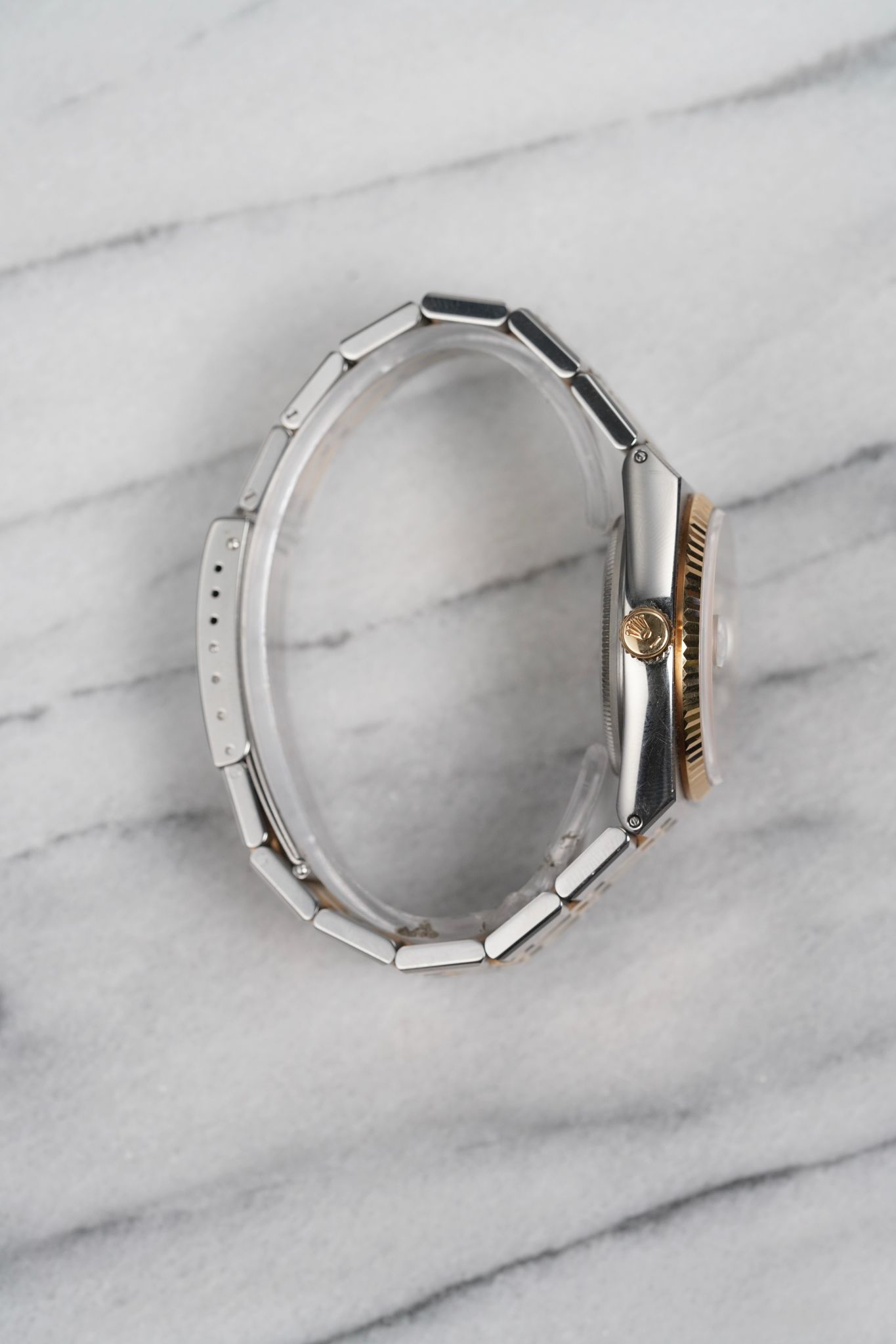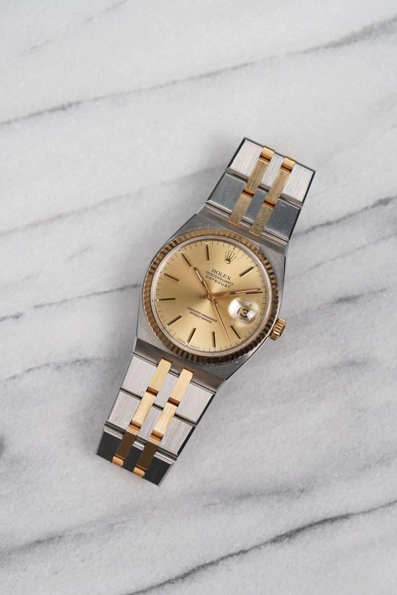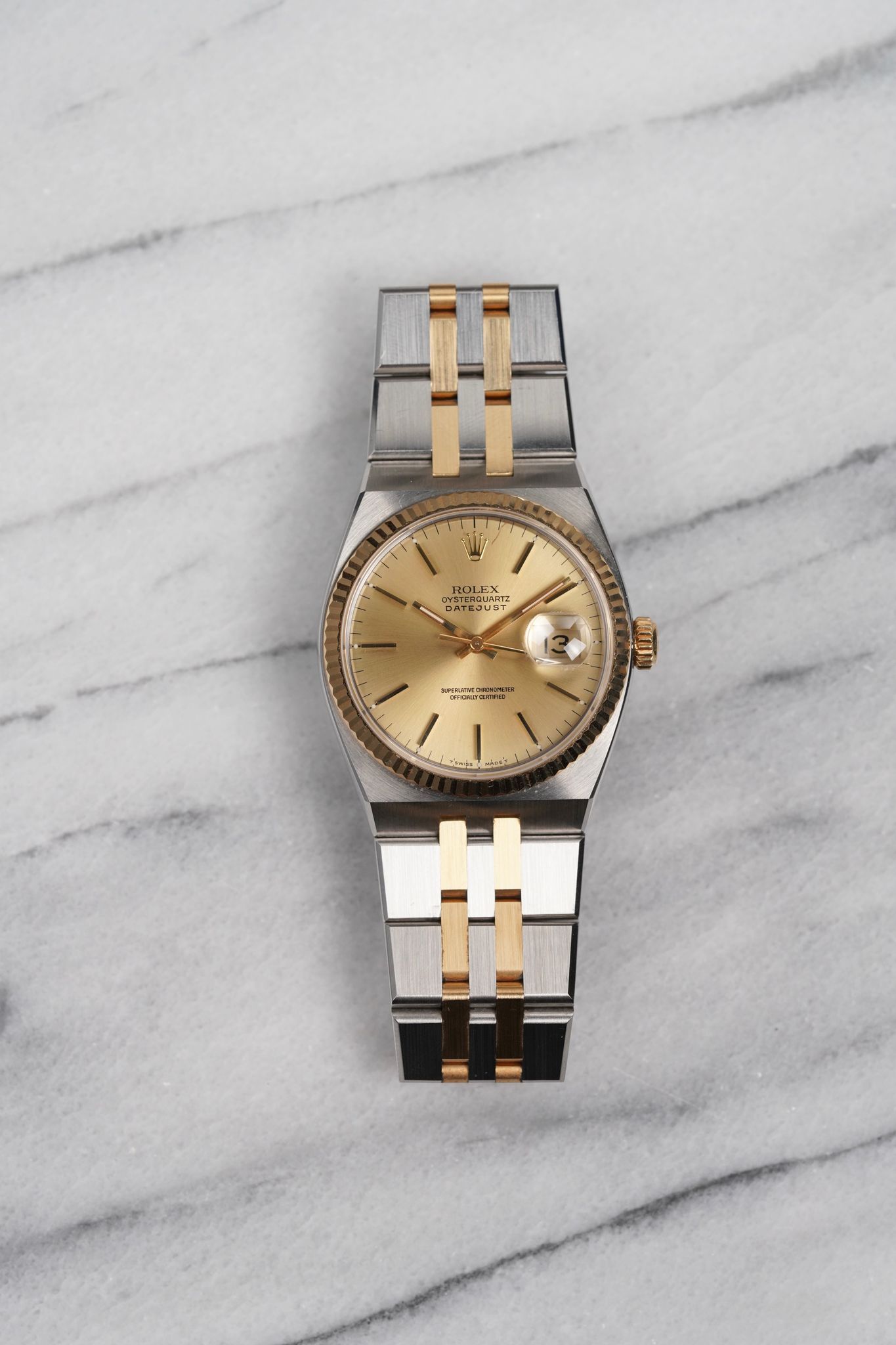 Here's a vintage Rolex Datejust Oysterquartz reference 17013 two tone with a champagne dial from the 80s. Keeps great time and is fully functional. Measurements include a 36mm oyster case and an integrated bracelet. It's on its original two tone integrated bracelet that fits up to a 7 inch wrist. Quickset date function at 3 a clock. 18K yellow gold bezel and center links. The hands and lume plots have a matching crisp white lume. Brushed finishing on the bracelet. The bracelet is rather tight with no stretch. Both the case and bracelet are in great shape for its age. Original caseback sticker on the caseback. Both the dial and crystal are free from any scratches or marks. Stainless steel case and caseback. All parts are original including the signed Role crown, case back, dial, and movement. The dial and case are in great cosmetic, untouched condition.