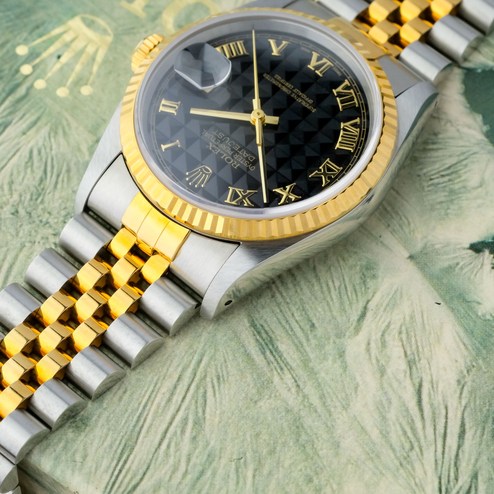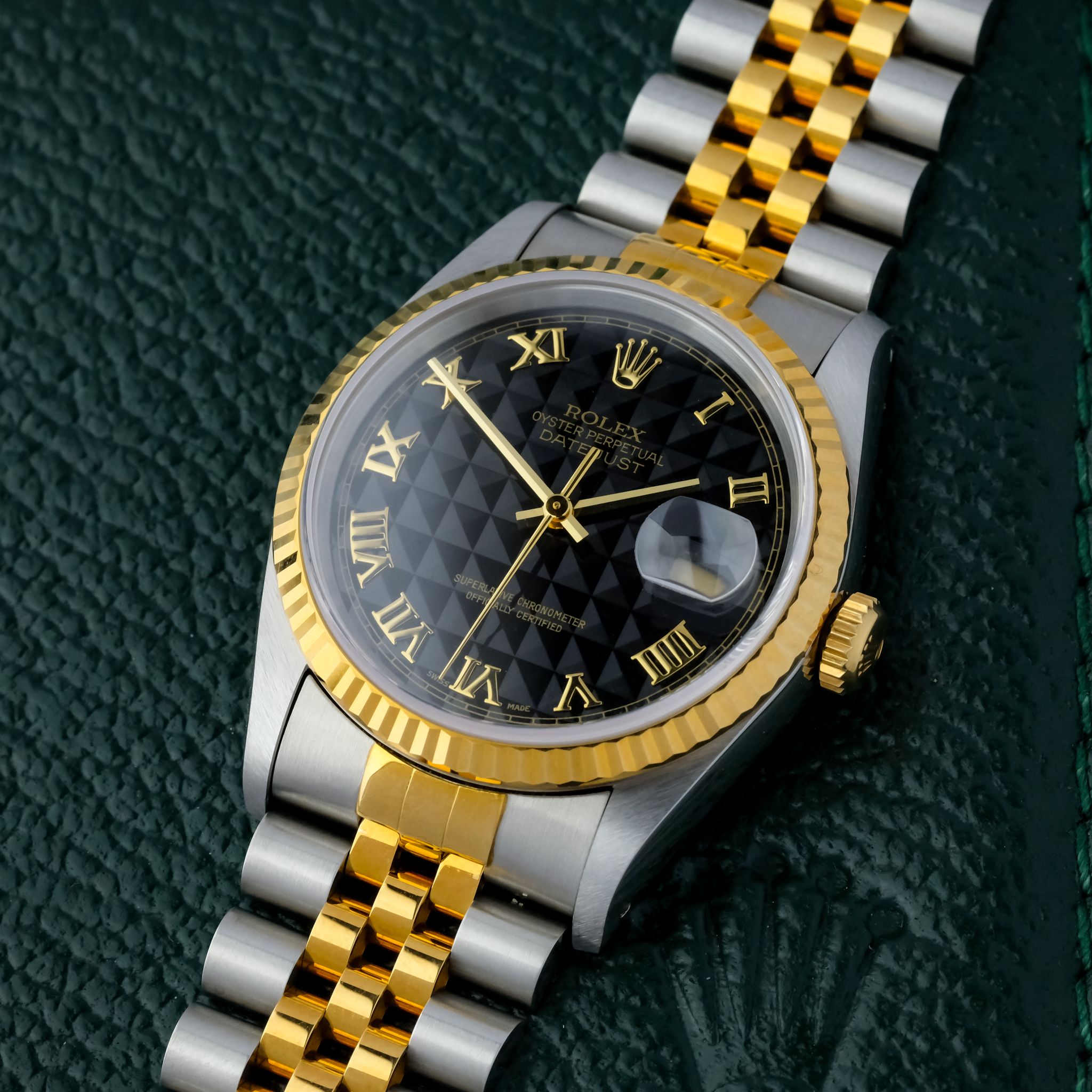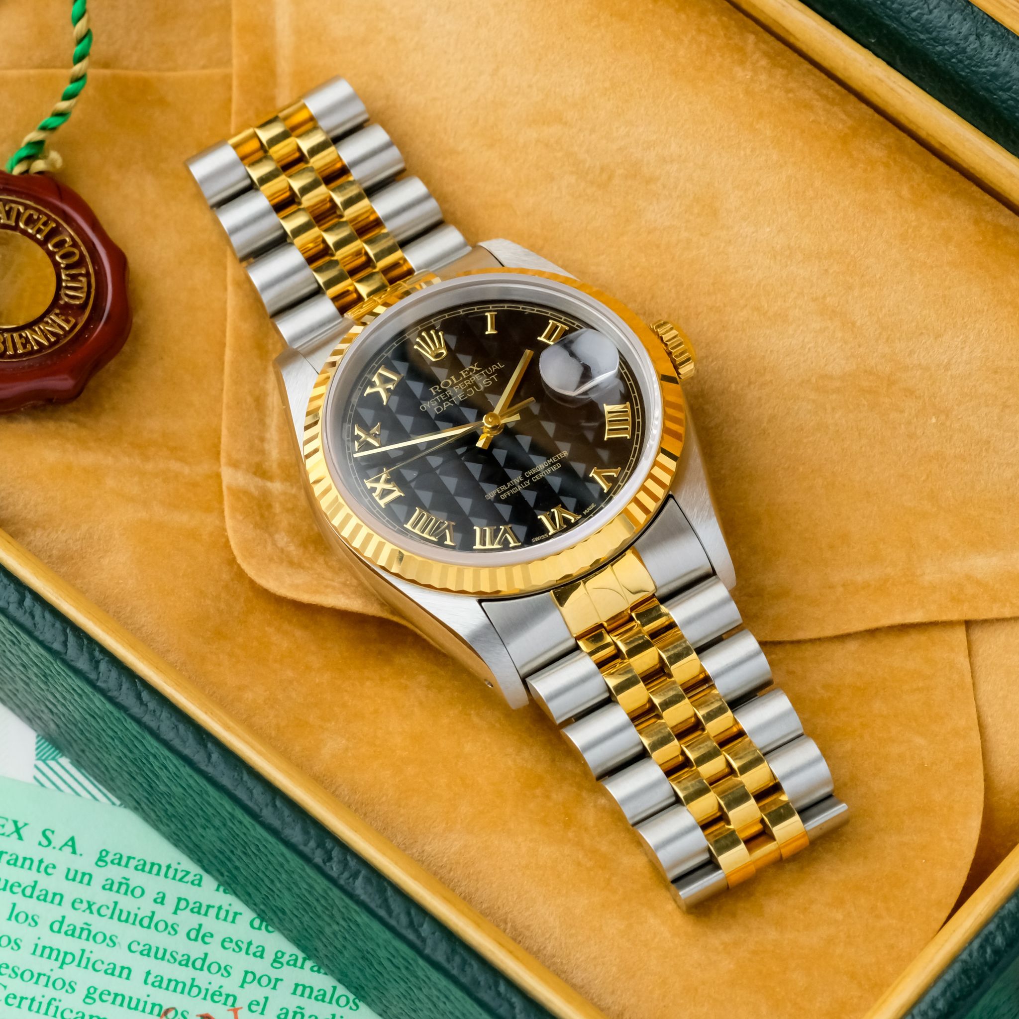 What sets this example apart is its rare black pyramid dial, an uncommon and highly distinctive variant. The dial features a geometric textured surface, adding depth and character to the otherwise minimalist layout. Gold roman hour markers and hands stand in sharp contrast to the black dial, creating a bold yet refined presence. Powered by the reliable automatic Caliber 3135, the 16233 combines technical performance with visual sophistication.