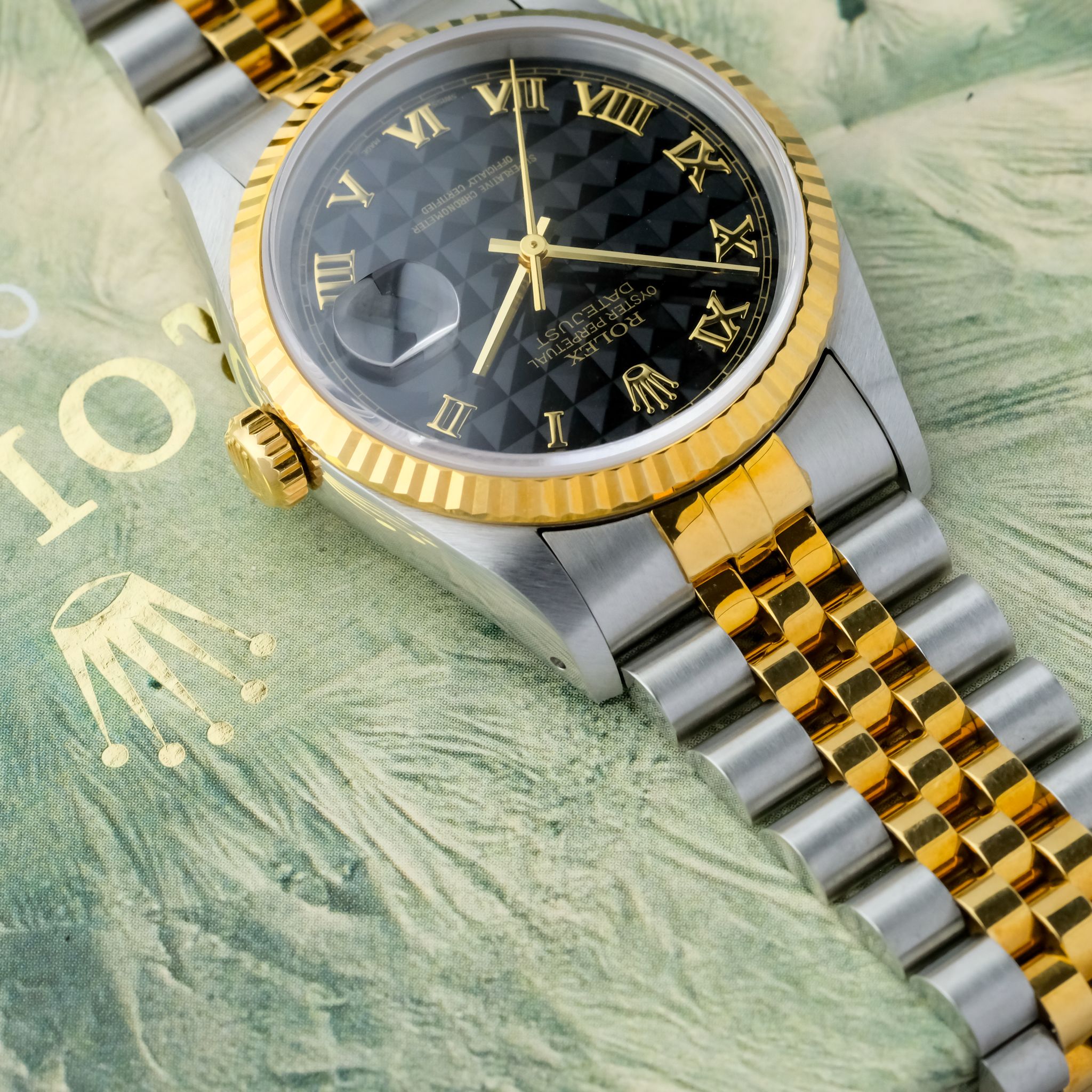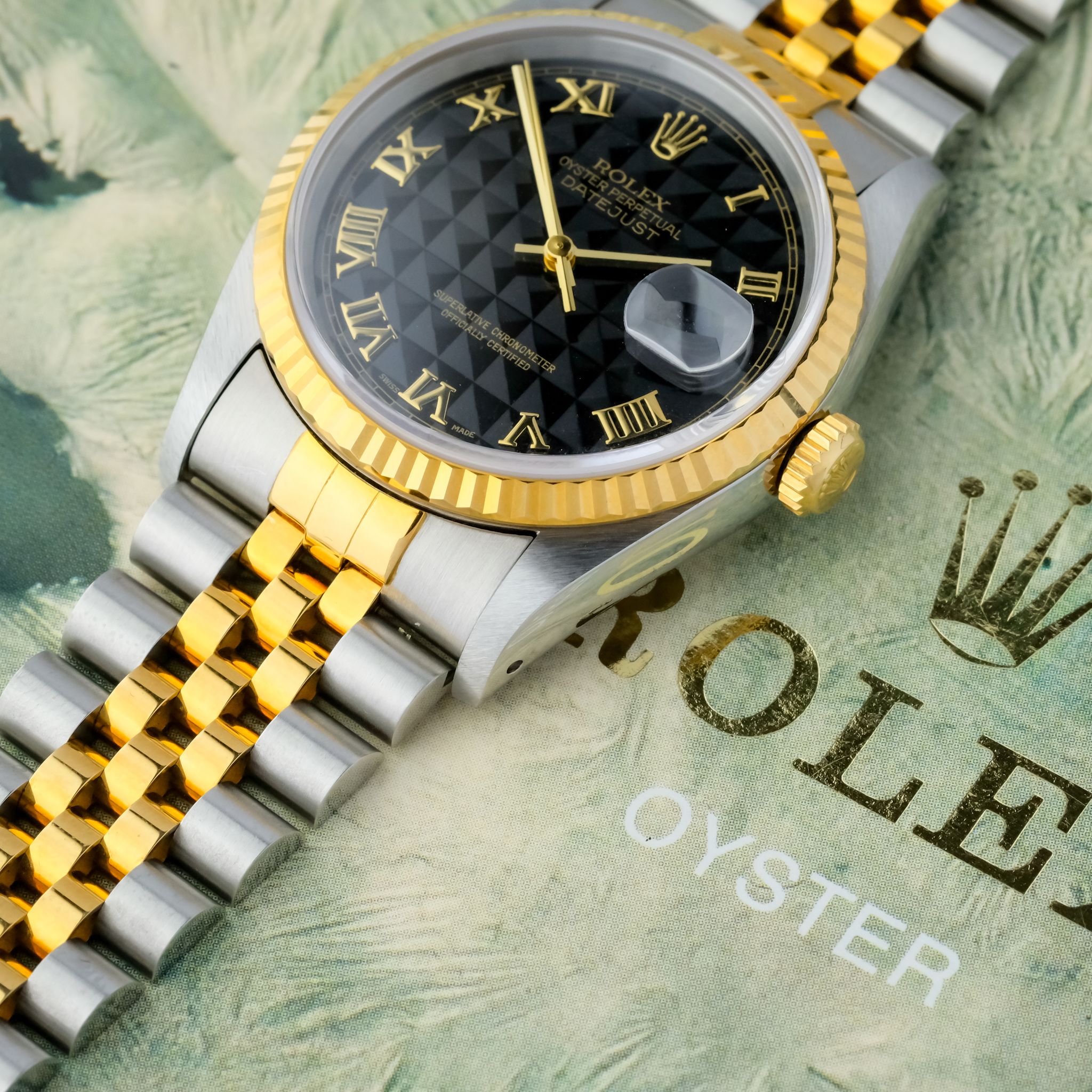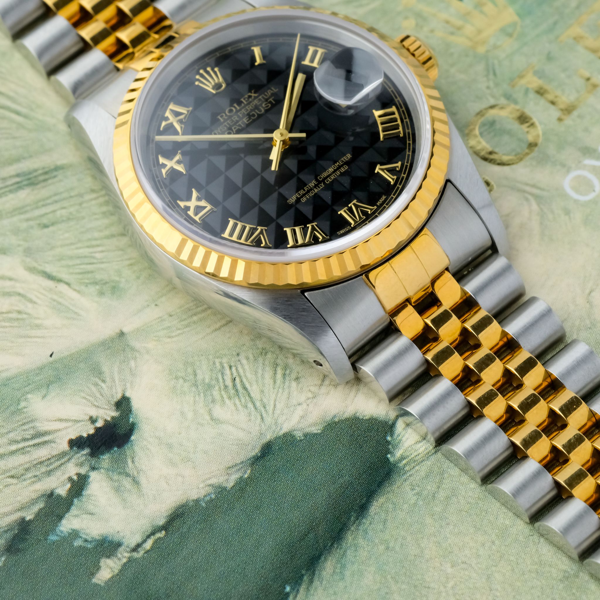 What sets this example apart is its rare black pyramid dial, an uncommon and highly distinctive variant. The dial features a geometric textured surface, adding depth and character to the otherwise minimalist layout. Gold roman hour markers and hands stand in sharp contrast to the black dial, creating a bold yet refined presence. Powered by the reliable automatic Caliber 3135, the 16233 combines technical performance with visual sophistication.