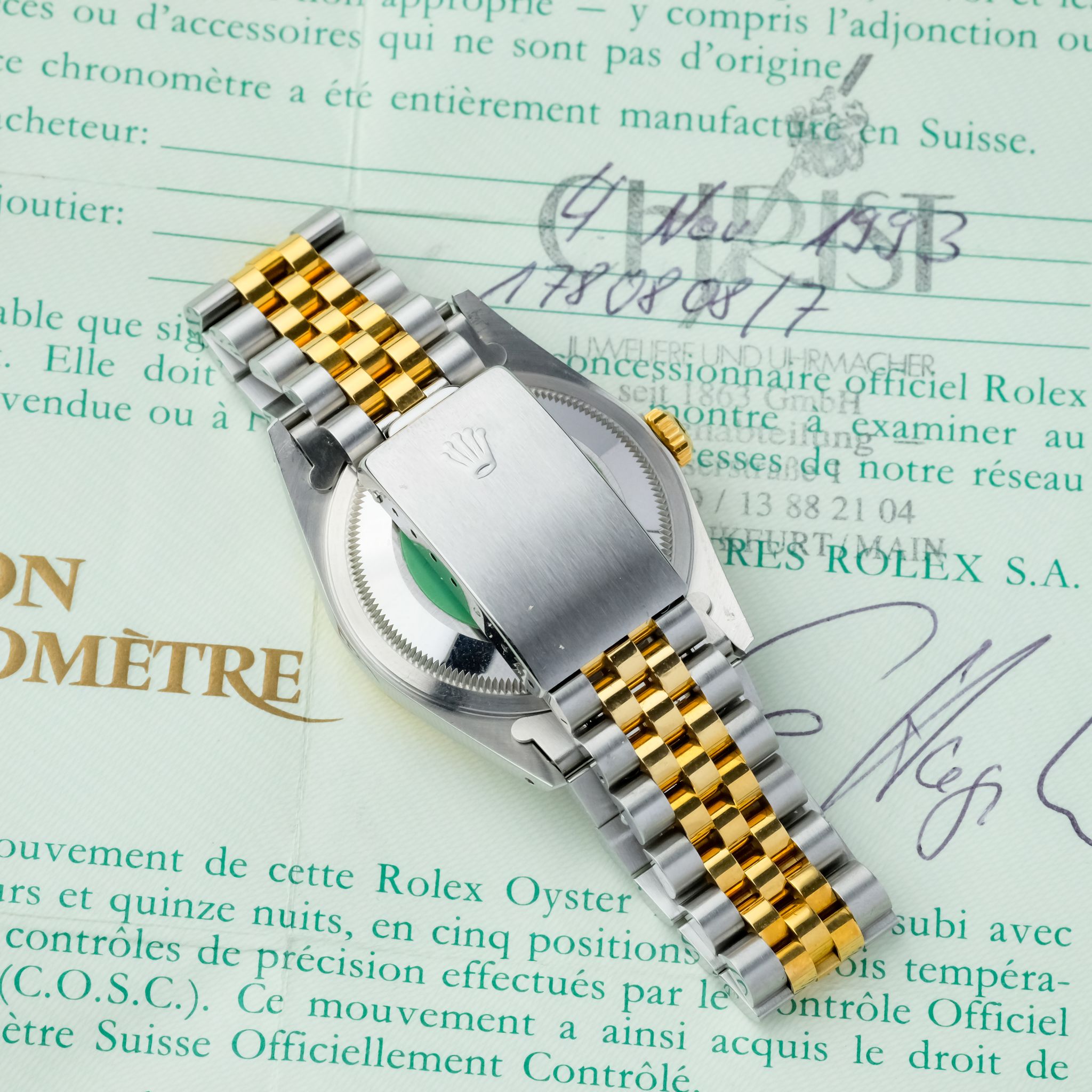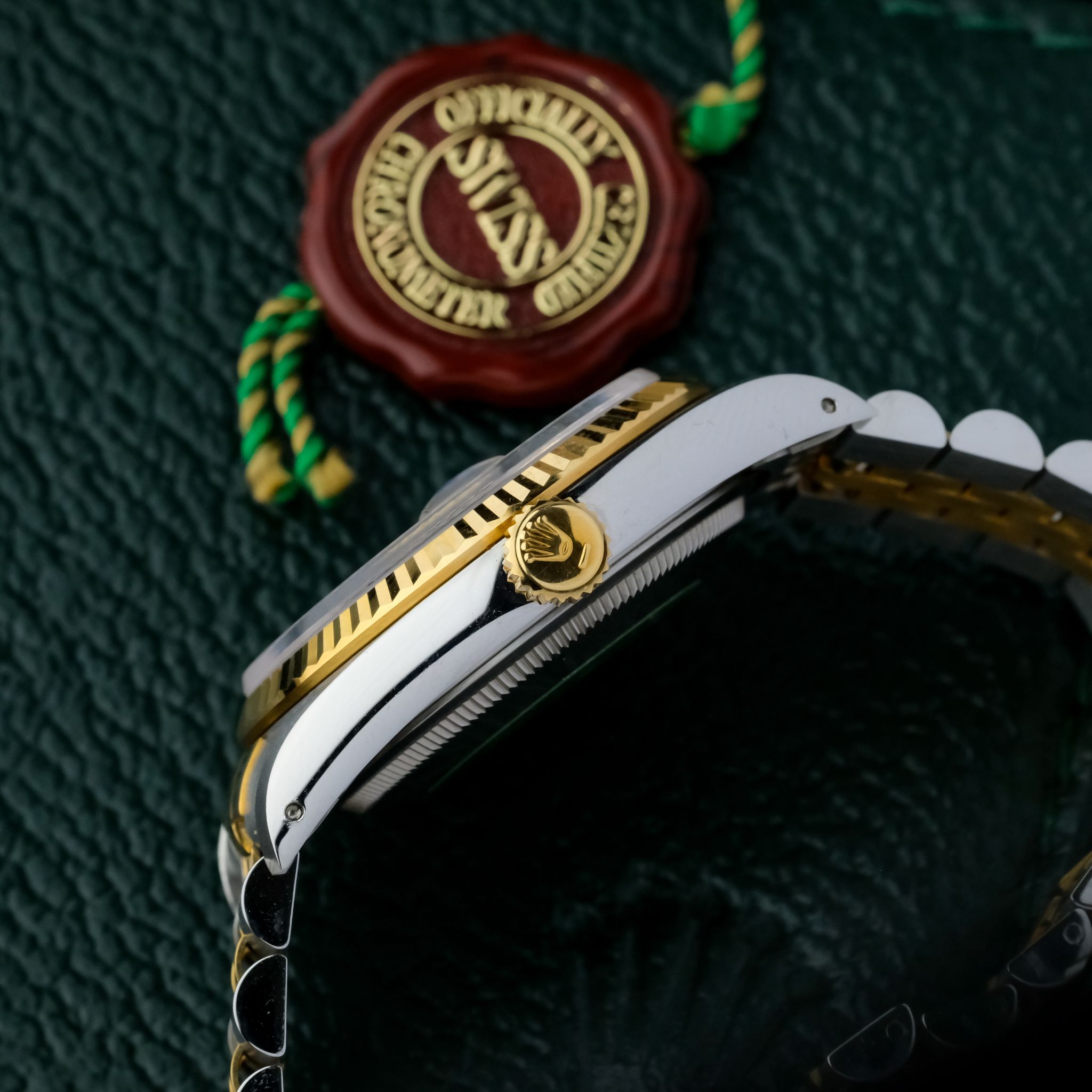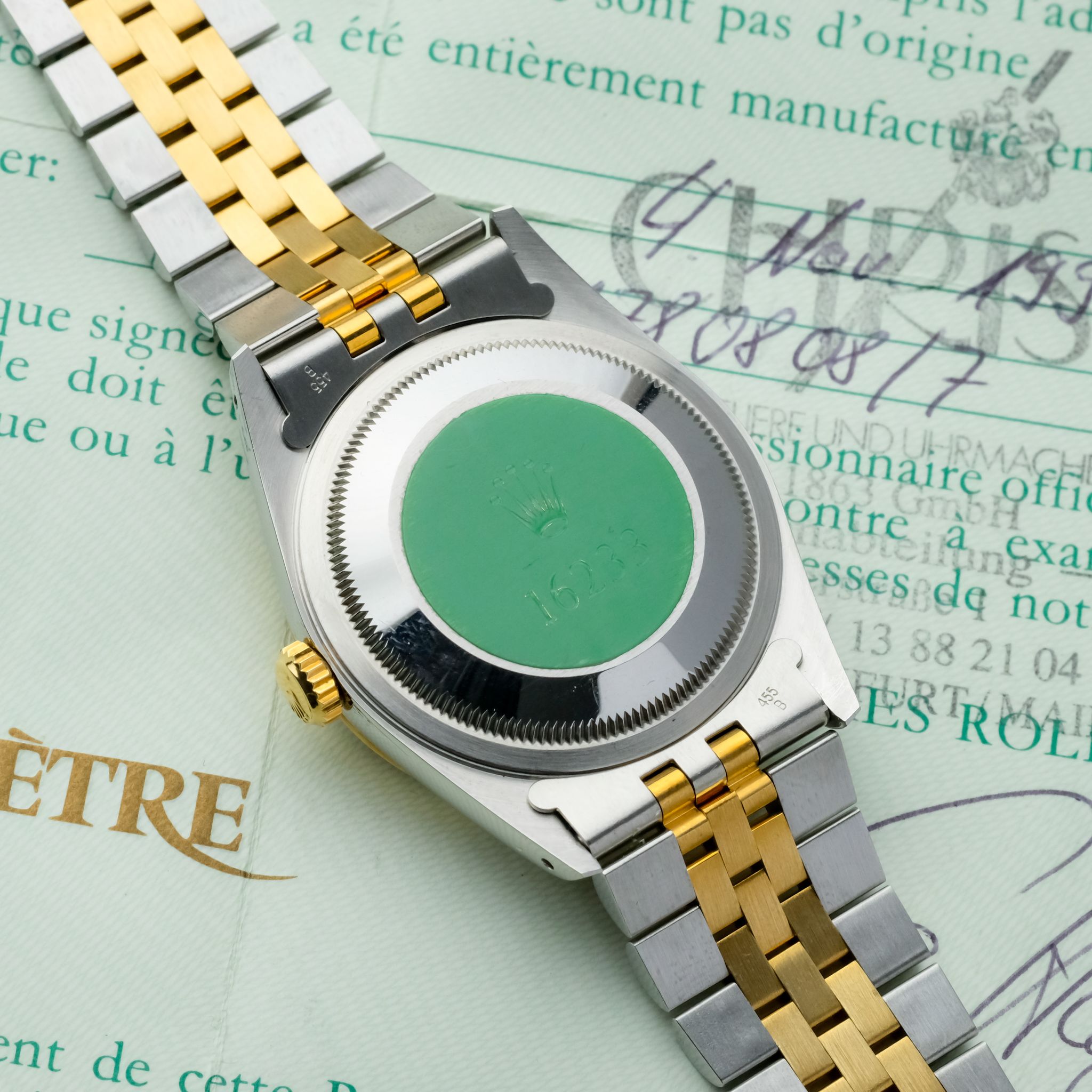 The Rolex Datejust Ref. 16233 is a cornerstone of the brand’s catalog, embodying the perfect balance between everyday functionality and timeless elegance. Introduced in the late 1980s, this two-tone reference pairs stainless steel with 18k yellow gold in the classic 36mm Oyster case.