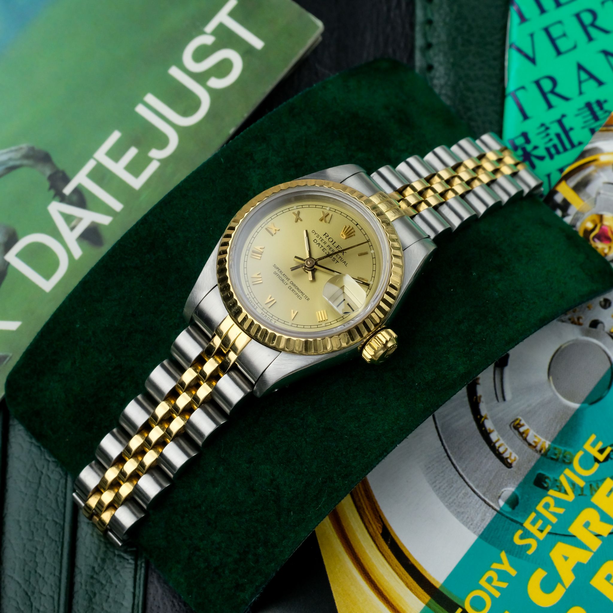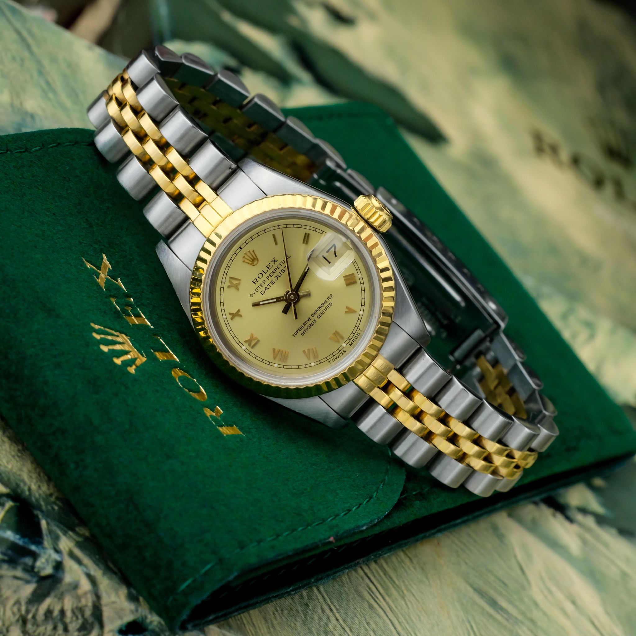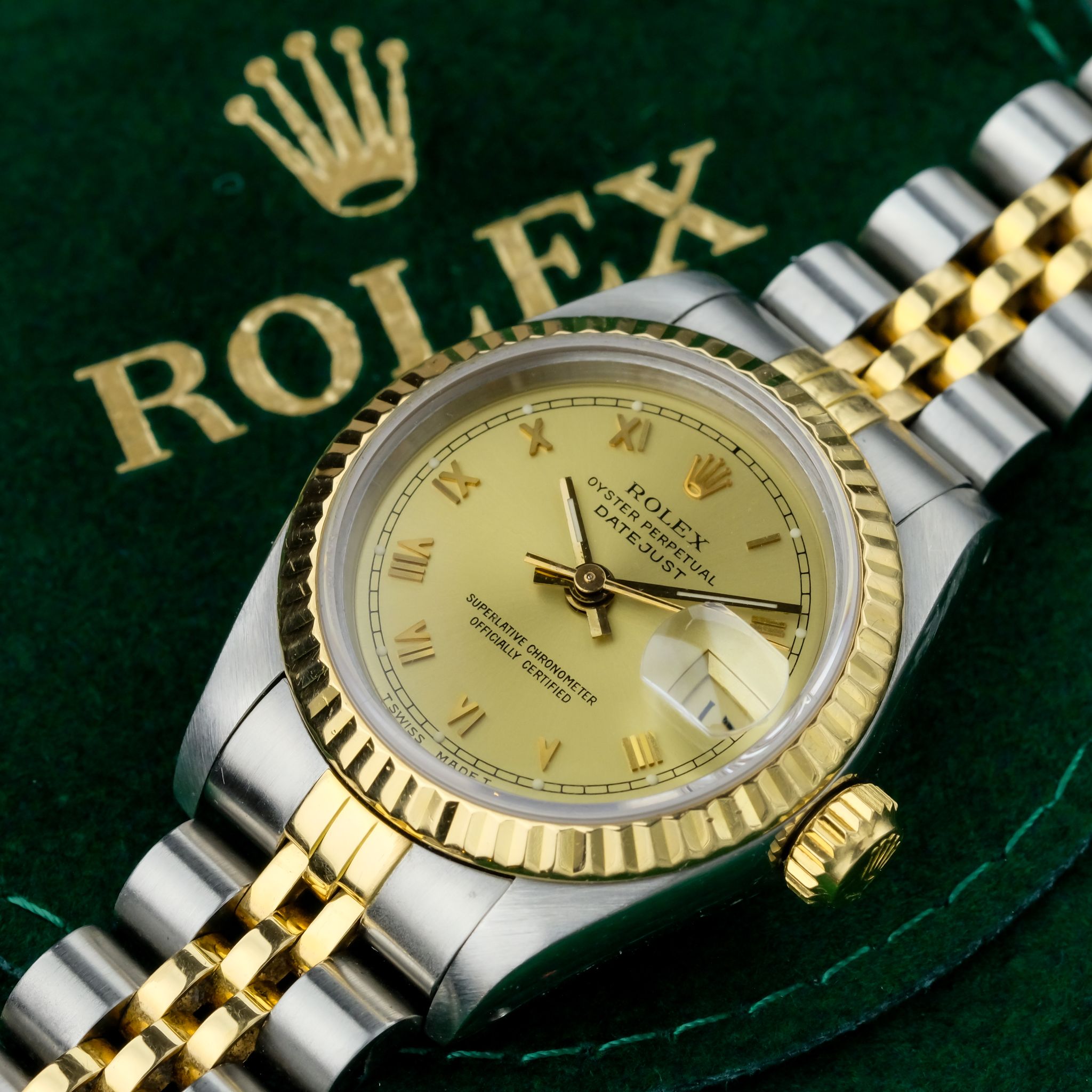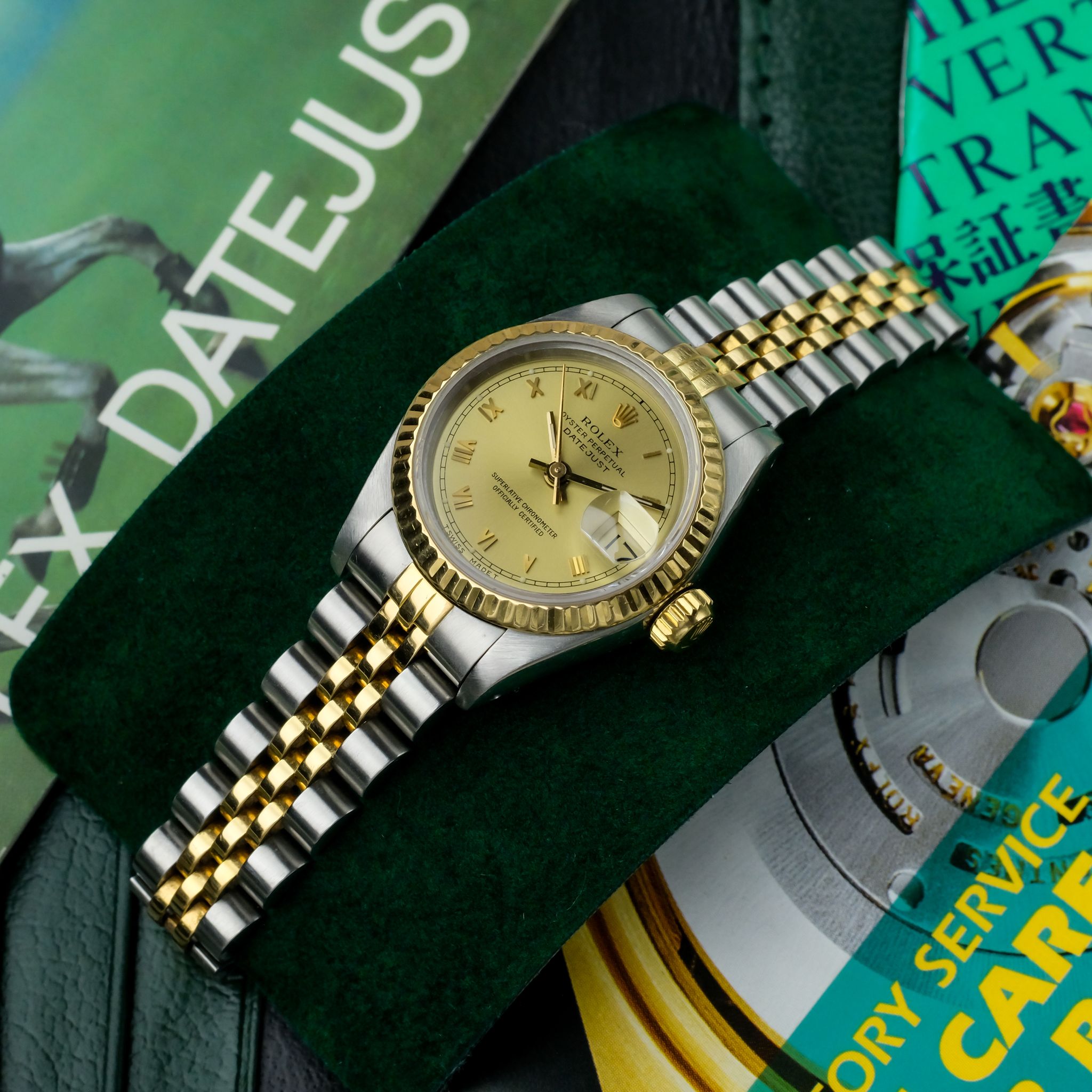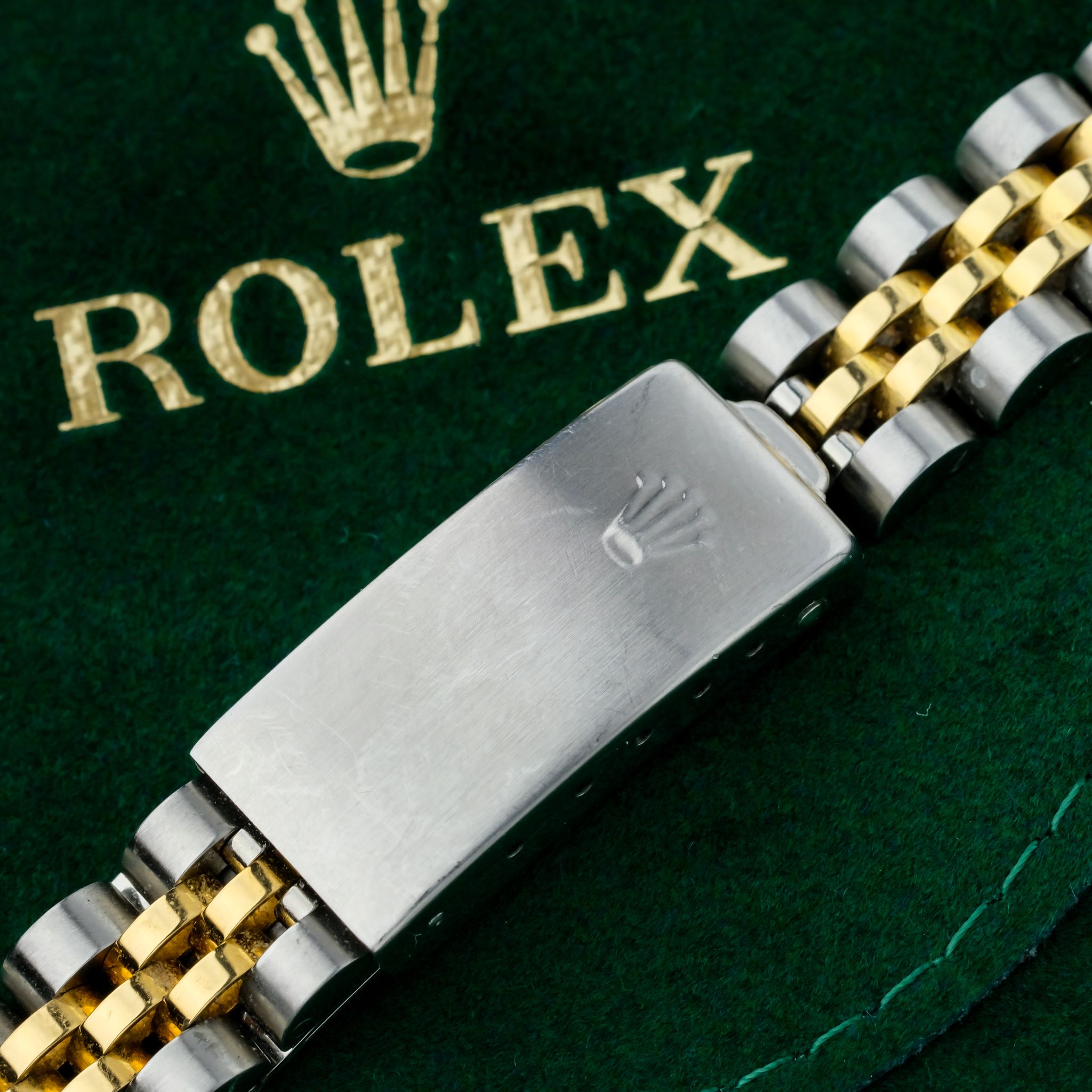 Beautifully preserved Rolex Datejust ladies version ref. 69173 with champagne dial and beloved jubilee bracelet. The condition is very good and unpolished with the original finish clearly visible and only light scratches to the case, bracelet and clasp.. the dial has no patina at all and fits the watch super well.. it comes with a Rolex service etuit!