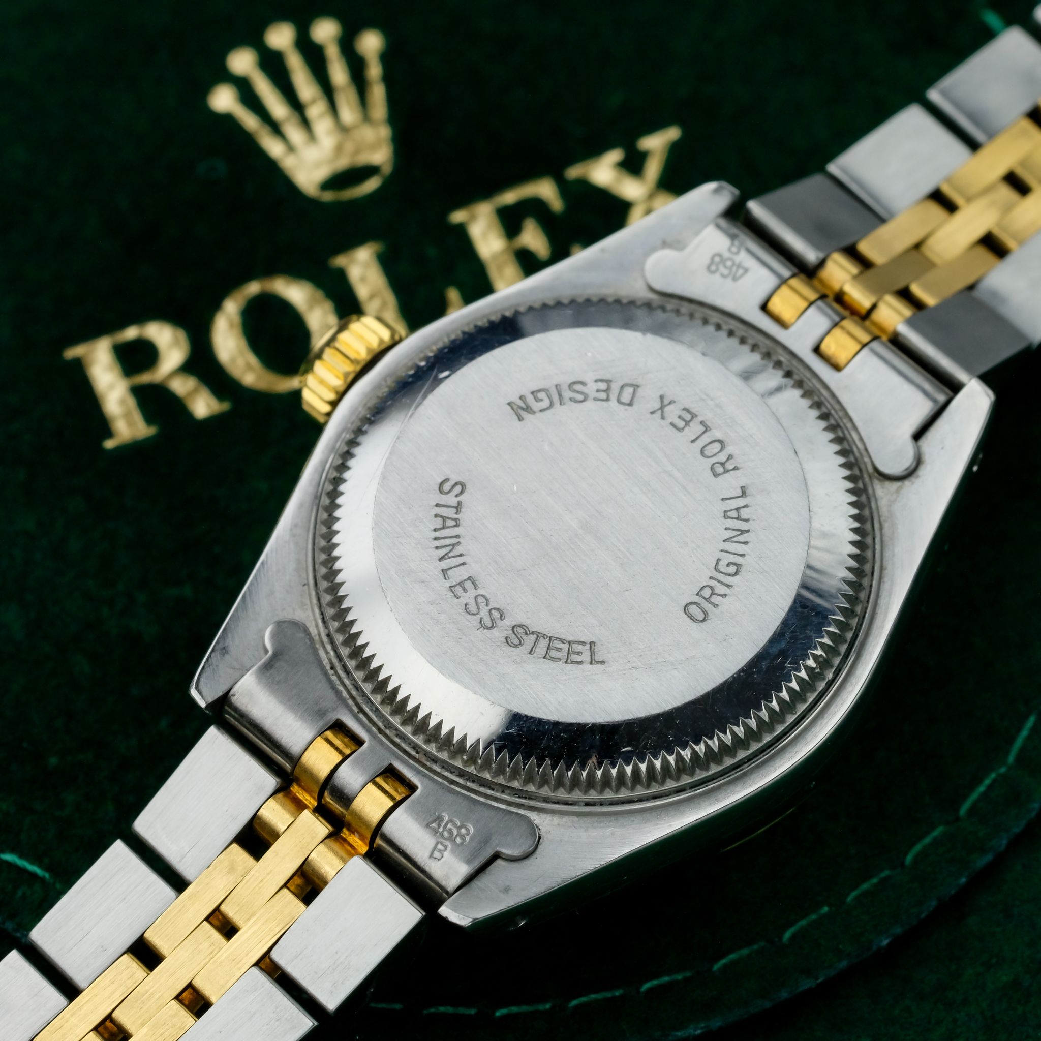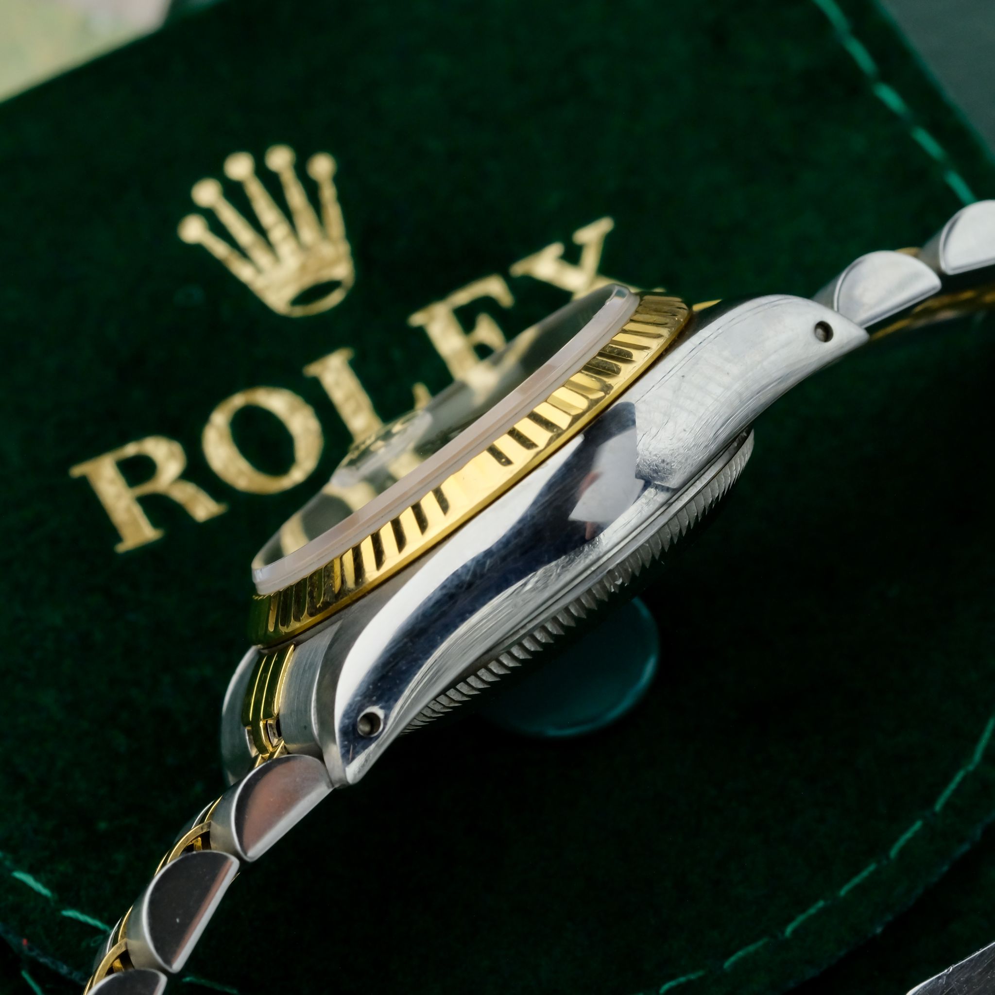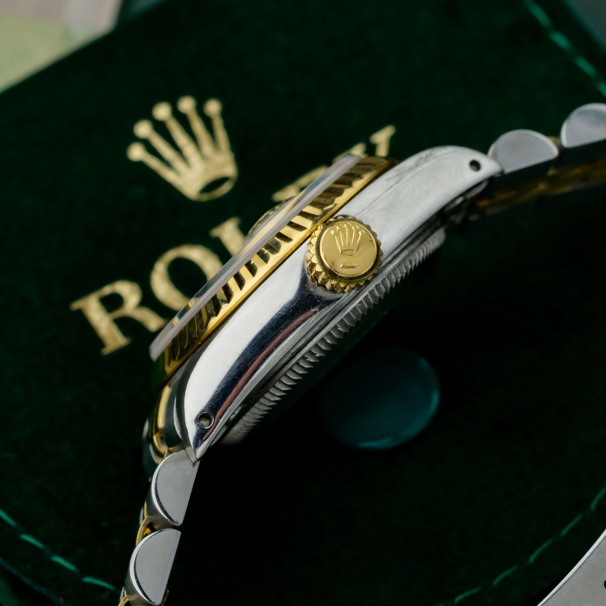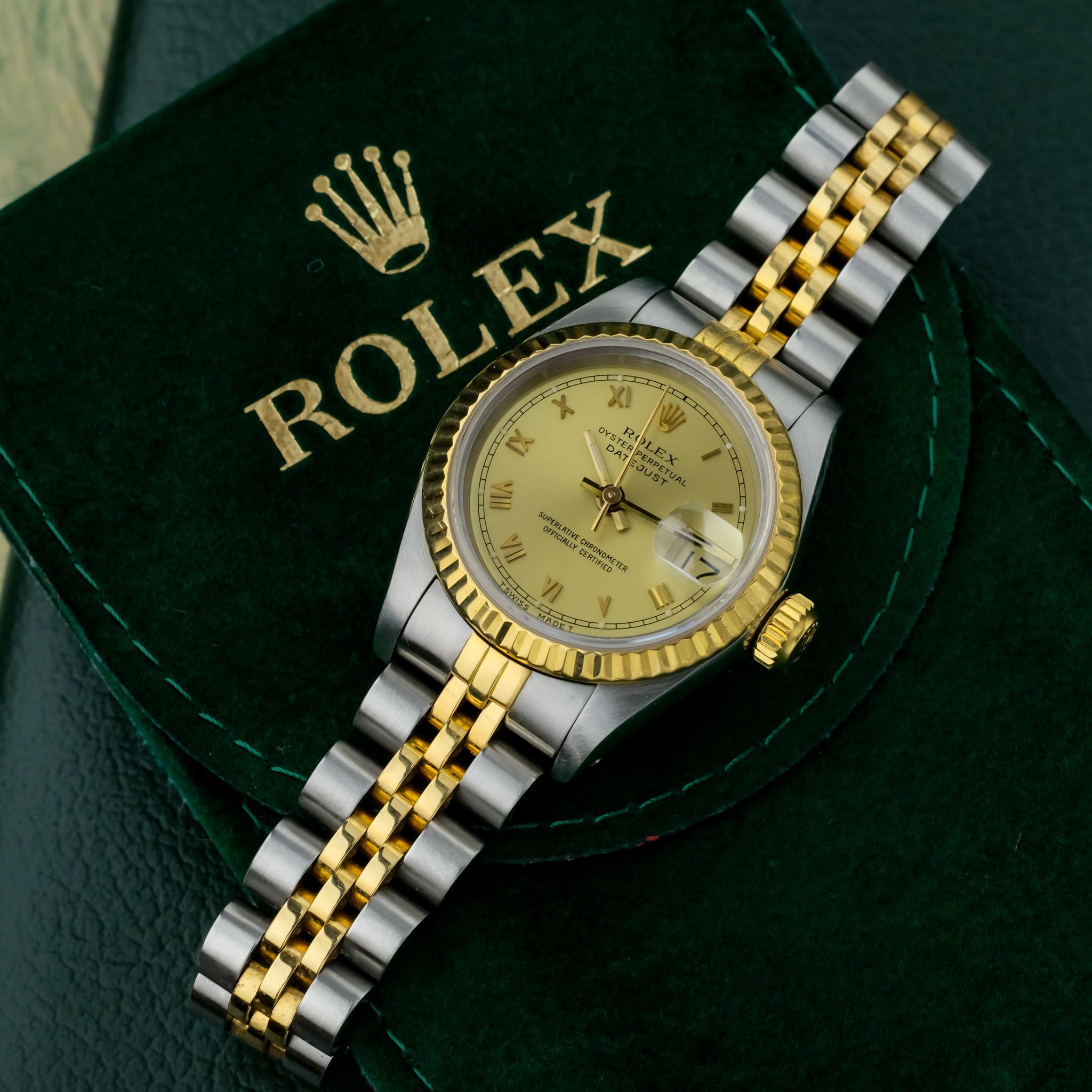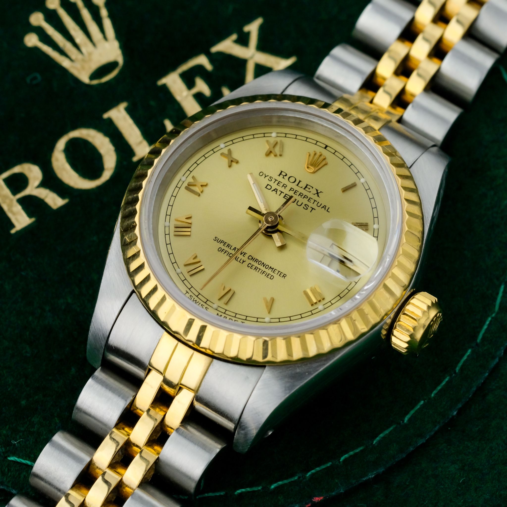Beautifully preserved Rolex Datejust ladies version ref. 69173 with champagne dial and beloved jubilee bracelet. The condition is very good and unpolished with the original finish clearly visible and only light scratches to the case, bracelet and clasp.. the dial has no patina at all and fits the watch super well.. it comes with a Rolex service etuit!