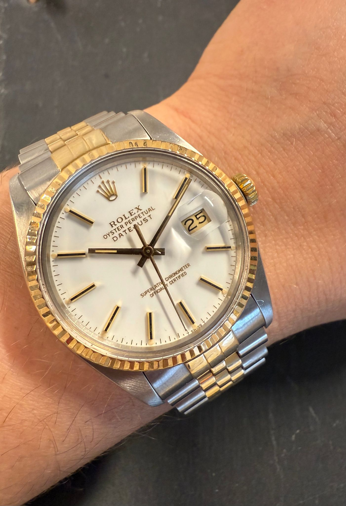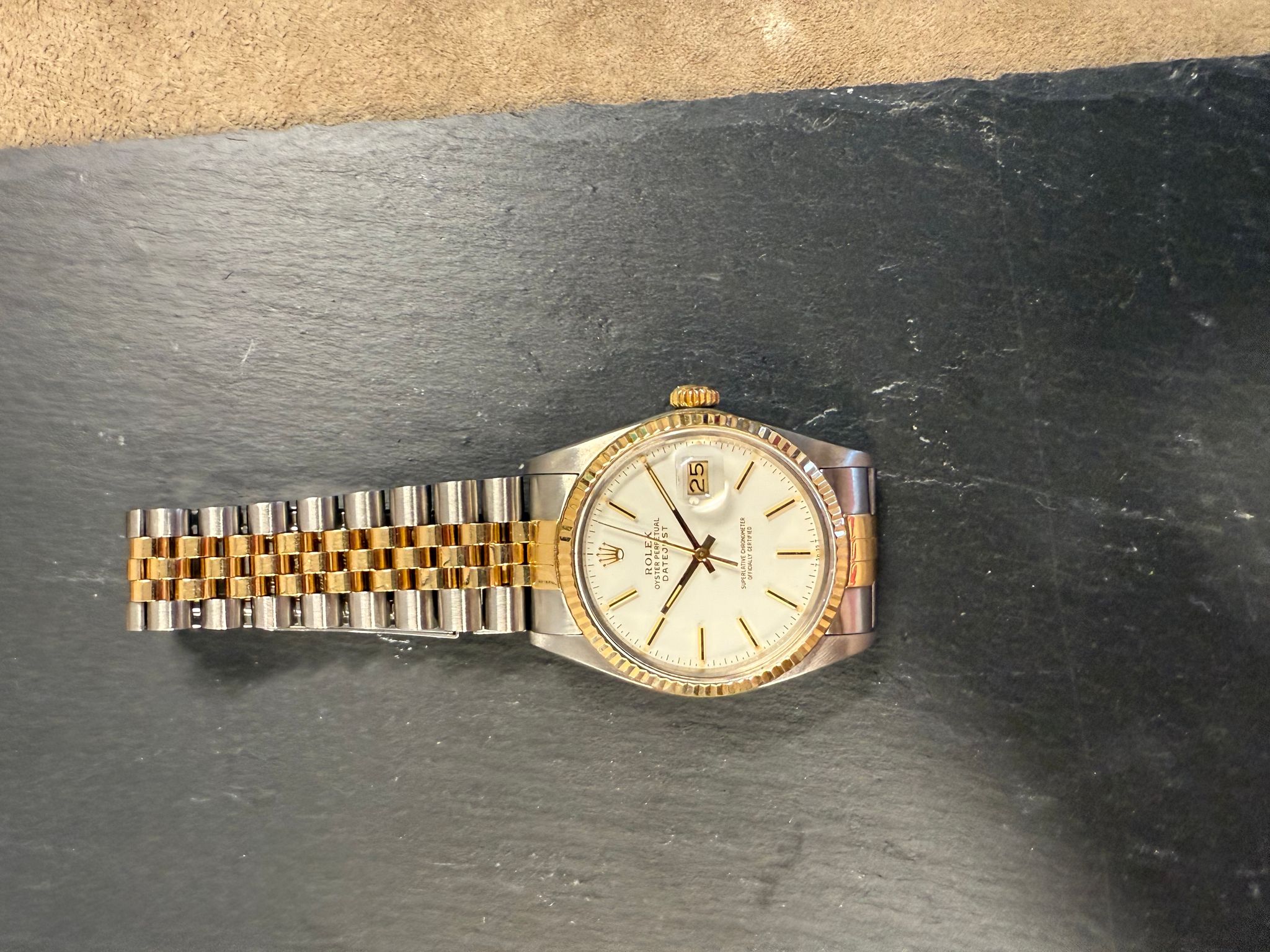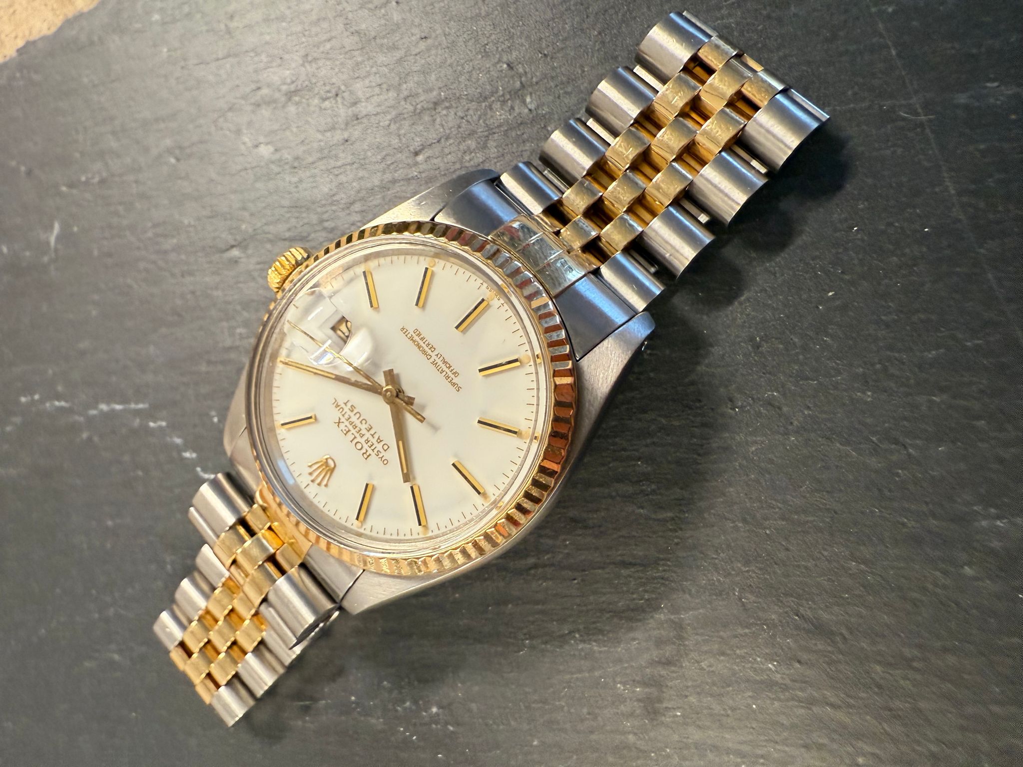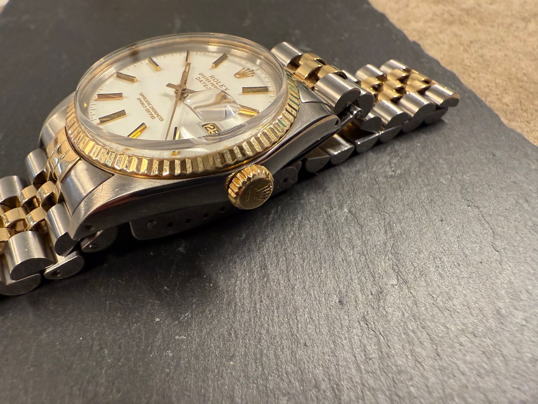 We are pleased to offer this rare and collectible Rolex Datejust reference 16013. It features a 36mm case with 18k yellow gold fluted bezel and matching steel and gold jubilee bracelet. The star of the show is a stunning white Stella dial with gold writing. These dials are few and far between and share characteristics with the day date versions.