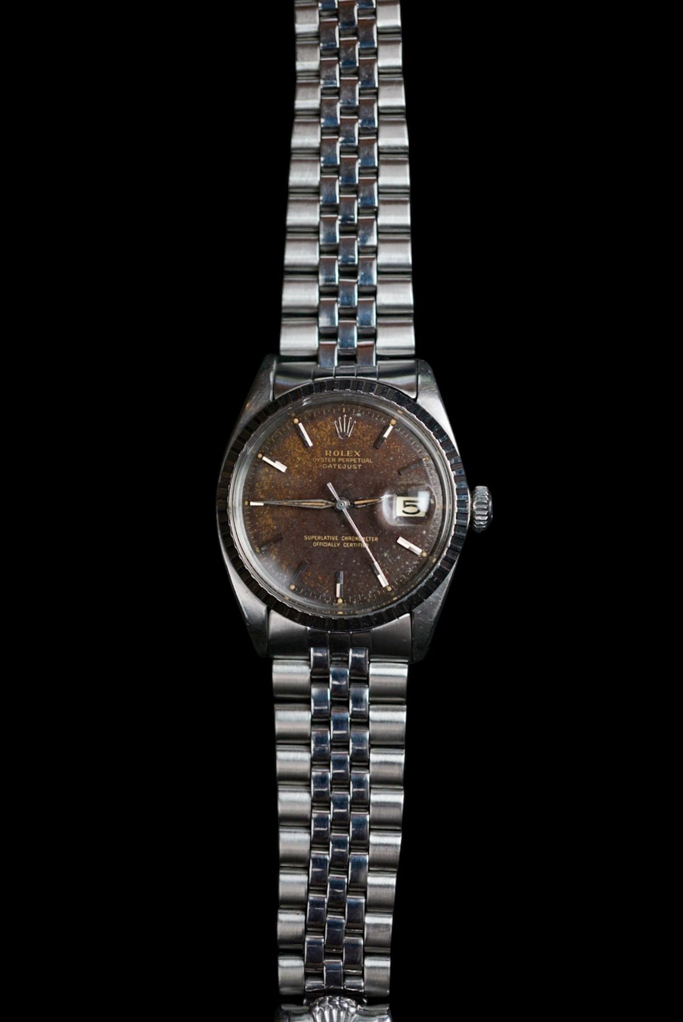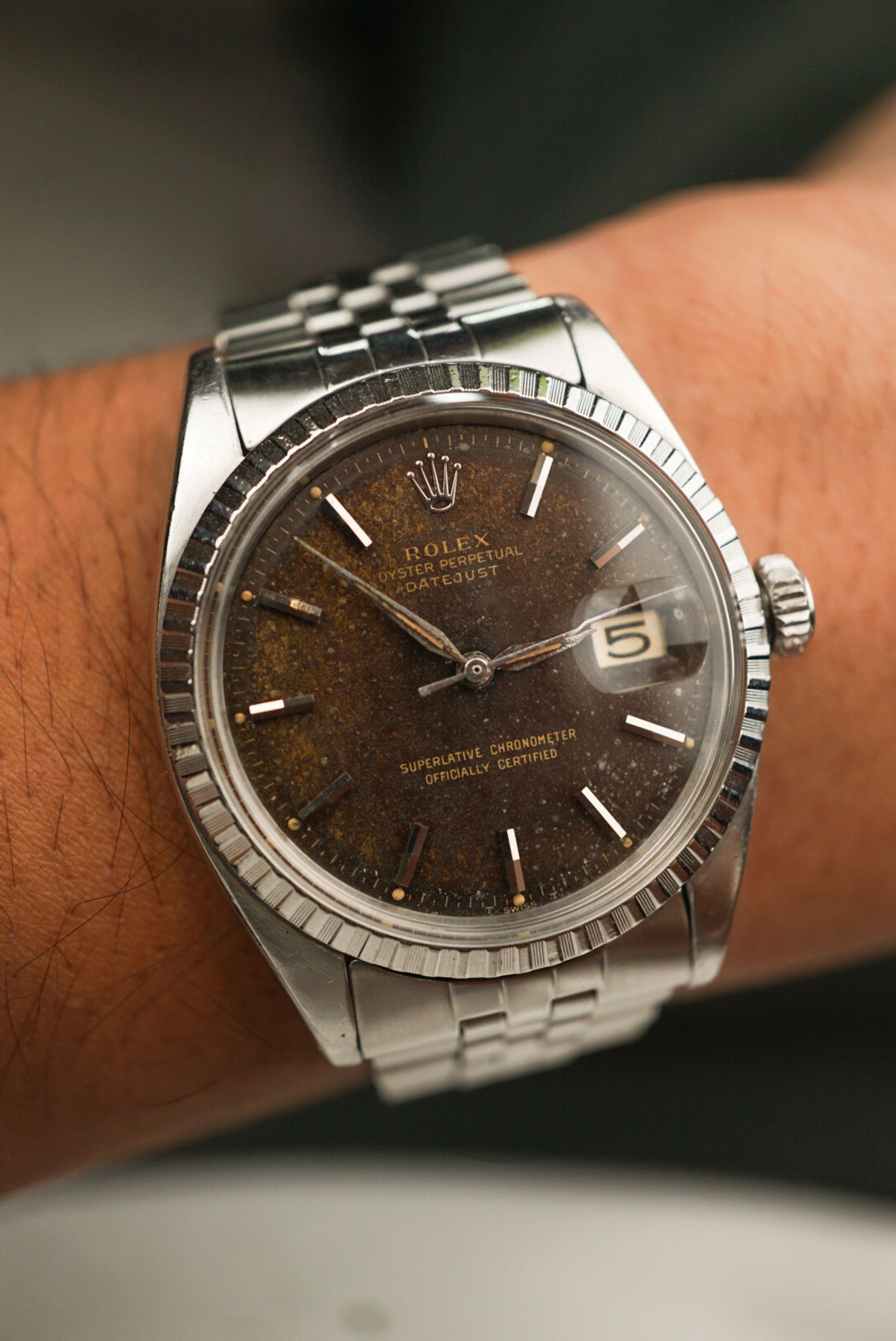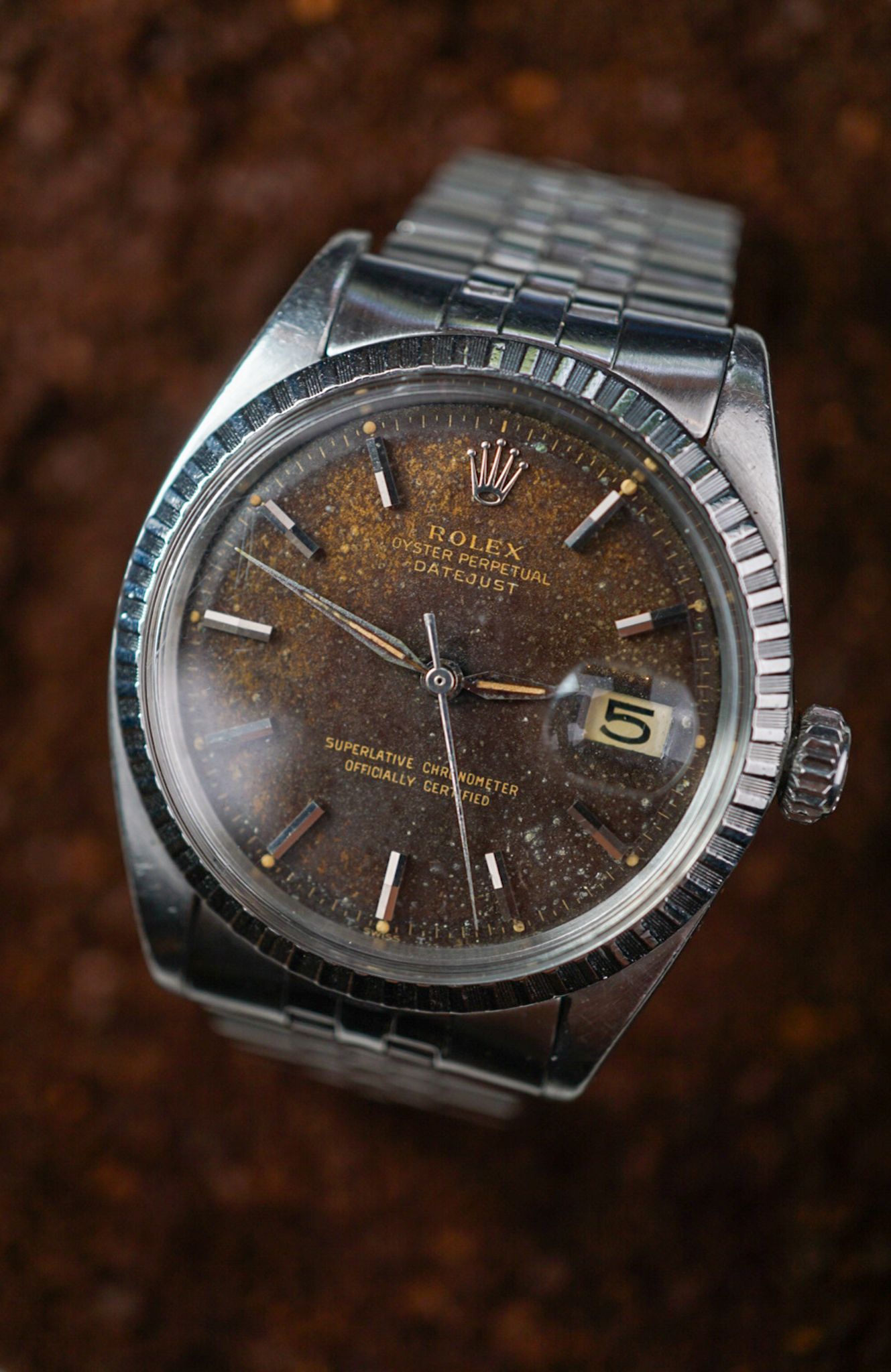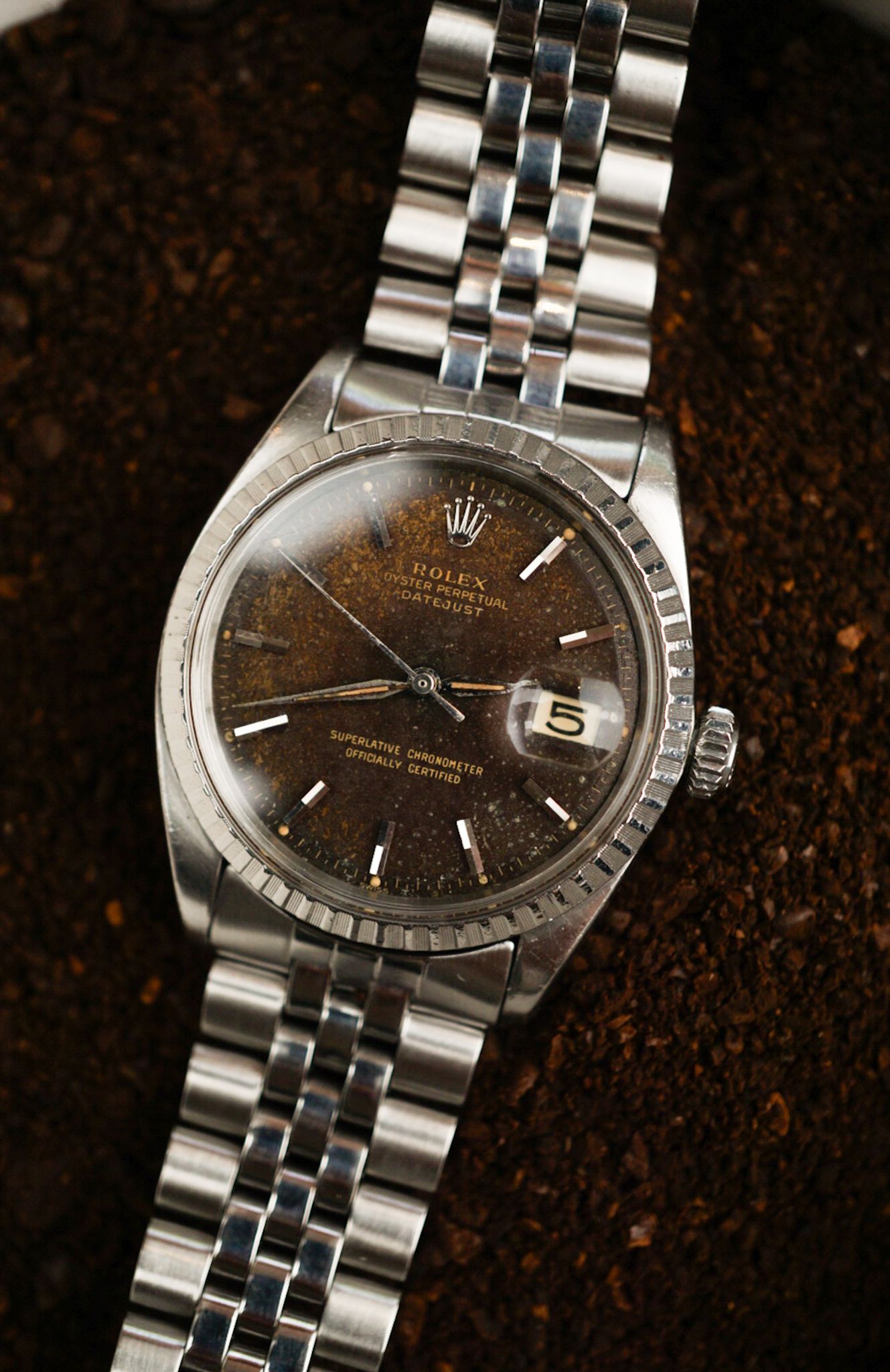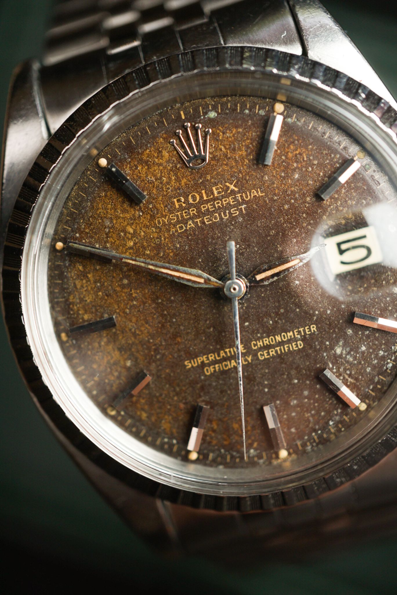The tropical dial is in great condition, with subtle golden patina across the brown surface. The lume plots at 3 and 5 o’clock are missing. The hands show an even, attractive radium tone.
