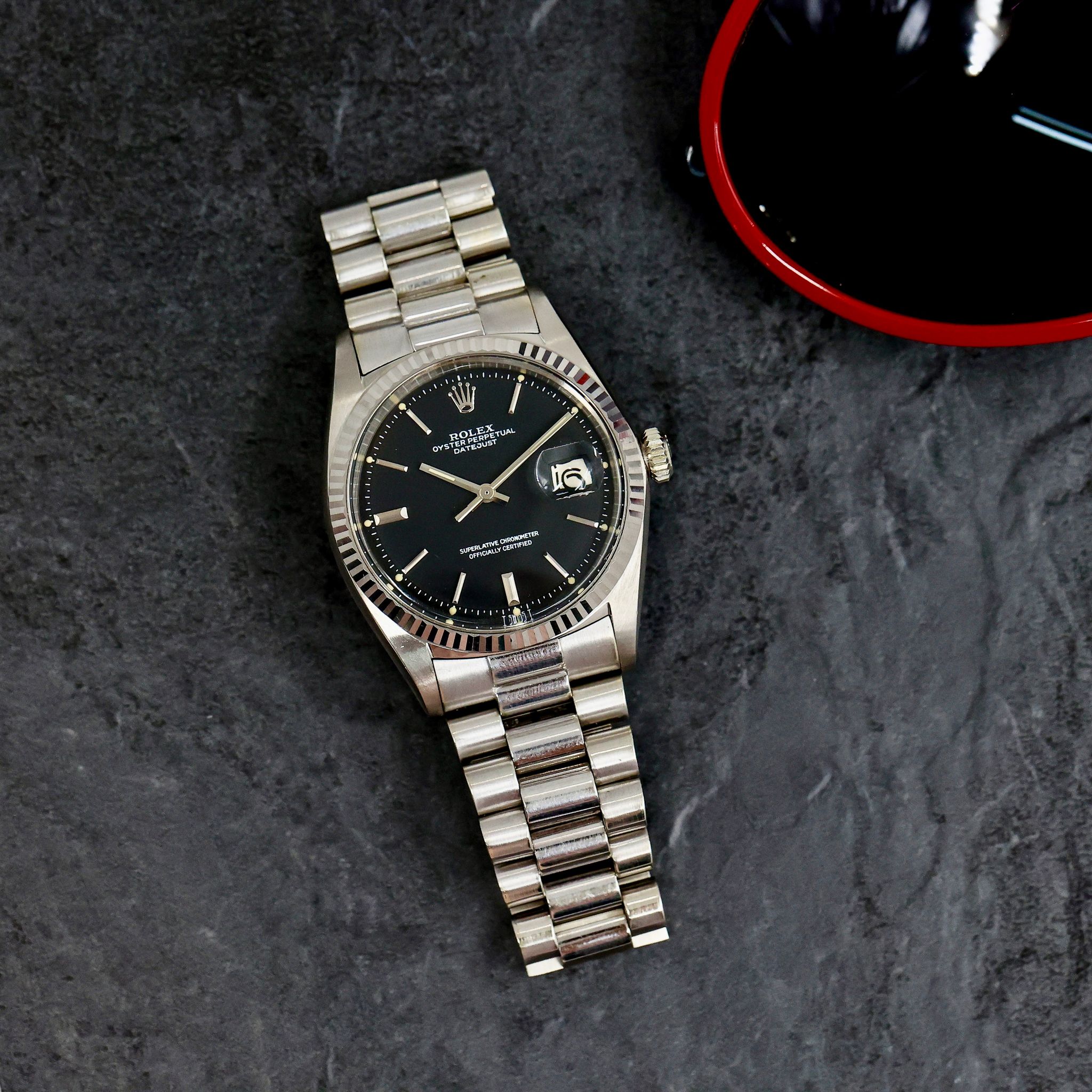Superb and crisp example of the Rolex Datejust 1601 in white gold, boasting a flawless dark grey glossy dial. Paired with a white gold President bracelet, this watch is in excellent condition, with great proportions and minor signs of wear from age. A true stealth-wealth piece.