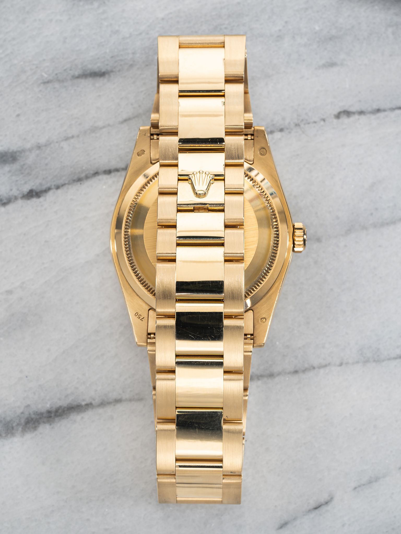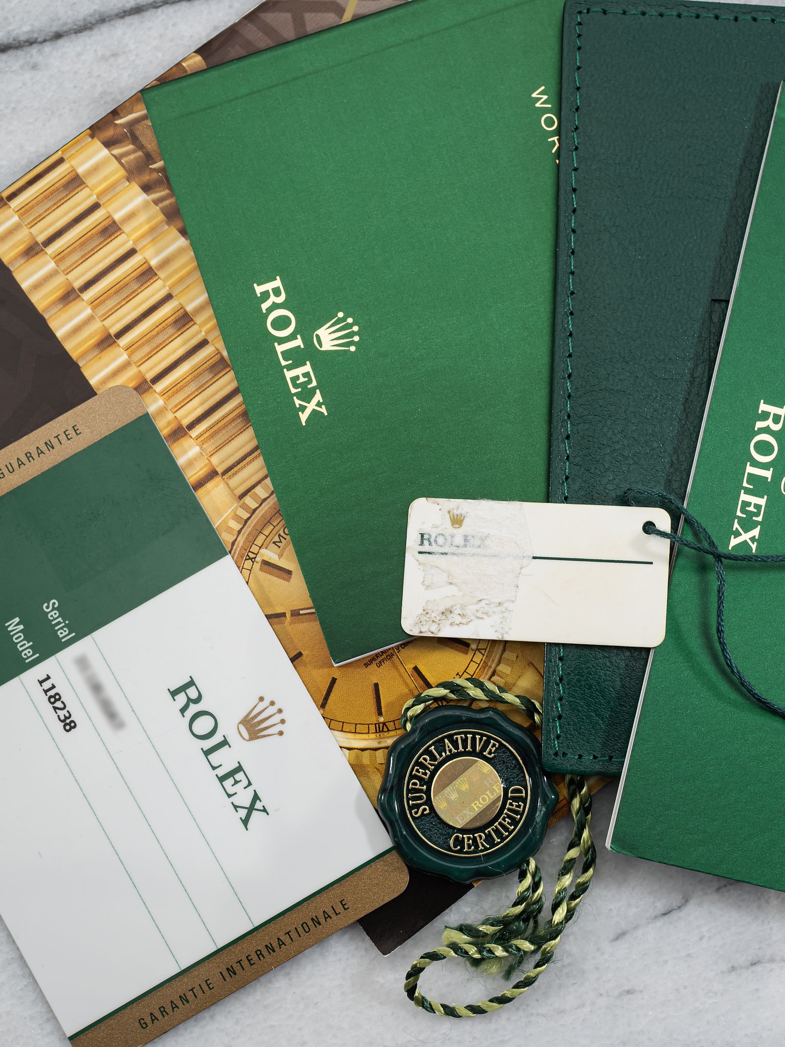 Here's a neo-vintage Rolex Day-Date reference 118238 automatic with a green jade stone dial in 18K yellow gold with its box and papers from the 2000s. Quickset day and date function at 3 and 12 a clock. Measurements include a 36mm case, 20mm lug width, and oyster bracelet fits up to a 7 inch wrist. In great shape. Examples like this are seldom seen! All parts including the crown, dial, movement, and caseback are original.