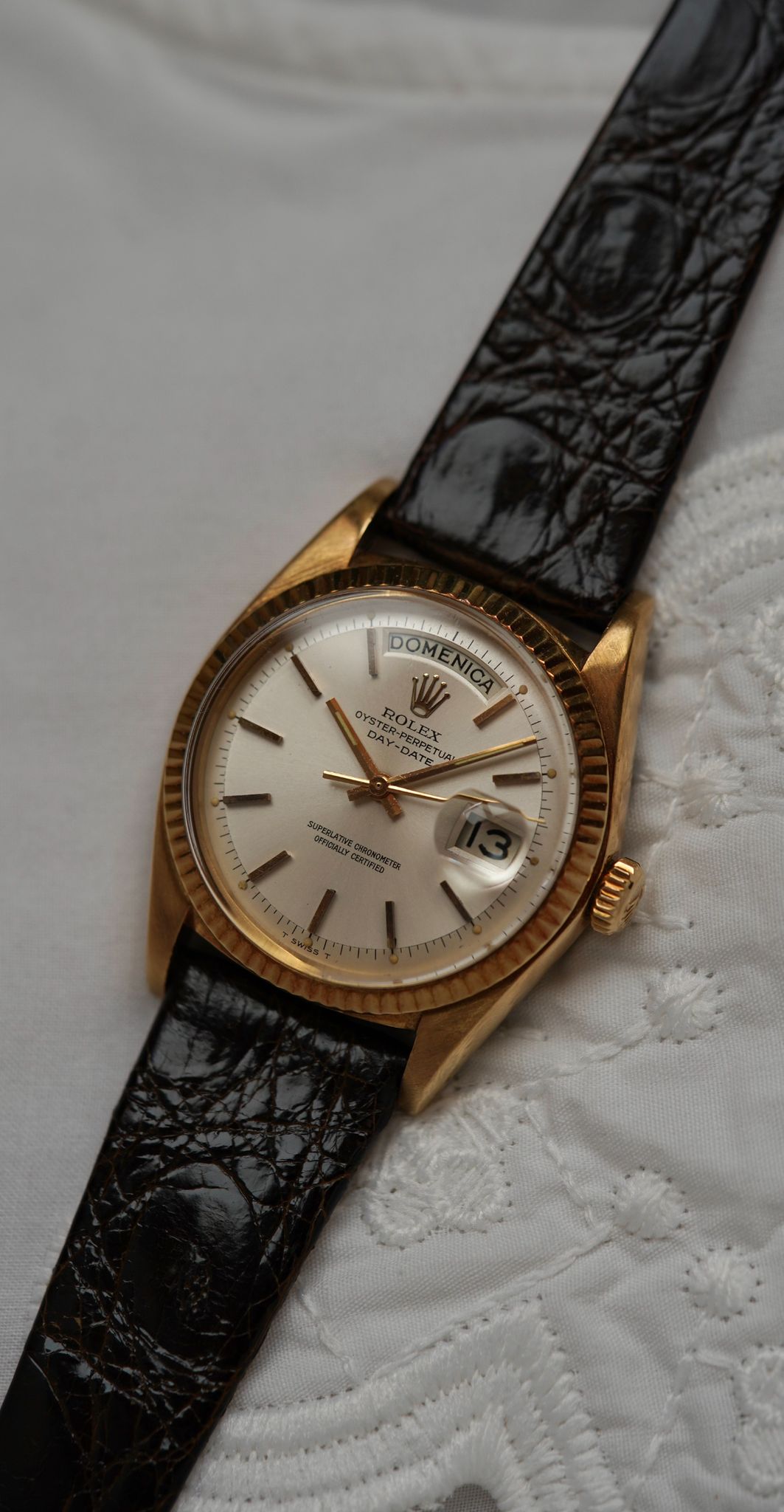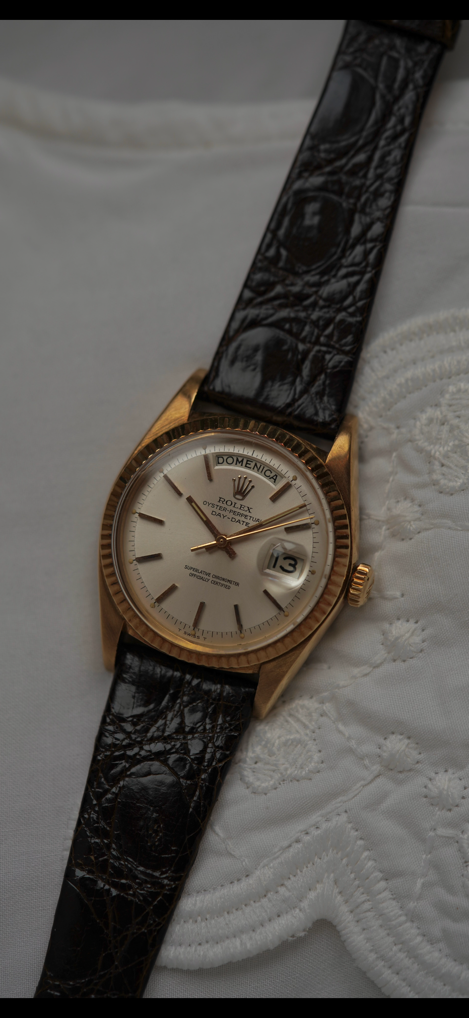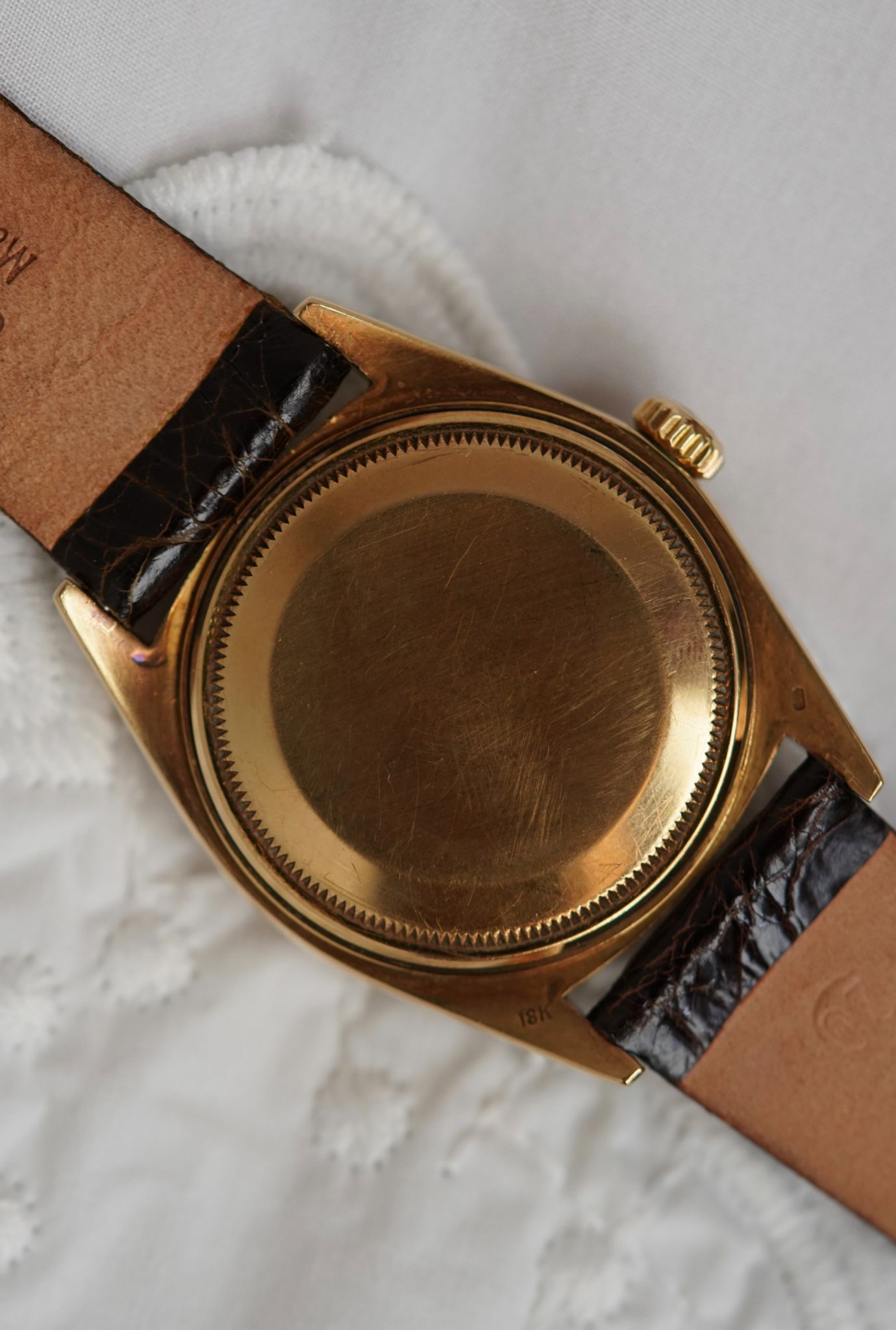 A no excuse, ever green and eternally relevant watch: a 1973, 18k yellow gold Rolex reference 1803. A 36mm Oyster case that is just unbeatable.