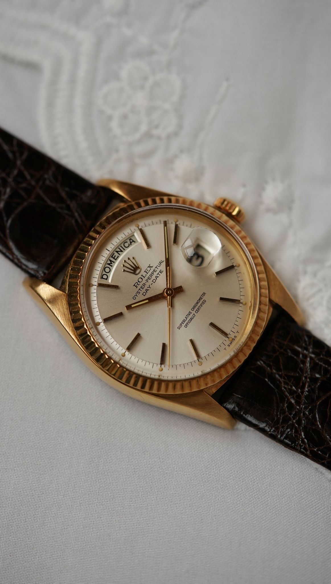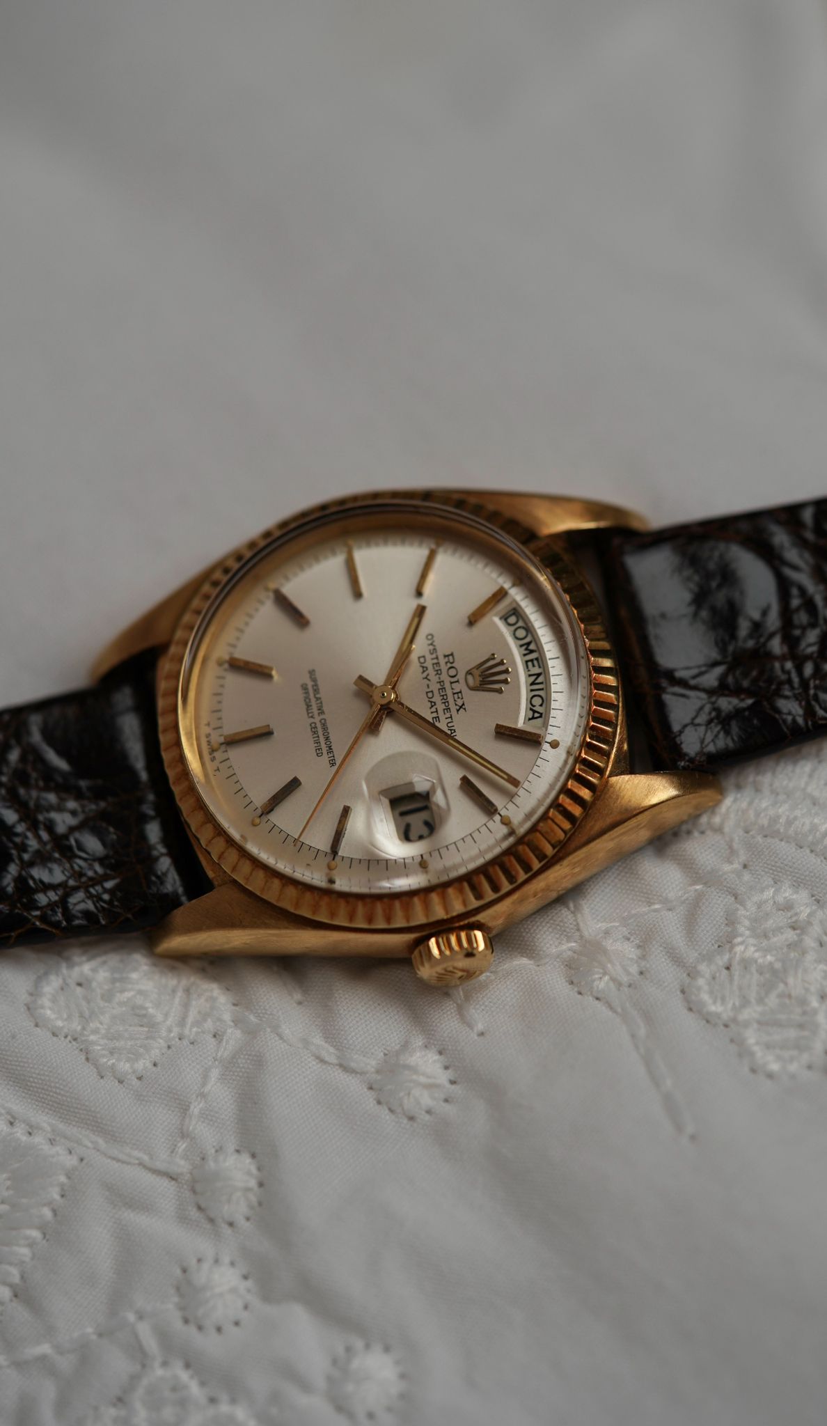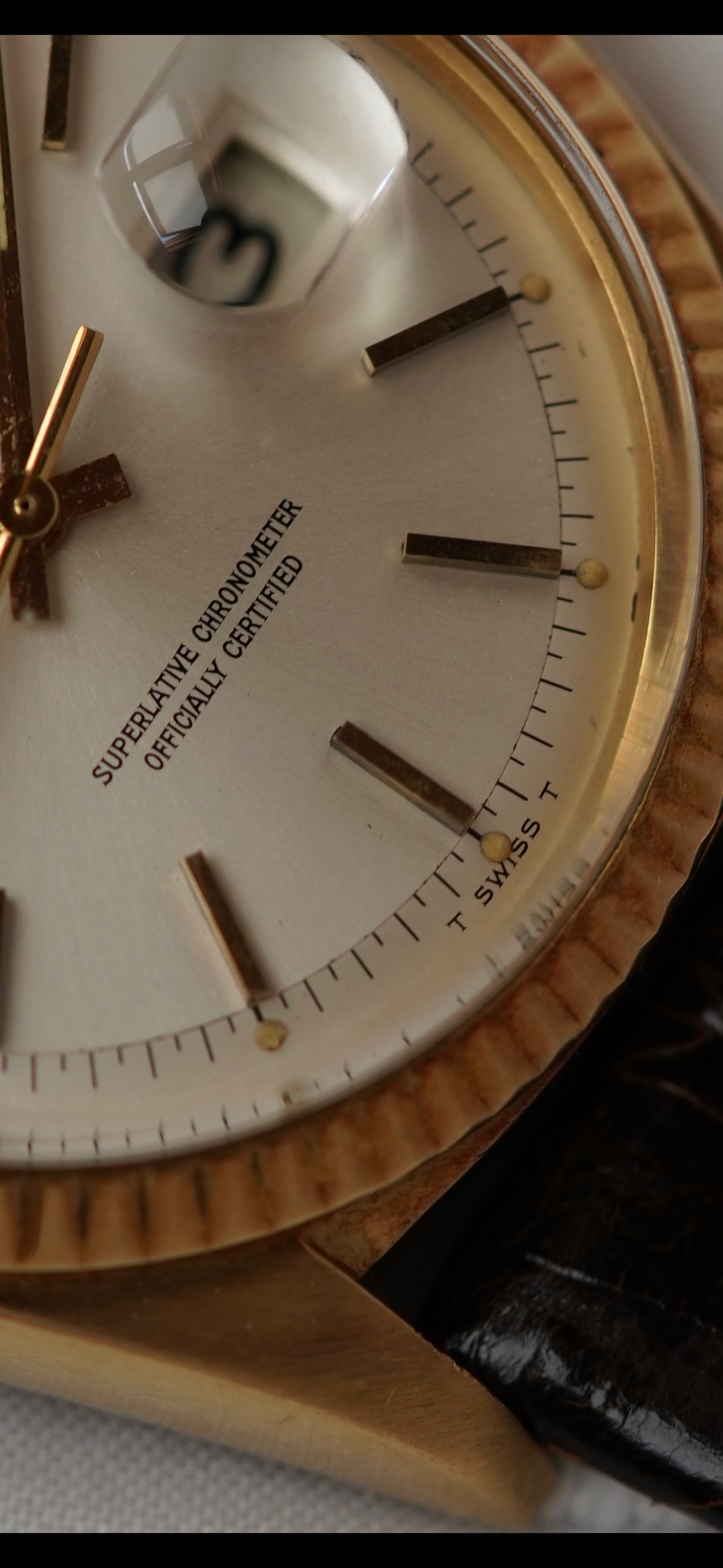 A no excuse, ever green and eternally relevant watch: a 1973, 18k yellow gold Rolex reference 1803. A 36mm Oyster case that is just unbeatable.