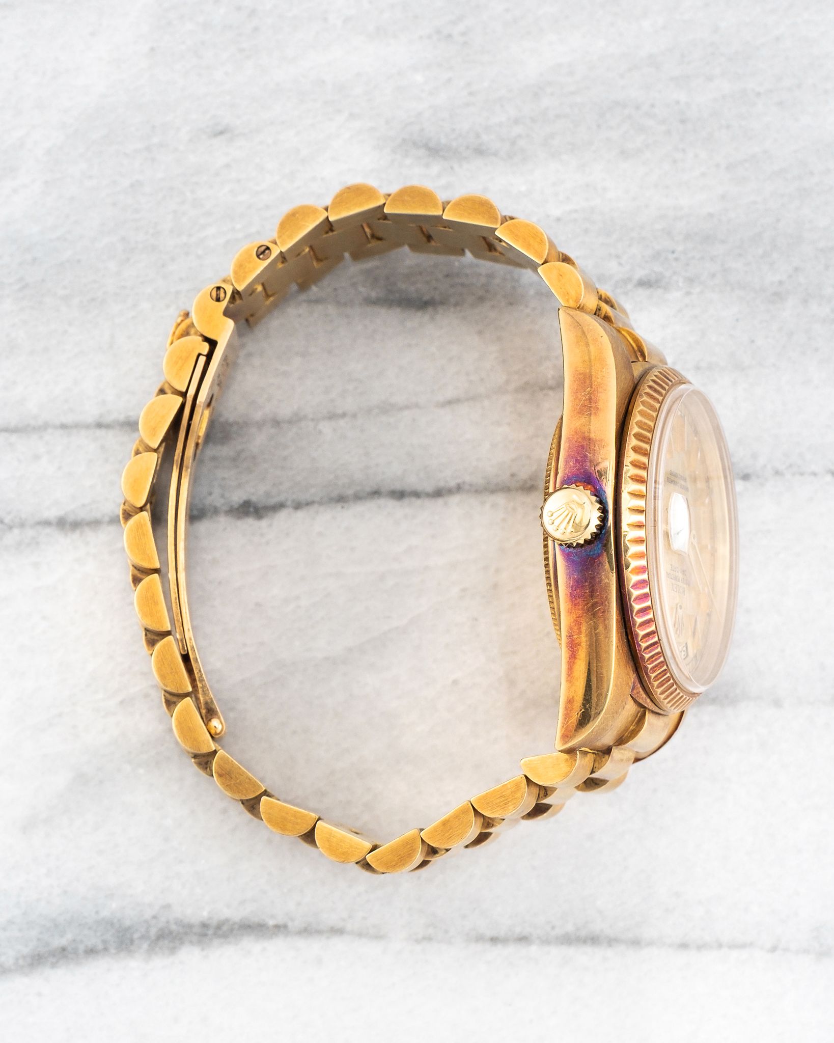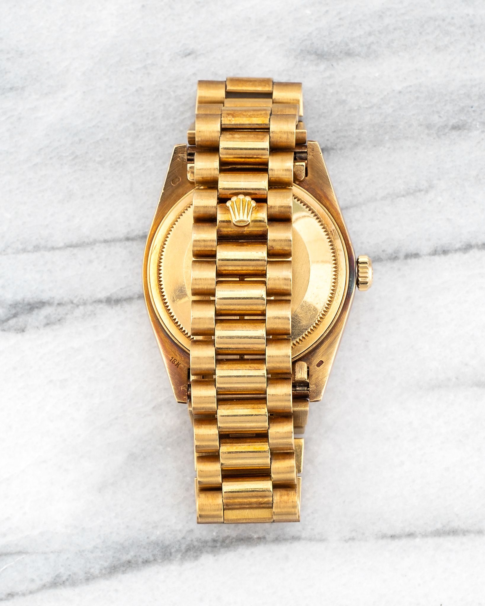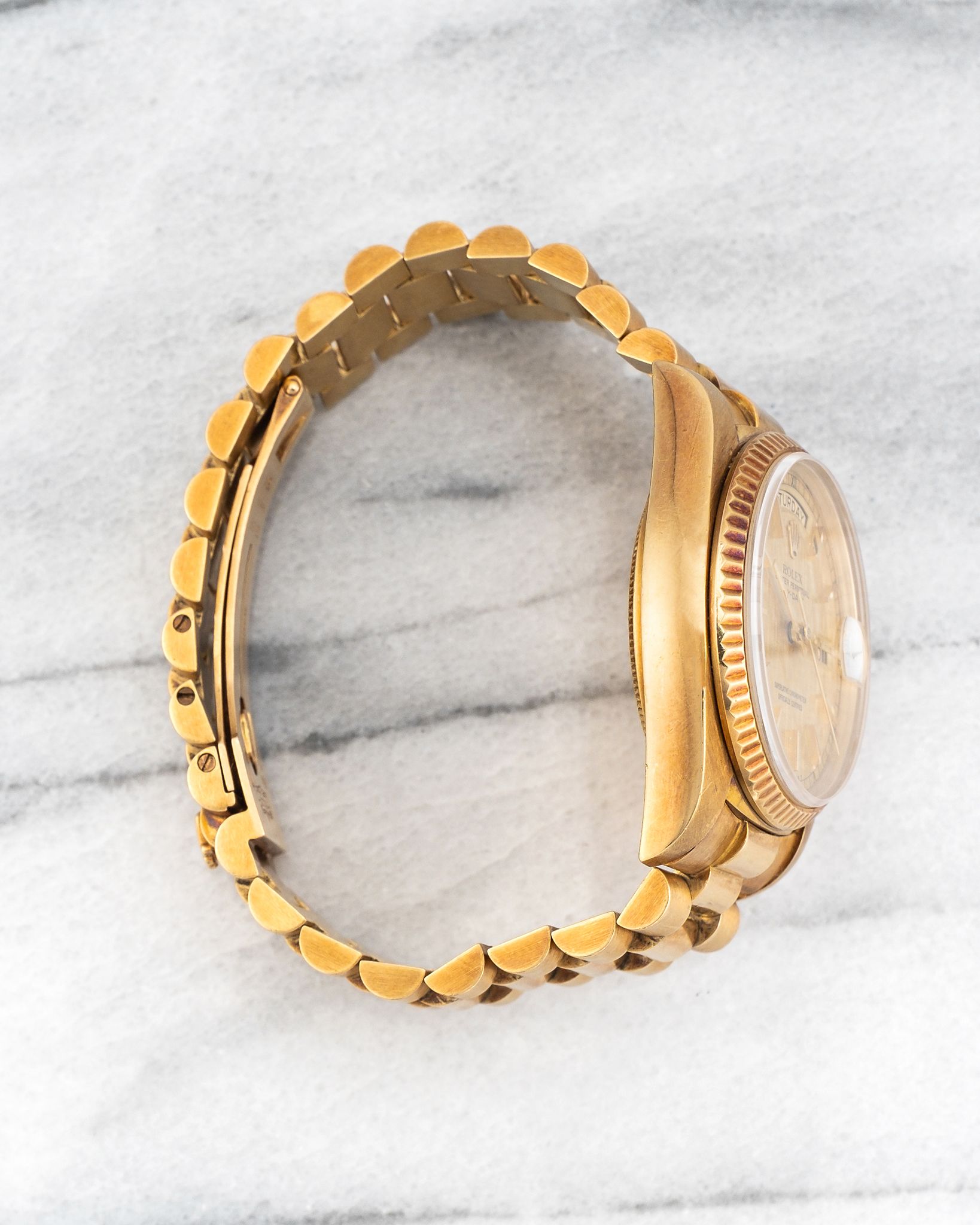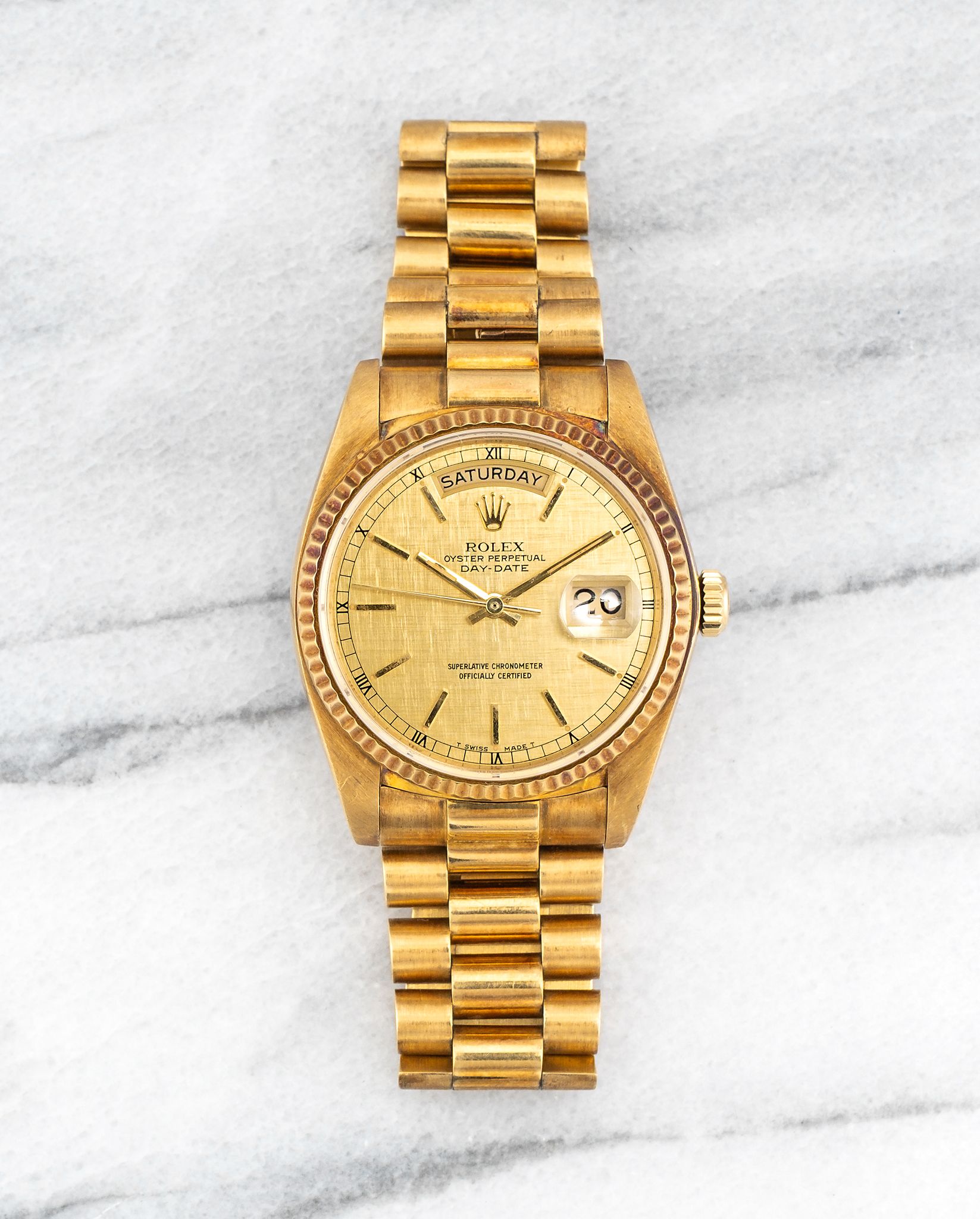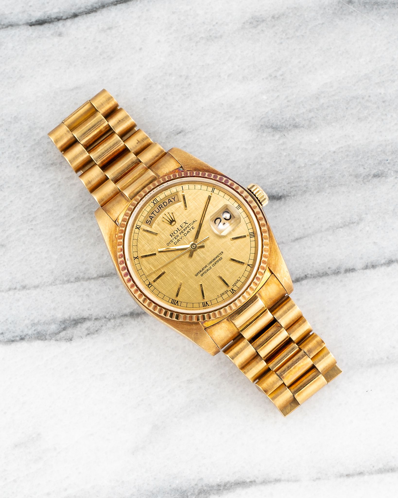 Here's a Rolex Day Date reference 18038 automatic, single quick with a champagne linen dial from the 1980s. Measurements include a 36mm case and a 20mm lug width. Bracelet fits up to a 7 inch wrist. There is purple oxidation on the sides of the case. All parts including the crown, dial, movement, and caseback are original. Ready to wear