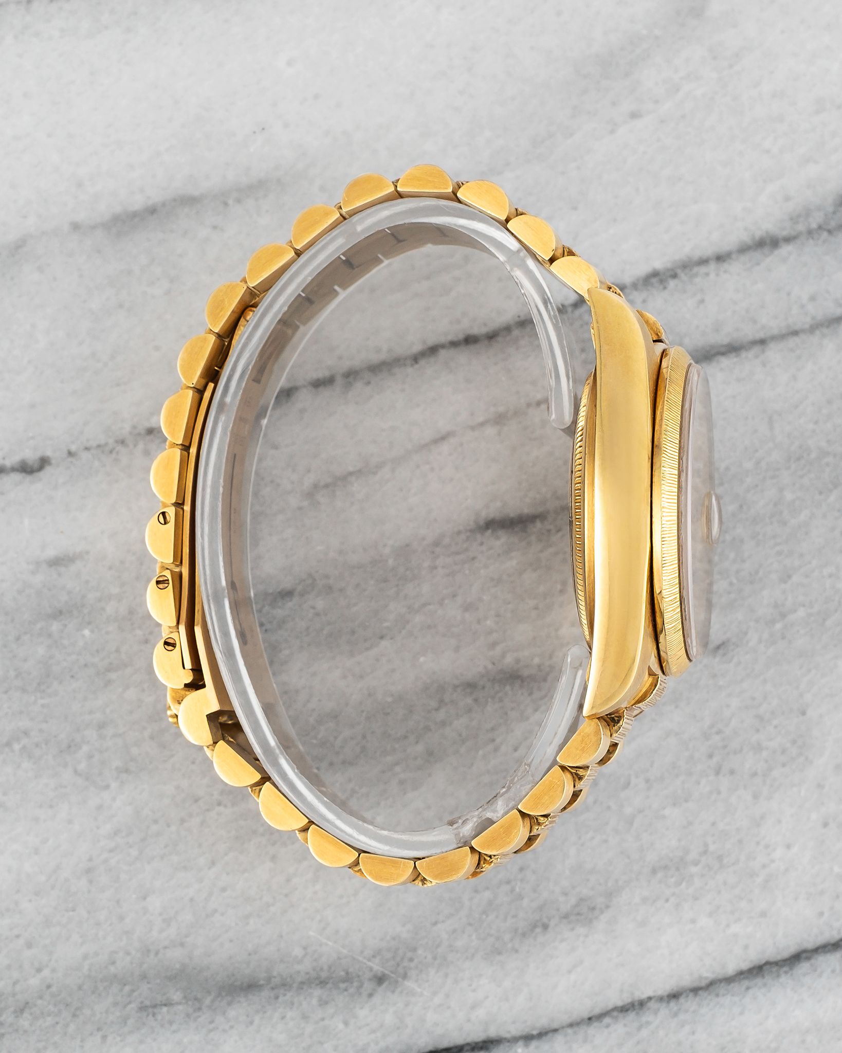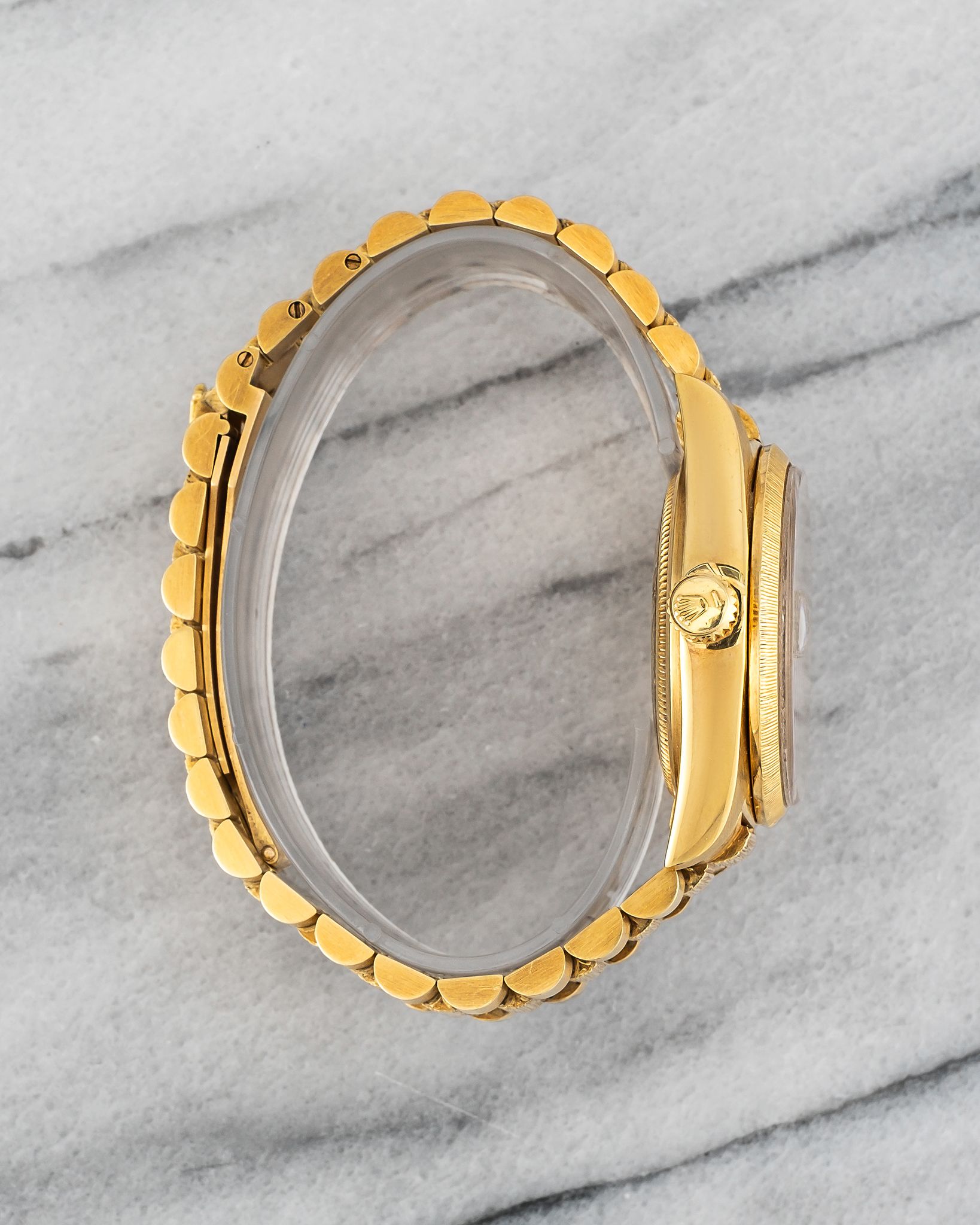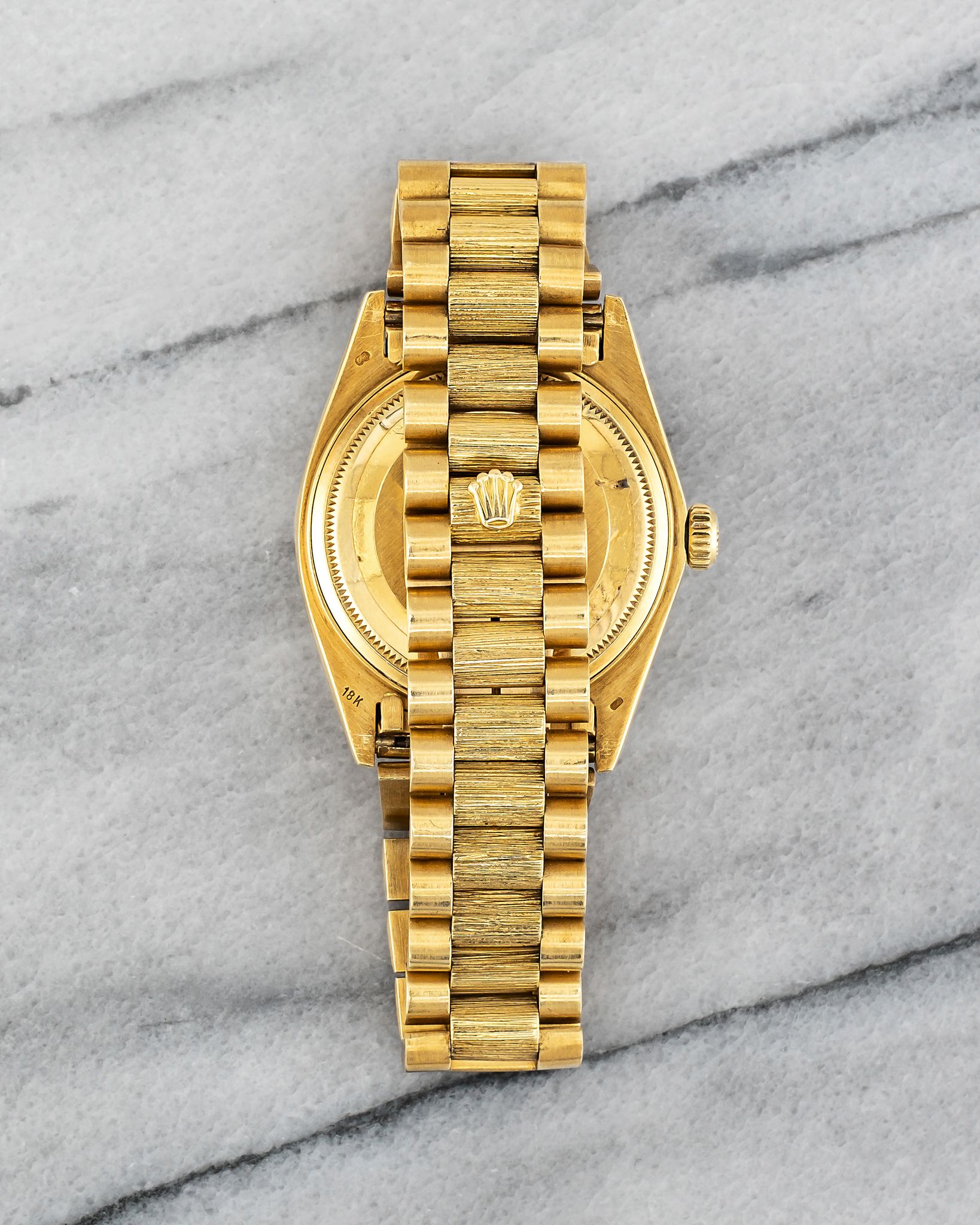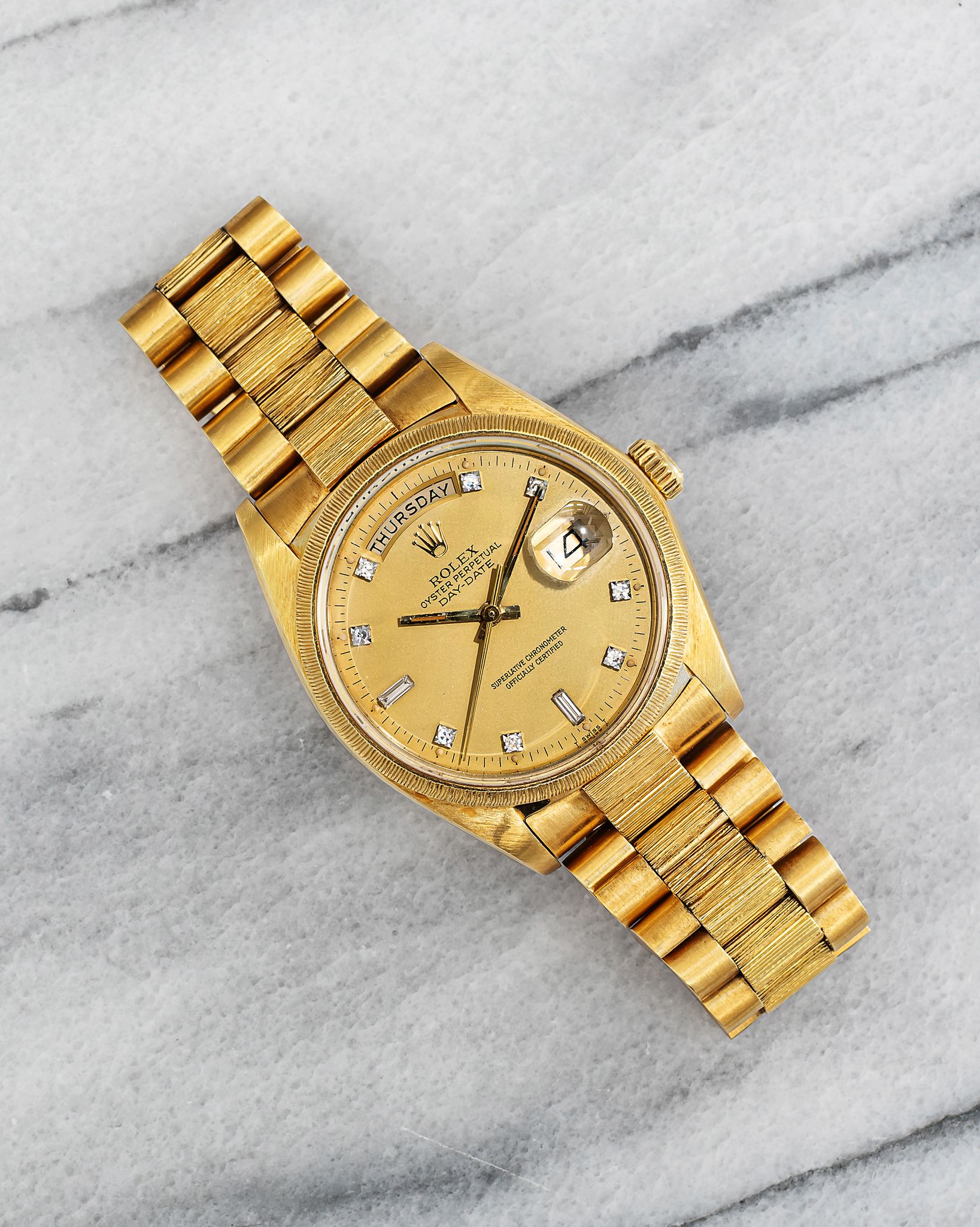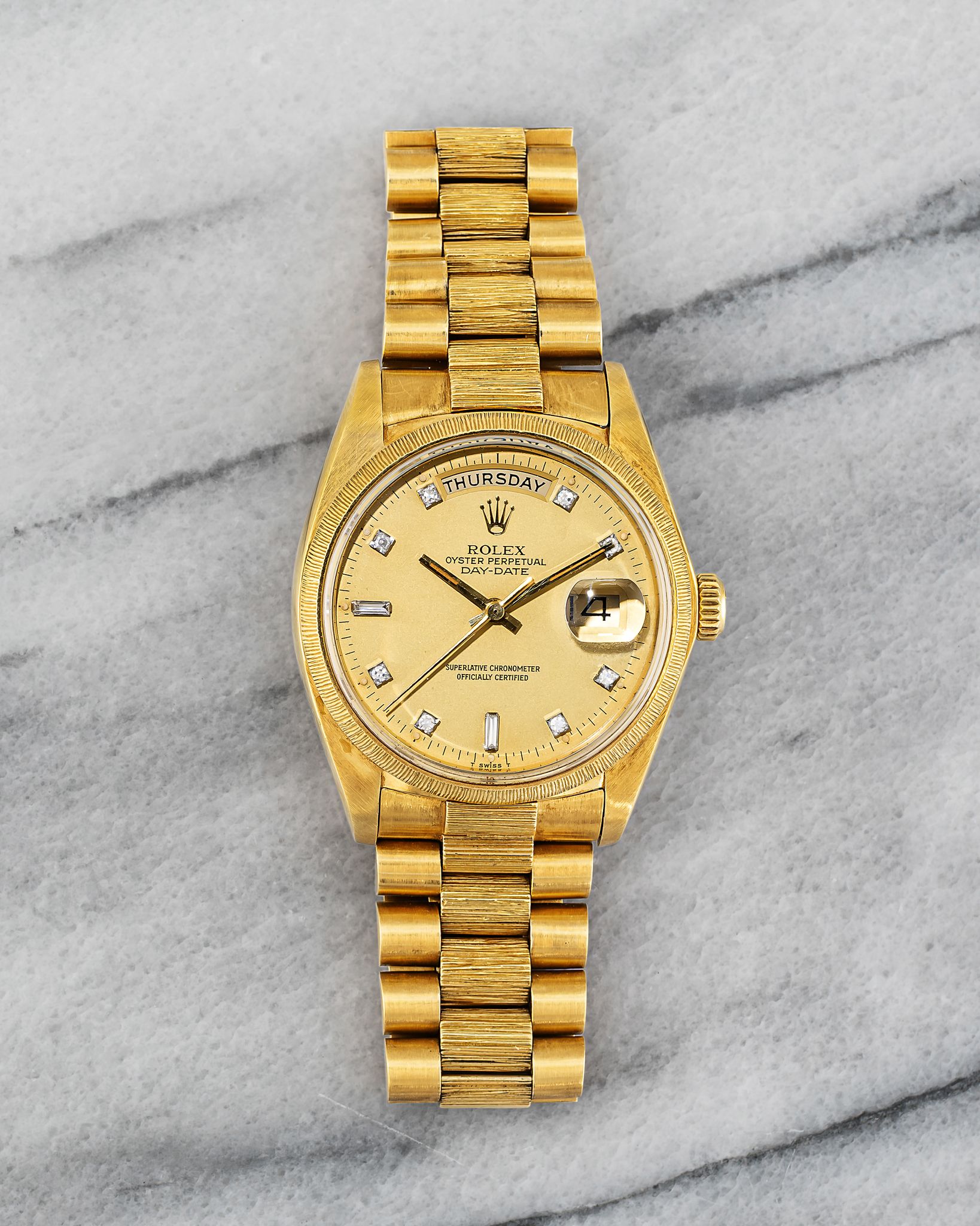 Here's a Rolex Day Date reference 18078 with a lemon diamond dial in 18K yellow gold from the 1980s. Measurements include a 36mm case and 20mm lug width. Bracelet fits up to a 7.25 inch wrist. Bark finish on both the bezel and bracelet. Unpolished lugs, case, and bracelet. Tight bracelet. Unusual to find examples like this. Ready to wear. All parts including the crown, dial, movement, and caseback are original.