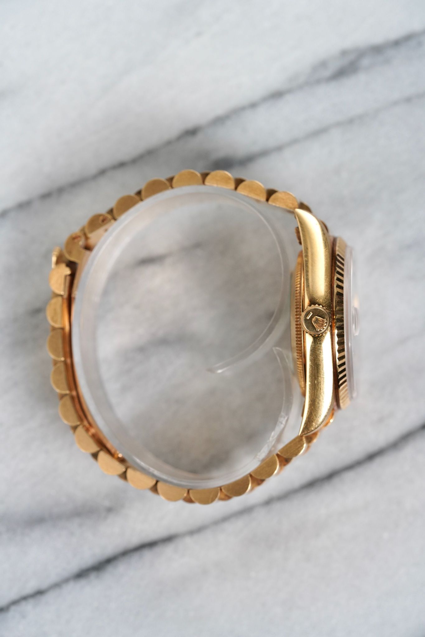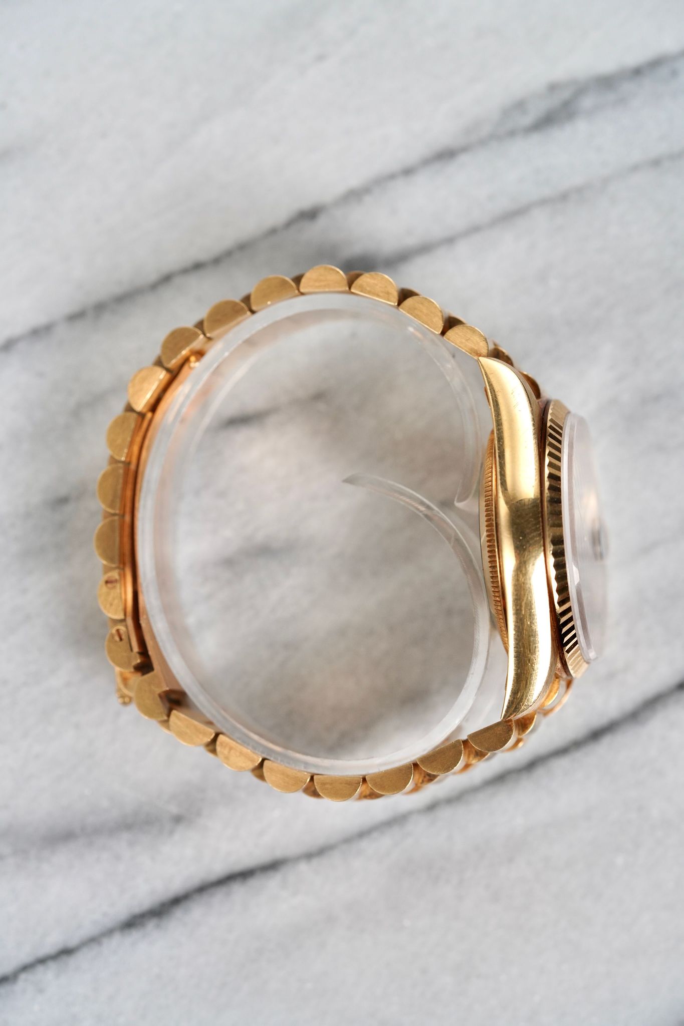 Here’s a Rolex Day-Date reference 18238 in 18K yellow gold with a blue dial from 1989 (L serial) that comes with its original box and papers. Measurements include a 36mm case and 20mm lug width. Fits up to a 7 inch wrist. Comes with its handkerchief Great condition on the lugs and case. Fitted on its President bracelet with hidden clasp. Original case, dial, and movement. Fully functional and keeping time.