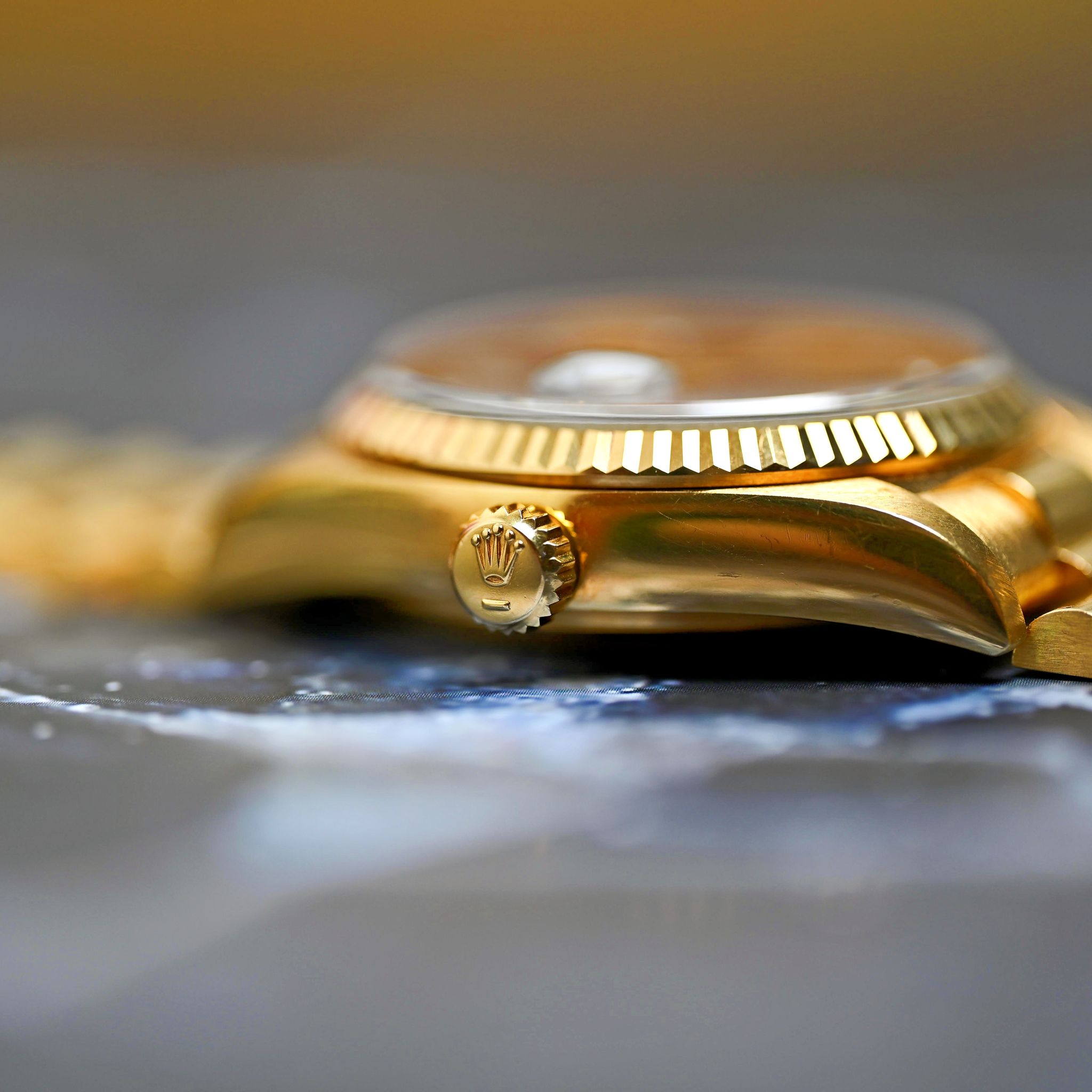 The Day-Date 18038, crafted in 18K yellow gold, is a true icon in horological history. Introduced in the early 1980s, it showcases a stunning ombré blue dial that transitions from deep azure to a lighter shade, creating a mesmerizing effect. The diamond indexes enhance its luxurious appeal, offering a brilliant contrast against the rich gold case.