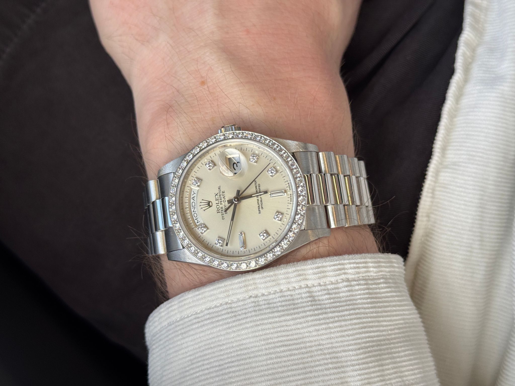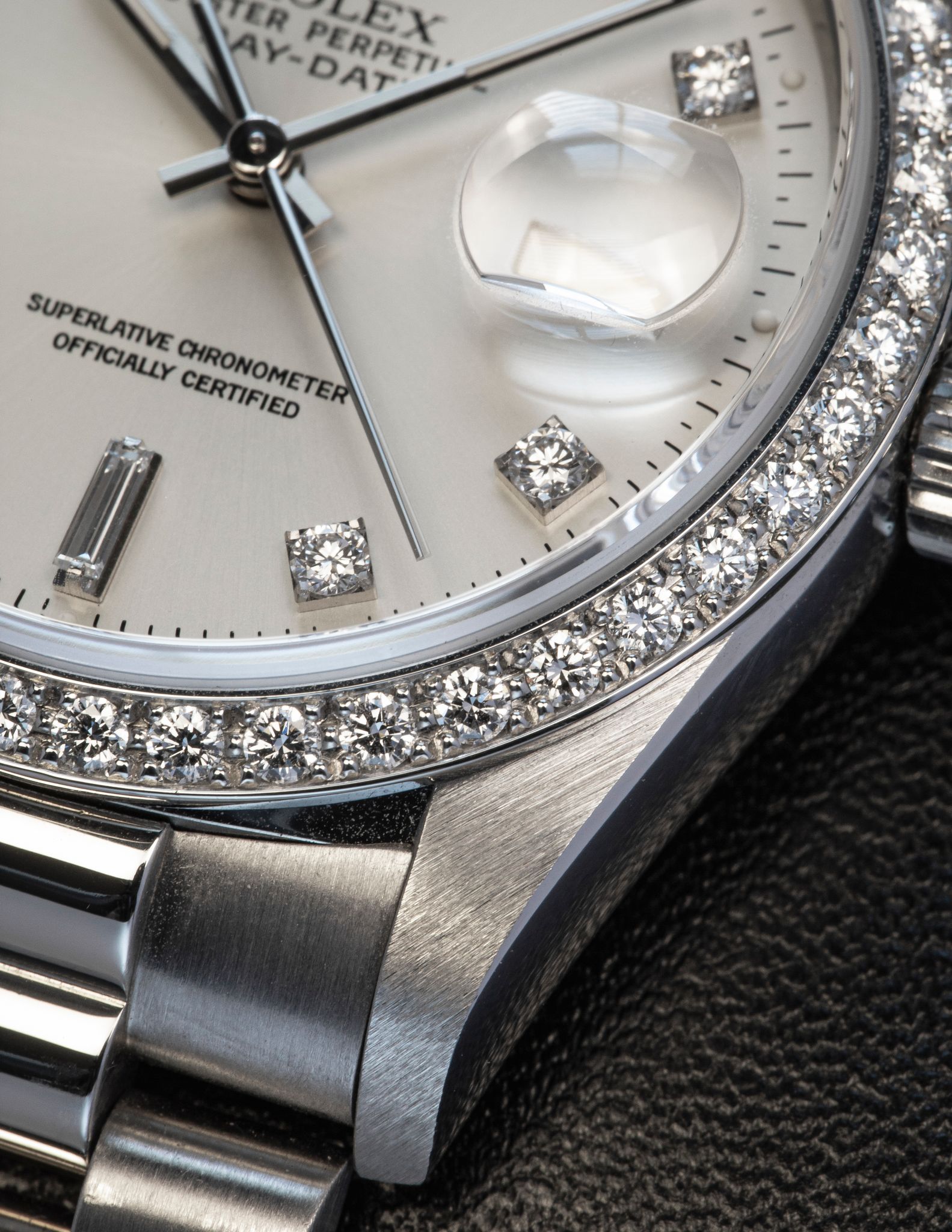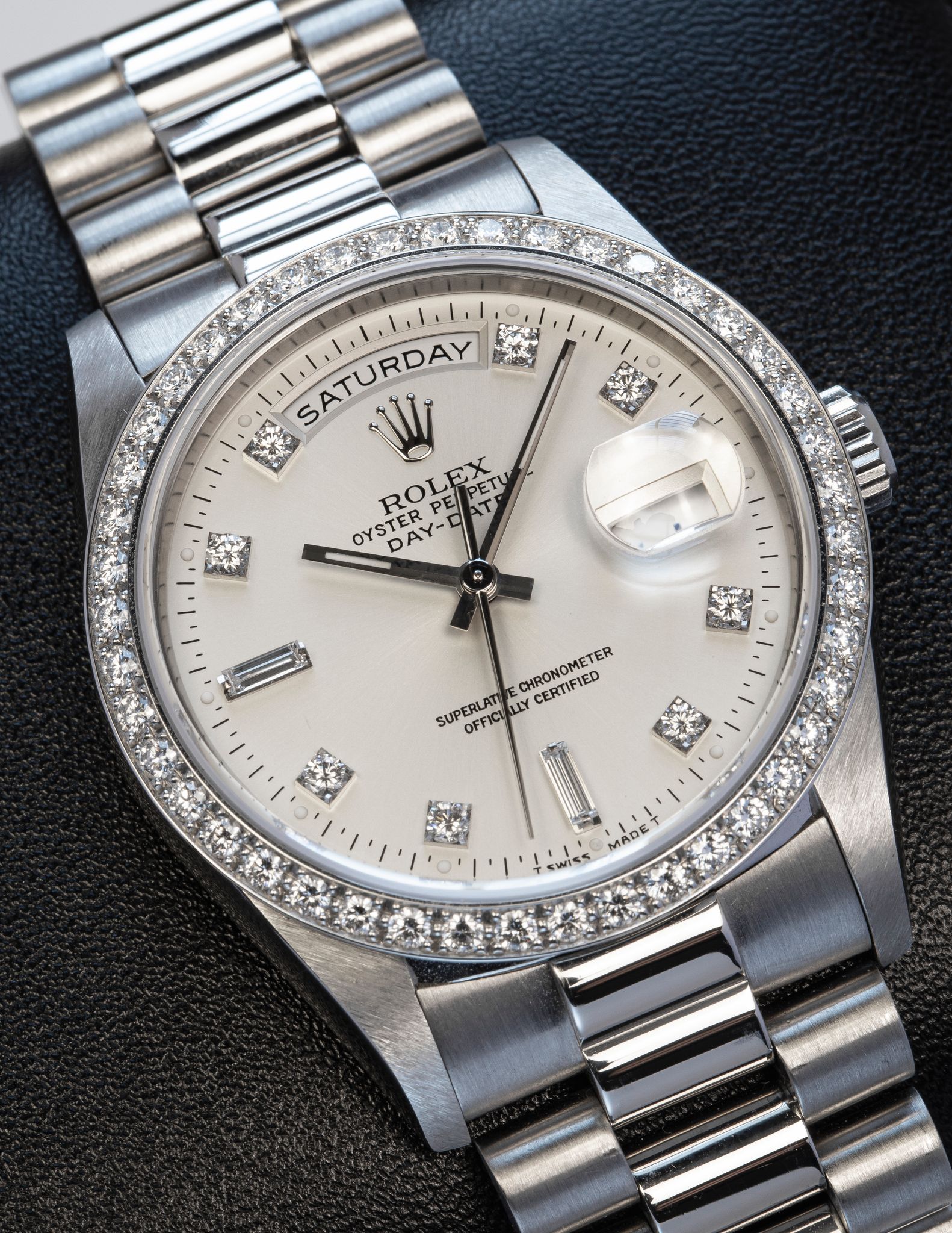 Hewn in the noblest of metals, Platinum - with Factory set diamond bezel and the rarer large diamond index dial.
