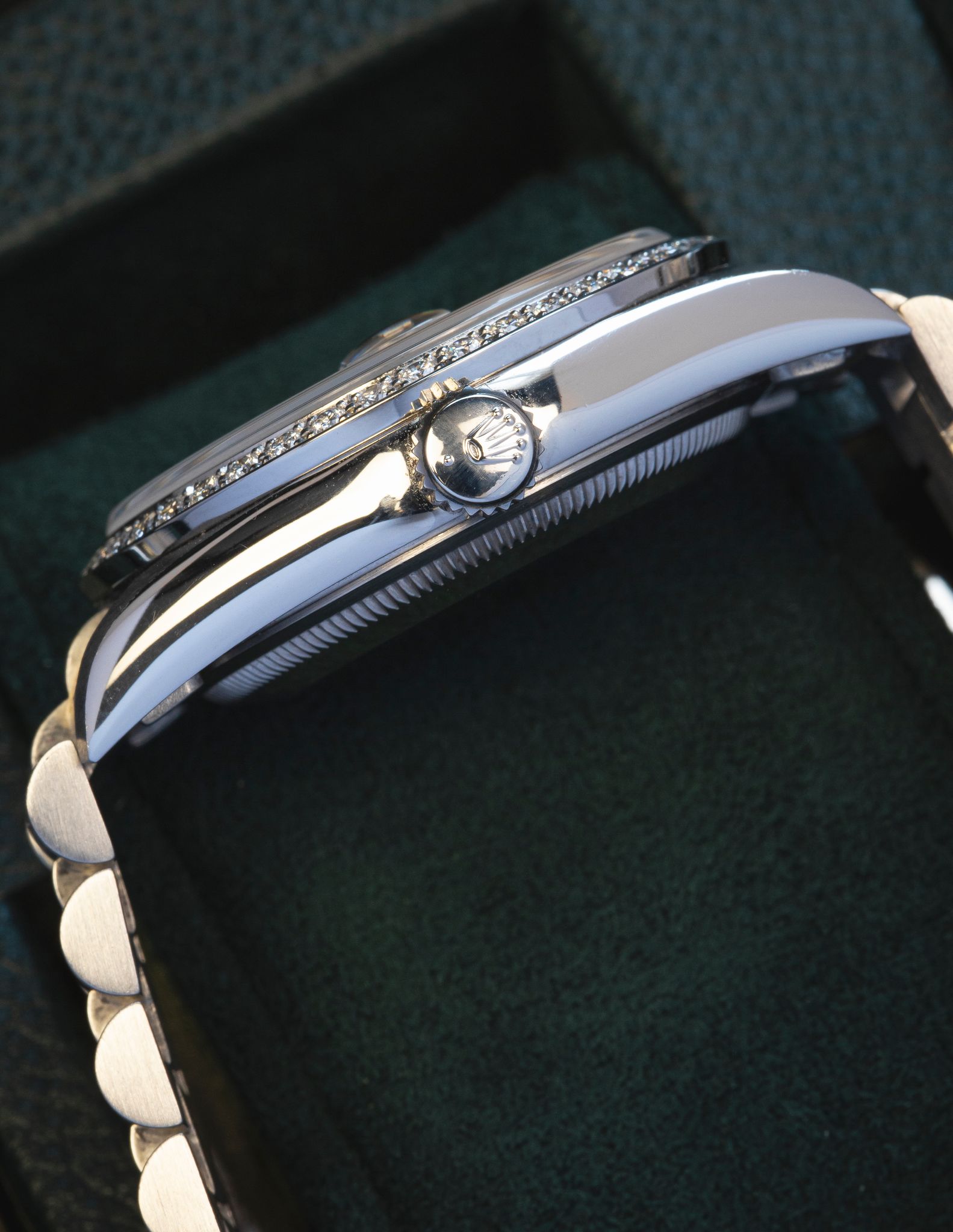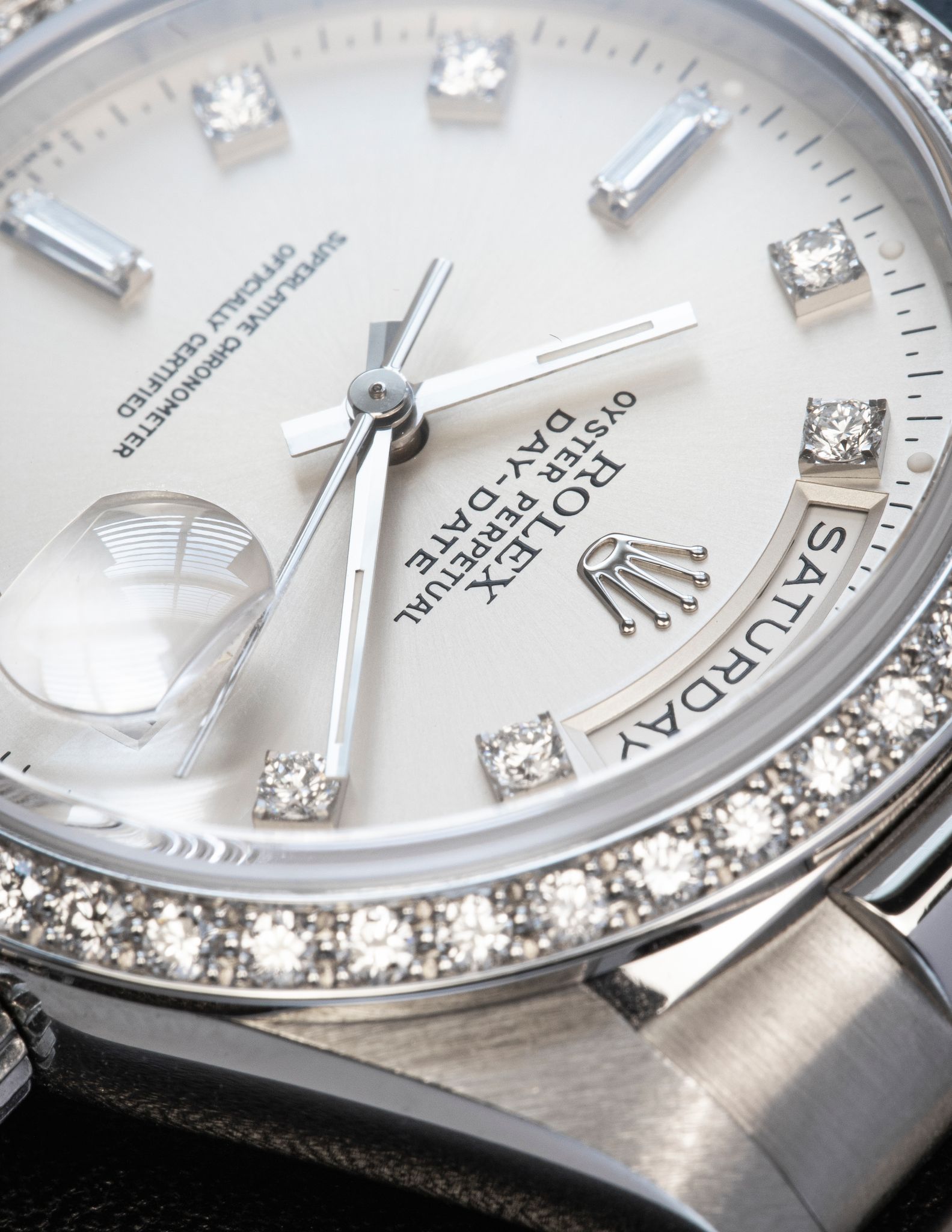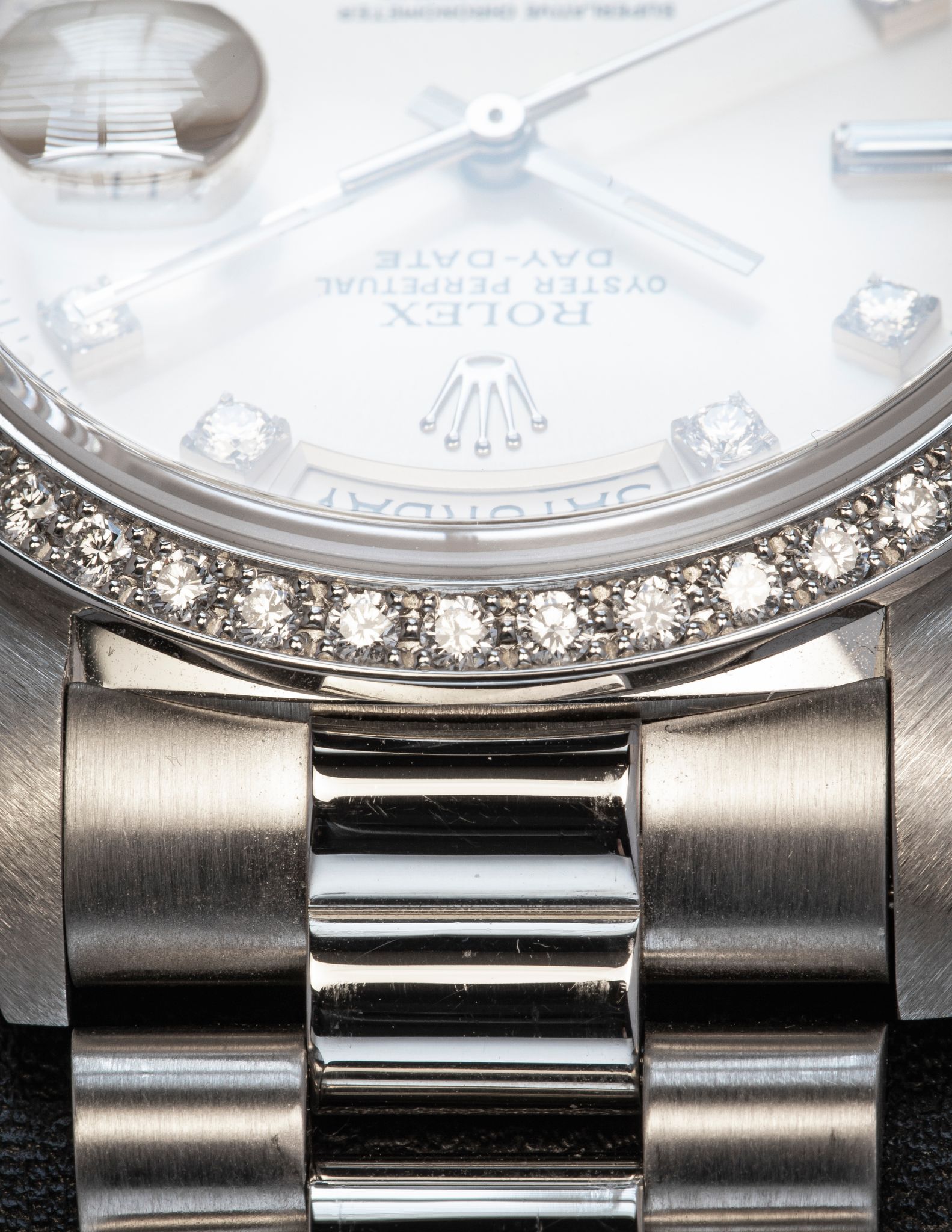 Hewn in the noblest of metals, Platinum - with Factory set diamond bezel and the rarer large diamond index dial.
