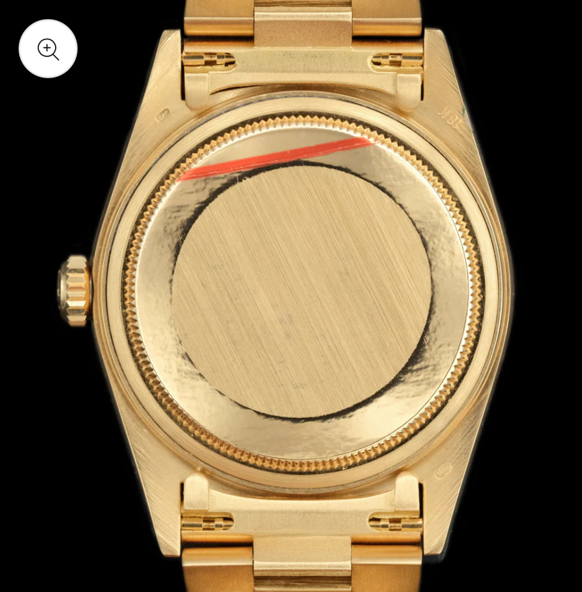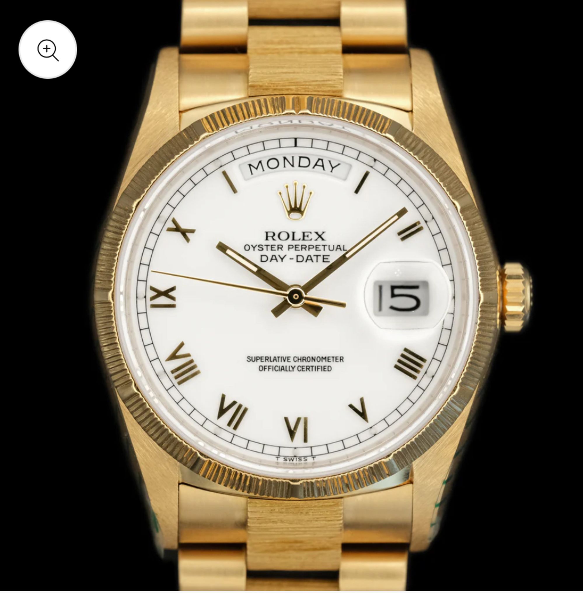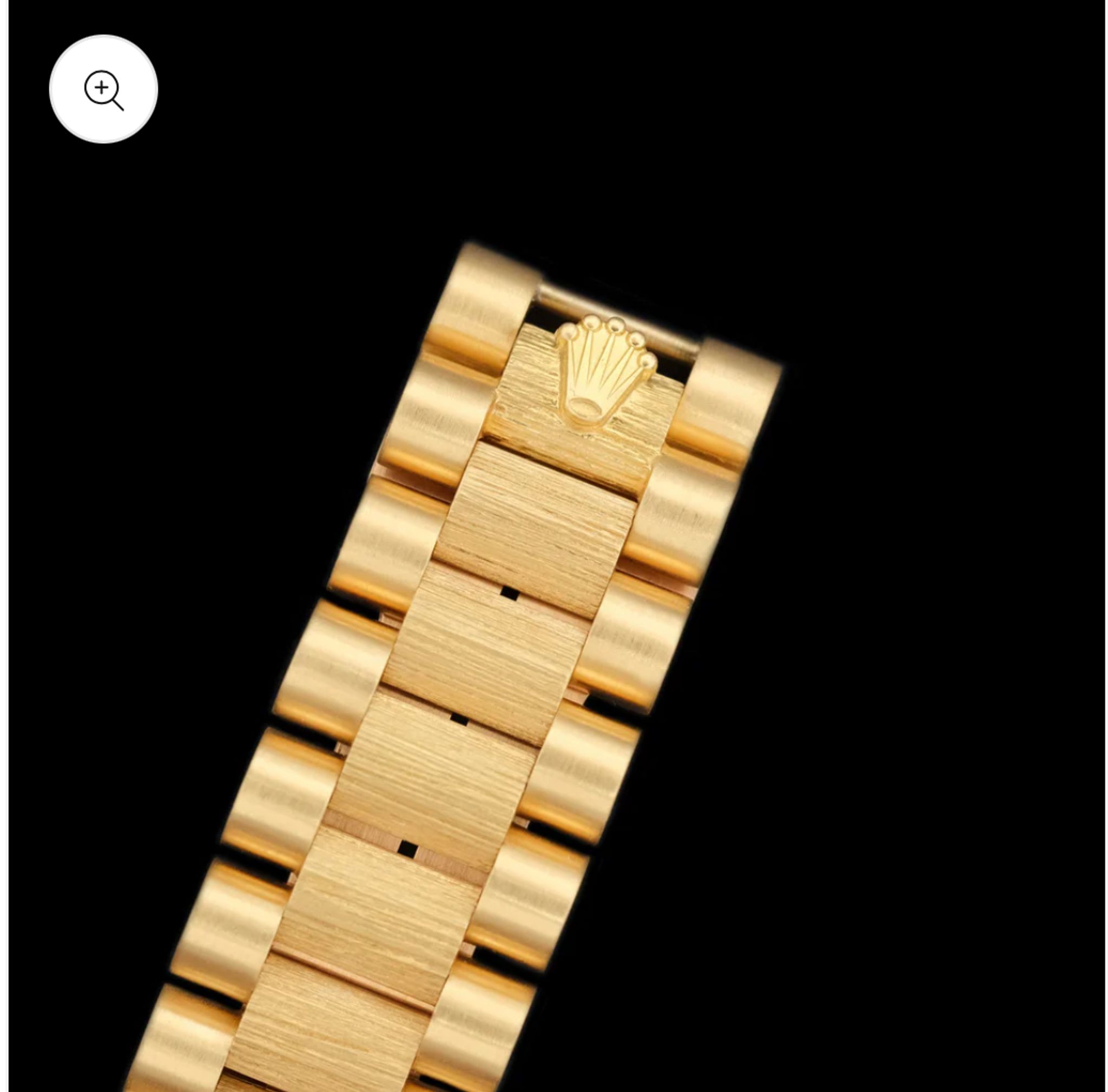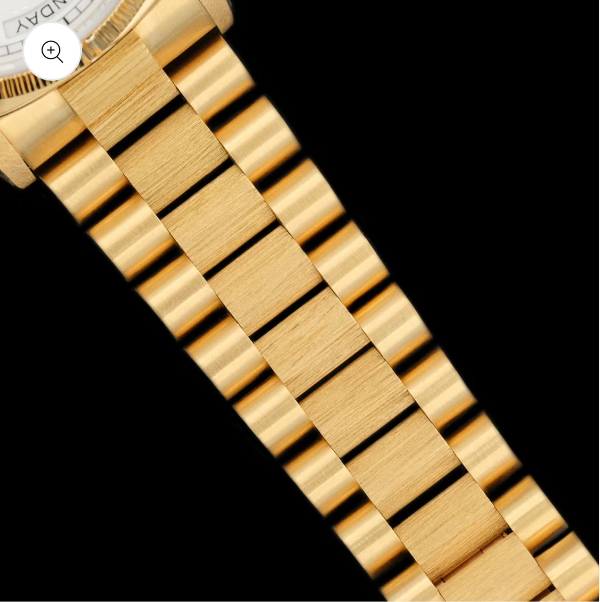 ark finish refers to a decorative, engraving technique that is applied to the surface of gold. It mirrors the texture of bark from a tree and was very popular during the '70s and '80s. The reference 18078 has a bark finish on the bezel and centre links of the bracelet. This 18078 has a white dial with an 18k yellow-gold applied Stick Roman index. The watch has an 18k yellow-gold bezel with bark finish, an 18k yellow-gold case and a President bracelet with bark finished centre links. The watch dates back to 1988 and runs on the calibre 3055 meaning it has a single quickset function. The 180XX-series, that were introduced in 1978, already have sapphire crystal and a flat dial providing the watch with a modern and fresh look.