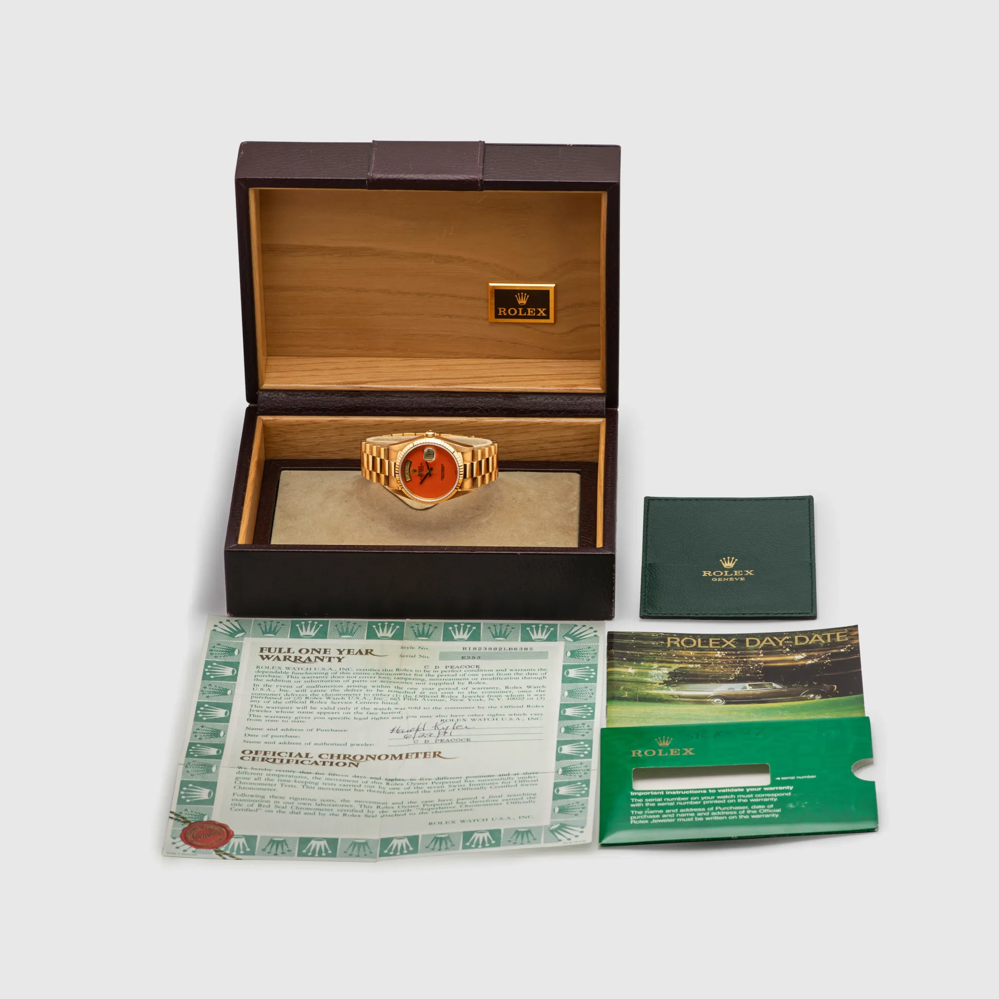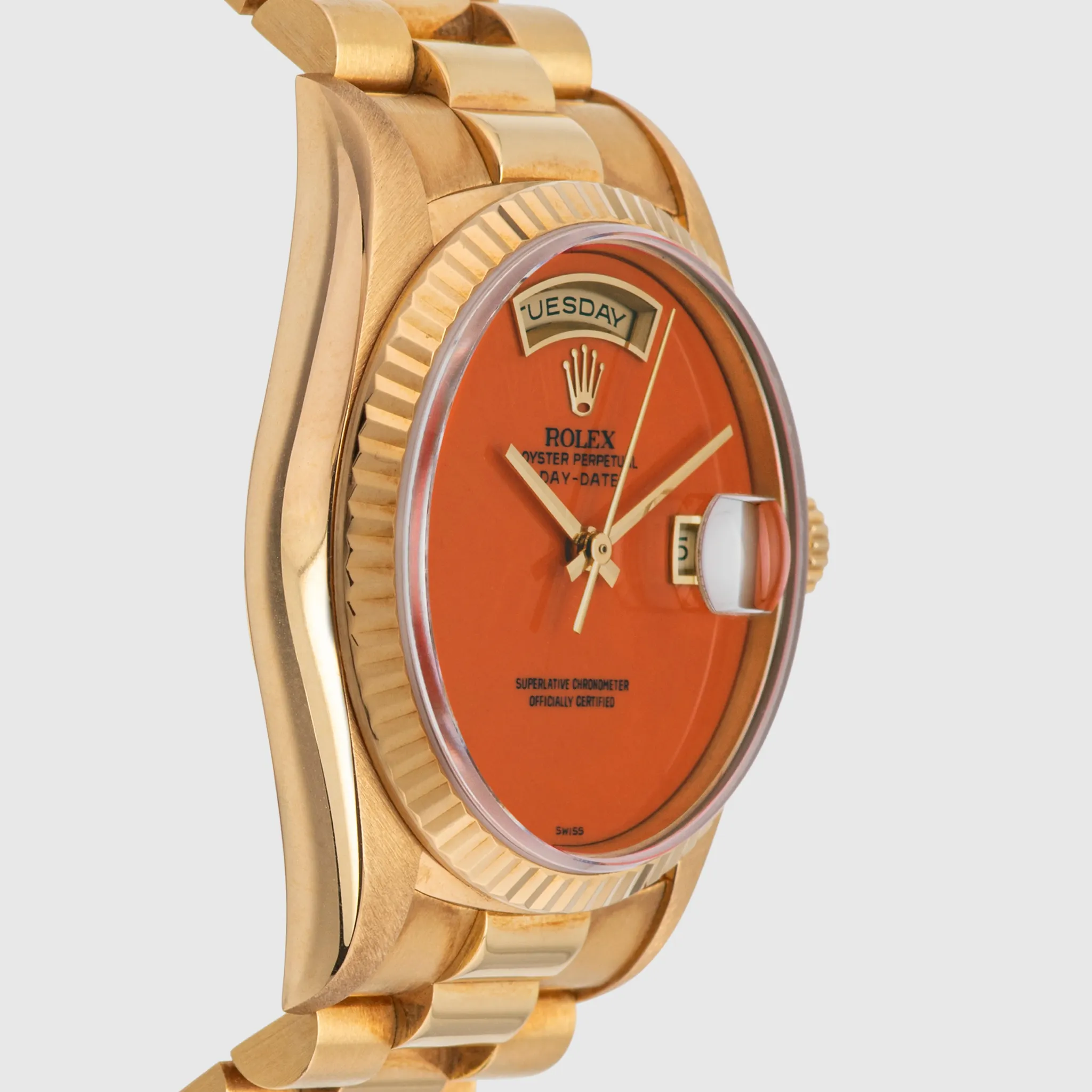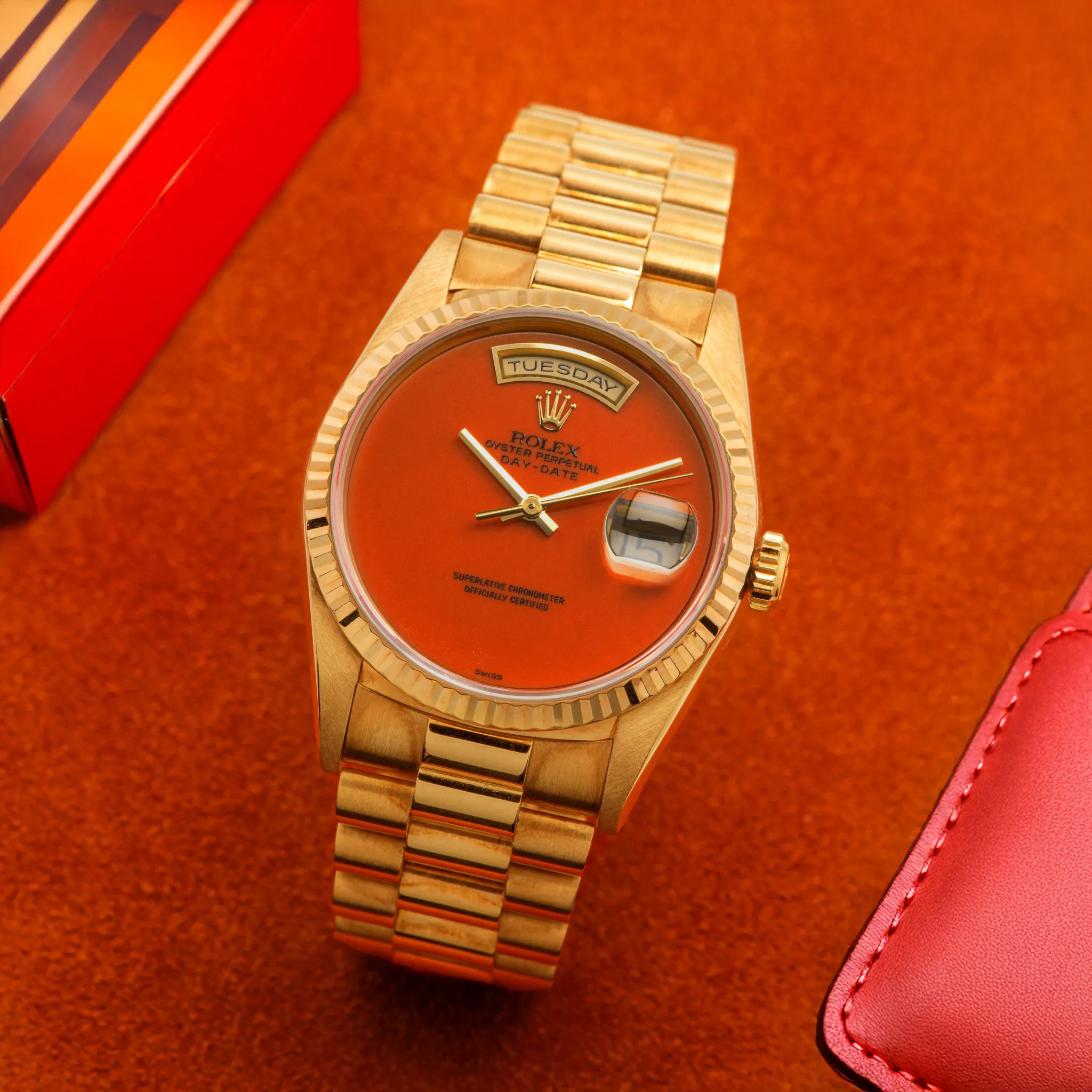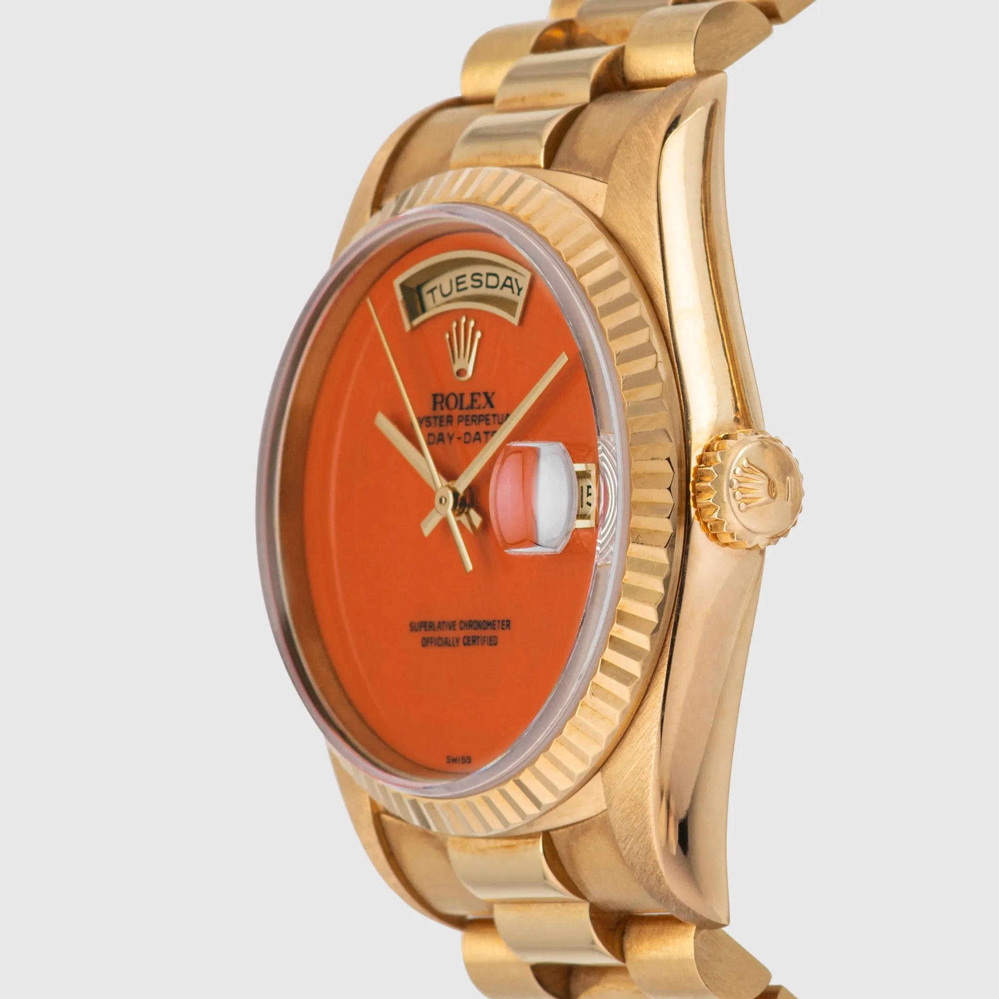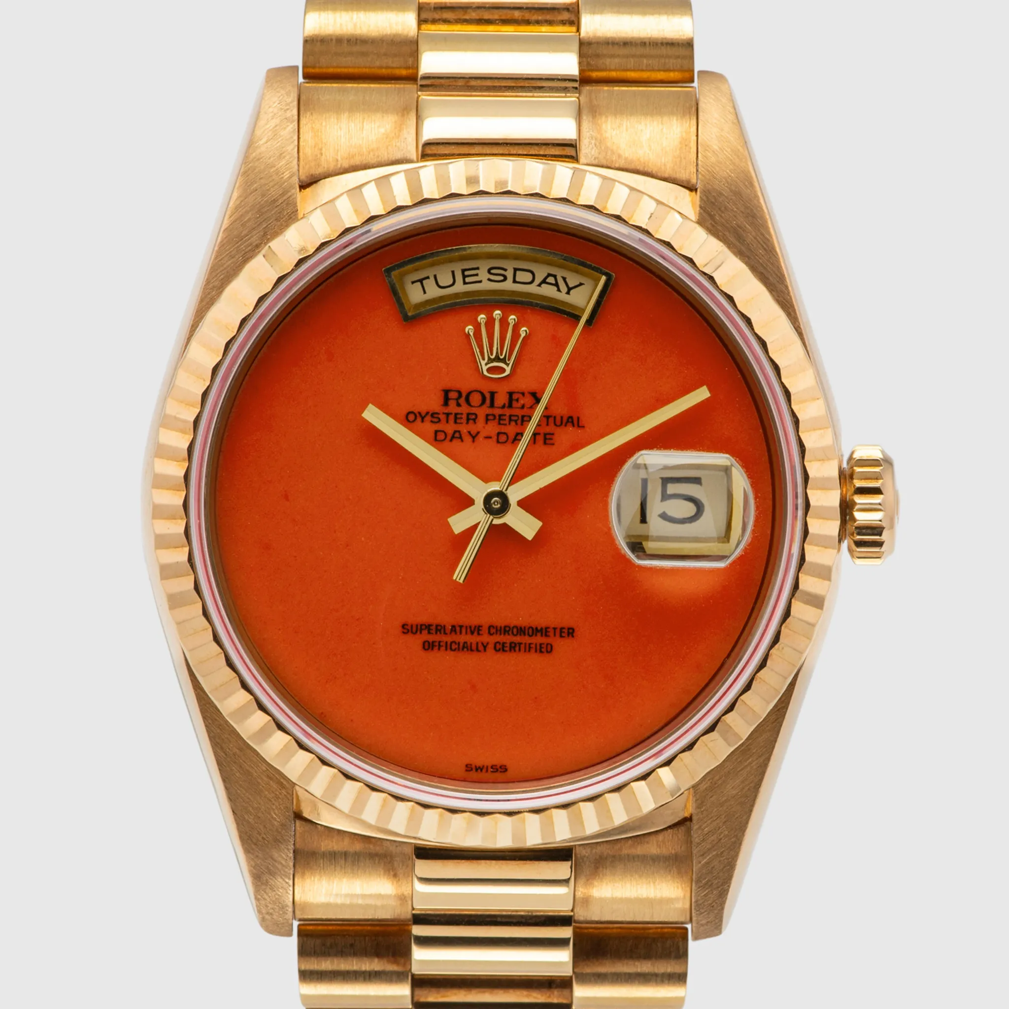 We have here a stunning example of a Rolex Day Date 18238 with a uber rare and original Coral dial. The orange color is mesmerizing while the surface is retaining its natural unique pattern. Unlike some other Coral dials this one bears a fresh and vibrant color with very very little pattern. The dial graphics are crisp and fully intact with no fadings whatsoever, has a correct 'Swiss' designation with matching hands. The case is mint and not showing major wear from age, looking stunning with its crisp fluted bezel. . The Coral dial is the grail of all stone dials being one of the rarest dials but without doubt the most sought after stone dial by Rolex. It is known that during production many dials were damaged due to its intricate and fine properties. They rarely come up on the market and and we are beyond thrilled to offer this mint best example of a Coral dial Day Date for sale in a beautiful full set with the papers . It It doesn't get better than this, it doesn't.